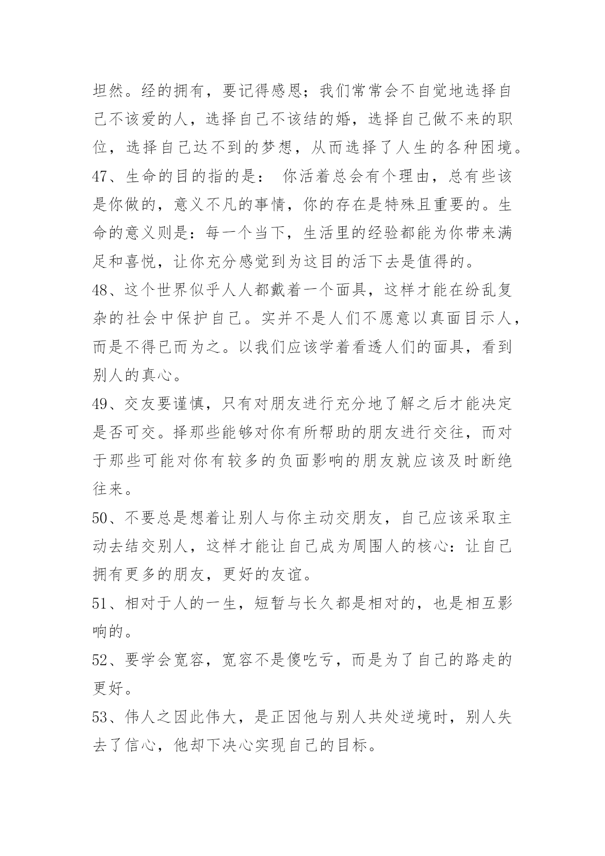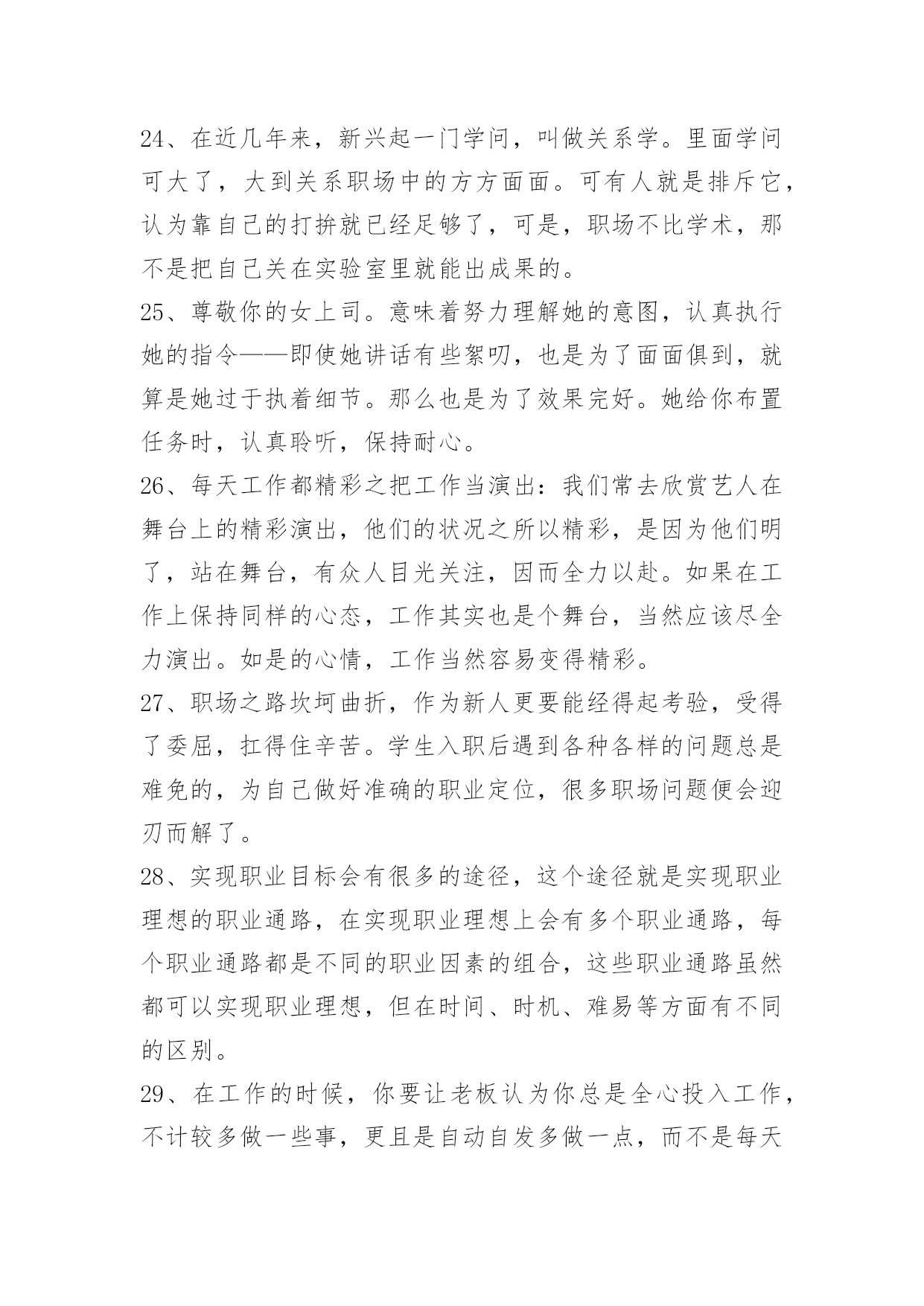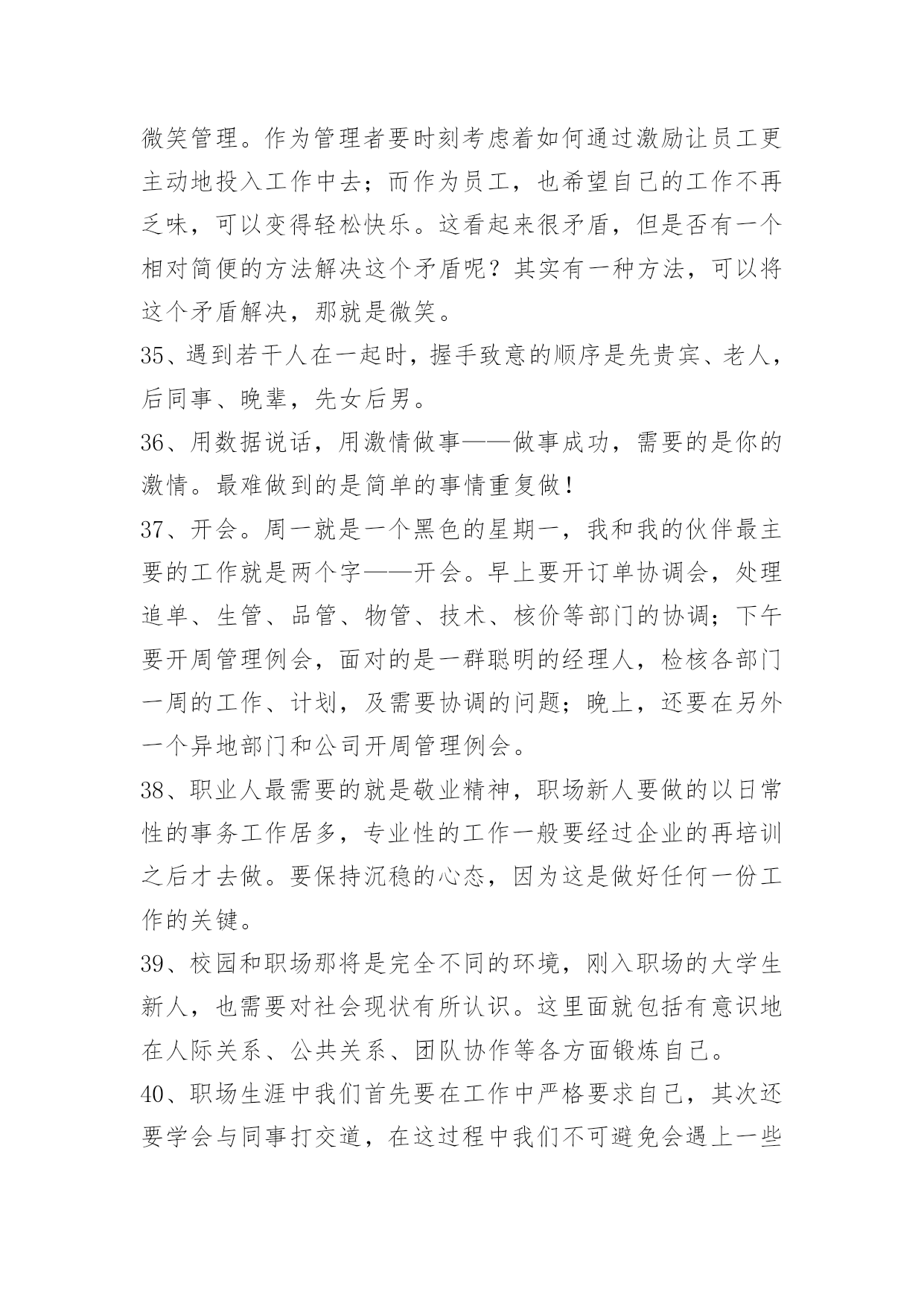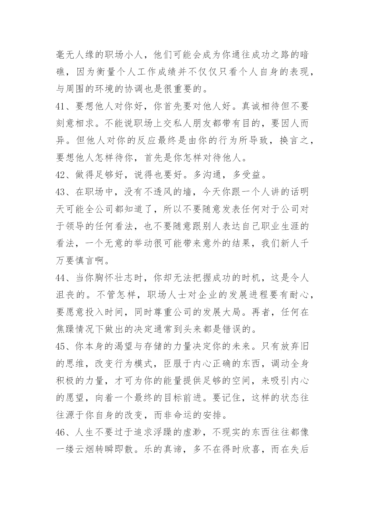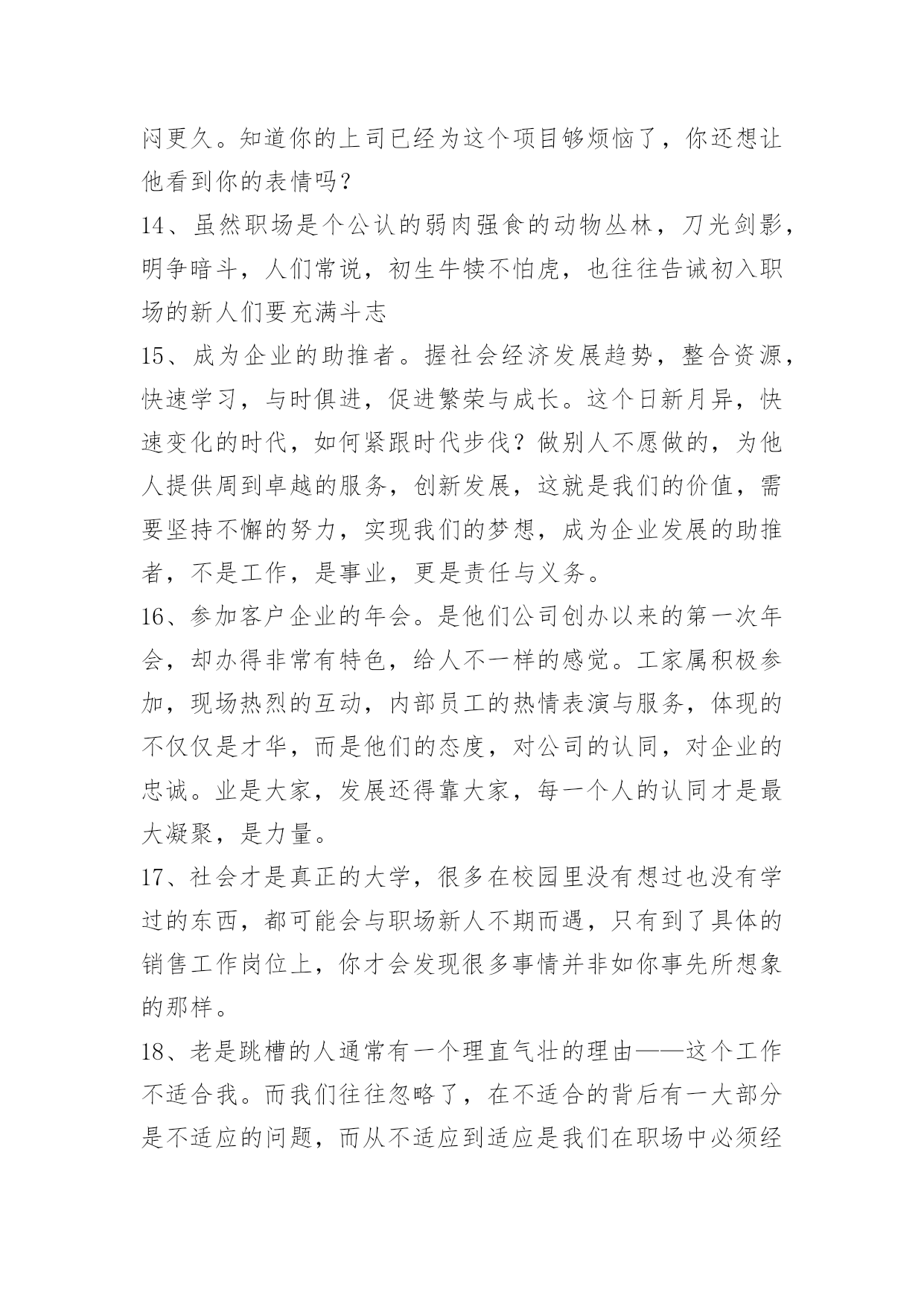 职场个性朋友圈语录文案职场个性朋友圈语录文案汇总60句你要搞清楚自己人生的剧本,不是你父母的续集,不是你子女的前传,更不是你朋友的外篇。认真对待工作,真诚对待旁人,你才是自己生活的最佳主角。以下这篇是小编为大家准备的职场个性朋友圈语录文案,欢迎阅读,希望能够对大家有所帮助。1、你成功,你要认为是你的运气很好。你失败,你要认为是你的力量不足够。那样的话,你就要不断提高自己的水平。2、如果你想赢得我都尊重,成长是唯一的途径。3、做任何事,给自己多留后路好。个世界上的人太多,爱太少,苦难忍,钱难赚。离搬弄是非、挑拨离间之人。段高的,用小人以驱驰;能力高的,还小人以颜色。德高的,待小人以宽容;血压高的,怕只有被小人气死的份儿了。得罪十个君子,也不要得罪一个小人。4、有的人说,我为老板付出了那么多,却得到那么一点点回报,心里感觉很不公平,于是工作便不那么就就业业,只是随便应付而已。果你确实是高手,有与老板叫板的资本,为引起老板注意,也未尝不可。如果你只是个职场菜鸟,也学人家消极抵抗,你就死定了。5、职场上已经打拼几年的白领,明明已经远离课堂,不用再为考试发愁,却常常梦见回到学校,重新坐到考场上考试,而且在梦里屡次答出白卷。是白领梦疾患者最常遇见的梦境。6、在你的职场上有没有一些事是可以延迟到明天或者以后。花1分钟检查那些真的不需要此刻要完成的事项。上那些需要及时关注的事项。做好手边的事情。7、许多职场人士经常腰痛,若是轻微的腰痛,只要按摩或是伸展筋骨即可,并好好休养。是严重腰痛,不可强力按揉,可以浸浴或以电暖炉敷疗令腰部温暖、血流顺畅。8、瑞典沃尔沃总部有两千多个停车位,早到的人总是把车停在远离办公楼的地方,天天如此:你们的泊位是固定的吗?他们答:我们到的比较早,有时间多走点路。到的同事或许会迟到,需要把车停在离办公楼近的地方。—多为别人着想时,你的路才会走得更远……9、很多人在职场上表现得四平八稳,能力尚可,没有犯过什么错误,老板交给的任务,也基本上能按照要求完成。这样就并不够,完成老板交给的任务,只能说明你称职,并不说明你胜任。10、你是自己生活的导演。自己负责,相信自己能走出困境。要做的只是改变想法与行动。果你希望一个人爱你,最好的心理准备是,并不是非他不可。11、尊重竞争对手,凭实力说话。12、忠诚并不是从一而忠,而是一种职业的责任感。13、在学生时代,当做到自己喜欢的时候,我们会花200%的精力去创造,但如果是枯燥的事务,我们便懒得理睬,最好能有办法应付过去。在工作上80%你所做的事情都是繁琐而看似机械的,如果仅仅为此而表现的闷闷不乐,那么你会郁闷更久。知道你的上司已经为这个项目够烦恼了,你还想让他看到你的表情吗?14、虽然职场是个公认的弱肉强食的动物丛林,刀光剑影,明争暗斗,人们常说,初生牛犊不怕虎,也往往告诫初入职场的新人们要充满斗志15、成为企业的助推者。握社会经济发展趋势,整合资源,快速学习,与时俱进,促进繁荣与成长。这个日新月异,快速变化的时代,如何紧跟时代步伐?做别人不愿做的,为他人提供周到卓越的服务,创新发展,这就是我们的价值,需要坚持不懈的努力,实现我们的梦想,成为企业发展的助推者,不是工作,是事业,更是责任与义务。16、参加客户企业的年会。是他们公司创办以来的第一次年会,却办得非常有特色,给人不一样的感觉。工家属积极参加,现场热烈的互动,内部员工的热情表演与服务,体现的不仅仅是才华,而是他们的态度,对公司的认同,对企业的忠诚。业是大家,发展还得靠大家,每一个人的认同才是最大凝聚,是力量。17、社会才是真正的大学,很多在校园里没有想过也没有学过的东西,都可能会与职场新人不期而遇,只有到了具体的销售工作岗位上,你才会发现很多事情并非如你事先所想象的那样。18、老是跳槽的人通常有一个理直气壮的理由——这个工作不适合我。而我们往往忽略了,在不适合的背后有一大部分是不适应的问题,而从不适应到适应是我们在职场中必须经历的进化过程。19、首先要有清晰的目标,一个人能走多远取决于他能看多远,要知道心在哪里,收获就在哪里,不能太宠自己,该吃苦就要学会吃苦,吃得苦中苦,方为人上人。工作做好,做出一般人做不出的漂亮结果,就不用担心人会发现不了,尤其不用担心你的领导发现不了。记住,天道酬勤。20、在你说话之前,先听。在你回应之前,先想。在你传播之前,先慎。在你盈利之前,先俭。在你消费之前,先挣。在你承诺之前,先决。在你做到之前,先忍。在你退出之前,先试。—如果在职场中都能先行一步,那么你的职业生涯必将减少无数缺憾!21、大部分情绪化的人都是由于EQ低而造成的。遇到问题的时候,他们无法理智地控制自己的情绪,将注意力关注在问题本身上面,甚至他们会毫不掩饰地把情绪都放在脸上,让人一望便知他当下的心理状态。22、在下属尚未说完之前,尽量