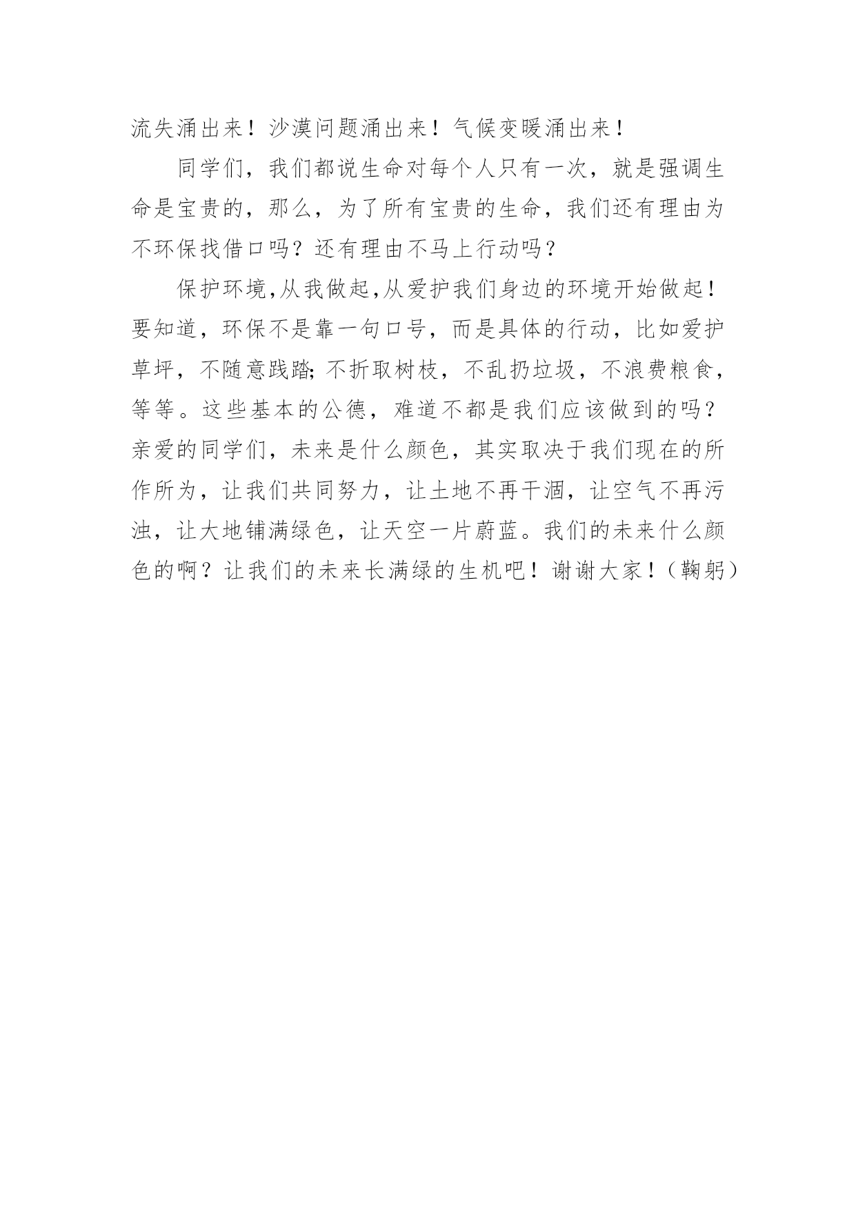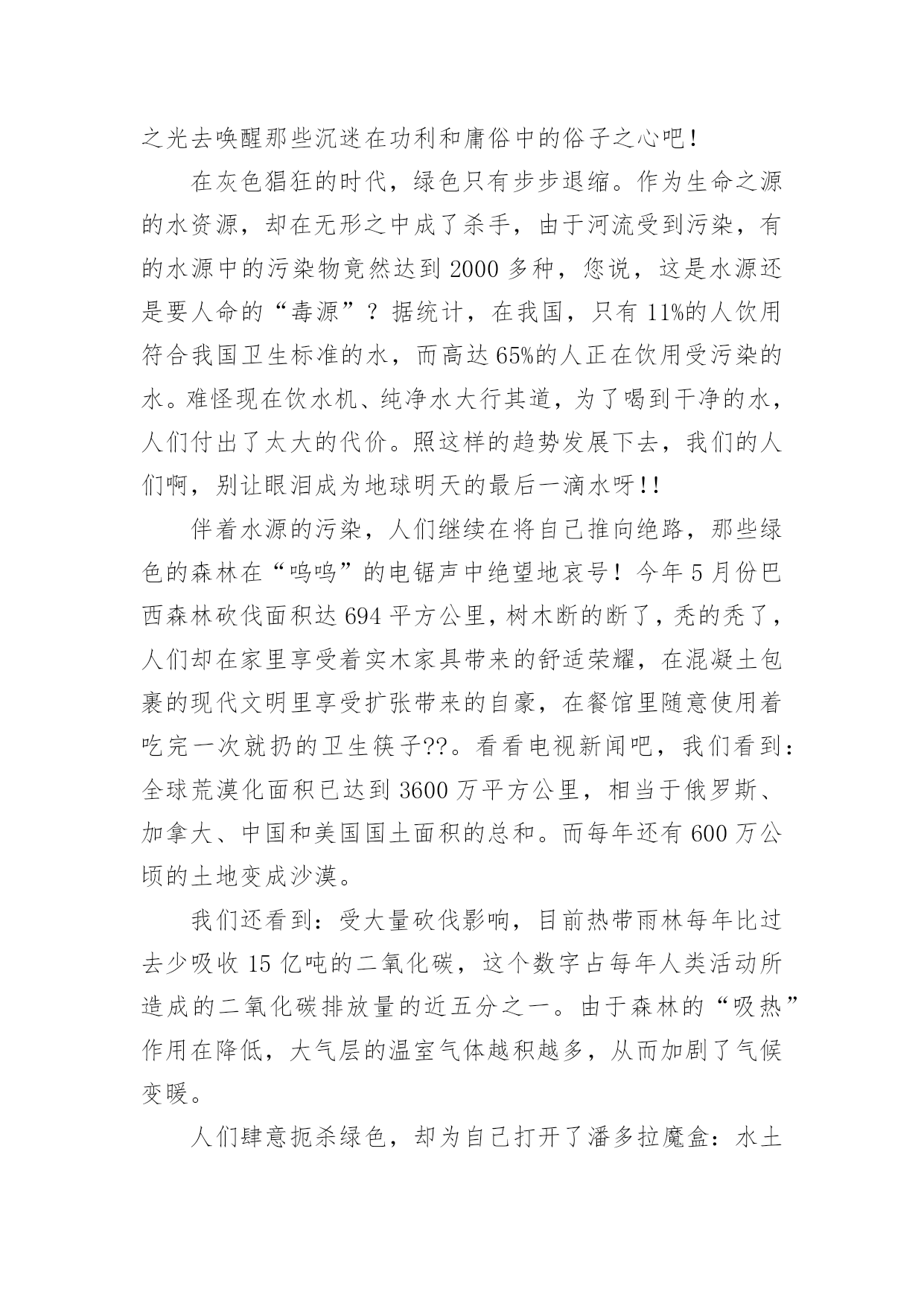 环保主题演讲稿未来的颜色环保主题演讲稿未来的颜色尊敬的各位老师,亲爱的同学们:你们好!我是来自七年级二班的唐欣荣,今天,我演讲的主题是《未来的颜色》。同学们,未来就像一张白纸,如果用一种颜色来填充,您首先想到的是什么颜色呢?(稍等)每一种颜色都是我们美好的心愿,而我最想用绿色来填涂,因为这个世界有了绿色,才有了绿树成荫,才有了清新空气,才有了鸟语花香,在这样的环境里,我们才能和谐安定,快乐幸福地学习和生活。然而,遗憾的是,我们现在的世界,灰色成了主调。您看,灰色的柏油路两边,灰色的高楼馆所鳞次栉比,夜晚的灯光将宝蓝的天空染成了灰黄的色彩。我们使用的电脑,开的汽车??都消耗了大量的资源,君不见,工厂上空弥漫着挥之不去的烟尘,小河溪水再不清澈见底,车水马龙的城市不断排放着让全球变暖的废气??南极雪融、厄尔尼诺、沙尘暴、泥石流??那些可怕的现象正在不断地向我们逼近,我们眼前的灰色也越来越浓!知道吗?由于工厂不断的增加,由于工厂排出的废气,这个世界每年有30—70万人因大气污染而提前死亡,2500万的儿童患慢性喉炎,400—700万妇女受害。可是,工厂不断增加,污染还在肆无忌惮地扩张。未来啊,灰色的眼睛已经迷蒙许久,绿在何处?请开启您的睿智之光去唤醒那些沉迷在功利和庸俗中的俗子之心吧!在灰色猖狂的时代,绿色只有步步退缩。作为生命之源的水资源,却在无形之中成了杀手,由于河流受到污染,有的水源中的污染物竟然达到2000多种,您说,这是水源还是要人命的“毒源”?据统计,在我国,只有11%的人饮用符合我国卫生标准的水,而高达65%的人正在饮用受污染的水。难怪现在饮水机、纯净水大行其道,为了喝到干净的水,人们付出了太大的代价。照这样的趋势发展下去,我们的人们啊,别让眼泪成为地球明天的最后一滴水呀!!伴着水源的污染,人们继续在将自己推向绝路,那些绿色的森林在“呜呜”的电锯声中绝望地哀号!今年5月份巴西森林砍伐面积达694平方公里,树木断的断了,秃的秃了,人们却在家里享受着实木家具带来的舒适荣耀,在混凝土包裹的现代文明里享受扩张带来的自豪,在餐馆里随意使用着吃完一次就扔的卫生筷子??。看看电视新闻吧,我们看到:全球荒漠化面积已达到3600万平方公里,相当于俄罗斯、加拿大、中国和美国国土面积的总和。而每年还有600万公顷的土地变成沙漠。我们还看到:受大量砍伐影响,目前热带雨林每年比过去少吸收15亿吨的二氧化碳,这个数字占每年人类活动所造成的二氧化碳排放量的近五分之一。由于森林的“吸热”作用在降低,大气层的温室气体越积越多,从而加剧了气候变暖。人们肆意扼杀绿色,却为自己打开了潘多拉魔盒:水土流失涌出来!沙漠问题涌出来!气候变暖涌出来!同学们,我们都说生命对每个人只有一次,就是强调生命是宝贵的,那么,为了所有宝贵的生命,我们还有理由为不环保找借口吗?还有理由不马上行动吗?保护环境,从我做起,从爱护我们身边的环境开始做起!要知道,环保不是靠一句口号,而是具体的行动,比如爱护草坪,不随意践踏;不折取树枝,不乱扔垃圾,不浪费粮食,等等。这些基本的公德,难道不都是我们应该做到的吗?亲爱的同学们,未来是什么颜色,其实取决于我们现在的所作所为,让我们共同努力,让土地不再干涸,让空气不再污浊,让大地铺满绿色,让天空一片蔚蓝。我们的未来什么颜色的啊?让我们的未来长满绿的生机吧!谢谢大家!(鞠躬)