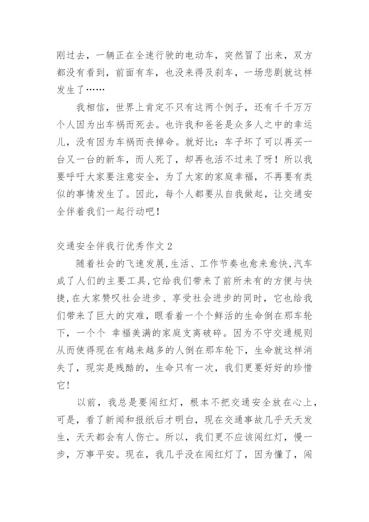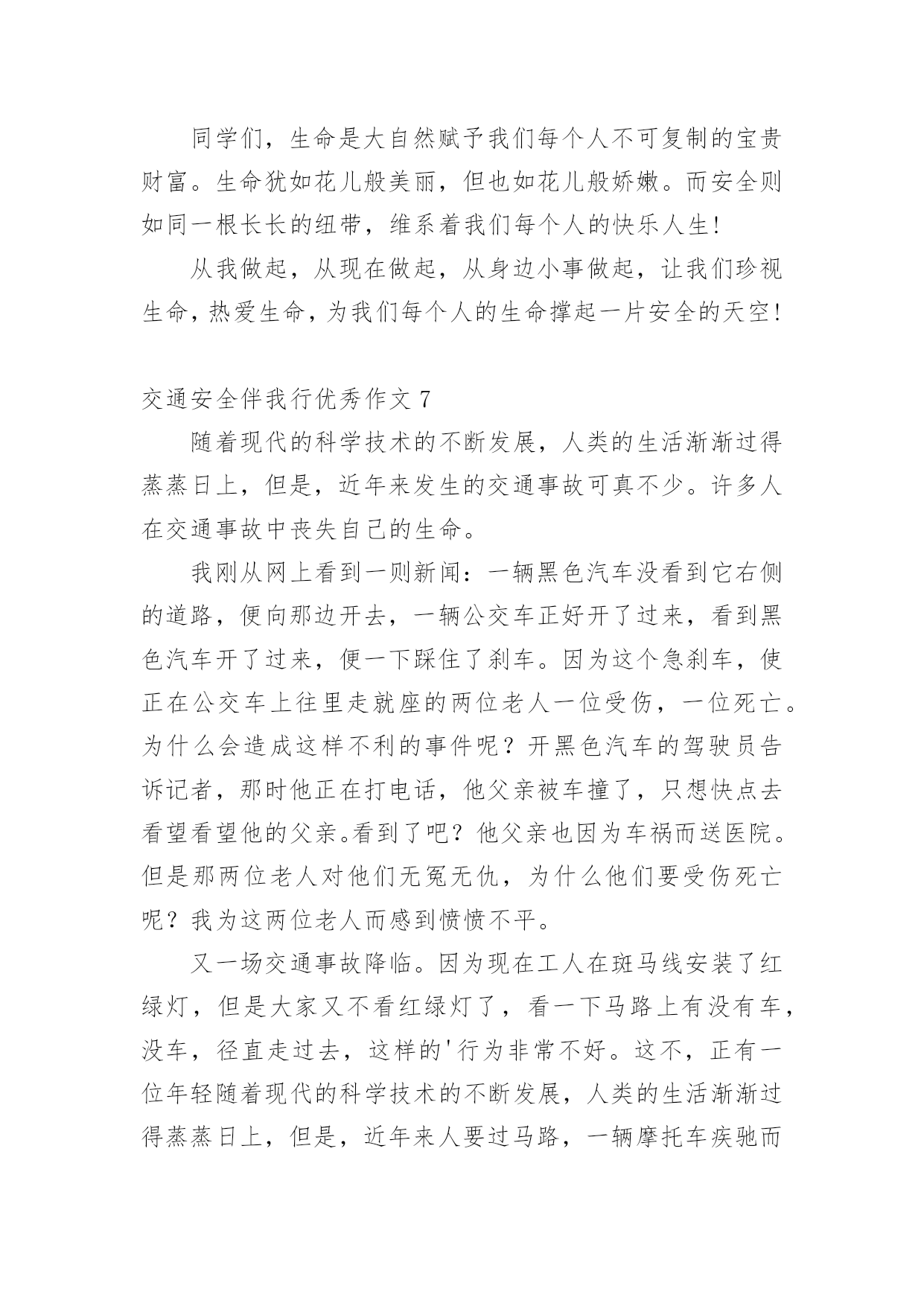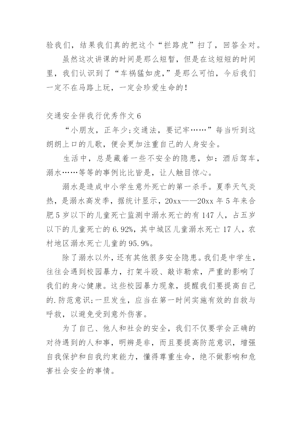 交通安全伴我行优秀作文交通安全伴我行优秀作文7篇在日常生活或是工作学习中,大家一定都接触过作文吧,作文可分为小学作文、中学作文、大学作文(论文)。为了让您在写作文时更加简单方便,以下是小编整理的交通安全伴我行优秀作文,欢迎阅读,希望大家能够喜欢。交通安全伴我行优秀作文1大家应该都知道,现在的交通十分混乱。看,那有一个喝了酒酒后驾驶的人,在车上睡着了,翻了车,受了伤甚至死亡;那儿一个人骑电动车的撞上了自行车了。我曾就亲身经历过这样的事情。六岁那年开学前一天夜晚,我坐着爸爸的车一起回家。我和爸爸一边谈笑风生,一边开车。爸爸一不留神,在一个十分陡的。坡路上翻了下去,我后来才知道那里有几十米高,而我和爸爸竟然没死,真是福大命大。可是我和爸爸都身负重伤,幸好有一位老奶奶看见了,把我和爸爸带到了她家里,还给我洗了澡,我还裹着老奶奶的'被子来到了医院。经过医生的全身的检查后。医生说我的膝盖骨断掉了,要重新接回来。而爸爸的腰也受了严重的伤。我经过了一年多的治疗才治好了腿。我还曾亲眼见过一场事故发生在我的眼前。下午放学以后,正是堵车的时间。一辆自行车从马路的一头过马路,刚刚过去,一辆正在全速行驶的电动车,突然冒了出来,双方都没有看到,前面有车,也没来得及刹车,一场悲剧就这样发生了……我相信,世界上肯定不只有这两个例子,还有千千万万个人因为出车祸而死去。也许我和爸爸是众多人之中的幸运儿,没有因为车祸而丧掉命。就好比:车子坏了可以再买一台又一台的新车,而人死了,却再也活不过来了呀!所以我要呼吁大家要注意安全,为了大家的家庭幸福,不再要有类似的事情发生了。因此,每个人都要从自我做起,让交通安全伴着我们一起行动吧!交通安全伴我行优秀作文2随着社会的飞速发展,生活、工作节奏也愈来愈快,汽车成了人们的主要工具,它给我们带来了前所未有的方便与快捷,在大家赞叹社会进步、享受社会进步的同时,它也给我们带来了巨大的灾难,眼看着一个个鲜活的生命倒在那车轮下,一个个幸福美满的家庭支离破碎。因为不守交通规则从而使得现在有越来越多的人倒在那车轮下,生命就这样消失了,现实是残酷的,生命只有一次,我们更要好好的珍惜它!以前,我总是要闯红灯,根本不把交通安全放在心上,可是,看了新闻和报纸后才明白,现在交通事故几乎天天发生,天天都会有人伤亡。所以,我们更不应该闯红灯,慢一步,万事平安。现在,我几乎没在闯红灯了,因为懂了,闯红灯随时可能会发生车祸。遵守交通规则,不乱闯红灯。“是个很重要的问题,我们不仅要把这句话挂在嘴边,还要把它深深地记在心上,把安全放在首位,让事故的'发生可能性变得越来越少。我们还可以在班级宣传栏上,多贴一些遵守交通、不乱闯红灯等之类的警告语,让同学们更好的明白交通安全的重要性。老师也可以给同学们上关于交通的课,使同学们更好的了解交通安全知识。让我们遵守交通安全,把交通事故降到最低,让交通安全伴我行!交通安全伴我行优秀作文3交通安全伴我行,是我们共同的口号。交通是人们生活中最重要的工具。我们的安危就体现在这里,我们能有个安全是最重要的。交通不是你说我说,是大家说大家倡导的。是用我们的伟大蓝图来畅想的。交通其实也是很简单的问题。就是我们每个人都约束自己不违反交通法,按照交通规则来约束,就一定不会有问题,就怕有人转空子,这样就会让交通发生不好的规律,打破了交通原有的规律这是非常危险的是情。我们坚决杜绝这种事情的发生。觉不让我们那生命来开玩笑,生命是伟大的,生命是无价格的。,不那个不珍惜,生命来的太不容易了,我们必须得珍惜,必须得重视这个问题。让生活变得严谨。觉不出现任何问题,这样就会给生命增加光彩。这样就能让我们咋生活中有力量,绝不范危险的错误。尤其是这么危险的错误,更是要深刻记得的。我们是用美丽的.生命来为祖国奉献的。而不是就这么随意的就离开。我们还有我们伟大的目标没有完成啊,交通安全应该让我们没个人都了解到重要性。要用我们的行动去教育告诫他人,绝不会发生危害生命的是,那样是最愚蠢的。那样是最无知的。让我们呼吁所有人把安全问题放到第一点。让有规律的交通带给我们安全的行走吧。交通安全伴我行优秀作文4我们都知道安全很重要,当我上学时,妈妈会说:“小心点。”当我们放学时,老师说:“过马路小心点。”从报纸上,电视上,网络上常常会看到车祸的发生,可有些人就是不怕死,比如过马路时边玩边走、边走边打电话、还有人开车时打电话、酒驾、超速等。不怕一万,只怕万一,导致了车祸的频繁发生。比如上次有一个朋友告诉我,有一天的.下午,在一个车站时我朋友看到一个白发苍苍的老奶奶,提着白菜好像刚从菜市场出来,正准备回家呢!这是一辆公交车来了,只听吱的一声公交车门开了,当老奶奶正准备上车时,突然有一阵风沙吹来,吹到了老奶奶的眼睛里,只听嘀嘀嗒的歌声响起来了,当老奶奶可以看见前方时就只看见一辆摩托