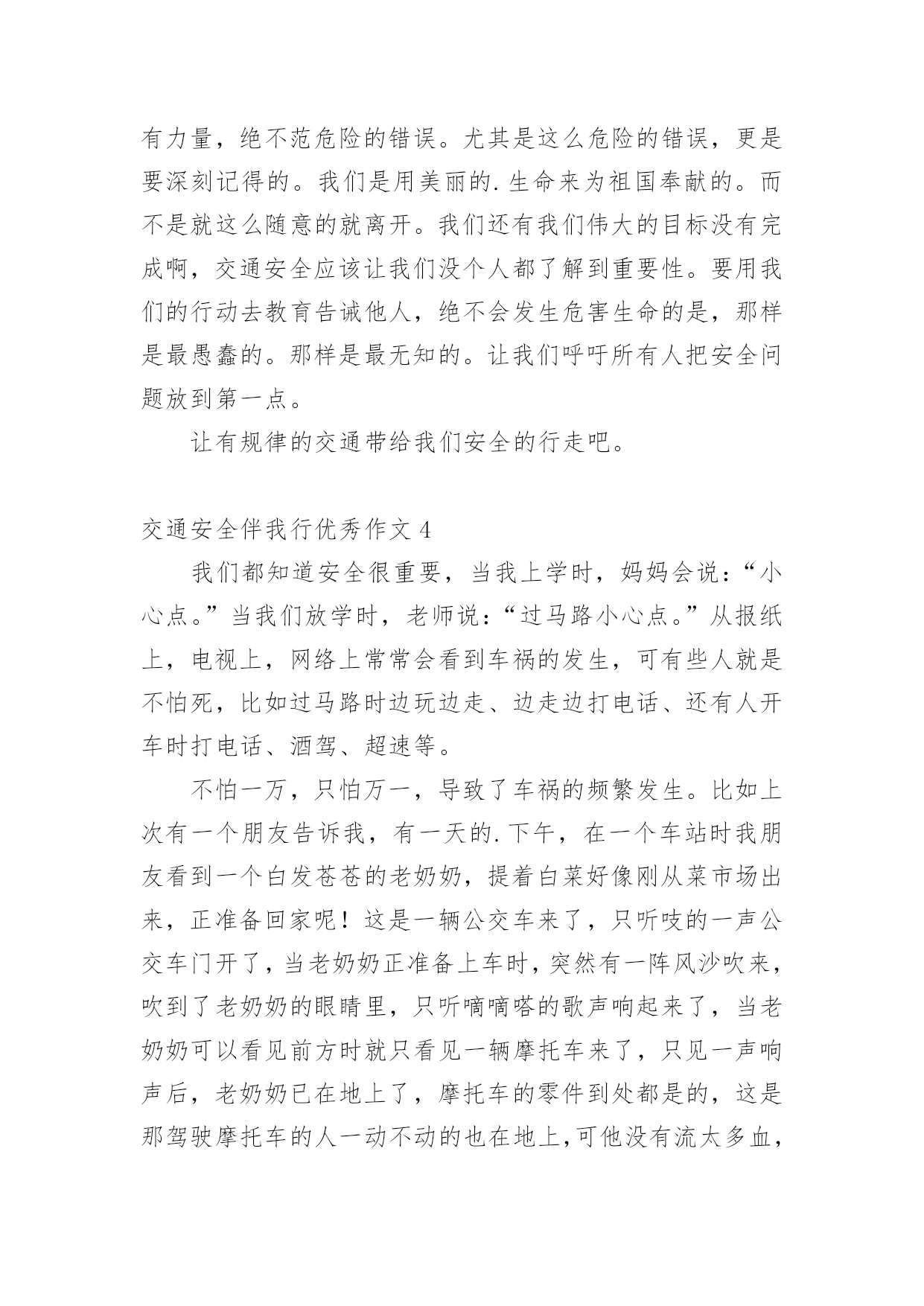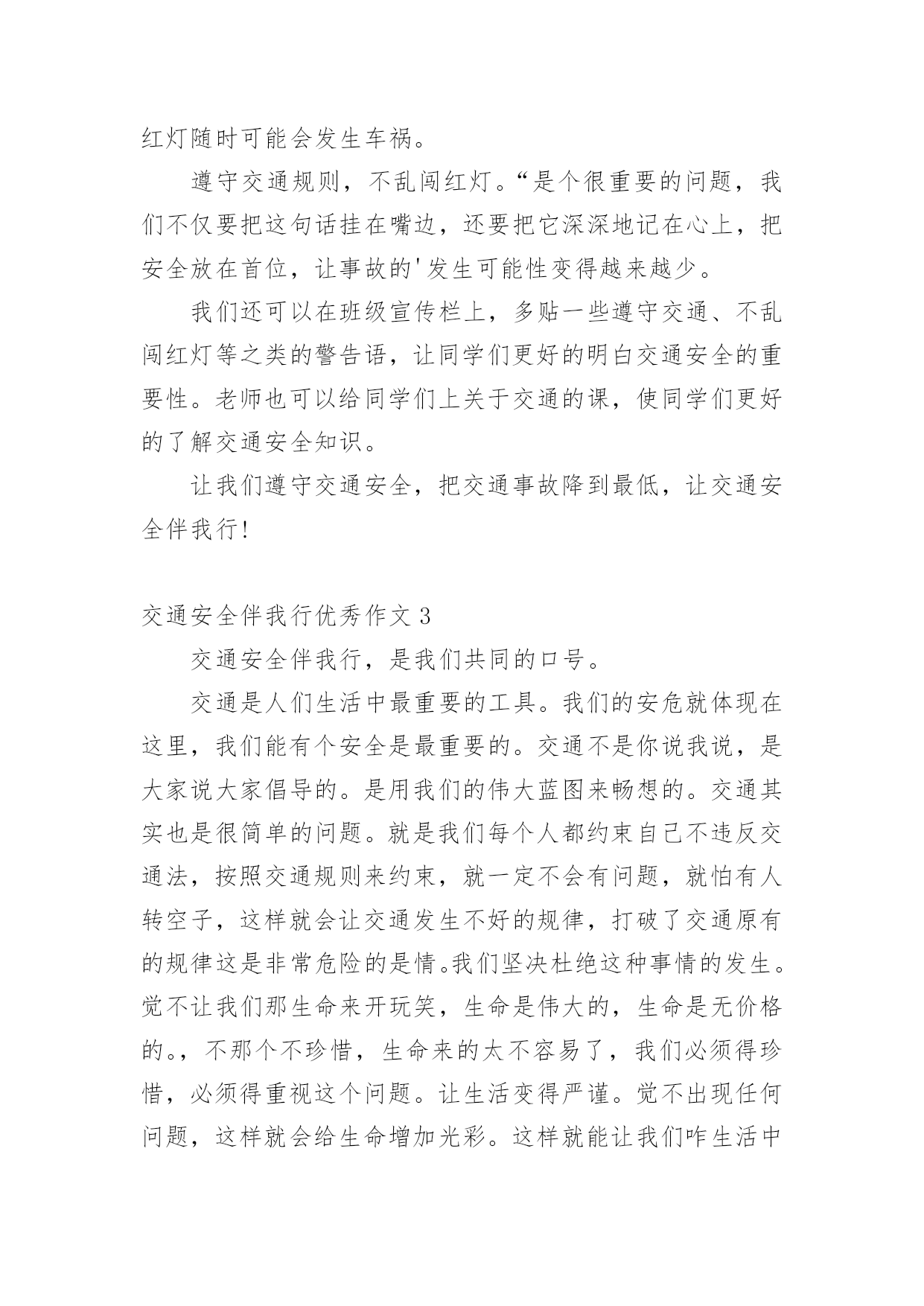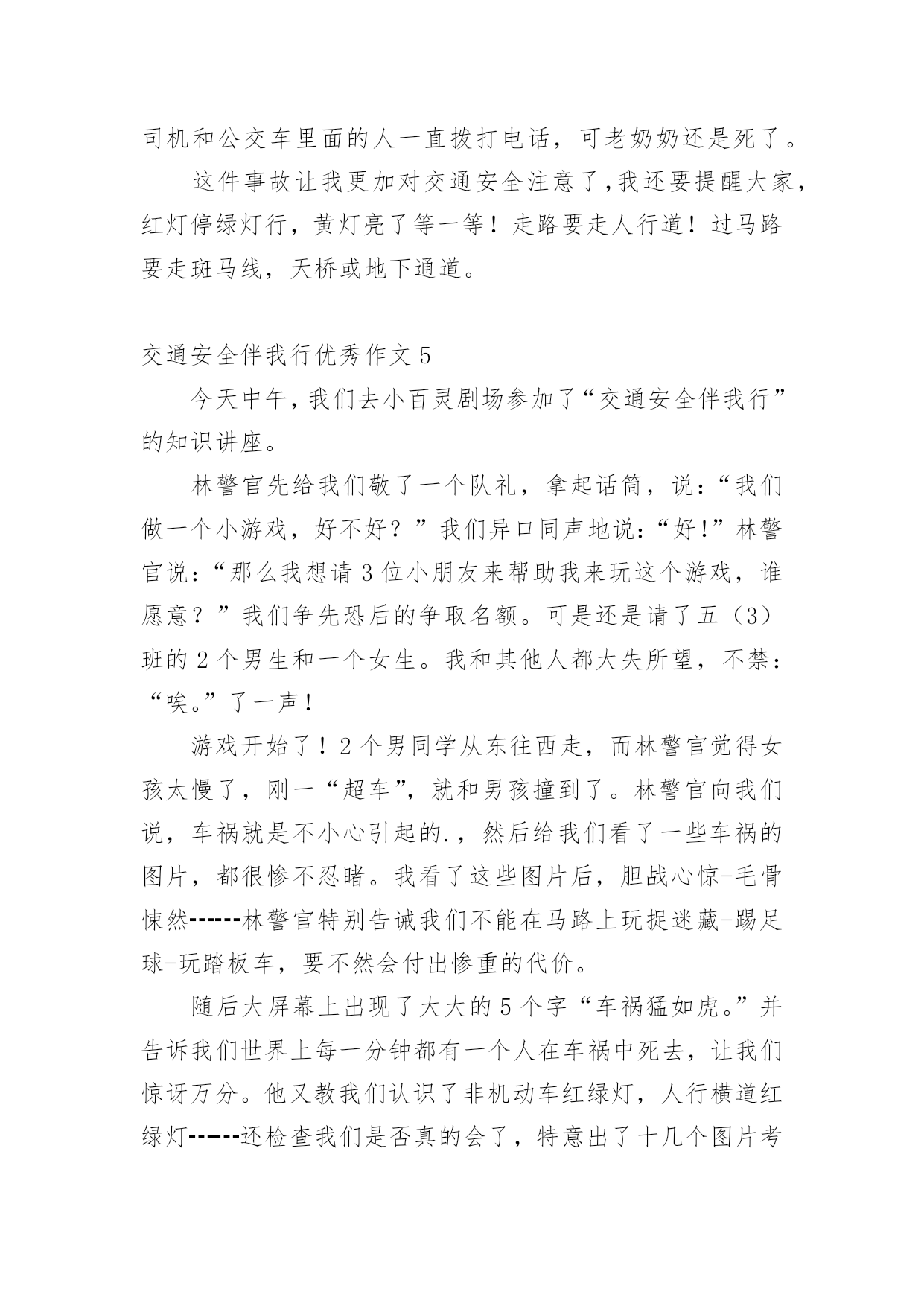 交通安全伴我行优秀作文交通安全伴我行优秀作文7篇在日常生活或是工作学习中,大家一定都接触过作文吧,作文可分为小学作文、中学作文、大学作文(论文)。为了让您在写作文时更加简单方便,以下是小编整理的交通安全伴我行优秀作文,欢迎阅读,希望大家能够喜欢。交通安全伴我行优秀作文1大家应该都知道,现在的交通十分混乱。看,那有一个喝了酒酒后驾驶的人,在车上睡着了,翻了车,受了伤甚至死亡;那儿一个人骑电动车的撞上了自行车了。我曾就亲身经历过这样的事情。六岁那年开学前一天夜晚,我坐着爸爸的车一起回家。我和爸爸一边谈笑风生,一边开车。爸爸一不留神,在一个十分陡的。坡路上翻了下去,我后来才知道那里有几十米高,而我和爸爸竟然没死,真是福大命大。可是我和爸爸都身负重伤,幸好有一位老奶奶看见了,把我和爸爸带到了她家里,还给我洗了澡,我还裹着老奶奶的'被子来到了医院。经过医生的全身的检查后。医生说我的膝盖骨断掉了,要重新接回来。而爸爸的腰也受了严重的伤。我经过了一年多的治疗才治好了腿。我还曾亲眼见过一场事故发生在我的眼前。下午放学以后,正是堵车的时间。一辆自行车从马路的一头过马路,刚刚过去,一辆正在全速行驶的电动车,突然冒了出来,双方都没有看到,前面有车,也没来得及刹车,一场悲剧就这样发生了……我相信,世界上肯定不只有这两个例子,还有千千万万个人因为出车祸而死去。也许我和爸爸是众多人之中的幸运儿,没有因为车祸而丧掉命。就好比:车子坏了可以再买一台又一台的新车,而人死了,却再也活不过来了呀!所以我要呼吁大家要注意安全,为了大家的家庭幸福,不再要有类似的事情发生了。因此,每个人都要从自我做起,让交通安全伴着我们一起行动吧!交通安全伴我行优秀作文2随着社会的飞速发展,生活、工作节奏也愈来愈快,汽车成了人们的主要工具,它给我们带来了前所未有的方便与快捷,在大家赞叹社会进步、享受社会进步的同时,它也给我们带来了巨大的灾难,眼看着一个个鲜活的生命倒在那车轮下,一个个幸福美满的家庭支离破碎。因为不守交通规则从而使得现在有越来越多的人倒在那车轮下,生命就这样消失了,现实是残酷的,生命只有一次,我们更要好好的珍惜它!以前,我总是要闯红灯,根本不把交通安全放在心上,可是,看了新闻和报纸后才明白,现在交通事故几乎天天发生,天天都会有人伤亡。所以,我们更不应该闯红灯,慢一步,万事平安。现在,我几乎没在闯红灯了,因为懂了,闯红灯随时可能会发生车祸。遵守交通规则,不乱闯红灯。“是个很重要的问题,我们不仅要把这句话挂在嘴边,还要把它深深地记在心上,把安全放在首位,让事故的'发生可能性变得越来越少。我们还可以在班级宣传栏上,多贴一些遵守交通、不乱闯红灯等之类的警告语,让同学们更好的明白交通安全的重要性。老师也可以给同学们上关于交通的课,使同学们更好的了解交通安全知识。让我们遵守交通安全,把交通事故降到最低,让交通安全伴我行!交通安全伴我行优秀作文3交通安全伴我行,是我们共同的口号。交通是人们生活中最重要的工具。我们的安危就体现在这里,我们能有个安全是最重要的。交通不是你说我说,是大家说大家倡导的。是用我们的伟大蓝图来畅想的。交通其实也是很简单的问题。就是我们每个人都约束自己不违反交通法,按照交通规则来约束,就一定不会有问题,就怕有人转空子,这样就会让交通发生不好的规律,打破了交通原有的规律这是非常危险的是情。我们坚决杜绝这种事情的发生。觉不让我们那生命来开玩笑,生命是伟大的,生命是无价格的。,不那个不珍惜,生命来的太不容易了,我们必须得珍惜,必须得重视这个问题。让生活变得严谨。觉不出现任何问题,这样就会给生命增加光彩。这样就能让我们咋生活中有力量,绝不范危险的错误。尤其是这么危险的错误,更是要深刻记得的。我们是用美丽的.生命来为祖国奉献的。而不是就这么随意的就离开。我们还有我们伟大的目标没有完成啊,交通安全应该让我们没个人都了解到重要性。要用我们的行动去教育告诫他人,绝不会发生危害生命的是,那样是最愚蠢的。那样是最无知的。让我们呼吁所有人把安全问题放到第一点。让有规律的交通带给我们安全的行走吧。交通安全伴我行优秀作文4我们都知道安全很重要,当我上学时,妈妈会说:“小心点。”当我们放学时,老师说:“过马路小心点。”从报纸上,电视上,网络上常常会看到车祸的发生,可有些人就是不怕死,比如过马路时边玩边走、边走边打电话、还有人开车时打电话、酒驾、超速等。不怕一万,只怕万一,导致了车祸的频繁发生。比如上次有一个朋友告诉我,有一天的.下午,在一个车站时我朋友看到一个白发苍苍的老奶奶,提着白菜好像刚从菜市场出来,正准备回家呢!这是一辆公交车来了,只听吱的一声公交车门开了,当老奶奶正准备上车时,突然有一阵风沙吹来,吹到了老奶奶的眼睛里,只听嘀嘀嗒的歌声响起来了,当老奶奶可以看见前方时就只看见一辆摩托