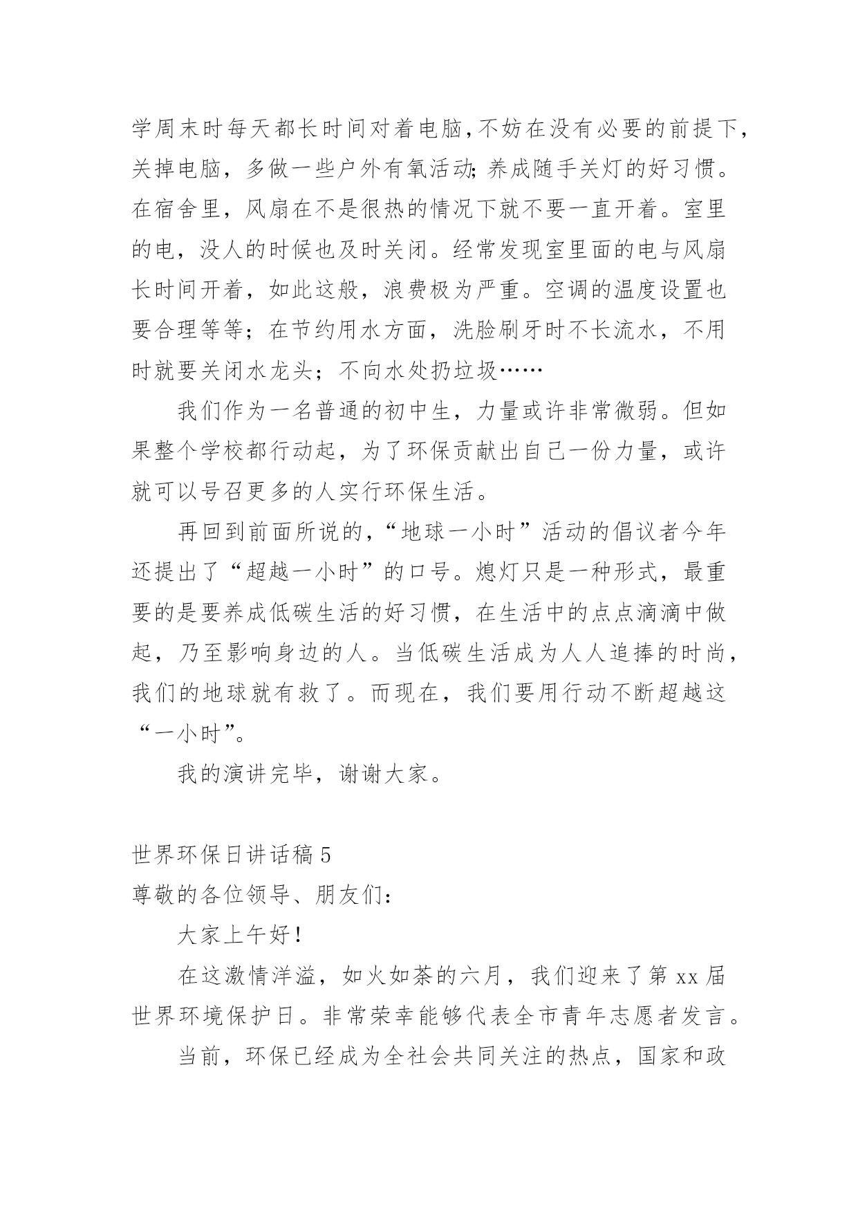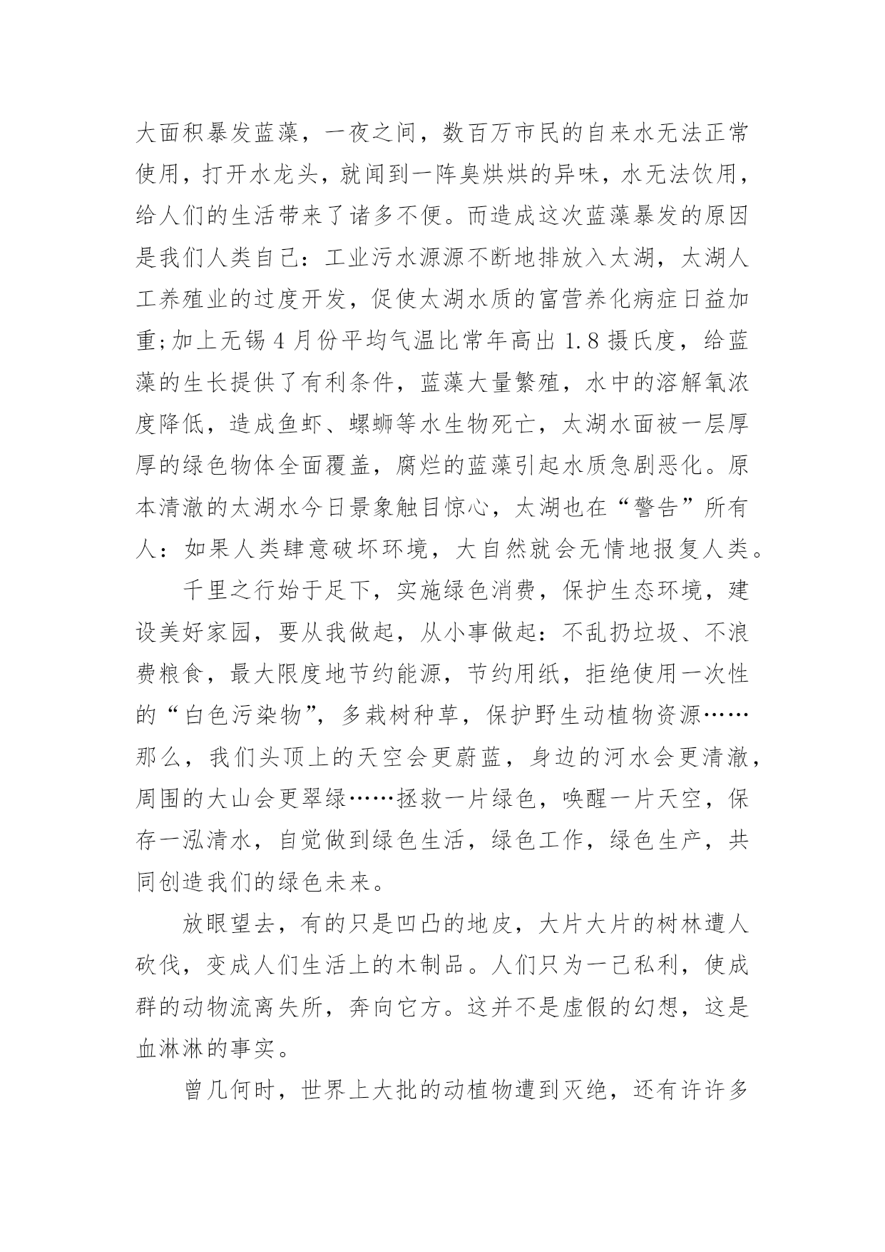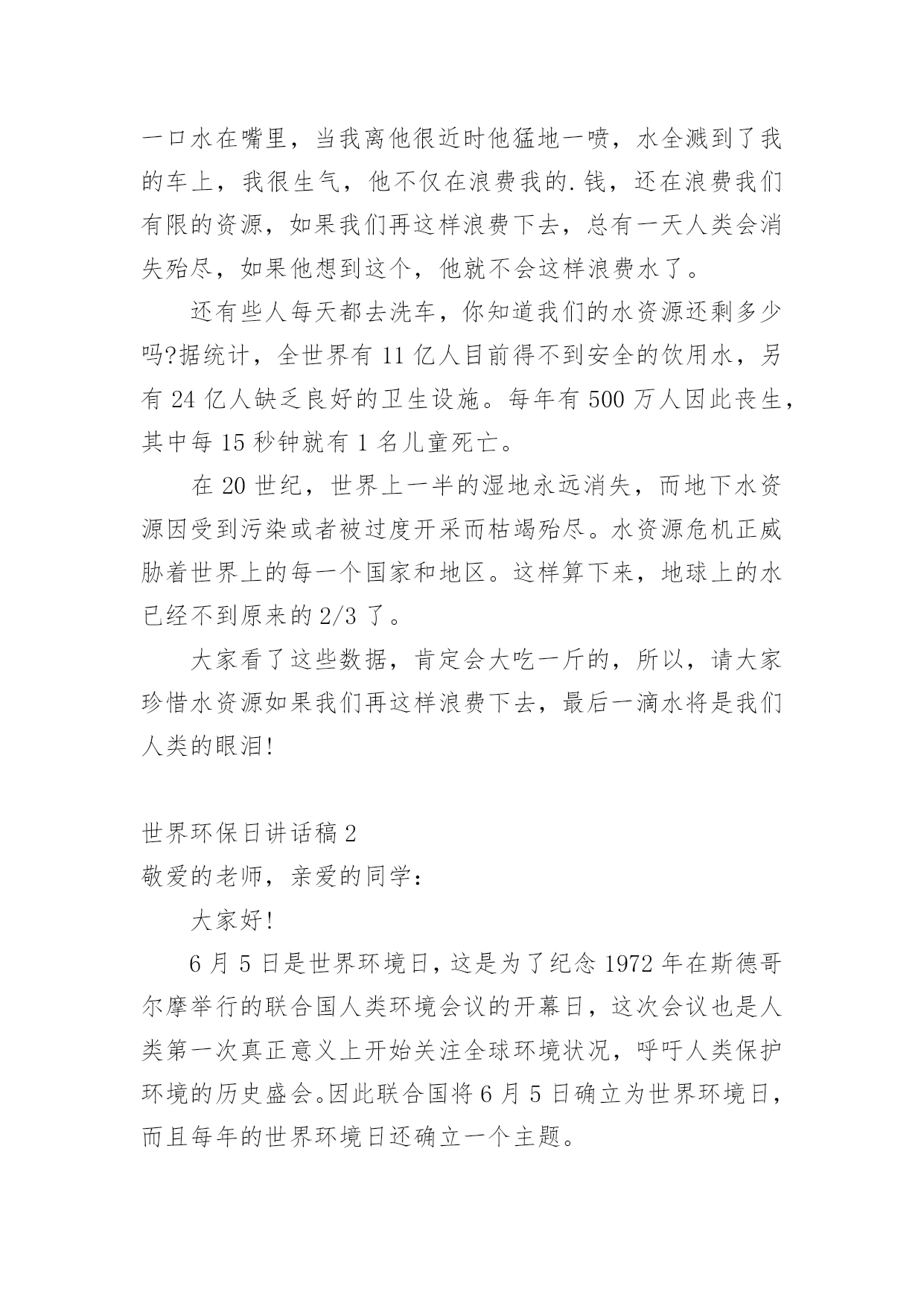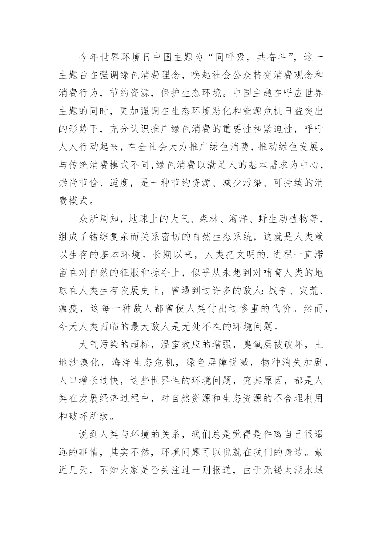 世界环保日讲话稿在快速变化和不断变革的今天,我们需要用到讲话稿的情形越来越多,讲话稿是为发言者表达自己想要讲的话而事先准备好的文稿。为了让您在写讲话稿时更加简单方便,下面是小编整理的世界环保日讲话稿,仅供参考,欢迎大家阅读。世界环保日讲话稿1各位老师、同学们:早上好!在人类生存发展,曾遇到过许多的敌人:战争、灾荒、瘟疫、这每一种敌人都曾使人类付出过惨重的代价。然而,今天人们面临的的敌人,已不是战争、疾病、天灾以及瘟疫,而是无处不在的环境问题!大气污染超标、温室效应增强、臭氧层被破坏、土地沙漠化、水资源污染严重、海洋生态危机、绿色屏障锐减、物种消失加剧、垃圾威胁人类、人口增长过快,这些世界性的环境问题,究其原因,都是人类在发展经济的过程中,对自然资源和生态环境的不合理利用和破坏所致。这一切的现实,让每一个关心祖国前进和发展的中国人深感痛心。保护环境,利在当代,功在千秋,这是一项崇高而伟大的事业,更是中华民族千秋万代利益所在。千里之行,始于足下。保护环境,建设美好家园,要从我做起,从小事做起。心动不如行动。只要我们确实落实我们的言行,不乱丢垃圾,不浪费粮食,限度地节约用水,节约能源,节约用纸,拒绝使用一次性的“白色污染物”,乘公共交通旅行,多栽树种草,保护好野生动植物资源,自觉地遵守各项环境法规。那么,我们头顶上的天空将会变得更蓝,身边的河水会变得更清,空中的鸟儿将会鸣叫得更加响亮,生活在其中的人们将会变得更加健康快乐。我很高兴地经常看到许多同学在校园的各个角落捡拾果皮纸屑;用自己的双手去保护和营造优美的校园环境。但是,我们也经常看到一些我们不愿意看到的情景:操场上、楼梯上、走廊上有纸屑、食品袋;雪白的墙壁上被印上手印、脚印和球印;教室里、走廊上留有难以清除的口香糖的污迹……这说明,我们的习惯还没有很好的养成。同学们,我们是21世纪的主人,具有环保意识是现代文明人的标志。我们要有时代感责任感,要心系全球,着眼身边,立足校园。“勿以善小而不为,勿以恶小而为之”,让我们积极行动起来,从身边的小事做起,培养环保意识,养成环保习惯,创造我们美好的校园,塑造我们美好的灵魂!水是生命之源。”地球上每一个生物都依赖于水,没了水,就会没有这片美丽的世界,所以,我们要珍惜水。但是,现在有些人在浪费水。有一次,我和同学们在一起打篮球,我看同学们都热的汗流浃背,一个个口干舌燥的,我就骑着车到旁边的小店里买了五瓶矿泉水分给他们,同学们都很谢谢我。过了一伙,我骑车下坡,这是,詹谨诚合了一口水在嘴里,当我离他很近时他猛地一喷,水全溅到了我的车上,我很生气,他不仅在浪费我的.钱,还在浪费我们有限的资源,如果我们再这样浪费下去,总有一天人类会消失殆尽,如果他想到这个,他就不会这样浪费水了。还有些人每天都去洗车,你知道我们的水资源还剩多少吗?据统计,全世界有11亿人目前得不到安全的饮用水,另有24亿人缺乏良好的卫生设施。每年有500万人因此丧生,其中每15秒钟就有1名儿童死亡。在20世纪,世界上一半的湿地永远消失,而地下水资源因受到污染或者被过度开采而枯竭殆尽。水资源危机正威胁着世界上的每一个国家和地区。这样算下来,地球上的水已经不到原来的2/3了。大家看了这些数据,肯定会大吃一斤的,所以,请大家珍惜水资源如果我们再这样浪费下去,最后一滴水将是我们人类的眼泪!世界环保日讲话稿2敬爱的老师,亲爱的同学:大家好!6月5日是世界环境日,这是为了纪念1972年在斯德哥尔摩举行的联合国人类环境会议的开幕日,这次会议也是人类第一次真正意义上开始关注全球环境状况,呼吁人类保护环境的历史盛会。因此联合国将6月5日确立为世界环境日,而且每年的世界环境日还确立一个主题。今年世界环境日中国主题为“同呼吸,共奋斗”,这一主题旨在强调绿色消费理念,唤起社会公众转变消费观念和消费行为,节约资源,保护生态环境。中国主题在呼应世界主题的同时,更加强调在生态环境恶化和能源危机日益突出的形势下,充分认识推广绿色消费的重要性和紧迫性,呼吁人人行动起来,在全社会大力推广绿色消费,推动绿色发展。与传统消费模式不同,绿色消费以满足人的基本需求为中心,崇尚节俭、适度,是一种节约资源、减少污染、可持续的消费模式。众所周知,地球上的大气、森林、海洋、野生动植物等,组成了错综复杂而关系密切的自然生态系统,这就是人类赖以生存的基本环境。长期以来,人类把文明的.进程一直滞留在对自然的征服和掠夺上,似乎从未想到对哺育人类的地球在人类生存发展史上,曾遇到过许多的敌人:战争、灾荒、瘟疫,这每一种敌人都曾使人类付出过惨重的代价。然而,今天人类面临的最大敌人是无处不在的环境问题。大气污染的超标,温室效应的增强,臭氧层被破坏,土地沙漠化,海洋生态危机,绿色屏障锐减,物种消失加剧,人口增长过快,这些世界性的环境问题,究其原因,都