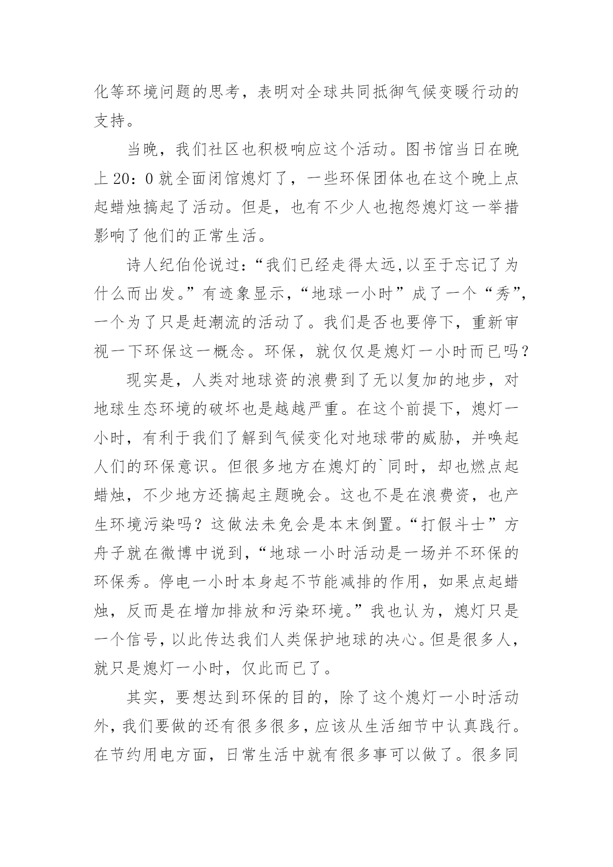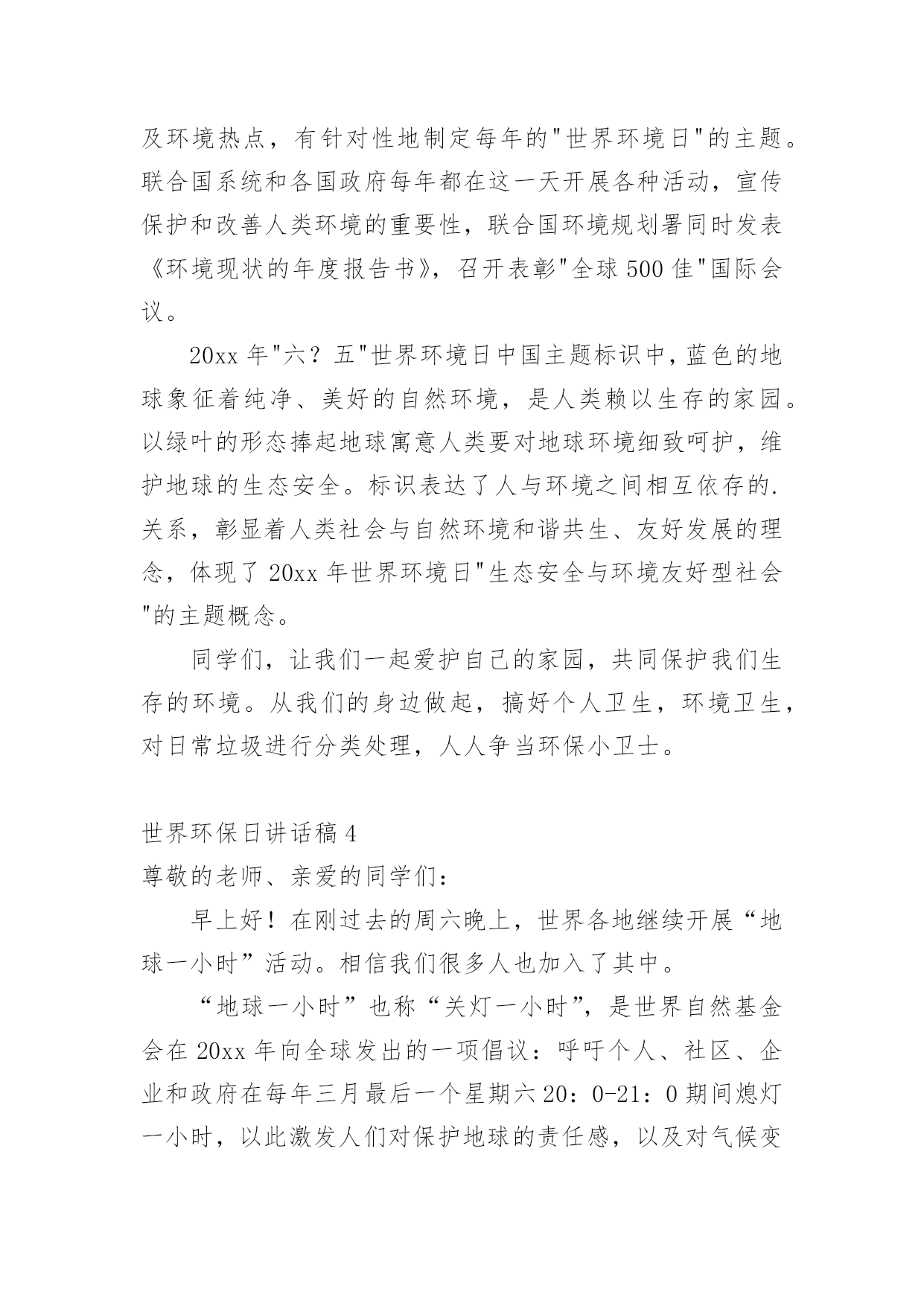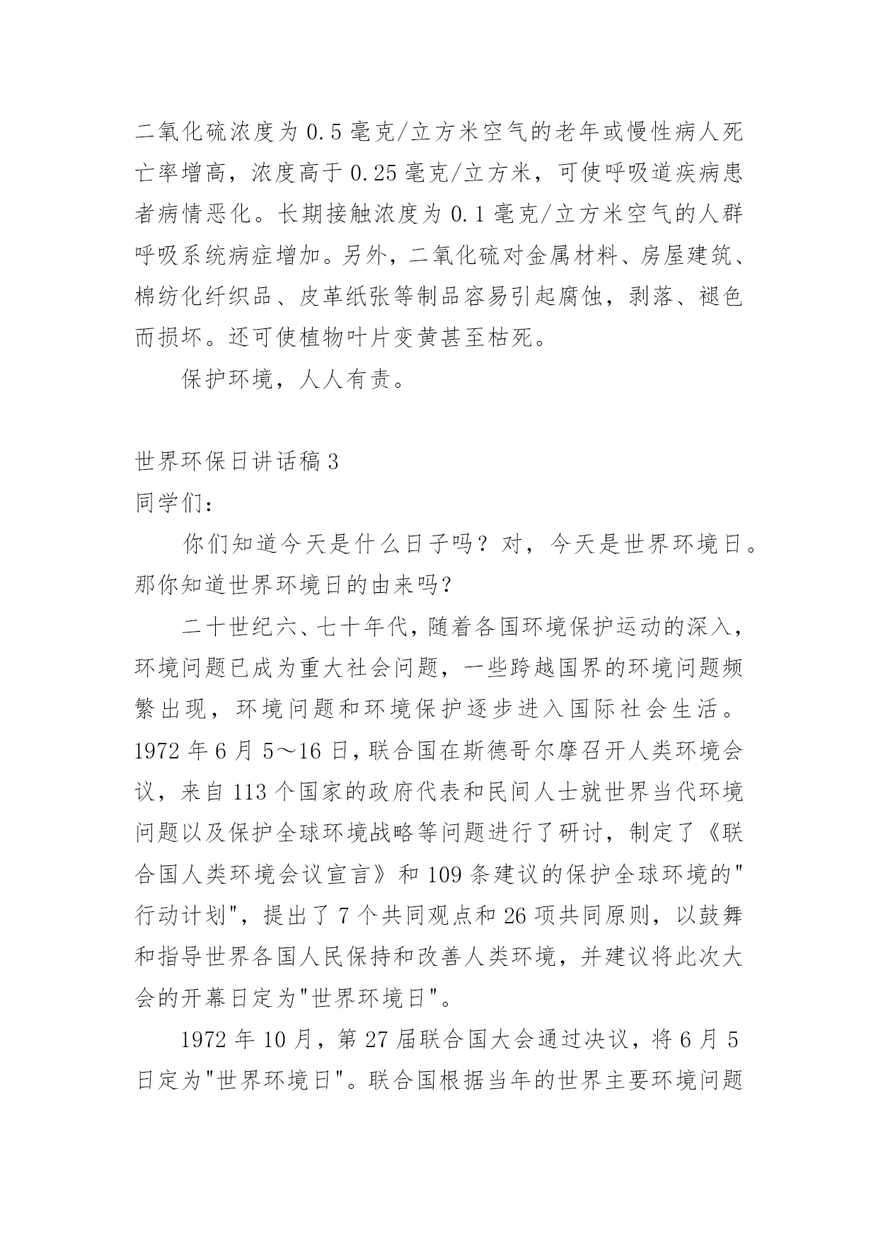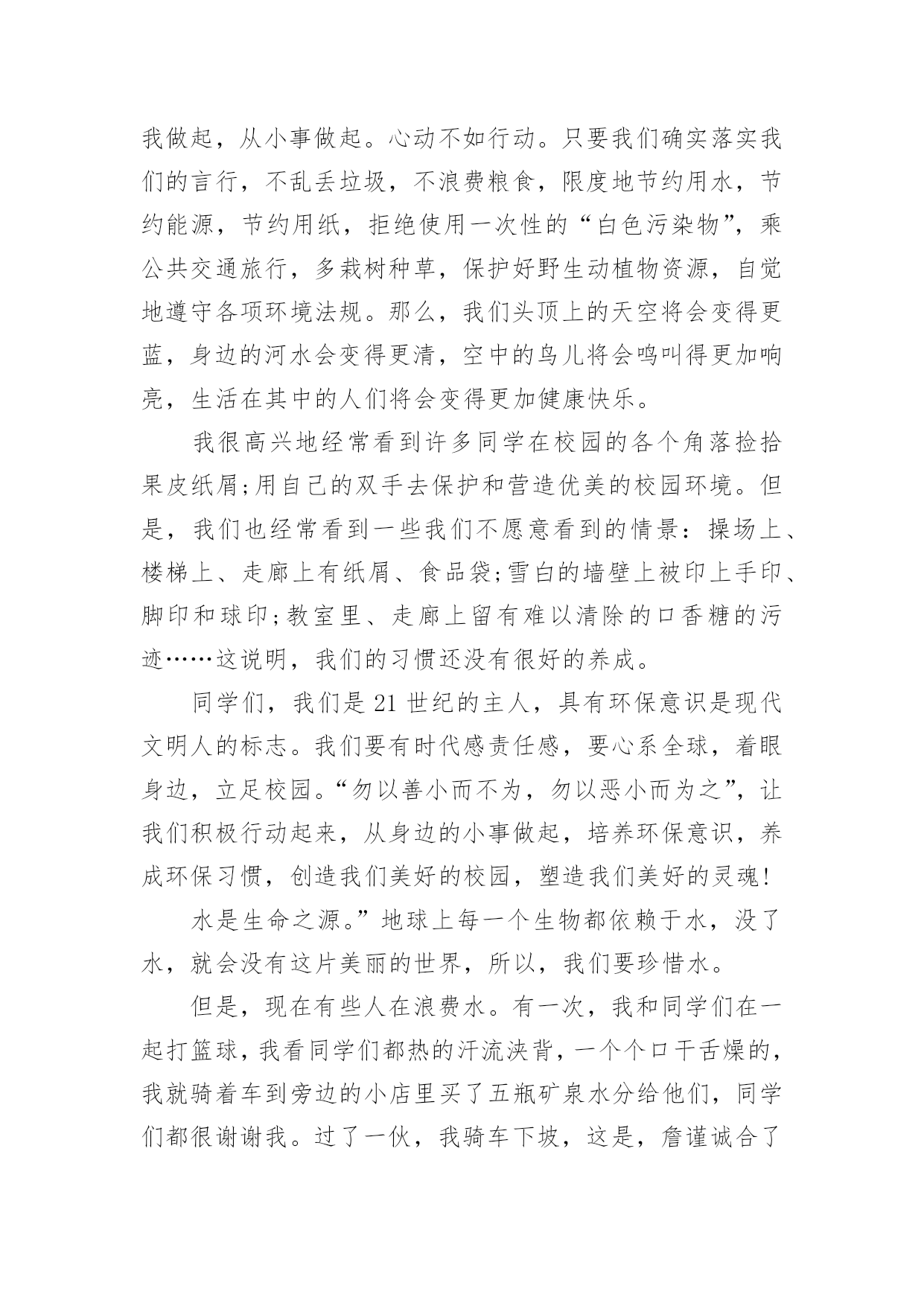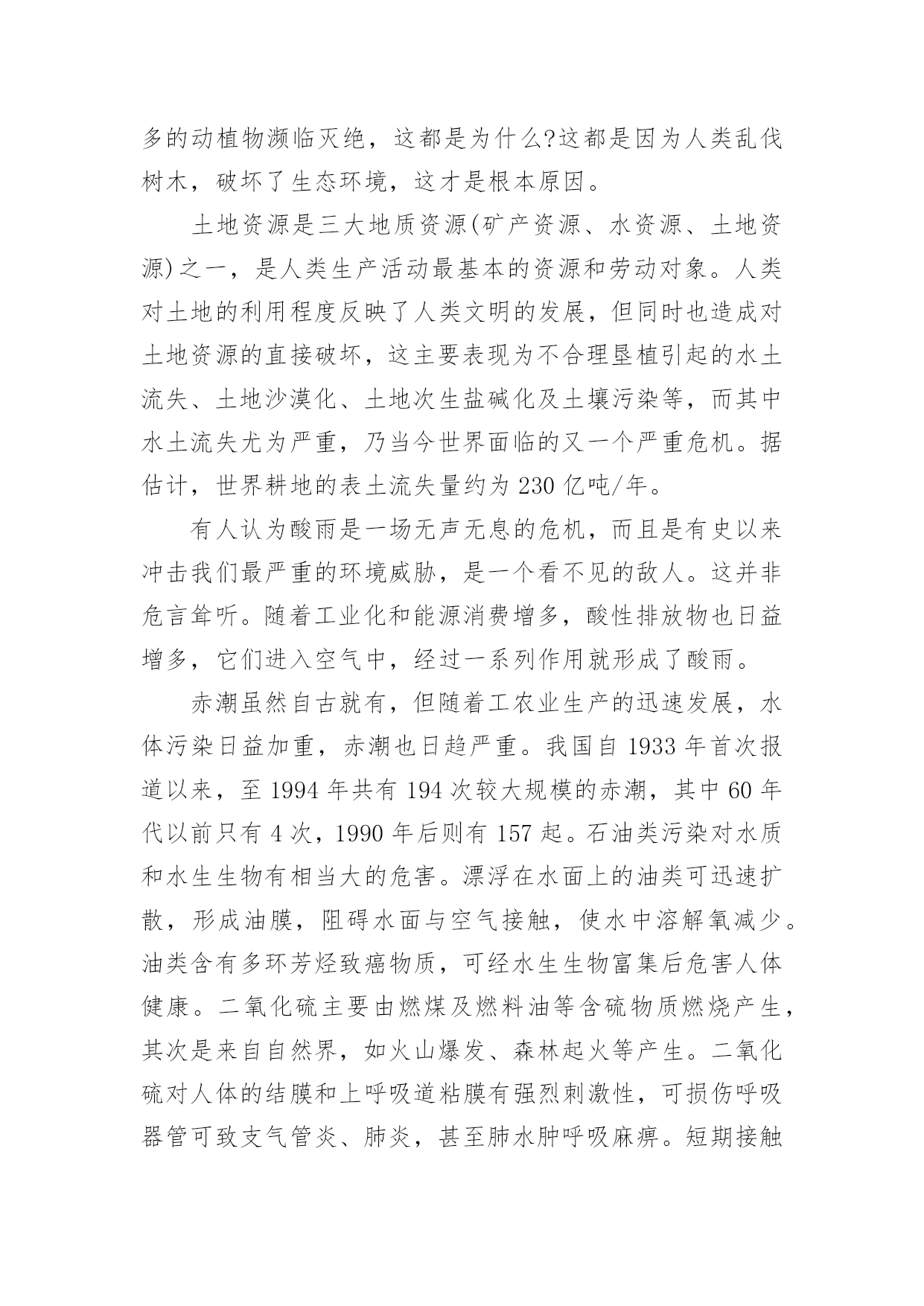 世界环保日讲话稿在快速变化和不断变革的今天,我们需要用到讲话稿的情形越来越多,讲话稿是为发言者表达自己想要讲的话而事先准备好的文稿。为了让您在写讲话稿时更加简单方便,下面是小编整理的世界环保日讲话稿,仅供参考,欢迎大家阅读。世界环保日讲话稿1各位老师、同学们:早上好!在人类生存发展,曾遇到过许多的敌人:战争、灾荒、瘟疫、这每一种敌人都曾使人类付出过惨重的代价。然而,今天人们面临的的敌人,已不是战争、疾病、天灾以及瘟疫,而是无处不在的环境问题!大气污染超标、温室效应增强、臭氧层被破坏、土地沙漠化、水资源污染严重、海洋生态危机、绿色屏障锐减、物种消失加剧、垃圾威胁人类、人口增长过快,这些世界性的环境问题,究其原因,都是人类在发展经济的过程中,对自然资源和生态环境的不合理利用和破坏所致。这一切的现实,让每一个关心祖国前进和发展的中国人深感痛心。保护环境,利在当代,功在千秋,这是一项崇高而伟大的事业,更是中华民族千秋万代利益所在。千里之行,始于足下。保护环境,建设美好家园,要从我做起,从小事做起。心动不如行动。只要我们确实落实我们的言行,不乱丢垃圾,不浪费粮食,限度地节约用水,节约能源,节约用纸,拒绝使用一次性的“白色污染物”,乘公共交通旅行,多栽树种草,保护好野生动植物资源,自觉地遵守各项环境法规。那么,我们头顶上的天空将会变得更蓝,身边的河水会变得更清,空中的鸟儿将会鸣叫得更加响亮,生活在其中的人们将会变得更加健康快乐。我很高兴地经常看到许多同学在校园的各个角落捡拾果皮纸屑;用自己的双手去保护和营造优美的校园环境。但是,我们也经常看到一些我们不愿意看到的情景:操场上、楼梯上、走廊上有纸屑、食品袋;雪白的墙壁上被印上手印、脚印和球印;教室里、走廊上留有难以清除的口香糖的污迹……这说明,我们的习惯还没有很好的养成。同学们,我们是21世纪的主人,具有环保意识是现代文明人的标志。我们要有时代感责任感,要心系全球,着眼身边,立足校园。“勿以善小而不为,勿以恶小而为之”,让我们积极行动起来,从身边的小事做起,培养环保意识,养成环保习惯,创造我们美好的校园,塑造我们美好的灵魂!水是生命之源。”地球上每一个生物都依赖于水,没了水,就会没有这片美丽的世界,所以,我们要珍惜水。但是,现在有些人在浪费水。有一次,我和同学们在一起打篮球,我看同学们都热的汗流浃背,一个个口干舌燥的,我就骑着车到旁边的小店里买了五瓶矿泉水分给他们,同学们都很谢谢我。过了一伙,我骑车下坡,这是,詹谨诚合了一口水在嘴里,当我离他很近时他猛地一喷,水全溅到了我的车上,我很生气,他不仅在浪费我的.钱,还在浪费我们有限的资源,如果我们再这样浪费下去,总有一天人类会消失殆尽,如果他想到这个,他就不会这样浪费水了。还有些人每天都去洗车,你知道我们的水资源还剩多少吗?据统计,全世界有11亿人目前得不到安全的饮用水,另有24亿人缺乏良好的卫生设施。每年有500万人因此丧生,其中每15秒钟就有1名儿童死亡。在20世纪,世界上一半的湿地永远消失,而地下水资源因受到污染或者被过度开采而枯竭殆尽。水资源危机正威胁着世界上的每一个国家和地区。这样算下来,地球上的水已经不到原来的2/3了。大家看了这些数据,肯定会大吃一斤的,所以,请大家珍惜水资源如果我们再这样浪费下去,最后一滴水将是我们人类的眼泪!世界环保日讲话稿2敬爱的老师,亲爱的同学:大家好!6月5日是世界环境日,这是为了纪念1972年在斯德哥尔摩举行的联合国人类环境会议的开幕日,这次会议也是人类第一次真正意义上开始关注全球环境状况,呼吁人类保护环境的历史盛会。因此联合国将6月5日确立为世界环境日,而且每年的世界环境日还确立一个主题。今年世界环境日中国主题为“同呼吸,共奋斗”,这一主题旨在强调绿色消费理念,唤起社会公众转变消费观念和消费行为,节约资源,保护生态环境。中国主题在呼应世界主题的同时,更加强调在生态环境恶化和能源危机日益突出的形势下,充分认识推广绿色消费的重要性和紧迫性,呼吁人人行动起来,在全社会大力推广绿色消费,推动绿色发展。与传统消费模式不同,绿色消费以满足人的基本需求为中心,崇尚节俭、适度,是一种节约资源、减少污染、可持续的消费模式。众所周知,地球上的大气、森林、海洋、野生动植物等,组成了错综复杂而关系密切的自然生态系统,这就是人类赖以生存的基本环境。长期以来,人类把文明的.进程一直滞留在对自然的征服和掠夺上,似乎从未想到对哺育人类的地球在人类生存发展史上,曾遇到过许多的敌人:战争、灾荒、瘟疫,这每一种敌人都曾使人类付出过惨重的代价。然而,今天人类面临的最大敌人是无处不在的环境问题。大气污染的超标,温室效应的增强,臭氧层被破坏,土地沙漠化,海洋生态危机,绿色屏障锐减,物种消失加剧,人口增长过快,这些世界性的环境问题,究其原因,都
