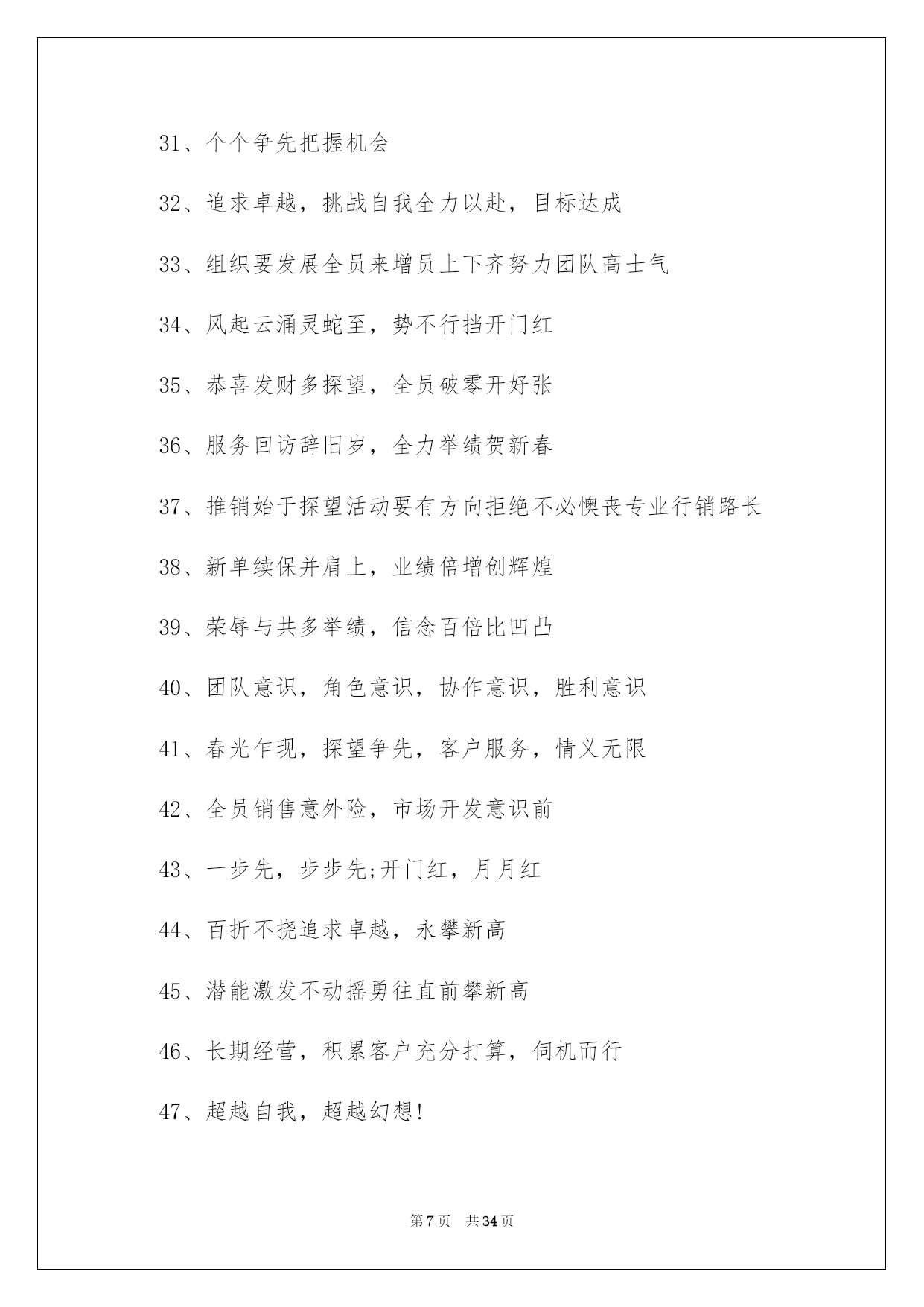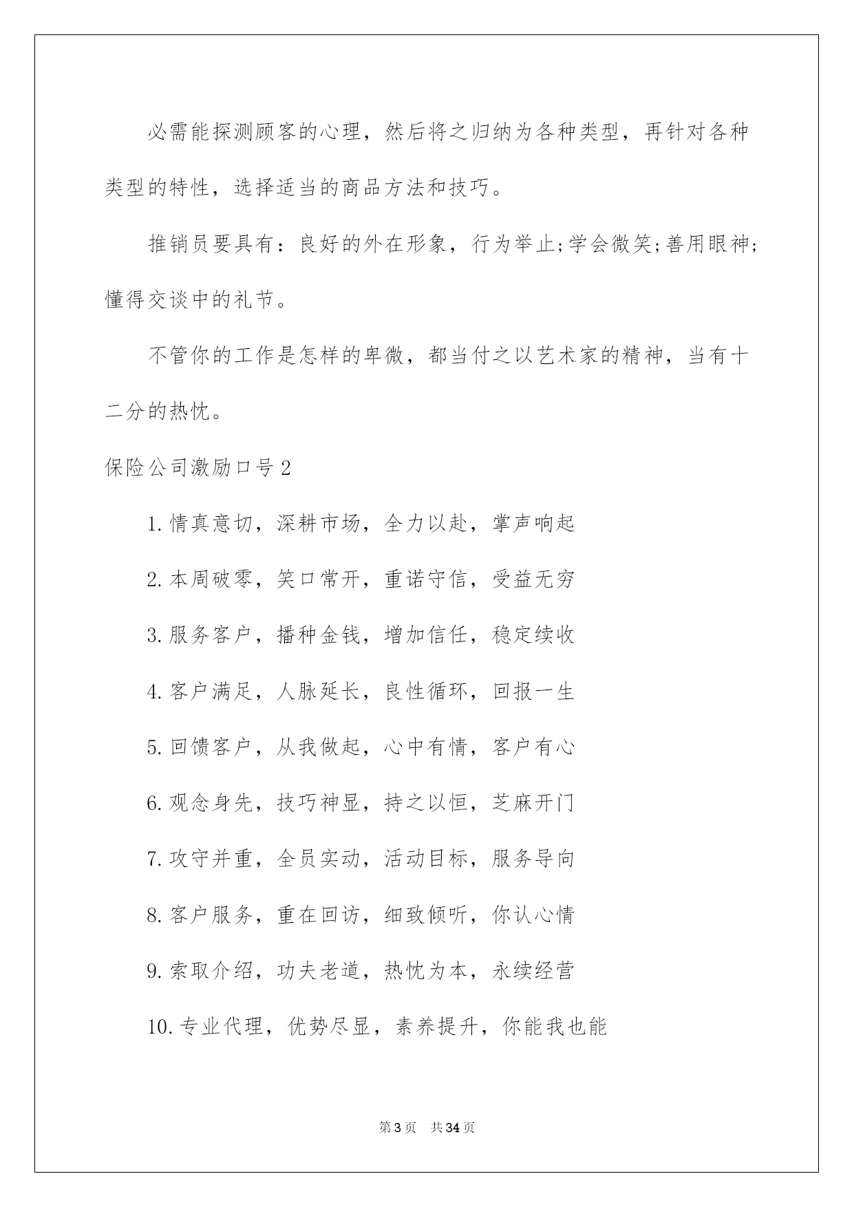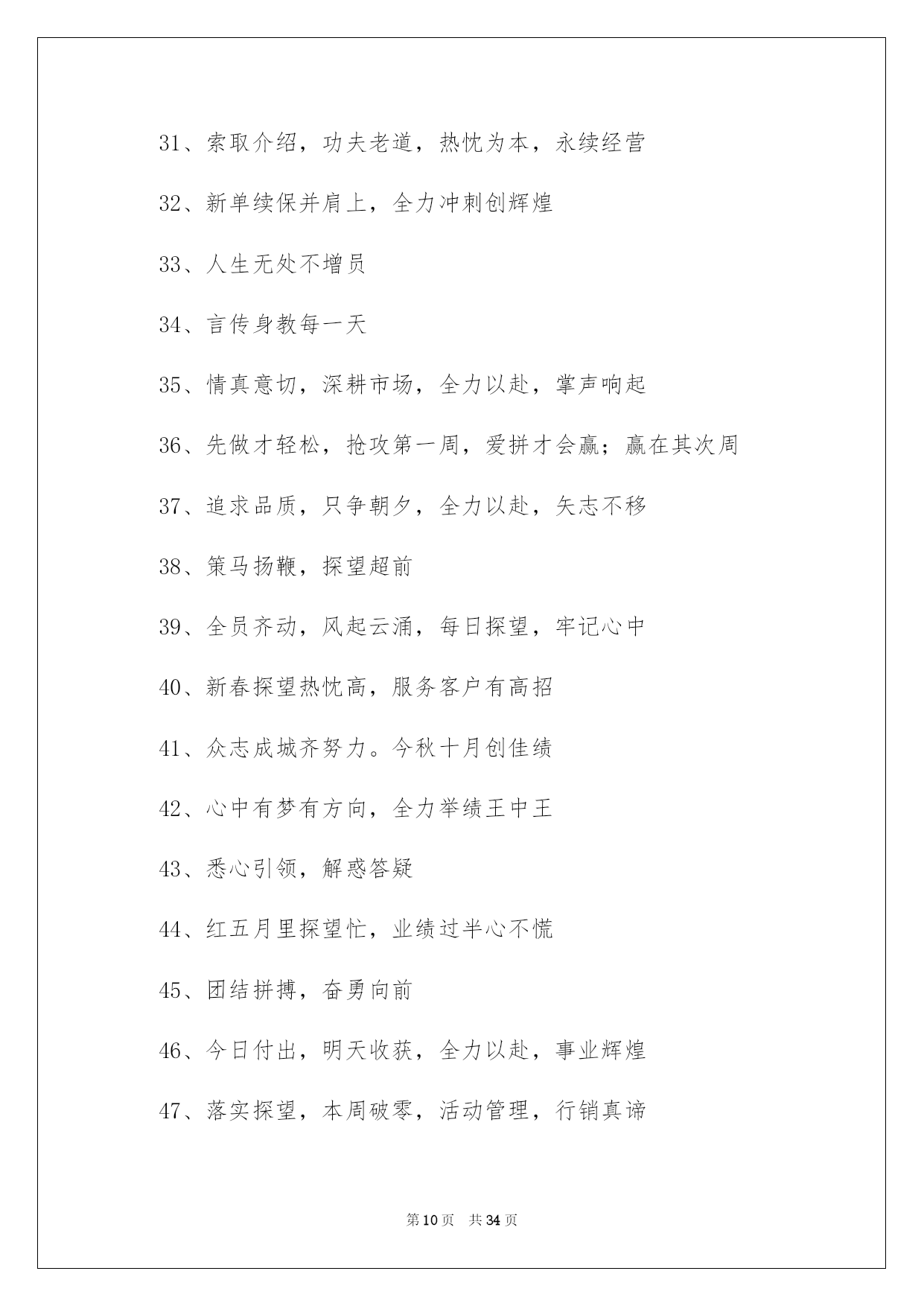 第PAGE\*Arabic\*MERGEFORMAT34页共NUMPAGES\*Arabic\*MERGEFORMAT34页第PAGE\*MERGEFORMAT34页共NUMPAGES\*MERGEFORMAT34页第PAGE\*MERGEFORMAT34页共NUMPAGES\*MERGEFORMAT34页第PAGE\*MERGEFORMAT34页共NUMPAGES\*MERGEFORMAT34页第PAGE\*MERGEFORMAT34页共NUMPAGES\*MERGEFORMAT34页第PAGE\*MERGEFORMAT34页共NUMPAGES\*MERGEFORMAT34页第PAGE\*MERGEFORMAT34页共NUMPAGES\*MERGEFORMAT34页第PAGE\*MERGEFORMAT34页共NUMPAGES\*MERGEFORMAT34页第PAGE\*MERGEFORMAT34页共NUMPAGES\*MERGEFORMAT34页第PAGE\*MERGEFORMAT34页共NUMPAGES\*MERGEFORMAT34页第PAGE\*MERGEFORMAT34页共NUMPAGES\*MERGEFORMAT34页2022保险公司激励口号保险公司激励口号在学习、工作乃至生活中,大家都不行避开地会接触到口号吧,口号一般都用一两句完整的句子来表现一个信息或一个观念,信息单一,简单理解,没有过多的信息须要受众专心记忆和专心理解。口号的类型多样,你所见过的口号是什么样的呢?以下是我帮大家整理的保险公司激励口号,欢迎阅读与保藏。保险公司激励口号1假如你认为每一位胜利者都只有胜利的阅历,那就错了。其实,没有比胜利者拥有更多的是失败阅历。推销员应当探讨自己的洞察力,推断别人性格的实力。应当把探讨别人和探讨激励他们的动机作为重要的事情。一个人假如学会始终让自己的大脑充溢主动,进取,乐观,开心和有希望的想法,那么他就己经解决了人生的一大奇妙。谈话要切题,谈话要有逻辑性,谈话要有力,谈话要充溢自信,要使你推销时的谈话干脆,自然,而且尽可能的简洁。世界上有两种废物:一种是没有什么东西献给社会,另一种是不知怎样把他们己有的东西展示出来。无论是否你得到定单,你都要给你潜在的顾客留下美妙的印象,以便他对你有一个许久的回忆。保重身体,就是保持良好的健康状况,而良好的健康状况有赖于身心的平衡,充足的动力和完全平和的心态。即一种任何事情都扰乱不了的心理状态。一个人外在的形象,反映出他特别的内涵,倘如别人不信任你的外表,你就无法胜利的推销自己。能够打破疆局,取悦客户的方法,就是善用人类疑虑,新奇,傲慢,趋利的特性。当代价来的时候,那种满意感真正是无以伦比的奇妙,但是绝没人说恒心是简洁的。要享受“隐私情报网”的资讯,就必需让同行觉得你是一个情愿和人共享资源,发财机会,秘术高招的人。你愈有恒心,你就会发觉自己愈陷愈深,所以胜利的推销自己,也就是不断地克服障碍。必需能探测顾客的心理,然后将之归纳为各种类型,再针对各种类型的特性,选择适当的商品方法和技巧。推销员要具有:良好的外在形象,行为举止;学会微笑;善用眼神;懂得交谈中的礼节。不管你的工作是怎样的卑微,都当付之以艺术家的精神,当有十二分的热忱。保险公司激励口号21.情真意切,深耕市场,全力以赴,掌声响起2.本周破零,笑口常开,重诺守信,受益无穷3.服务客户,播种金钱,增加信任,稳定续收4.客户满足,人脉延长,良性循环,回报一生5.回馈客户,从我做起,心中有情,客户有心6.观念身先,技巧神显,持之以恒,芝麻开门7.攻守并重,全员实动,活动目标,服务导向8.客户服务,重在回访,细致倾听,你认心情9.索取介绍,功夫老道,热忱为本,永续经营10.专业代理,优势尽显,素养提升,你能我也能保险公司激励口号3一个挚友一条路,多个挚友好走路。一个英雄三个帮,一个篱笆三个桩。生命之灯,因热忱而点烯;生命之舟,因拼搏而前行。拥有幻想只是一种智力,实现幻想才是一种实力。与其诅咒世间黑暗,不如点燃一支蜡烛。太阳每天都是新的,太阳每天都为每颗心而升起!任何山都可以移动,只要把沙土一卡车一卡车运走即可。假如你希望胜利,当以恒心为良友,以阅历为参谋,以当心为兄弟,以希望为哨兵。只要你不去"抓住"懊丧,懊丧是不会附上身的。逆境将志气的刀刃磨得锐利无比。大多数人想改造这个世界,但却罕有人想改造自己。未曾失败的人,唯恐也未曾胜利过。人生伟业的建立,不在能知,乃在能行。挫折其实就是迈向胜利能应缴的学费。任何的限制,都是从自己的内心起先的。忘掉失败,不过要牢记失败中的教训。没有度过长夜