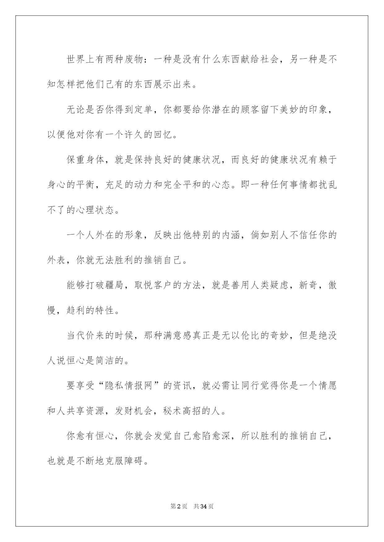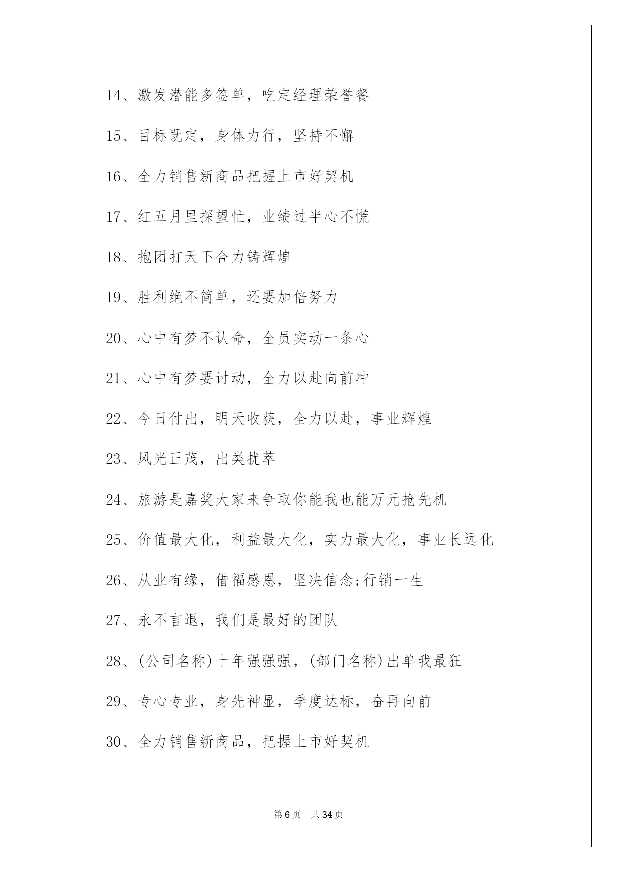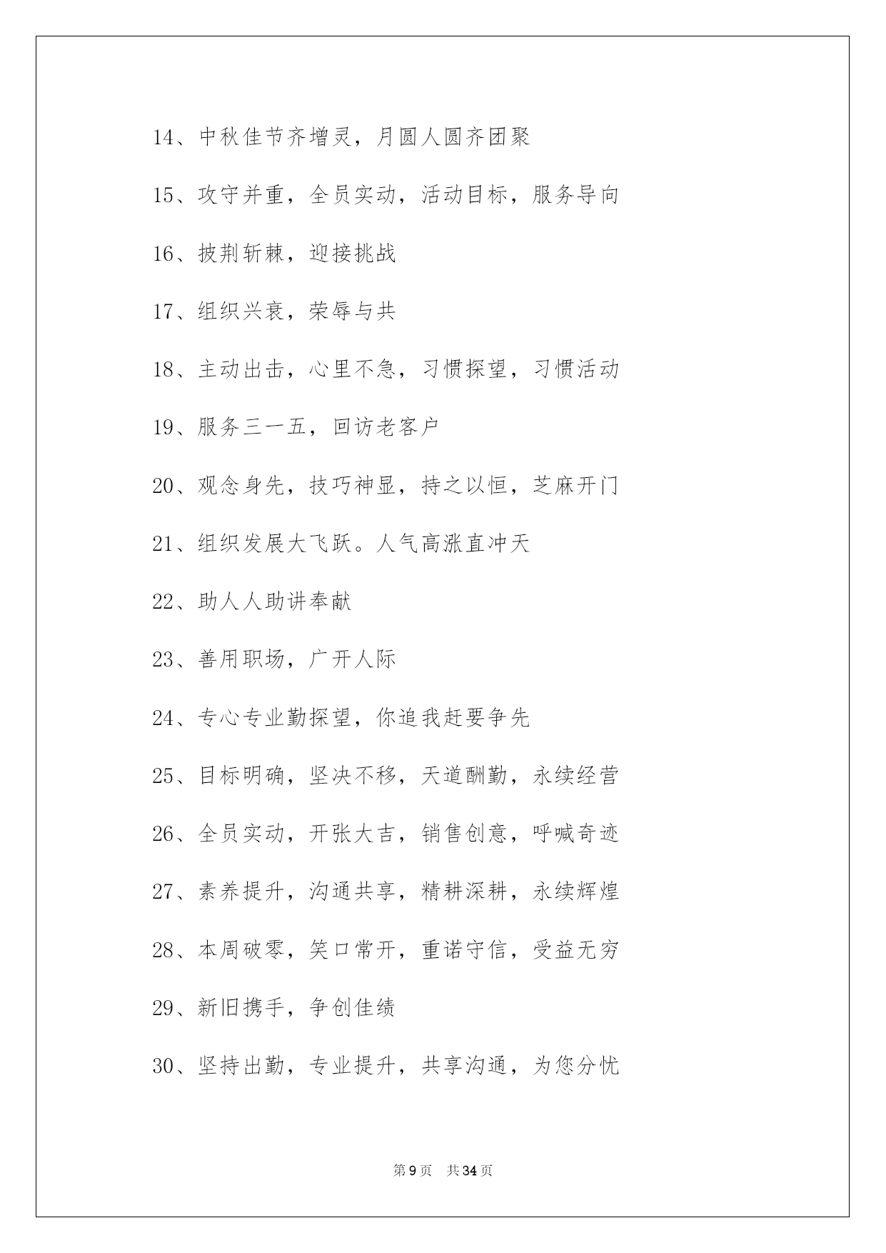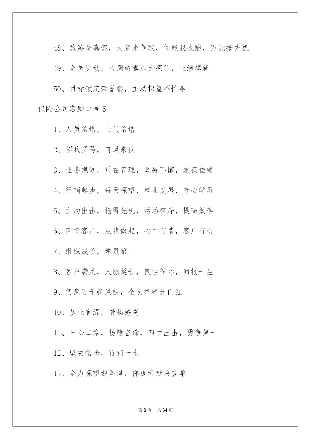 第PAGE\*Arabic\*MERGEFORMAT34页共NUMPAGES\*Arabic\*MERGEFORMAT34页第PAGE\*MERGEFORMAT34页共NUMPAGES\*MERGEFORMAT34页第PAGE\*MERGEFORMAT34页共NUMPAGES\*MERGEFORMAT34页第PAGE\*MERGEFORMAT34页共NUMPAGES\*MERGEFORMAT34页第PAGE\*MERGEFORMAT34页共NUMPAGES\*MERGEFORMAT34页第PAGE\*MERGEFORMAT34页共NUMPAGES\*MERGEFORMAT34页第PAGE\*MERGEFORMAT34页共NUMPAGES\*MERGEFORMAT34页第PAGE\*MERGEFORMAT34页共NUMPAGES\*MERGEFORMAT34页第PAGE\*MERGEFORMAT34页共NUMPAGES\*MERGEFORMAT34页第PAGE\*MERGEFORMAT34页共NUMPAGES\*MERGEFORMAT34页第PAGE\*MERGEFORMAT34页共NUMPAGES\*MERGEFORMAT34页2022保险公司激励口号保险公司激励口号在学习、工作乃至生活中,大家都不行避开地会接触到口号吧,口号一般都用一两句完整的句子来表现一个信息或一个观念,信息单一,简单理解,没有过多的信息须要受众专心记忆和专心理解。口号的类型多样,你所见过的口号是什么样的呢?以下是我帮大家整理的保险公司激励口号,欢迎阅读与保藏。保险公司激励口号1假如你认为每一位胜利者都只有胜利的阅历,那就错了。其实,没有比胜利者拥有更多的是失败阅历。推销员应当探讨自己的洞察力,推断别人性格的实力。应当把探讨别人和探讨激励他们的动机作为重要的事情。一个人假如学会始终让自己的大脑充溢主动,进取,乐观,开心和有希望的想法,那么他就己经解决了人生的一大奇妙。谈话要切题,谈话要有逻辑性,谈话要有力,谈话要充溢自信,要使你推销时的谈话干脆,自然,而且尽可能的简洁。世界上有两种废物:一种是没有什么东西献给社会,另一种是不知怎样把他们己有的东西展示出来。无论是否你得到定单,你都要给你潜在的顾客留下美妙的印象,以便他对你有一个许久的回忆。保重身体,就是保持良好的健康状况,而良好的健康状况有赖于身心的平衡,充足的动力和完全平和的心态。即一种任何事情都扰乱不了的心理状态。一个人外在的形象,反映出他特别的内涵,倘如别人不信任你的外表,你就无法胜利的推销自己。能够打破疆局,取悦客户的方法,就是善用人类疑虑,新奇,傲慢,趋利的特性。当代价来的时候,那种满意感真正是无以伦比的奇妙,但是绝没人说恒心是简洁的。要享受“隐私情报网”的资讯,就必需让同行觉得你是一个情愿和人共享资源,发财机会,秘术高招的人。你愈有恒心,你就会发觉自己愈陷愈深,所以胜利的推销自己,也就是不断地克服障碍。必需能探测顾客的心理,然后将之归纳为各种类型,再针对各种类型的特性,选择适当的商品方法和技巧。推销员要具有:良好的外在形象,行为举止;学会微笑;善用眼神;懂得交谈中的礼节。不管你的工作是怎样的卑微,都当付之以艺术家的精神,当有十二分的热忱。保险公司激励口号21.情真意切,深耕市场,全力以赴,掌声响起2.本周破零,笑口常开,重诺守信,受益无穷3.服务客户,播种金钱,增加信任,稳定续收4.客户满足,人脉延长,良性循环,回报一生5.回馈客户,从我做起,心中有情,客户有心6.观念身先,技巧神显,持之以恒,芝麻开门7.攻守并重,全员实动,活动目标,服务导向8.客户服务,重在回访,细致倾听,你认心情9.索取介绍,功夫老道,热忱为本,永续经营10.专业代理,优势尽显,素养提升,你能我也能保险公司激励口号3一个挚友一条路,多个挚友好走路。一个英雄三个帮,一个篱笆三个桩。生命之灯,因热忱而点烯;生命之舟,因拼搏而前行。拥有幻想只是一种智力,实现幻想才是一种实力。与其诅咒世间黑暗,不如点燃一支蜡烛。太阳每天都是新的,太阳每天都为每颗心而升起!任何山都可以移动,只要把沙土一卡车一卡车运走即可。假如你希望胜利,当以恒心为良友,以阅历为参谋,以当心为兄弟,以希望为哨兵。只要你不去"抓住"懊丧,懊丧是不会附上身的。逆境将志气的刀刃磨得锐利无比。大多数人想改造这个世界,但却罕有人想改造自己。未曾失败的人,唯恐也未曾胜利过。人生伟业的建立,不在能知,乃在能行。挫折其实就是迈向胜利能应缴的学费。任何的限制,都是从自己的内心起先的。忘掉失败,不过要牢记失败中的教训。没有度过长夜