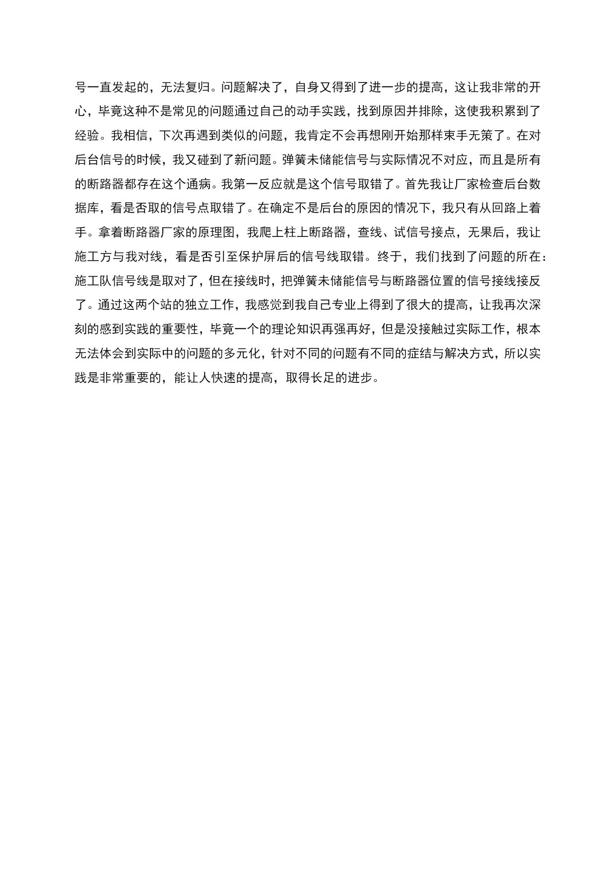 电力技术负责人年终工作总结电力技术负责人年终工作总结到保护班工作不知不觉已经一年半了,从刚开始实习到后来的转正定岗,再到现在自己成为负责人,独立外出工作,一路走来,感触良多。但也使我明白一个道理:理论知识再强,那也是纸上谈兵,要真正的能独当一面,不断实践才是提高自身能力的最快捷径。记得第一次出去调试35千伏独山下司变的时候,我就碰到了一项对于我来说比较大的困难。作为一座改造扩容的农网站,该站的2号主变是从荔波王蒙运过来的老主变,配套的档位变送器及温度计均为老设备。与二期的改造工程的设计图纸不符合。到现场后,施工队负责人就像我提出了老装置与二期工程的新装置配合不起来,无法接线这个问题。刚开始心里面也有点没有底。毕竟在没有老设备说明书与原理图的情况下,我也感到无从下手。后来,在与班上取得联系后,第二天我拿到了老档位变送器的说明书。面对一个没接触过的装置,我拿着说明书与现场的二期图纸,不断的研究、学习,努力思考出一条让老设备与我们新上的设备之间能良好的配合的解决方法。在经过一天的不断试验和努力下,我终于摸清了老设备的工作原理及接线方式,最终实现了我们后台监控机能准确的显示主变的档位显示及远程遥控变压器调档。虽然这件事对于工作年限比较久的老师傅来说,可能是一个小问题。但是,对我来说,的确是一个不小的挑战,毕竟自己面对的是一个自己以前没接触过的装置,难度还是有的。问题得到了解决,通过自我学习与实践,能解决问题,使自我在专业上得到了提高,这让我感到非常的欣慰。接着,在调试35千伏荔波方村变的时候,我又遇到了一个新的问题。2号主变本体保护的压力释放及调压清瓦斯的信号一直处于动作状态。这是我从来没碰见的问题。开始,我认为作为一个新的主变,这两个信号是不应该发的。在百思不得其解的结果下。我唯有爬上主变,对照图纸检查主变的本体接线。在得出接线正确的结果后,我真的有点丈二和尚摸不着头脑。无意中,我看见调压瓦斯继电器内油面距离顶端有一段不小的距离。我在想,是不是由于这些气体的存在才产生这个原因的。当我把瓦斯继电器内的气体排掉后,终于,调压轻瓦斯信号不动作了。但压力释放仍是一直动作,在实在找不到问题原因的情况下,我换了一个思考方式:是不是压力释放的继电器的确是动作的?把压力释放继电器拆开后,通过使用万用表对压力释放继电器的两付节点量通断。我终于找到了问题的所在:压力释放继电器本身的接点已粘死,因此动作信号一直发起的,无法复归。问题解决了,自身又得到了进一步的提高,这让我非常的开心,毕竟这种不是常见的问题通过自己的动手实践,找到原因并排除,这使我积累到了经验。我相信,下次再遇到类似的问题,我肯定不会再想刚开始那样束手无策了。在对后台信号的时候,我又碰到了新问题。弹簧未储能信号与实际情况不对应,而且是所有的断路器都存在这个通病。我第一反应就是这个信号取错了。首先我让厂家检查后台数据库,看是否取的信号点取错了。在确定不是后台的原因的情况下,我只有从回路上着手。拿着断路器厂家的原理图,我爬上柱上断路器,查线、试信号接点,无果后,我让施工方与我对线,看是否引至保护屏后的信号线取错。终于,我们找到了问题的所在:施工队信号线是取对了,但在接线时,把弹簧未储能信号与断路器位置的信号接线接反了。通过这两个站的独立工作,我感觉到我自己专业上得到了很大的提高,让我再次深刻的感到实践的重要性,毕竟一个的理论知识再强再好,但是没接触过实际工作,根本无法体会到实际中的问题的多元化,针对不同的问题有不同的症结与解决方式,所以实践是非常重要的,能让人快速的提高,取得长足的进步。