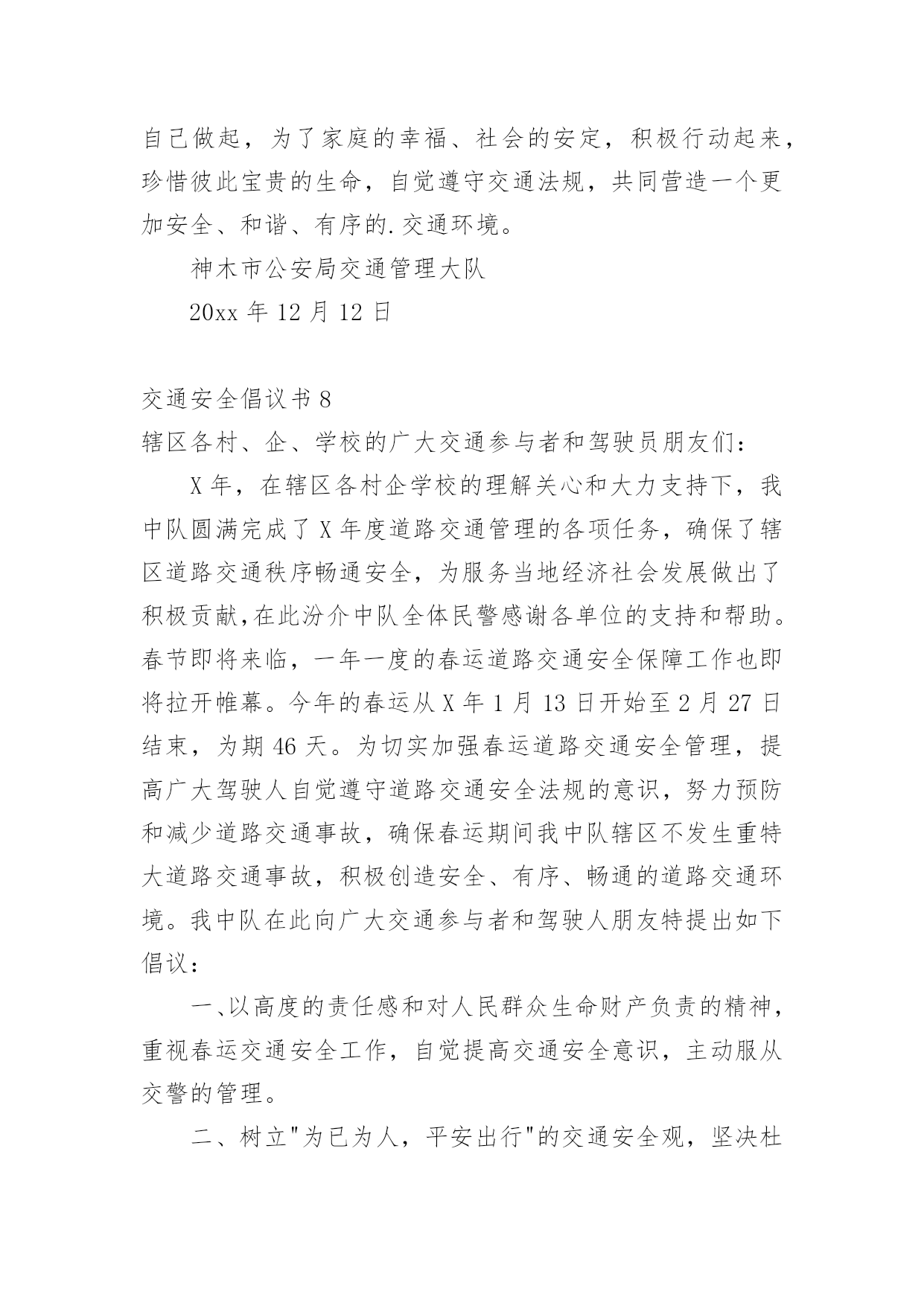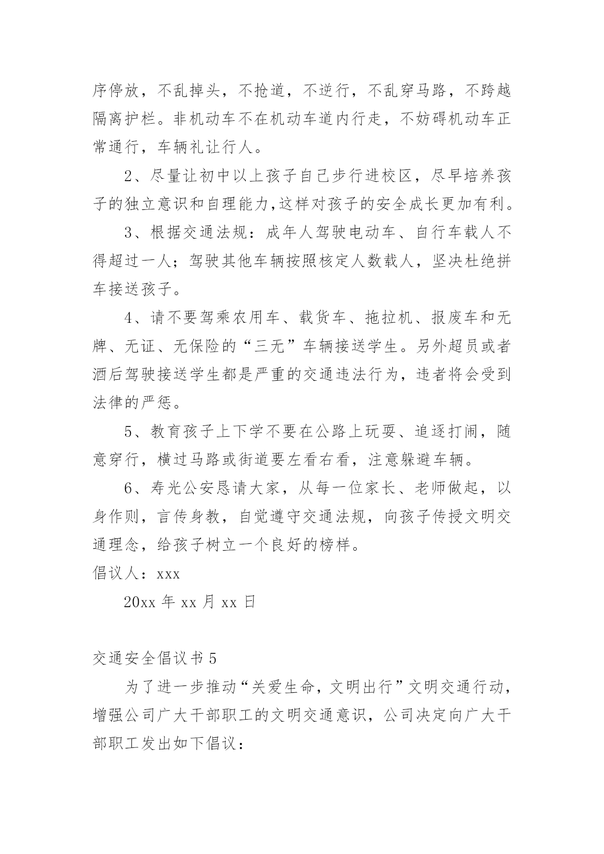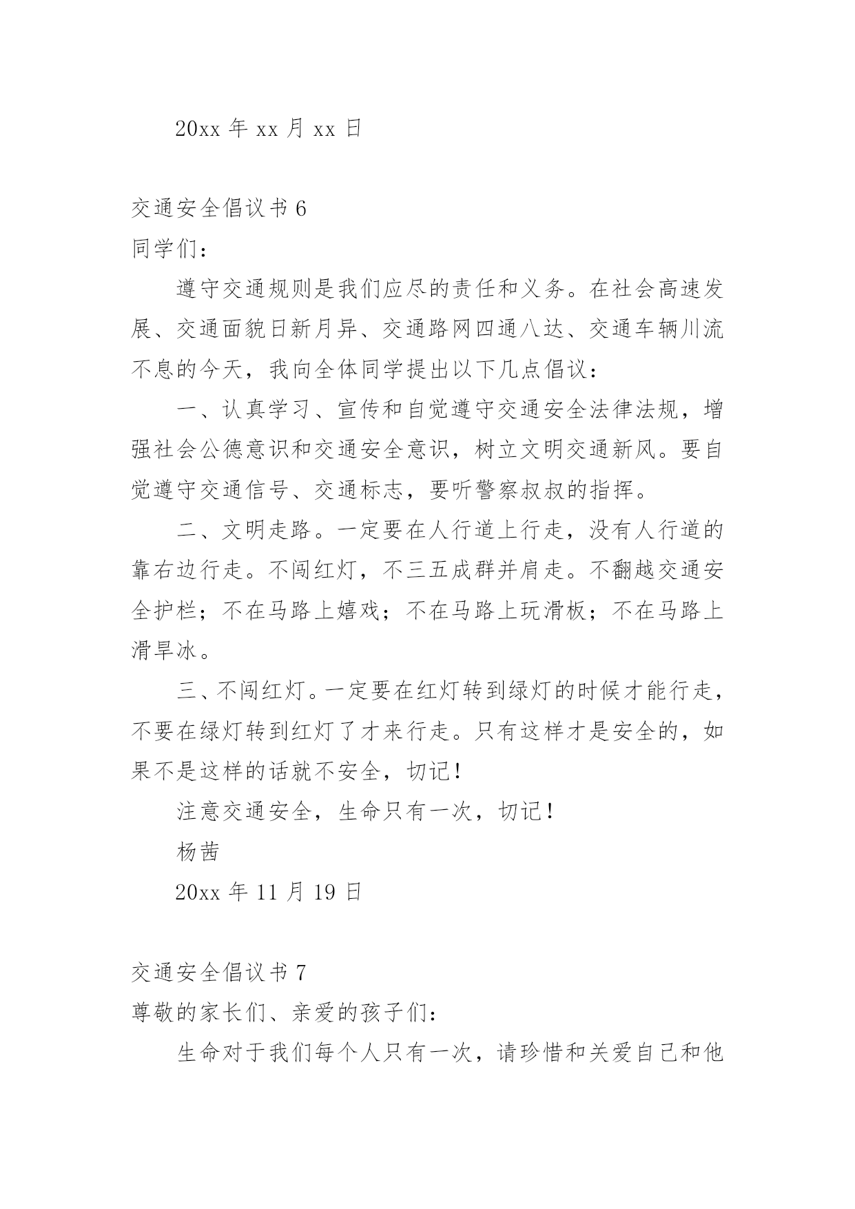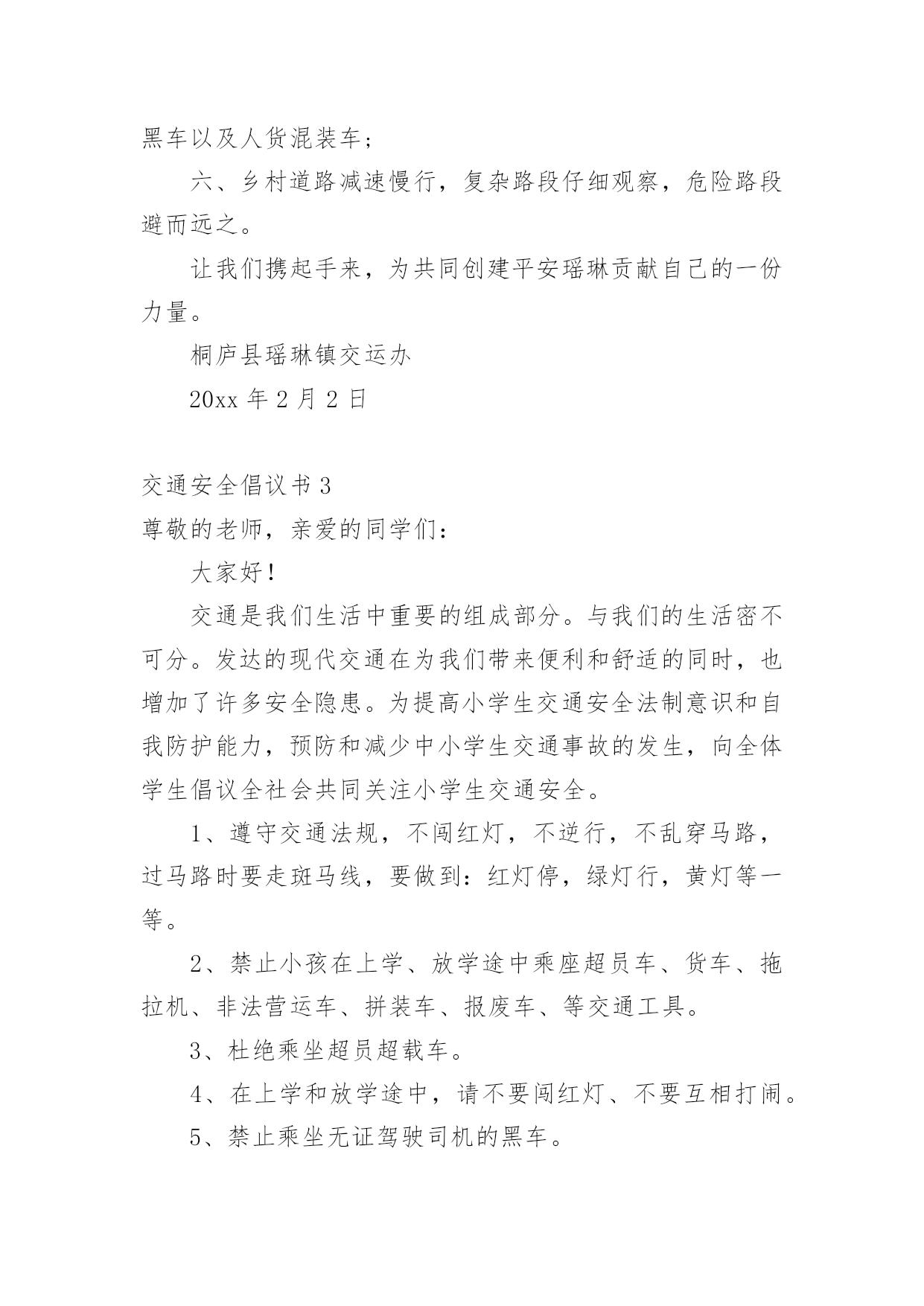 交通安全倡议书交通安全倡议书合集15篇在日常生活和工作中,越来越多人会去使用倡议书,不同的倡议书内容同样也是不同的。那么你有了解过倡议书吗?以下是小编收集整理的交通安全倡议书,欢迎大家借鉴与参考,希望对大家有所帮助。交通安全倡议书1尊敬的老师,亲爱的同学:交通文明,人人有责。交通安全,合力创造!安全文明的校园交通秩序需要我们大家共同维护,和谐稳定的校园氛围需要我们大家共同营造。让我们共同行动起来,规范驾驶、文明骑车、安全走路,从自身做起,从点滴做起,争做文明湖工人!特提出以下倡议:1、自觉遵守各项交通法规,共同维护校园交通秩序。2、倡导绿色校园交通,南家属区教工尽量步行或骑自行车上、下班,校内办事尽量不开车。3、机动车、电瓶车进入校园服从管理和指挥,进出校门时自觉排队,主动配合门卫执勤人员指挥。4、校园内严格按照机非分离要求,机动车不走非机动车道,自行车不驶入机动车道,行人自觉走行人道。5、驾驶机动车在校园内行驶时,减速慢行(车速控制在20km/h),礼让行人和非机动车。6、机动车在校园内不鸣笛和播放高音音响,自行车不并排齐行,行人过马路注意观望来往车辆。4、机动车遵守校园道路标志标线,按指定停车位泊车,车辆停放整齐,为其他车辆留置合理空间。杜绝主干道占道停放或绿化带上停车。文明校园有我在,和谐交通伴我行。让我们一起行动起来,多一份平安,少一分违规;多一份责任,少一分危险!倡议人:___20xx年_月_日交通安全倡议书2值此新春佳节之际,我镇结合县道路交通安全综合治理专项工作的有关要求,为确保全镇人民过上安全、幸福、祥和的春节,特向全镇人民发出如下交通安全倡议:一、增强交通安全意识,重视交通安全防范,及时消除交通安全隐患;二、切实遵守道路交通安全法,共同维护道路交通运行秩序,努力为平安出行创建良好环境;三、自觉做到“文明过马路、礼让斑马线”;四、杜绝酒后驾车、酒后骑乘摩托车以及骑乘摩托车不戴头盔等恶习、陋习;五、不乘坐非法营运的电动三轮车、摩托车、超载车、黑车以及人货混装车;六、乡村道路减速慢行,复杂路段仔细观察,危险路段避而远之。让我们携起手来,为共同创建平安瑶琳贡献自己的一份力量。桐庐县瑶琳镇交运办20xx年2月2日交通安全倡议书3尊敬的老师,亲爱的同学们:大家好!交通是我们生活中重要的组成部分。与我们的生活密不可分。发达的现代交通在为我们带来便利和舒适的同时,也增加了许多安全隐患。为提高小学生交通安全法制意识和自我防护能力,预防和减少中小学生交通事故的发生,向全体学生倡议全社会共同关注小学生交通安全。1、遵守交通法规,不闯红灯,不逆行,不乱穿马路,过马路时要走斑马线,要做到:红灯停,绿灯行,黄灯等一等。2、禁止小孩在上学、放学途中乘座超员车、货车、拖拉机、非法营运车、拼装车、报废车、等交通工具。3、杜绝乘坐超员超载车。4、在上学和放学途中,请不要闯红灯、不要互相打闹。5、禁止乘坐无证驾驶司机的黑车。当你忽视交通法规的时候,当你不遵守交通法规的时候,你是否看到曾经一个个鲜活的生命消失在飞驰的车轮下;曾经的欢声笑语瞬间销声匿迹;一个个幸福美满的家庭转眼间残缺不堪!多么希望生活的每一天都是五彩缤纷,多么希望每一天都能成为最美好的记忆,多么希望每一天都是最难忘的纪念日。为了您和家人的幸福,请注意安全。同学们,态度决定一切,让我们端正态度,正视安全隐患,牢记“安全责任重于泰山”,“生命价值高于一切”,安全无小事!生命价更高。同学们,你们是祖国的花朵、民族的未来、家庭的希望,不仅关系到一个家庭的幸福美满,而且关系到国家、民族的兴衰和发展,让我们珍惜生命,珍爱未来,从我做起,从现在做起,抵制陋习,远离事故,做一个讲文明、守法纪的好学生。倡议人:xxx20xx年xx月xx日交通安全倡议书4尊敬的各位家长、老师:你们好!当前接送孩子上下学车辆乱停乱放、人车抢道、随意横穿道路等引发道路拥堵现象,带来了极大的交通安全隐患。为了孩子和您的生命财产安全,寿光市教育局、寿光市公安局真诚发出如下倡议:1、自觉将接送孩子车辆离校门口远一点两侧排队、有序停放,不乱掉头,不抢道,不逆行,不乱穿马路,不跨越隔离护栏。非机动车不在机动车道内行走,不妨碍机动车正常通行,车辆礼让行人。2、尽量让初中以上孩子自己步行进校区,尽早培养孩子的独立意识和自理能力,这样对孩子的安全成长更加有利。3、根据交通法规:成年人驾驶电动车、自行车载人不得超过一人;驾驶其他车辆按照核定人数载人,坚决杜绝拼车接送孩子。4、请不要驾乘农用车、载货车、拖拉机、报废车和无牌、无证、无保险的“三无”车辆接送学生。另外超员或者酒后驾驶接送学生都是严重的交通违法行为,违者将会受到法律的严惩。5、教育孩子上下学不要在公路上玩耍、追逐打闹,随意穿行,横过马路或街道要左看右看,注意躲避车辆。6、寿光公
