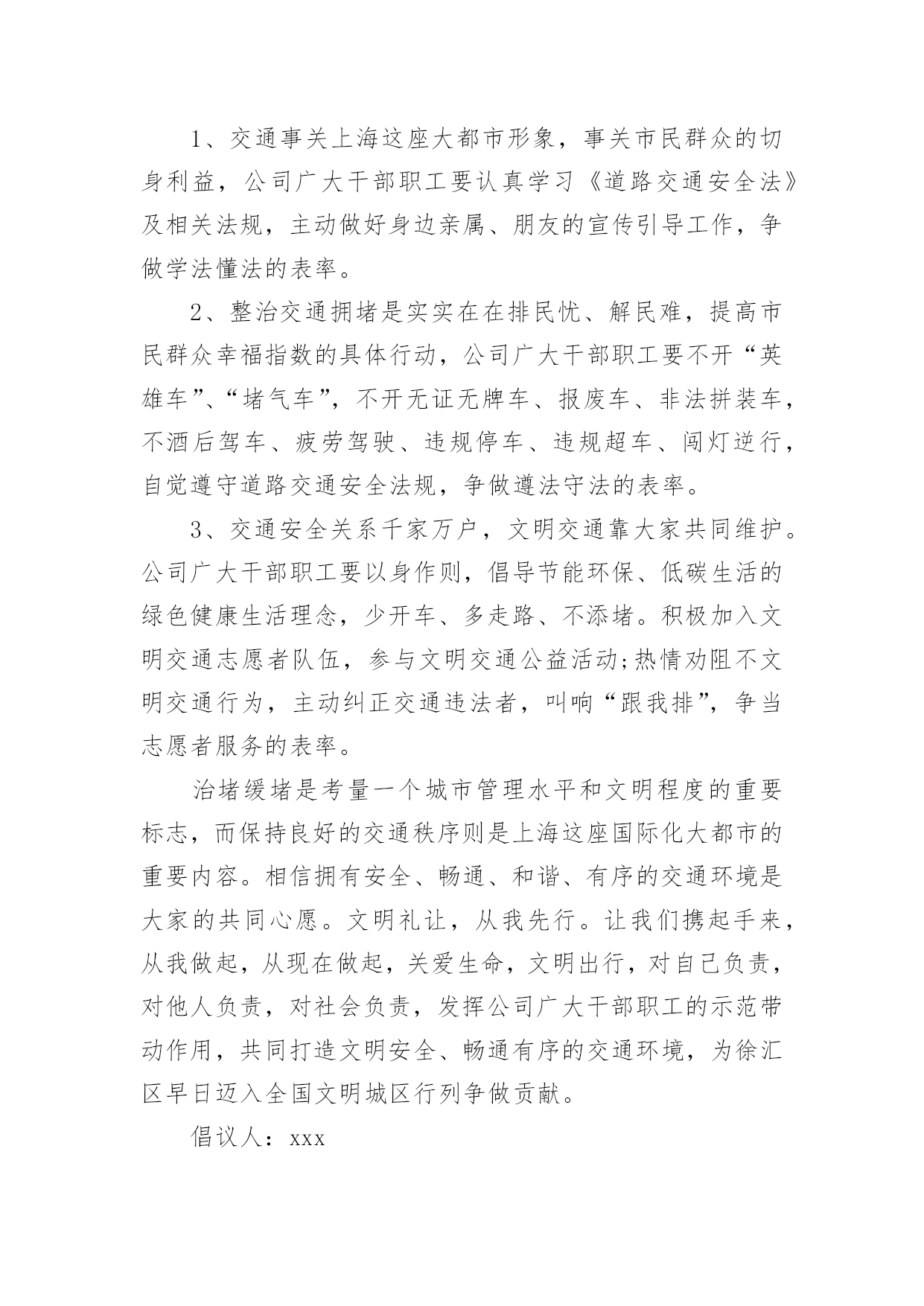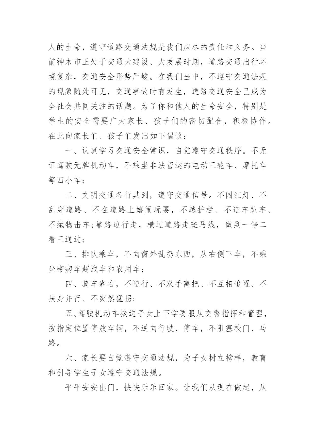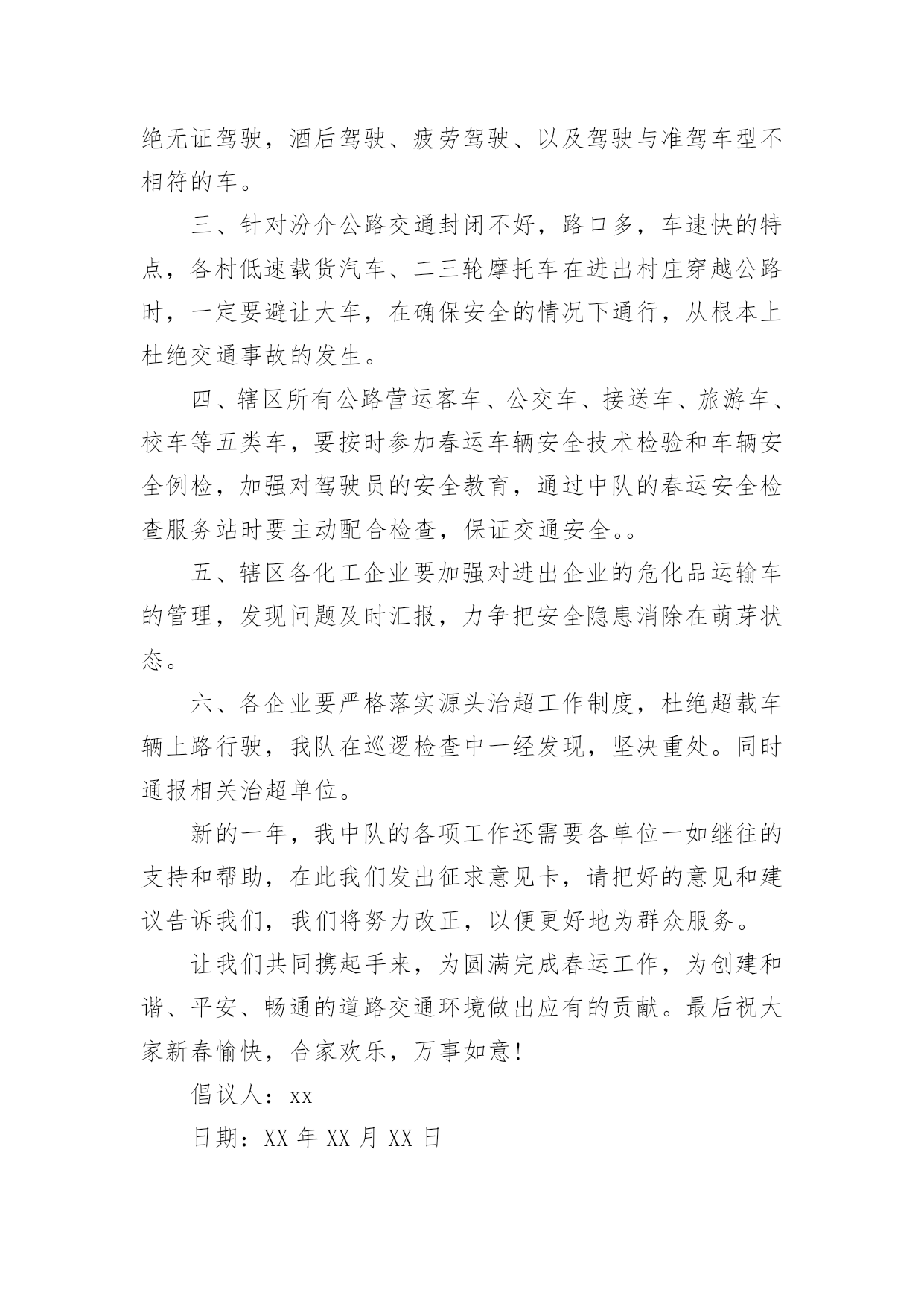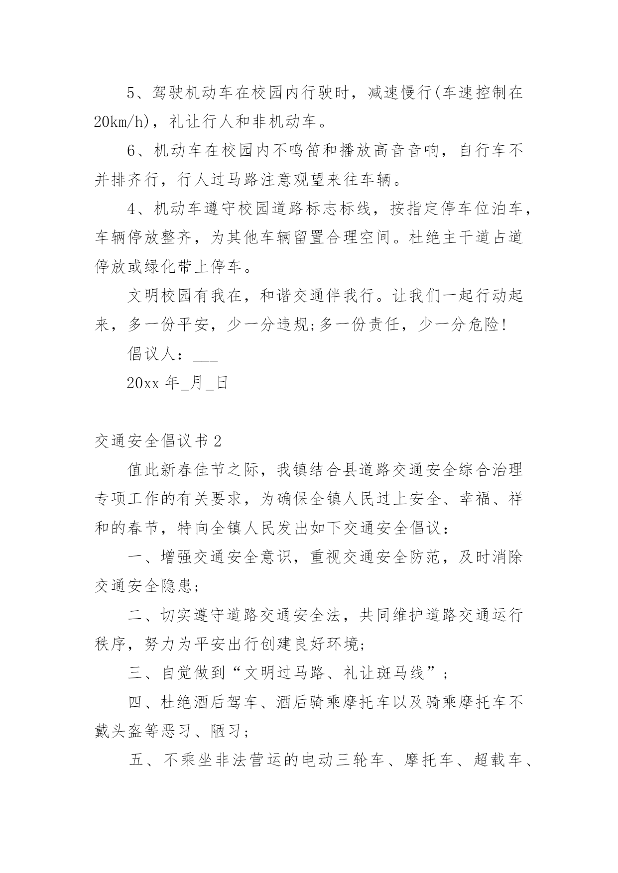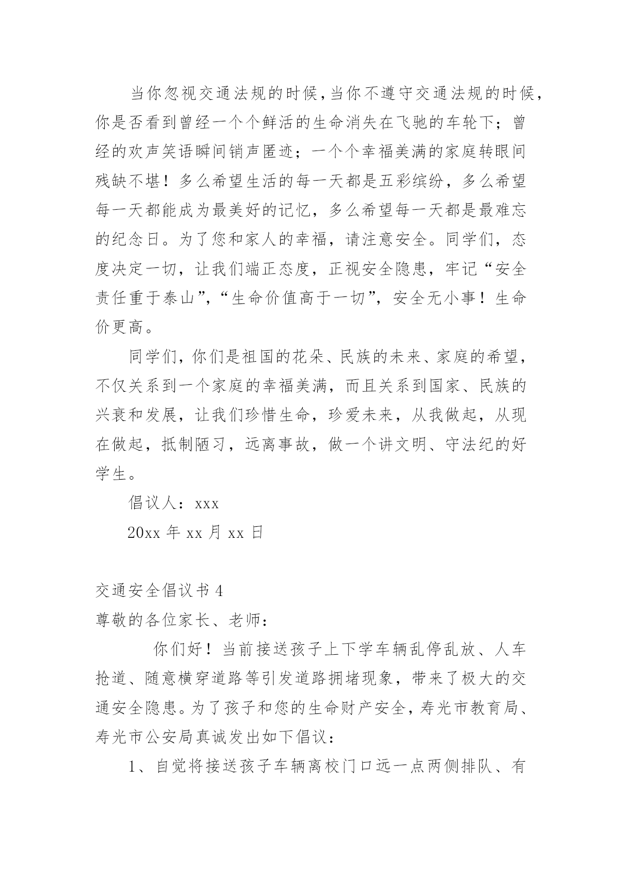 交通安全倡议书交通安全倡议书合集15篇在日常生活和工作中,越来越多人会去使用倡议书,不同的倡议书内容同样也是不同的。那么你有了解过倡议书吗?以下是小编收集整理的交通安全倡议书,欢迎大家借鉴与参考,希望对大家有所帮助。交通安全倡议书1尊敬的老师,亲爱的同学:交通文明,人人有责。交通安全,合力创造!安全文明的校园交通秩序需要我们大家共同维护,和谐稳定的校园氛围需要我们大家共同营造。让我们共同行动起来,规范驾驶、文明骑车、安全走路,从自身做起,从点滴做起,争做文明湖工人!特提出以下倡议:1、自觉遵守各项交通法规,共同维护校园交通秩序。2、倡导绿色校园交通,南家属区教工尽量步行或骑自行车上、下班,校内办事尽量不开车。3、机动车、电瓶车进入校园服从管理和指挥,进出校门时自觉排队,主动配合门卫执勤人员指挥。4、校园内严格按照机非分离要求,机动车不走非机动车道,自行车不驶入机动车道,行人自觉走行人道。5、驾驶机动车在校园内行驶时,减速慢行(车速控制在20km/h),礼让行人和非机动车。6、机动车在校园内不鸣笛和播放高音音响,自行车不并排齐行,行人过马路注意观望来往车辆。4、机动车遵守校园道路标志标线,按指定停车位泊车,车辆停放整齐,为其他车辆留置合理空间。杜绝主干道占道停放或绿化带上停车。文明校园有我在,和谐交通伴我行。让我们一起行动起来,多一份平安,少一分违规;多一份责任,少一分危险!倡议人:___20xx年_月_日交通安全倡议书2值此新春佳节之际,我镇结合县道路交通安全综合治理专项工作的有关要求,为确保全镇人民过上安全、幸福、祥和的春节,特向全镇人民发出如下交通安全倡议:一、增强交通安全意识,重视交通安全防范,及时消除交通安全隐患;二、切实遵守道路交通安全法,共同维护道路交通运行秩序,努力为平安出行创建良好环境;三、自觉做到“文明过马路、礼让斑马线”;四、杜绝酒后驾车、酒后骑乘摩托车以及骑乘摩托车不戴头盔等恶习、陋习;五、不乘坐非法营运的电动三轮车、摩托车、超载车、黑车以及人货混装车;六、乡村道路减速慢行,复杂路段仔细观察,危险路段避而远之。让我们携起手来,为共同创建平安瑶琳贡献自己的一份力量。桐庐县瑶琳镇交运办20xx年2月2日交通安全倡议书3尊敬的老师,亲爱的同学们:大家好!交通是我们生活中重要的组成部分。与我们的生活密不可分。发达的现代交通在为我们带来便利和舒适的同时,也增加了许多安全隐患。为提高小学生交通安全法制意识和自我防护能力,预防和减少中小学生交通事故的发生,向全体学生倡议全社会共同关注小学生交通安全。1、遵守交通法规,不闯红灯,不逆行,不乱穿马路,过马路时要走斑马线,要做到:红灯停,绿灯行,黄灯等一等。2、禁止小孩在上学、放学途中乘座超员车、货车、拖拉机、非法营运车、拼装车、报废车、等交通工具。3、杜绝乘坐超员超载车。4、在上学和放学途中,请不要闯红灯、不要互相打闹。5、禁止乘坐无证驾驶司机的黑车。当你忽视交通法规的时候,当你不遵守交通法规的时候,你是否看到曾经一个个鲜活的生命消失在飞驰的车轮下;曾经的欢声笑语瞬间销声匿迹;一个个幸福美满的家庭转眼间残缺不堪!多么希望生活的每一天都是五彩缤纷,多么希望每一天都能成为最美好的记忆,多么希望每一天都是最难忘的纪念日。为了您和家人的幸福,请注意安全。同学们,态度决定一切,让我们端正态度,正视安全隐患,牢记“安全责任重于泰山”,“生命价值高于一切”,安全无小事!生命价更高。同学们,你们是祖国的花朵、民族的未来、家庭的希望,不仅关系到一个家庭的幸福美满,而且关系到国家、民族的兴衰和发展,让我们珍惜生命,珍爱未来,从我做起,从现在做起,抵制陋习,远离事故,做一个讲文明、守法纪的好学生。倡议人:xxx20xx年xx月xx日交通安全倡议书4尊敬的各位家长、老师:你们好!当前接送孩子上下学车辆乱停乱放、人车抢道、随意横穿道路等引发道路拥堵现象,带来了极大的交通安全隐患。为了孩子和您的生命财产安全,寿光市教育局、寿光市公安局真诚发出如下倡议:1、自觉将接送孩子车辆离校门口远一点两侧排队、有序停放,不乱掉头,不抢道,不逆行,不乱穿马路,不跨越隔离护栏。非机动车不在机动车道内行走,不妨碍机动车正常通行,车辆礼让行人。2、尽量让初中以上孩子自己步行进校区,尽早培养孩子的独立意识和自理能力,这样对孩子的安全成长更加有利。3、根据交通法规:成年人驾驶电动车、自行车载人不得超过一人;驾驶其他车辆按照核定人数载人,坚决杜绝拼车接送孩子。4、请不要驾乘农用车、载货车、拖拉机、报废车和无牌、无证、无保险的“三无”车辆接送学生。另外超员或者酒后驾驶接送学生都是严重的交通违法行为,违者将会受到法律的严惩。5、教育孩子上下学不要在公路上玩耍、追逐打闹,随意穿行,横过马路或街道要左看右看,注意躲避车辆。6、寿光公