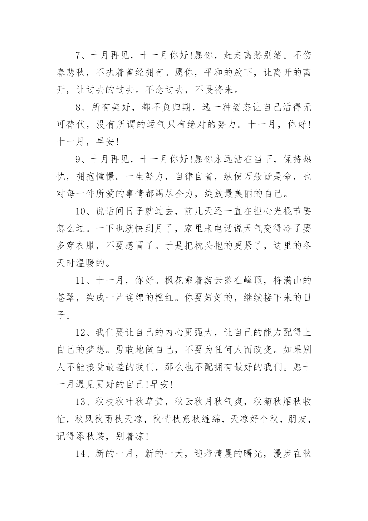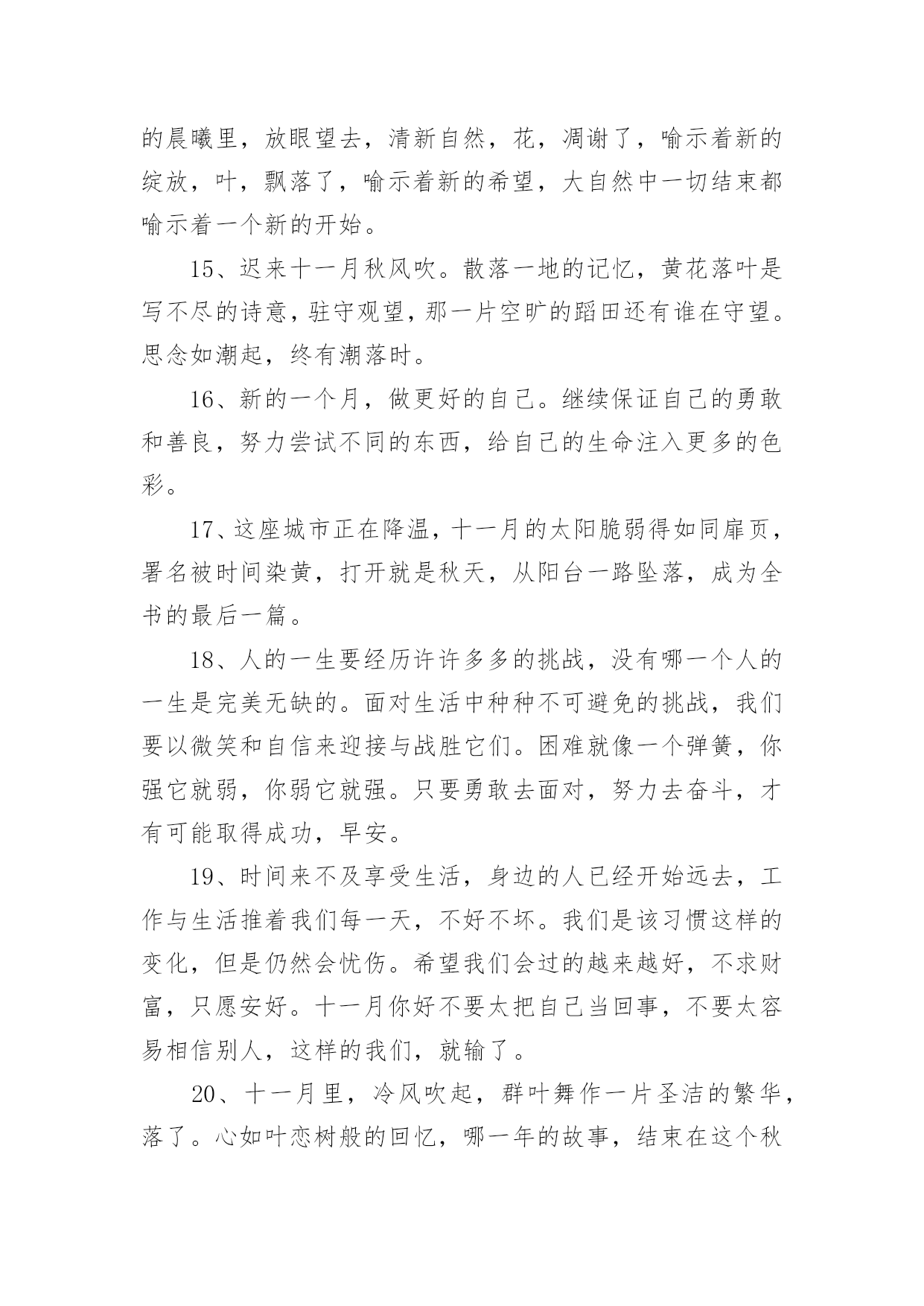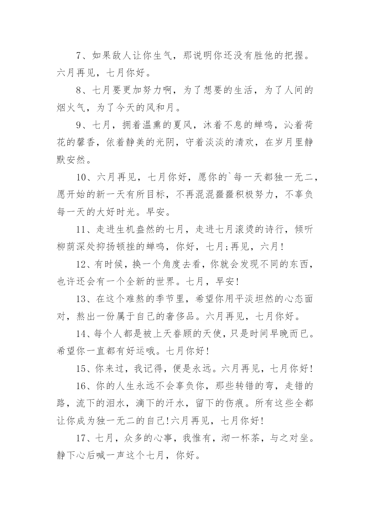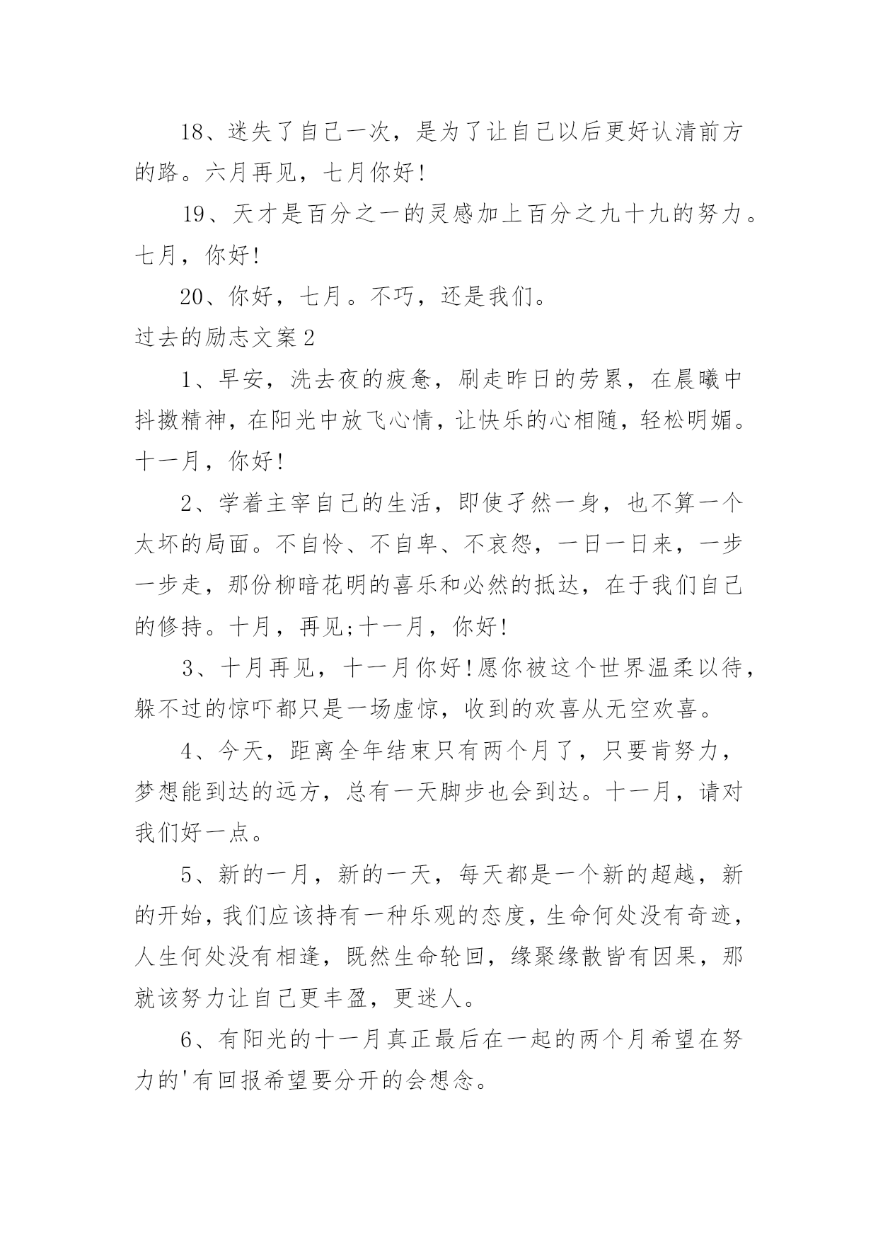 过去的励志文案过去的励志文案随着社交网络的兴起和普及,越来越多人青睐于在社交平台上发表文案,文案用于分享自己的奇闻趣事和生活日常。还苦于找不到好的文案?以下是小编帮大家整理的过去的励志文案,供大家参考借鉴,希望可以帮助到有需要的朋友。过去的励志文案11、六月的足迹匆匆而过,七月的脚步声越来越清晰。六月,再见了。七月,你好啊。2、总说时间过得很慢,不知不觉七月就要到了,告别六月,迎接七月,让自己更努力一些,让七月更善待自己一些。3、七月,愿我像个孩子一样快乐。4、每一次都要做好准备,做好全力以赴,不可心存侥幸,六月再见!七月你好!5、走到生命的哪一个阶段,都该喜欢那一段时光,完成那一阶段该完成的职责,顺生而行,不沉迷过去,不狂热地期待着未来,生命这样就好。不管正经历着怎样的挣扎与挑战,或许我们都只有一个选择:虽然痛苦,却依然要快乐;并相信未来。六月再见,七月你好!6、感恩每个艳阳日,珍惜每位有缘人,六月认真再见,七月用力重逢,行所当行,新的一天,早安。7、如果敌人让你生气,那说明你还没有胜他的把握。六月再见,七月你好。8、七月要更加努力啊,为了想要的生活,为了人间的烟火气,为了今天的风和月。9、七月,拥着温熏的夏风,沐着不息的蝉鸣,沁着荷花的馨香,依着静美的光阴,守着淡淡的清欢,在岁月里静默安然。10、六月再见,七月你好,愿你的`每一天都独一无二,愿开始的新一天有所目标,不再混混噩噩积极努力,不辜负每一天的大好时光。早安。11、走进生机盎然的七月,走进七月滚烫的诗行,倾听柳荫深处抑扬顿挫的蝉鸣,你好,七月;再见,六月!12、有时候,换一个角度去看,你就会发现不同的东西,也许还会有一个全新的世界。七月,早安!13、在这个难熬的季节里,希望你用平淡坦然的心态面对,熬出一份属于自己的奢侈品。六月再见,七月你好。14、每个人都是被上天眷顾的天使,只是时间早晚而已。希望你一直都有好运哦。七月你好!15、你来过,我记得,便是永远。六月再见,七月你好!16、你的人生永远不会辜负你,那些转错的弯,走错的路,流下的泪水,滴下的汗水,留下的伤痕。所有这些全都让你成为独一无二的自己!六月再见,七月你好!17、七月,众多的心事,我惟有,沏一杯茶,与之对坐。静下心后喊一声这个七月,你好。18、迷失了自己一次,是为了让自己以后更好认清前方的路。六月再见,七月你好!19、天才是百分之一的灵感加上百分之九十九的努力。七月,你好!20、你好,七月。不巧,还是我们。过去的励志文案21、早安,洗去夜的疲惫,刷走昨日的劳累,在晨曦中抖擞精神,在阳光中放飞心情,让快乐的心相随,轻松明媚。十一月,你好!2、学着主宰自己的生活,即使孑然一身,也不算一个太坏的局面。不自怜、不自卑、不哀怨,一日一日来,一步一步走,那份柳暗花明的喜乐和必然的抵达,在于我们自己的修持。十月,再见;十一月,你好!3、十月再见,十一月你好!愿你被这个世界温柔以待,躲不过的惊吓都只是一场虚惊,收到的欢喜从无空欢喜。4、今天,距离全年结束只有两个月了,只要肯努力,梦想能到达的远方,总有一天脚步也会到达。十一月,请对我们好一点。5、新的一月,新的一天,每天都是一个新的超越,新的开始,我们应该持有一种乐观的态度,生命何处没有奇迹,人生何处没有相逢,既然生命轮回,缘聚缘散皆有因果,那就该努力让自己更丰盈,更迷人。6、有阳光的十一月真正最后在一起的两个月希望在努力的'有回报希望要分开的会想念。7、十月再见,十一月你好!愿你,赶走离愁别绪。不伤春悲秋,不执着曾经拥有。愿你,平和的放下,让离开的离开,让过去的过去。不念过去,不畏将来。8、所有美好,都不负归期,选一种姿态让自己活得无可替代,没有所谓的运气只有绝对的努力。十一月,你好!十一月,早安!9、十月再见,十一月你好!愿你永远活在当下,保持热忱,拥抱憧憬。一生努力,自律自省,纵使万般皆是命,也对每一件所爱的事情都竭尽全力,绽放最美丽的自己。10、说话间日子就过去,前几天还一直在担心光棍节要怎么过。一下也就快到月了,家里来电话说天气变得冷了要多穿衣服,不要感冒了。于是把枕头抱的更紧了,这里的冬天时温暖的。11、十一月,你好。枫花乘着游云落在峰顶,将满山的苍翠,染成一片连绵的橙红。你要好好的,继续接下来的日子。12、我们要让自己的内心更强大,让自己的能力配得上自己的梦想。勇敢地做自己,不要为任何人而改变。如果别人不能接受最差的我们,那么也不配拥有最好的我们。愿十一月遇见更好的自己!早安!13、秋枝秋叶秋草黄,秋云秋月秋气爽,秋菊秋雁秋收忙,秋风秋雨秋天凉,秋情秋意秋缠绵,天凉好个秋,朋友,记得添秋装,别着凉!14、新的一月,新的一天,迎着清晨的曙光,漫步在秋的晨曦里,放眼望去,清新自然,花,凋谢了,喻示着新的绽放,叶,飘落了,喻示着新的希望,大自然中一切结束都喻示