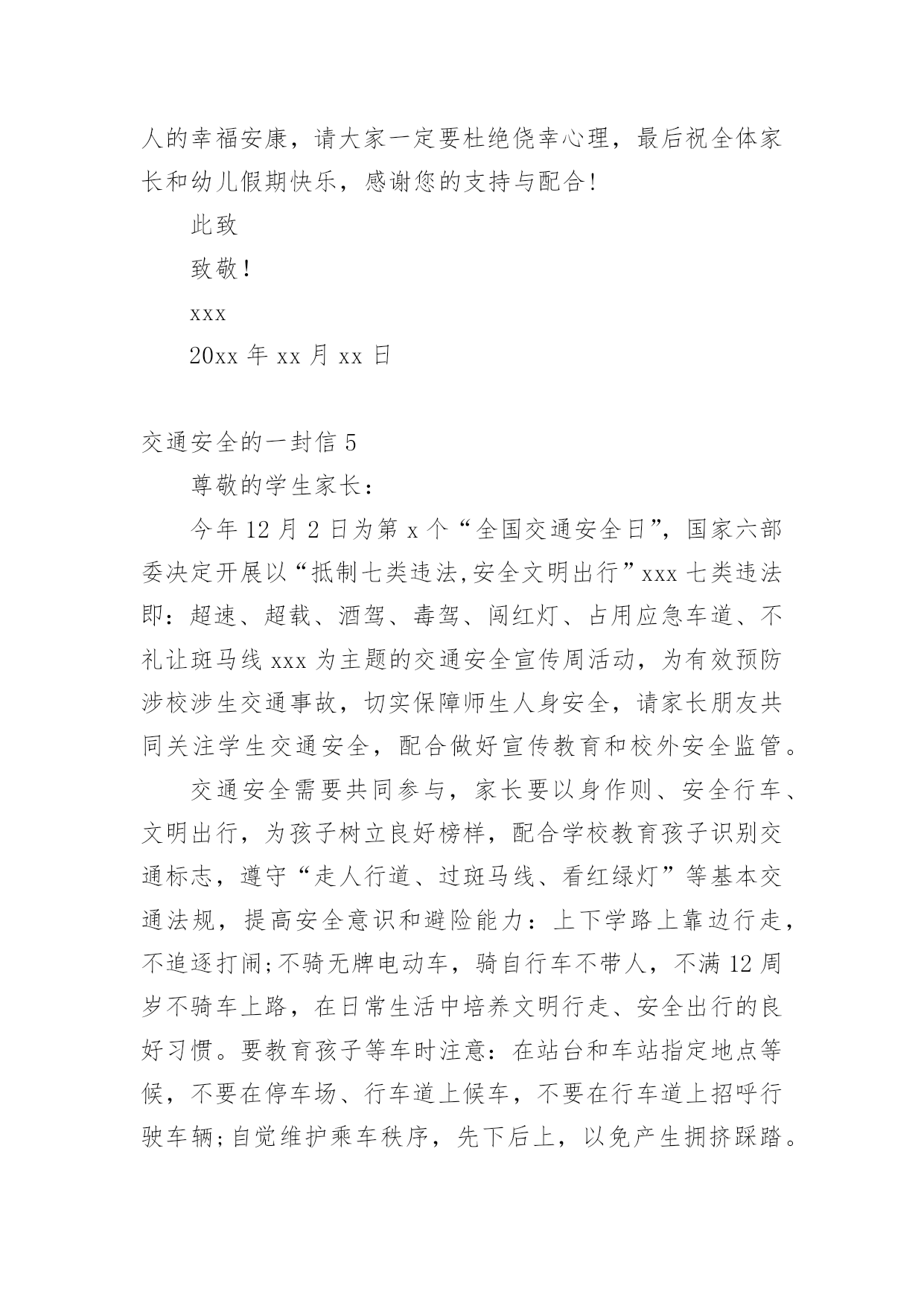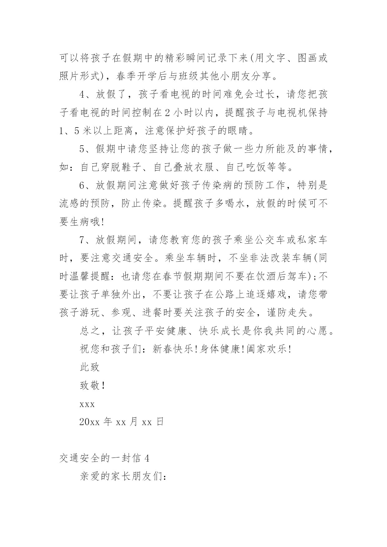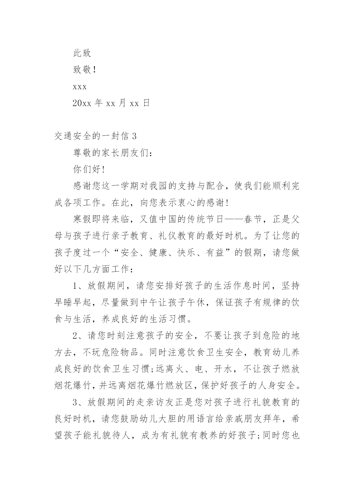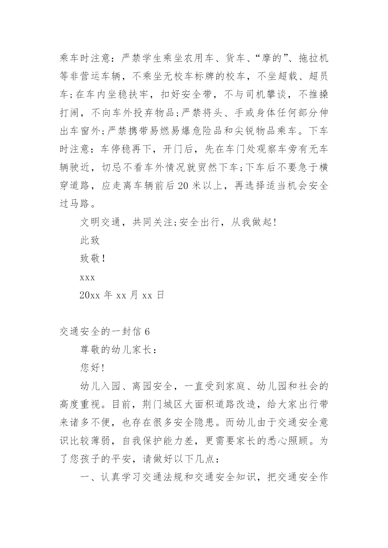 交通安全的一封信关于交通安全的一封信600字(通用10篇)在平平淡淡的日常中,大家对书信都不陌生吧,书信是一种应用文体,是人们普遍使用的一种交际工具。怎么写信才能避免踩雷呢?以下是小编为大家整理的关于交通安全的一封信600字(通用10篇),欢迎阅读,希望大家能够喜欢。交通安全的一封信1尊敬的各位家长:暑假即将开始,学生脱离了学校和老师的管理,望家长要切实负起监护人的职责。为此,学校就学生假期安全方面特向家长提出以下几点建议和要求:一、假期里家长要教育、监管自己的孩子,不准其私自下水游泳;不擅自与同学结伴外出游泳;不到无安全保障的水域游泳。二、夏季是肠道疾病多发季节,家长要教育孩子注意饮食卫生,吃瓜果必须洗干净,吃冷饮要适量,不暴饮暴食。三、家长要对子女进行交通安全知识教育,叮嘱子女严格遵守交通规则,禁止子女乘坐无安全保障的“三无”车辆,确保子女的出行安全。四、家长要教育子女有事外出,须向家长打招呼,子女外出,家长要确定往返时间,亲自接送,严格监督子女的外出活动,以防发生意外。五、雷雨天时要教育子女远离带电设备或其它类似金属装置;不要拨打或接听电话,不使用电话线上网,最好拨掉电话线、闭路电视线,以免引雷入室,发生危险。六、督促孩子合理安排暑假生活,指导他们制订好暑假计划,认真完成暑假作业;带领孩子积极参与各类暑期活动;鼓励孩子多做些力所能及的家务劳动,让暑假成为孩子调节身心,参与实践,培养品质的良好时机。平安是福,安全第一。敬请各位家长务必在百忙之中加强对子女的安全监督力度,时时提醒子女注意安全事项,一切以安全为重,确保子女平平安安,快乐成长。顺祝各位家长全家欢乐,身体健康,工作顺利,谢谢合作!此致致敬!xxx20xx年xx月xx日交通安全的一封信2尊敬的家长:您们好!交通安全关系到每一个孩子和家庭的幸福。据权威机构的统计,我国每年交通事故死亡8万人,每月死亡6700人,每天死亡220人。当前242省道、402省道正在修建中,道路危险系数进一步增加。为了避免交通事故的发生,让安全能与您的孩子同行,我们恳请得到您的支持与配合,联手筑起学生交通安全的长城,建立起社会、学校、家庭安全网络体系,确保您的孩子健康成长,为此学校向你们倡议:1.配合学校、老师教育好自己的孩子:学习道路交通安全法律,严格遵守道路交通规则,严格把控学生上下学时间,按时接送;上学、放学及平时外出活动不在马路上游玩、嬉戏,不扒乘行驶中的车辆;走路要走人行道,没有人行道的靠路边行走,不要边走边看书或追逐打闹;横过公路要做到“一慢二看三通过”;2.要规范自己的交通行为,以自身的一言一行引导子女养成良好的交通习惯,增强交通安全观念,培养文明交通意识。严格遵守学校接送车辆停放管理制度,服从学校值班人员管理,不违规、越线停车,确保门口畅通;3.按照《中华人民共和国道路交通法》的规定:坚决制止、监督、提醒孩子上下学不骑电动车、自行车;路途较远的孩子您应按时安全接送;学校附近的学生提倡步行上学。4.为了您孩子的安全,严禁自己及孩子乘坐无牌照、车况差、报废车辆、无保险、超员车辆、货运车、摩托车、机动三轮车、农用车等非客运车辆。尊敬的家长,孩子的安全是您和我们最大的牵挂,交通安全关系到孩子的一生,也维系着您一家的幸福。让我们积极行动起来,从自己做起,从现在做起,为孩子撑起一片平安的蓝天。此致致敬!xxx20xx年xx月xx日交通安全的一封信3尊敬的家长朋友们:你们好!感谢您这一学期对我园的支持与配合,使我们能顺利完成各项工作。在此,向您表示衷心的感谢!寒假即将来临,又值中国的传统节日——春节,正是父母与孩子进行亲子教育、礼仪教育的最好时机。为了让您的孩子度过一个“安全、健康、快乐、有益”的假期,请您做好以下几方面工作:1、放假期间,请您安排好孩子的生活作息时间,坚持早睡早起,尽量做到中午让孩子午休,保证孩子有规律的饮食与生活,养成良好的生活习惯。2、请您时刻注意孩子的安全,不要让孩子到危险的地方去,不玩危险物品。同时注意饮食卫生安全,教育幼儿养成良好的饮食卫生习惯;远离火、电、开水,不让孩子燃放烟花爆竹,并远离烟花爆竹燃放区,保护好孩子的人身安全。3、放假期间的走亲访友正是您对孩子进行礼貌教育的良好时机,请您鼓励幼儿大胆的用语言给亲戚朋友拜年,希望孩子能礼貌待人,成为有礼貌有教养的好孩子;同时您也可以将孩子在假期中的精彩瞬间记录下来(用文字、图画或照片形式),春季开学后与班级其他小朋友分享。4、放假了,孩子看电视的时间难免会过长,请您把孩子看电视的时间控制在2小时以内,提醒孩子与电视机保持1、5米以上距离,注意保护好孩子的眼睛。5、假期中请您坚持让您的孩子做一些力所能及的事情,如:自己穿脱鞋子、自己叠放衣服、自己吃饭等等。6、放假期间注意做好孩子传染病的预防工作,特别是流感的预防