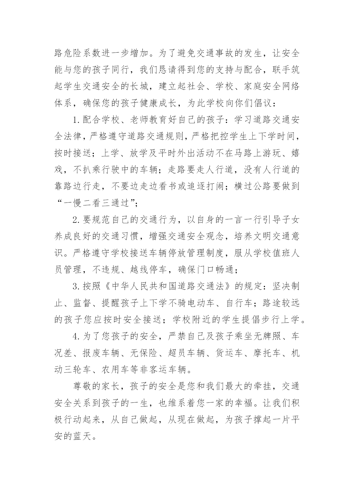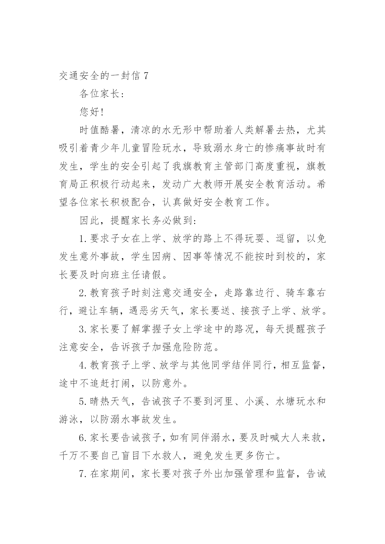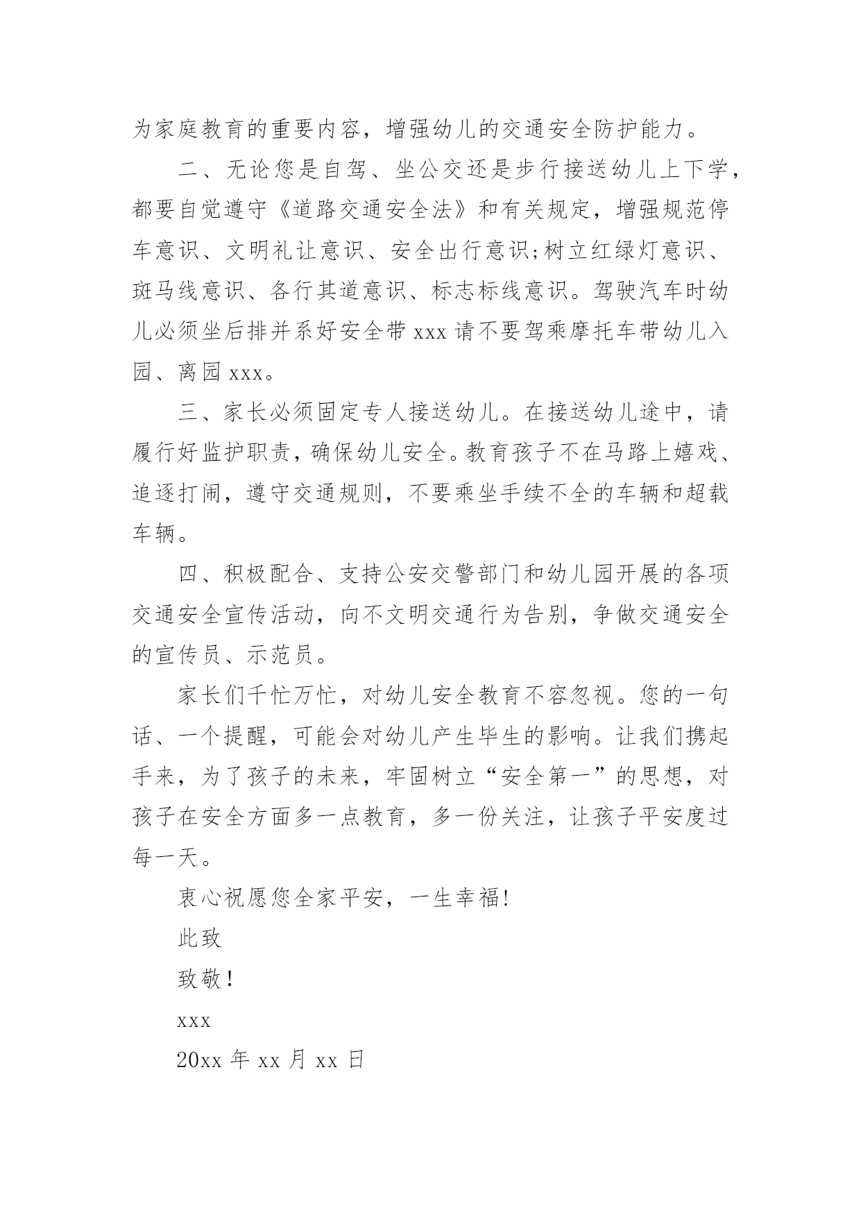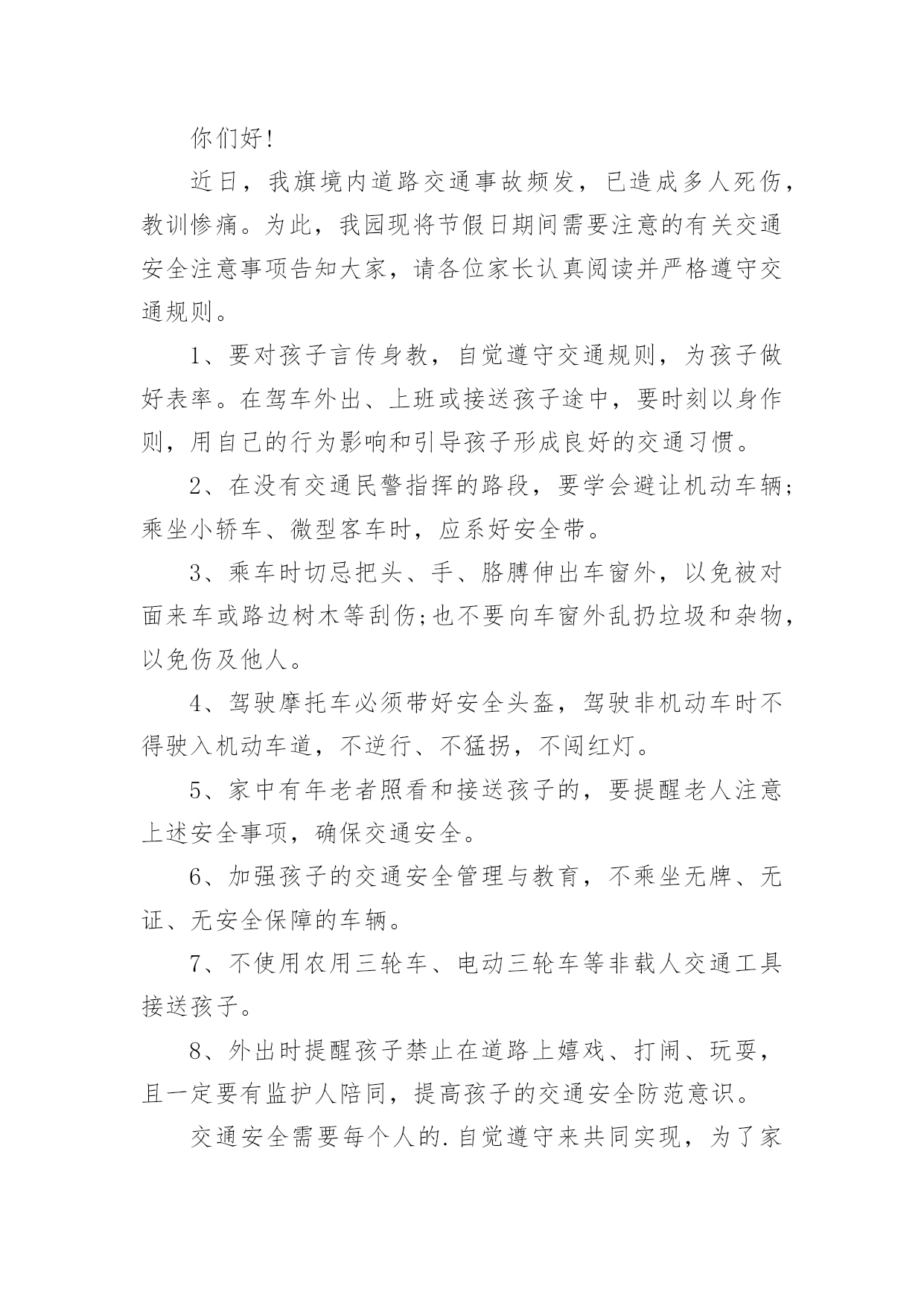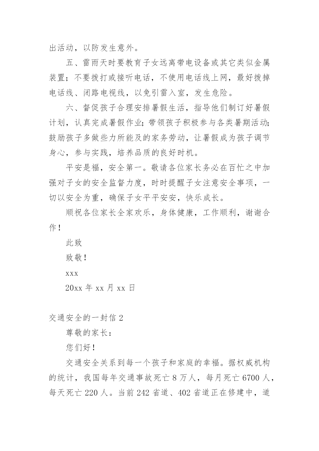 交通安全的一封信关于交通安全的一封信600字(通用10篇)在平平淡淡的日常中,大家对书信都不陌生吧,书信是一种应用文体,是人们普遍使用的一种交际工具。怎么写信才能避免踩雷呢?以下是小编为大家整理的关于交通安全的一封信600字(通用10篇),欢迎阅读,希望大家能够喜欢。交通安全的一封信1尊敬的各位家长:暑假即将开始,学生脱离了学校和老师的管理,望家长要切实负起监护人的职责。为此,学校就学生假期安全方面特向家长提出以下几点建议和要求:一、假期里家长要教育、监管自己的孩子,不准其私自下水游泳;不擅自与同学结伴外出游泳;不到无安全保障的水域游泳。二、夏季是肠道疾病多发季节,家长要教育孩子注意饮食卫生,吃瓜果必须洗干净,吃冷饮要适量,不暴饮暴食。三、家长要对子女进行交通安全知识教育,叮嘱子女严格遵守交通规则,禁止子女乘坐无安全保障的“三无”车辆,确保子女的出行安全。四、家长要教育子女有事外出,须向家长打招呼,子女外出,家长要确定往返时间,亲自接送,严格监督子女的外出活动,以防发生意外。五、雷雨天时要教育子女远离带电设备或其它类似金属装置;不要拨打或接听电话,不使用电话线上网,最好拨掉电话线、闭路电视线,以免引雷入室,发生危险。六、督促孩子合理安排暑假生活,指导他们制订好暑假计划,认真完成暑假作业;带领孩子积极参与各类暑期活动;鼓励孩子多做些力所能及的家务劳动,让暑假成为孩子调节身心,参与实践,培养品质的良好时机。平安是福,安全第一。敬请各位家长务必在百忙之中加强对子女的安全监督力度,时时提醒子女注意安全事项,一切以安全为重,确保子女平平安安,快乐成长。顺祝各位家长全家欢乐,身体健康,工作顺利,谢谢合作!此致致敬!xxx20xx年xx月xx日交通安全的一封信2尊敬的家长:您们好!交通安全关系到每一个孩子和家庭的幸福。据权威机构的统计,我国每年交通事故死亡8万人,每月死亡6700人,每天死亡220人。当前242省道、402省道正在修建中,道路危险系数进一步增加。为了避免交通事故的发生,让安全能与您的孩子同行,我们恳请得到您的支持与配合,联手筑起学生交通安全的长城,建立起社会、学校、家庭安全网络体系,确保您的孩子健康成长,为此学校向你们倡议:1.配合学校、老师教育好自己的孩子:学习道路交通安全法律,严格遵守道路交通规则,严格把控学生上下学时间,按时接送;上学、放学及平时外出活动不在马路上游玩、嬉戏,不扒乘行驶中的车辆;走路要走人行道,没有人行道的靠路边行走,不要边走边看书或追逐打闹;横过公路要做到“一慢二看三通过”;2.要规范自己的交通行为,以自身的一言一行引导子女养成良好的交通习惯,增强交通安全观念,培养文明交通意识。严格遵守学校接送车辆停放管理制度,服从学校值班人员管理,不违规、越线停车,确保门口畅通;3.按照《中华人民共和国道路交通法》的规定:坚决制止、监督、提醒孩子上下学不骑电动车、自行车;路途较远的孩子您应按时安全接送;学校附近的学生提倡步行上学。4.为了您孩子的安全,严禁自己及孩子乘坐无牌照、车况差、报废车辆、无保险、超员车辆、货运车、摩托车、机动三轮车、农用车等非客运车辆。尊敬的家长,孩子的安全是您和我们最大的牵挂,交通安全关系到孩子的一生,也维系着您一家的幸福。让我们积极行动起来,从自己做起,从现在做起,为孩子撑起一片平安的蓝天。此致致敬!xxx20xx年xx月xx日交通安全的一封信3尊敬的家长朋友们:你们好!感谢您这一学期对我园的支持与配合,使我们能顺利完成各项工作。在此,向您表示衷心的感谢!寒假即将来临,又值中国的传统节日——春节,正是父母与孩子进行亲子教育、礼仪教育的最好时机。为了让您的孩子度过一个“安全、健康、快乐、有益”的假期,请您做好以下几方面工作:1、放假期间,请您安排好孩子的生活作息时间,坚持早睡早起,尽量做到中午让孩子午休,保证孩子有规律的饮食与生活,养成良好的生活习惯。2、请您时刻注意孩子的安全,不要让孩子到危险的地方去,不玩危险物品。同时注意饮食卫生安全,教育幼儿养成良好的饮食卫生习惯;远离火、电、开水,不让孩子燃放烟花爆竹,并远离烟花爆竹燃放区,保护好孩子的人身安全。3、放假期间的走亲访友正是您对孩子进行礼貌教育的良好时机,请您鼓励幼儿大胆的用语言给亲戚朋友拜年,希望孩子能礼貌待人,成为有礼貌有教养的好孩子;同时您也可以将孩子在假期中的精彩瞬间记录下来(用文字、图画或照片形式),春季开学后与班级其他小朋友分享。4、放假了,孩子看电视的时间难免会过长,请您把孩子看电视的时间控制在2小时以内,提醒孩子与电视机保持1、5米以上距离,注意保护好孩子的眼睛。5、假期中请您坚持让您的孩子做一些力所能及的事情,如:自己穿脱鞋子、自己叠放衣服、自己吃饭等等。6、放假期间注意做好孩子传染病的预防工作,特别是流感的预防