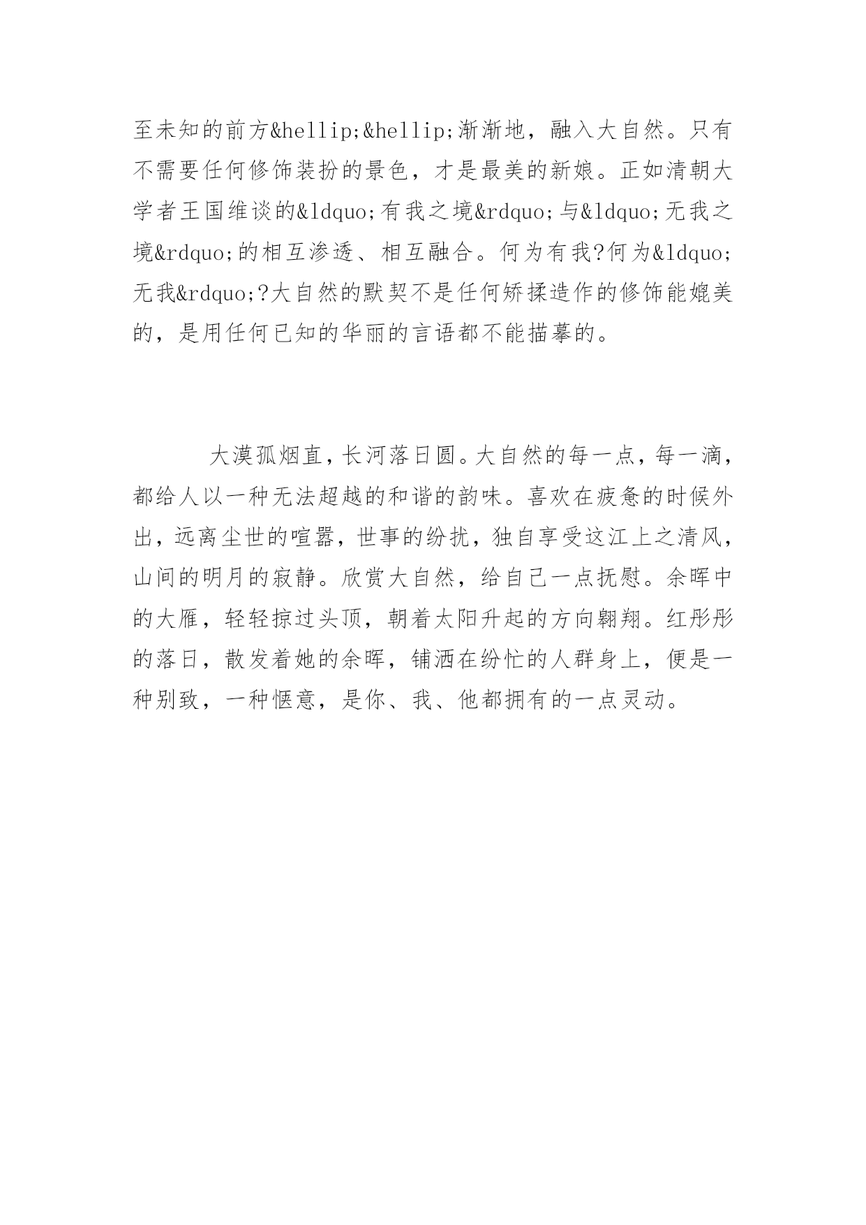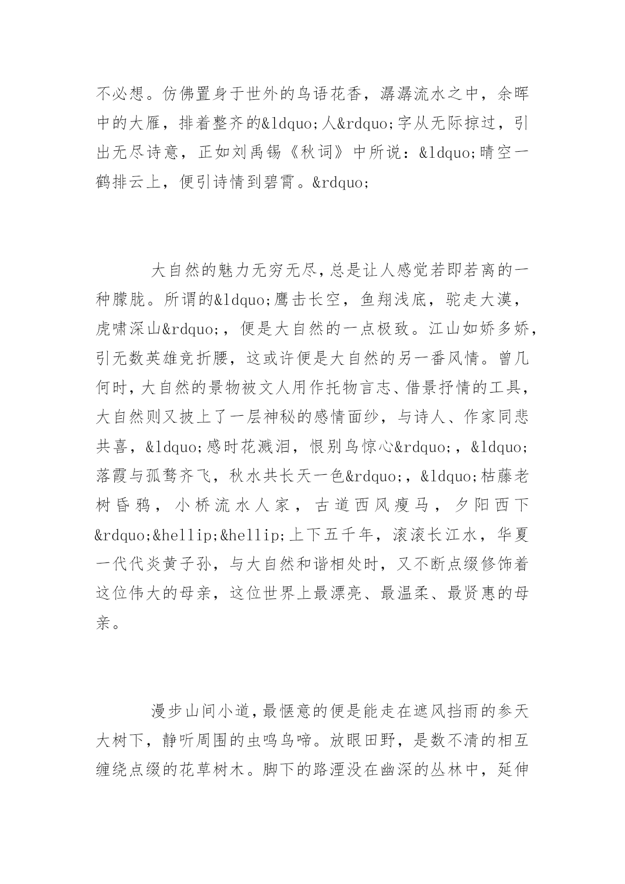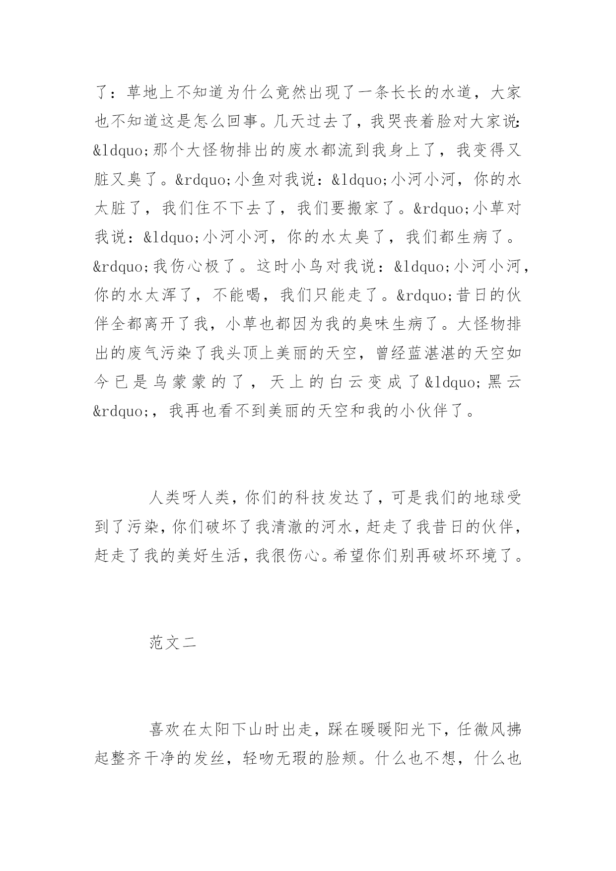 低碳环保生活作文800字范文一我曾是一条清凌凌的小河,是一条美丽的小河。我身边的小草碧绿碧绿的,头顶的天空是蓝湛湛的。我的身体里有许多小鱼在游来游去,它们有时会和我玩捉迷藏,有时会和我说悄悄话,有时给我讲笑话,逗得我哈哈大笑起来。有时,一群小鸟叽叽喳喳地飞过,有几只总会停下来夸奖我一番:“小河小河,你的水可真清呀!”我听了后乐得开了花。有时有一两只小鸟会问我:“小河小河,我口渴了,可以喝你的水吗!”我便爽快地捧了一捧水给小鸟喝。那个时候,我和我的伙伴过得很快乐。可惜好景不长,在不久的后来来了一个大怪物——工厂,它矗立在我身边的草地上,一大片草地地都被它压死了,其余的草弟弟都害怕急了,几个几个地抱在一起,生怕被那个大怪物给吞了。我心里也很害怕,搞不明白人类为什么要造出这种玩意儿。小河里的小鱼也纷纷藏了起来,看到大怪物没有什么动机,大家又松了一口气。第一天,大家还是像以往一样生活,可是第二天,怪事发生了:草地上不知道为什么竟然出现了一条长长的水道,大家也不知道这是怎么回事。几天过去了,我哭丧着脸对大家说:“那个大怪物排出的废水都流到我身上了,我变得又脏又臭了。”小鱼对我说:“小河小河,你的水太脏了,我们住不下去了,我们要搬家了。”小草对我说:“小河小河,你的水太臭了,我们都生病了。”我伤心极了。这时小鸟对我说:“小河小河,你的水太浑了,不能喝,我们只能走了。”昔日的伙伴全都离开了我,小草也都因为我的臭味生病了。大怪物排出的废气污染了我头顶上美丽的天空,曾经蓝湛湛的天空如今已是乌蒙蒙的了,天上的白云变成了“黑云”,我再也看不到美丽的天空和我的小伙伴了。人类呀人类,你们的科技发达了,可是我们的地球受到了污染,你们破坏了我清澈的河水,赶走了我昔日的伙伴,赶走了我的美好生活,我很伤心。希望你们别再破坏环境了。范文二喜欢在太阳下山时出走,踩在暖暖阳光下,任微风拂起整齐干净的发丝,轻吻无瑕的脸颊。什么也不想,什么也不必想。仿佛置身于世外的鸟语花香,潺潺流水之中,余晖中的大雁,排着整齐的“人”字从无际掠过,引出无尽诗意,正如刘禹锡《秋词》中所说:“晴空一鹤排云上,便引诗情到碧霄。”大自然的魅力无穷无尽,总是让人感觉若即若离的一种朦胧。所谓的“鹰击长空,鱼翔浅底,驼走大漠,虎啸深山”,便是大自然的一点极致。江山如娇多娇,引无数英雄竞折腰,这或许便是大自然的另一番风情。曾几何时,大自然的景物被文人用作托物言志、借景抒情的工具,大自然则又披上了一层神秘的感情面纱,与诗人、作家同悲共喜,“感时花溅泪,恨别鸟惊心”,“落霞与孤鹜齐飞,秋水共长天一色”,“枯藤老树昏鸦,小桥流水人家,古道西风瘦马,夕阳西下”……上下五千年,滚滚长江水,华夏一代代炎黄子孙,与大自然和谐相处时,又不断点缀修饰着这位伟大的母亲,这位世界上最漂亮、最温柔、最贤惠的母亲。漫步山间小道,最惬意的便是能走在遮风挡雨的参天大树下,静听周围的虫鸣鸟啼。放眼田野,是数不清的相互缠绕点缀的花草树木。脚下的路湮没在幽深的丛林中,延伸至未知的前方……渐渐地,融入大自然。只有不需要任何修饰装扮的景色,才是最美的新娘。正如清朝大学者王国维谈的“有我之境”与“无我之境”的相互渗透、相互融合。何为有我?何为“无我”?大自然的默契不是任何矫揉造作的修饰能媲美的,是用任何已知的华丽的言语都不能描摹的。大漠孤烟直,长河落日圆。大自然的每一点,每一滴,都给人以一种无法超越的和谐的韵味。喜欢在疲惫的时候外出,远离尘世的喧嚣,世事的纷扰,独自享受这江上之清风,山间的明月的寂静。欣赏大自然,给自己一点抚慰。余晖中的大雁,轻轻掠过头顶,朝着太阳升起的方向翱翔。红彤彤的落日,散发着她的余晖,铺洒在纷忙的人群身上,便是一种别致,一种惬意,是你、我、他都拥有的一点灵动。