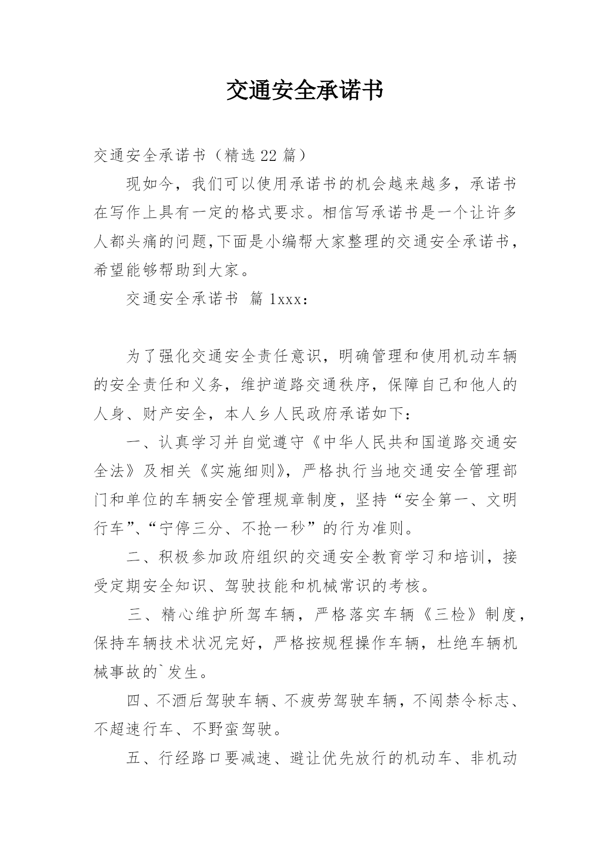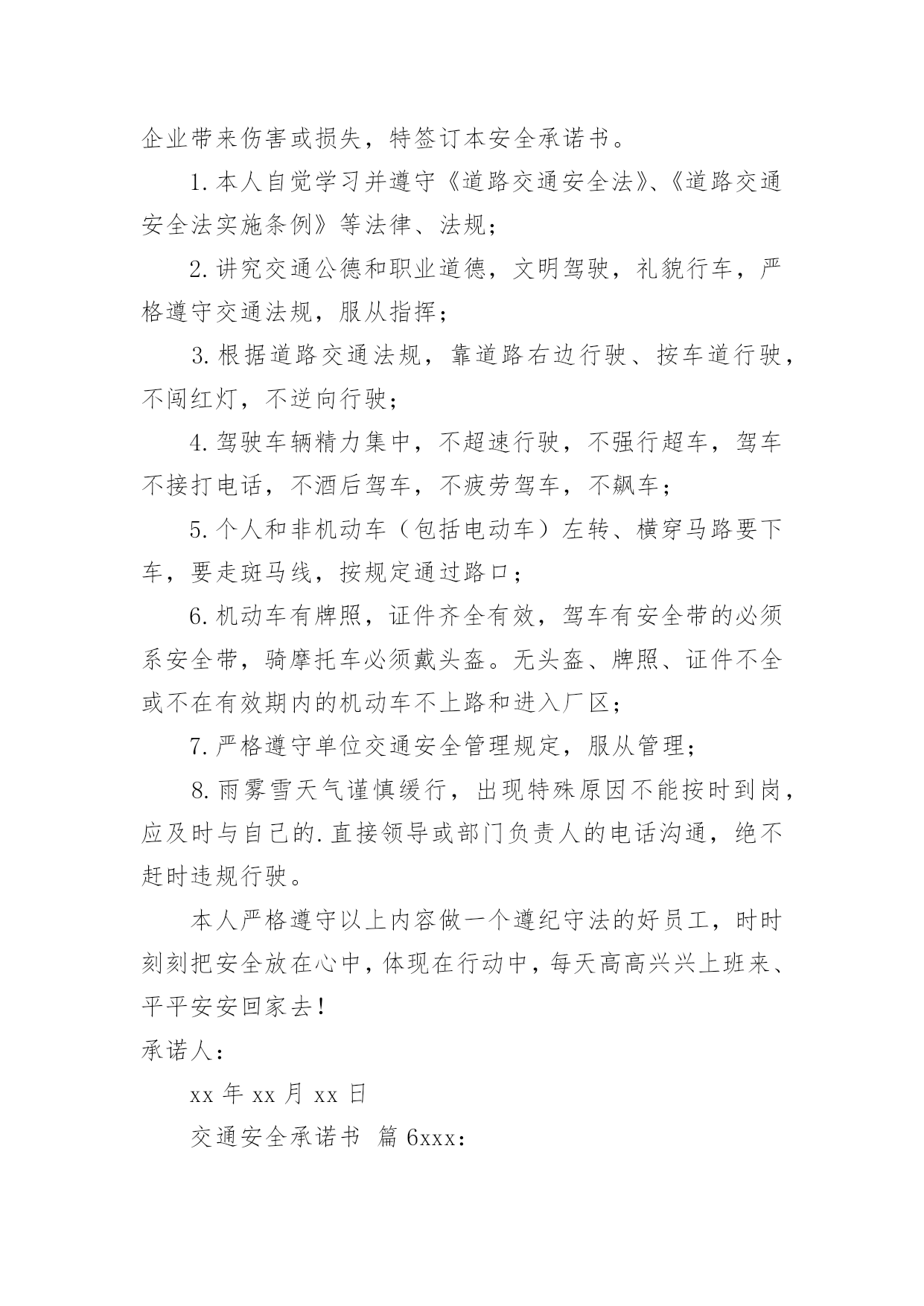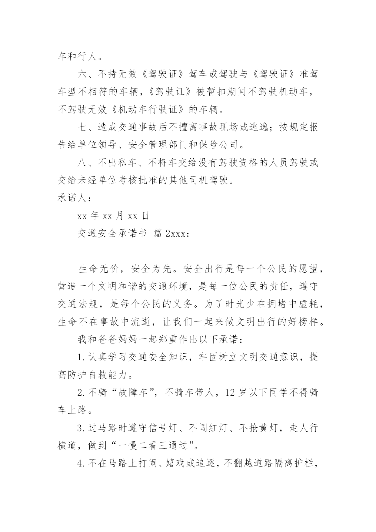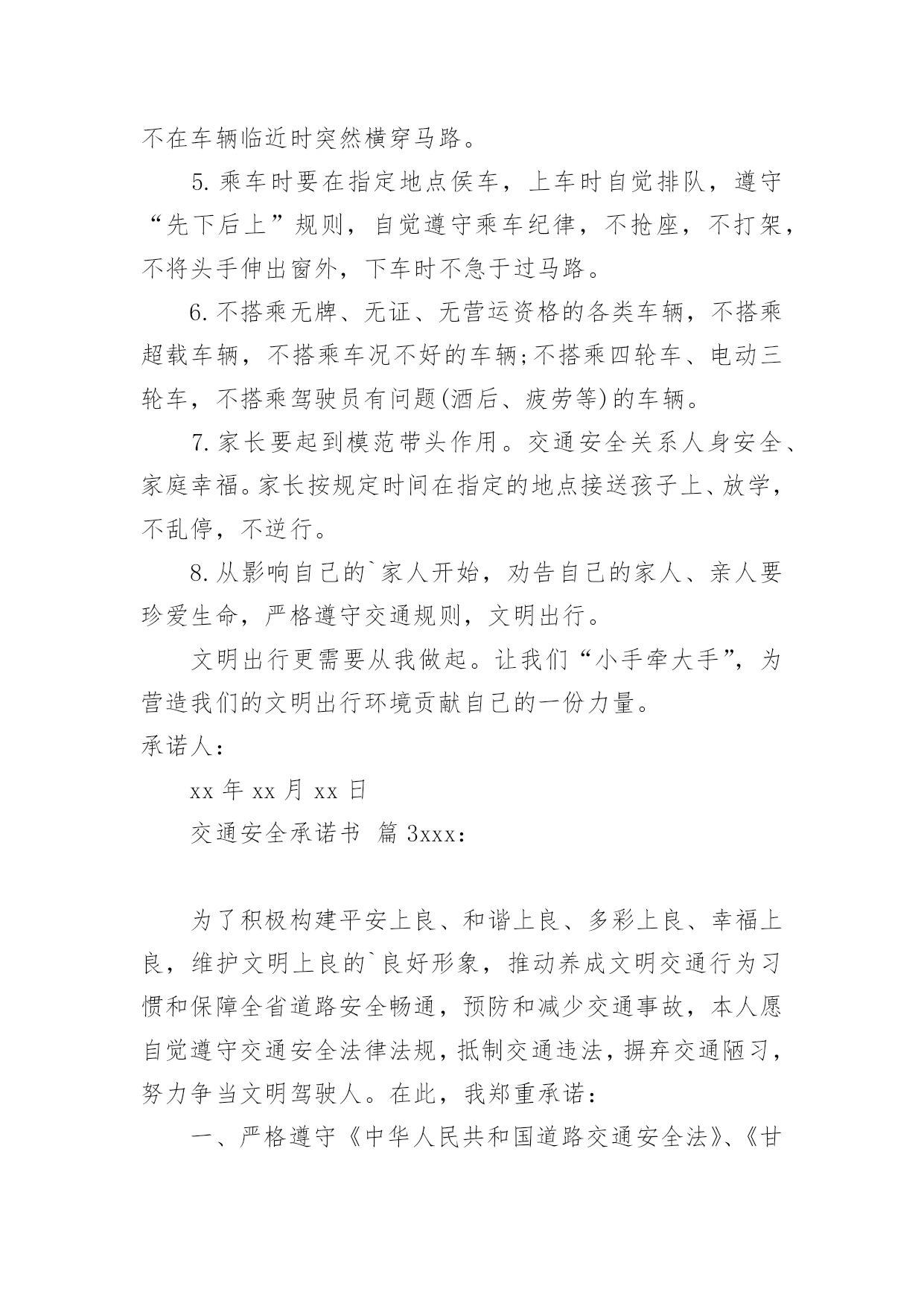 交通安全承诺书交通安全承诺书(精选22篇)现如今,我们可以使用承诺书的机会越来越多,承诺书在写作上具有一定的格式要求。相信写承诺书是一个让许多人都头痛的问题,下面是小编帮大家整理的交通安全承诺书,希望能够帮助到大家。交通安全承诺书篇1xxx:为了强化交通安全责任意识,明确管理和使用机动车辆的安全责任和义务,维护道路交通秩序,保障自己和他人的人身、财产安全,本人乡人民政府承诺如下:一、认真学习并自觉遵守《中华人民共和国道路交通安全法》及相关《实施细则》,严格执行当地交通安全管理部门和单位的车辆安全管理规章制度,坚持“安全第一、文明行车”、“宁停三分、不抢一秒”的行为准则。二、积极参加政府组织的交通安全教育学习和培训,接受定期安全知识、驾驶技能和机械常识的考核。三、精心维护所驾车辆,严格落实车辆《三检》制度,保持车辆技术状况完好,严格按规程操作车辆,杜绝车辆机械事故的`发生。四、不酒后驾驶车辆、不疲劳驾驶车辆,不闯禁令标志、不超速行车、不野蛮驾驶。五、行经路口要减速、避让优先放行的机动车、非机动车和行人。六、不持无效《驾驶证》驾车或驾驶与《驾驶证》准驾车型不相符的车辆,《驾驶证》被暂扣期间不驾驶机动车,不驾驶无效《机动车行驶证》的车辆。七、造成交通事故后不擅离事故现场或逃逸;按规定报告给单位领导、安全管理部门和保险公司。八、不出私车、不将车交给没有驾驶资格的人员驾驶或交给未经单位考核批准的其他司机驾驶。承诺人:xx年xx月xx日交通安全承诺书篇2xxx:生命无价,安全为先。安全出行是每一个公民的愿望,营造一个文明和谐的交通环境,是每一位公民的责任,遵守交通法规,是每个公民的义务。为了时光少在拥堵中虚耗,生命不在事故中流逝,让我们一起来做文明出行的好榜样。我和爸爸妈妈一起郑重作出以下承诺:1.认真学习交通安全知识,牢固树立文明交通意识,提高防护自救能力。2.不骑“故障车”,不骑车带人,12岁以下同学不得骑车上路。3.过马路时遵守信号灯、不闯红灯、不抢黄灯,走人行横道,做到“一慢二看三通过”。4.不在马路上打闹、嬉戏或追逐,不翻越道路隔离护栏,不在车辆临近时突然横穿马路。5.乘车时要在指定地点侯车,上车时自觉排队,遵守“先下后上”规则,自觉遵守乘车纪律,不抢座,不打架,不将头手伸出窗外,下车时不急于过马路。6.不搭乘无牌、无证、无营运资格的各类车辆,不搭乘超载车辆,不搭乘车况不好的车辆;不搭乘四轮车、电动三轮车,不搭乘驾驶员有问题(酒后、疲劳等)的车辆。7.家长要起到模范带头作用。交通安全关系人身安全、家庭幸福。家长按规定时间在指定的地点接送孩子上、放学,不乱停,不逆行。8.从影响自己的`家人开始,劝告自己的家人、亲人要珍爱生命,严格遵守交通规则,文明出行。文明出行更需要从我做起。让我们“小手牵大手”,为营造我们的文明出行环境贡献自己的一份力量。承诺人:xx年xx月xx日交通安全承诺书篇3xxx:为了积极构建平安上良、和谐上良、多彩上良、幸福上良,维护文明上良的`良好形象,推动养成文明交通行为习惯和保障全省道路安全畅通,预防和减少交通事故,本人愿自觉遵守交通安全法律法规,抵制交通违法,摒弃交通陋习,努力争当文明驾驶人。在此,我郑重承诺:一、严格遵守《中华人民共和国道路交通安全法》、《甘肃省道路交通安全条例》等法律法规,自觉养成良好的交通职业习惯,摒弃交通陋习,抵制交通违法,坚决做到谨慎、安全、文明驾驶。二、牢记“安全第一、以人为本,预防事故、从我做起”的理念,不超速行驶,不超员超载,不疲劳驾驶,不酒后驾驶,开车不接听手机。三、遵守交通信号,系好安全带,不违反交通标志标线规定。四、增强文明交通意识,做到按道行驶。自觉礼让行人,不争道抢行,不随意变更车道,不抢道猛拐,不向车外乱扔杂物。五、维护公共秩序,做到按位停车。确保停车有序,不违法停放车辆,不影响别人的正常通行。六、自觉消除无证驾驶、酒后驾驶、醉酒驾驶、违反规定客货混装,禁止“双超”和拖拉机货箱载人等道路交通安全违法行为。七、争当文明交通志愿者,积极参与文明交通宣传安全活动及交通安全公益事业,营造文明和谐的交通环境。承诺人:xx年xx月xx日交通安全承诺书篇4xxx:生命只有一次,交通安全关系每一个学生和家庭,惨痛的事实告诉我们,交通事故往往发生在一念之间、刹那一刻。为了进一步增强我校师生的交通安全意识和遵守交通规则的自觉性,确保师生的生命健康安全,白马中学向教育局做出如下承诺:1、学校成立乘车安全领导小组,专人负责学生乘车安全工作,召开教师会、学生会对师生进行乘车安全宣传教育。2、学校采取多种形式教育学生认真学习交通法规和交通安全知识,提高学生的安全意识和防护自救能力。3、教育学生严格遵守乘车时的交通法规,如不将头手伸出窗外,上车时不拥挤、遵守“先下后上”规则,下车时不急于过马