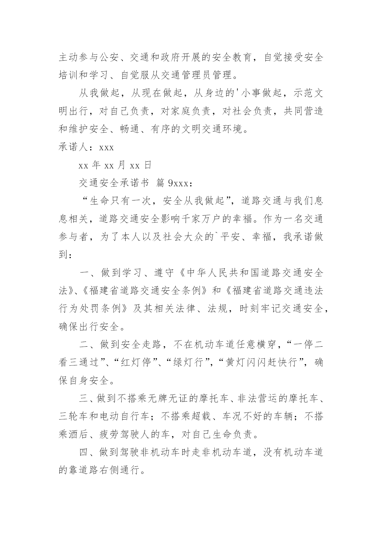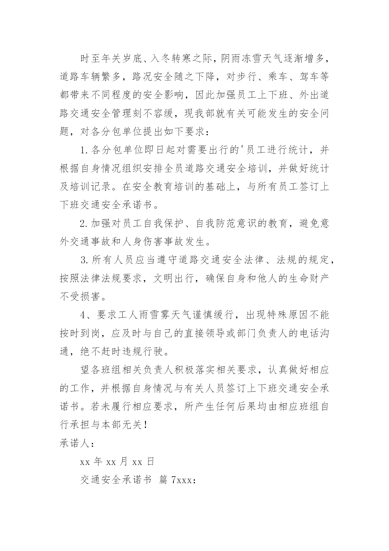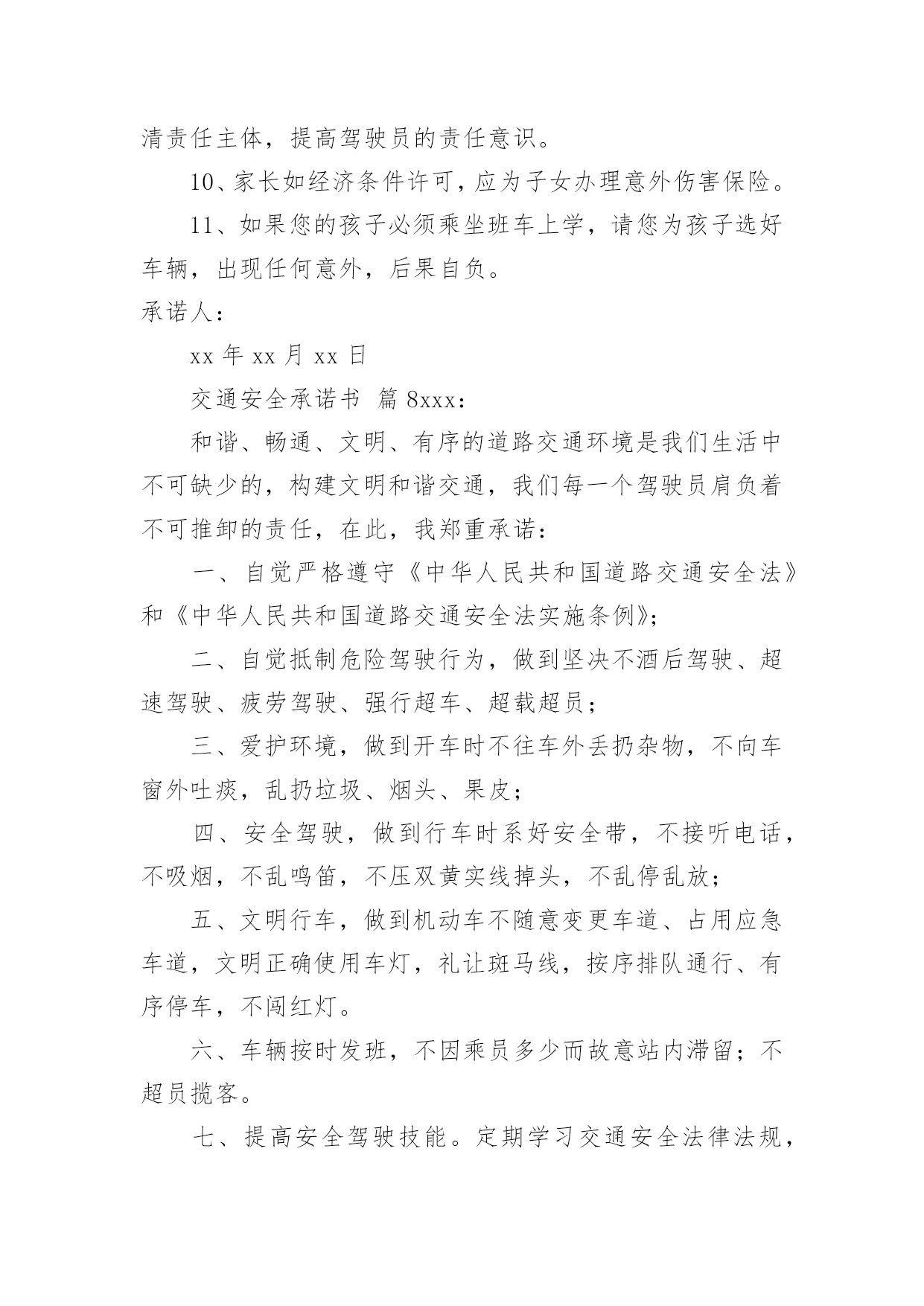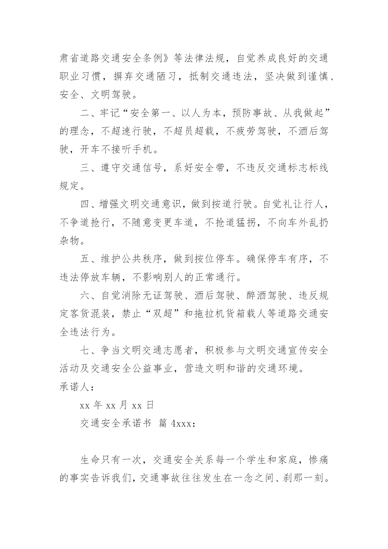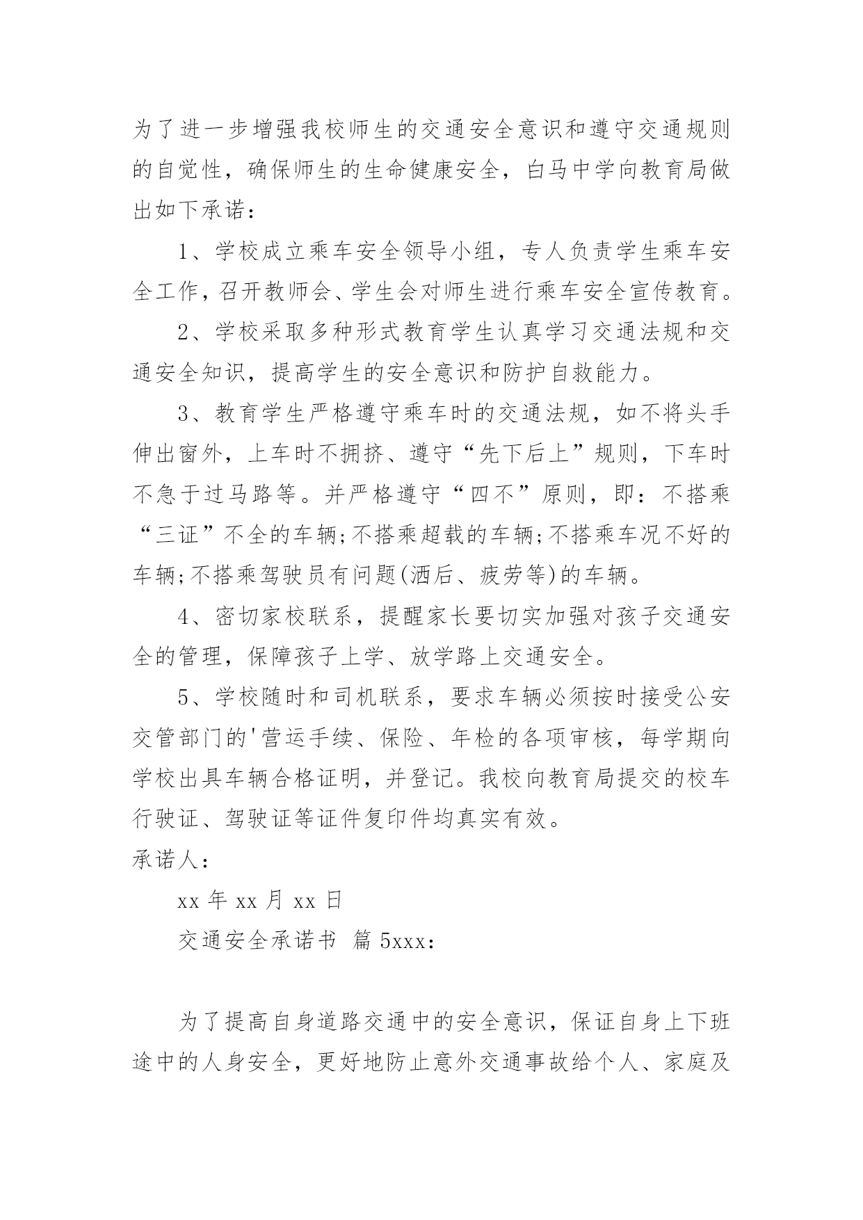 交通安全承诺书交通安全承诺书(精选22篇)现如今,我们可以使用承诺书的机会越来越多,承诺书在写作上具有一定的格式要求。相信写承诺书是一个让许多人都头痛的问题,下面是小编帮大家整理的交通安全承诺书,希望能够帮助到大家。交通安全承诺书篇1xxx:为了强化交通安全责任意识,明确管理和使用机动车辆的安全责任和义务,维护道路交通秩序,保障自己和他人的人身、财产安全,本人乡人民政府承诺如下:一、认真学习并自觉遵守《中华人民共和国道路交通安全法》及相关《实施细则》,严格执行当地交通安全管理部门和单位的车辆安全管理规章制度,坚持“安全第一、文明行车”、“宁停三分、不抢一秒”的行为准则。二、积极参加政府组织的交通安全教育学习和培训,接受定期安全知识、驾驶技能和机械常识的考核。三、精心维护所驾车辆,严格落实车辆《三检》制度,保持车辆技术状况完好,严格按规程操作车辆,杜绝车辆机械事故的`发生。四、不酒后驾驶车辆、不疲劳驾驶车辆,不闯禁令标志、不超速行车、不野蛮驾驶。五、行经路口要减速、避让优先放行的机动车、非机动车和行人。六、不持无效《驾驶证》驾车或驾驶与《驾驶证》准驾车型不相符的车辆,《驾驶证》被暂扣期间不驾驶机动车,不驾驶无效《机动车行驶证》的车辆。七、造成交通事故后不擅离事故现场或逃逸;按规定报告给单位领导、安全管理部门和保险公司。八、不出私车、不将车交给没有驾驶资格的人员驾驶或交给未经单位考核批准的其他司机驾驶。承诺人:xx年xx月xx日交通安全承诺书篇2xxx:生命无价,安全为先。安全出行是每一个公民的愿望,营造一个文明和谐的交通环境,是每一位公民的责任,遵守交通法规,是每个公民的义务。为了时光少在拥堵中虚耗,生命不在事故中流逝,让我们一起来做文明出行的好榜样。我和爸爸妈妈一起郑重作出以下承诺:1.认真学习交通安全知识,牢固树立文明交通意识,提高防护自救能力。2.不骑“故障车”,不骑车带人,12岁以下同学不得骑车上路。3.过马路时遵守信号灯、不闯红灯、不抢黄灯,走人行横道,做到“一慢二看三通过”。4.不在马路上打闹、嬉戏或追逐,不翻越道路隔离护栏,不在车辆临近时突然横穿马路。5.乘车时要在指定地点侯车,上车时自觉排队,遵守“先下后上”规则,自觉遵守乘车纪律,不抢座,不打架,不将头手伸出窗外,下车时不急于过马路。6.不搭乘无牌、无证、无营运资格的各类车辆,不搭乘超载车辆,不搭乘车况不好的车辆;不搭乘四轮车、电动三轮车,不搭乘驾驶员有问题(酒后、疲劳等)的车辆。7.家长要起到模范带头作用。交通安全关系人身安全、家庭幸福。家长按规定时间在指定的地点接送孩子上、放学,不乱停,不逆行。8.从影响自己的`家人开始,劝告自己的家人、亲人要珍爱生命,严格遵守交通规则,文明出行。文明出行更需要从我做起。让我们“小手牵大手”,为营造我们的文明出行环境贡献自己的一份力量。承诺人:xx年xx月xx日交通安全承诺书篇3xxx:为了积极构建平安上良、和谐上良、多彩上良、幸福上良,维护文明上良的`良好形象,推动养成文明交通行为习惯和保障全省道路安全畅通,预防和减少交通事故,本人愿自觉遵守交通安全法律法规,抵制交通违法,摒弃交通陋习,努力争当文明驾驶人。在此,我郑重承诺:一、严格遵守《中华人民共和国道路交通安全法》、《甘肃省道路交通安全条例》等法律法规,自觉养成良好的交通职业习惯,摒弃交通陋习,抵制交通违法,坚决做到谨慎、安全、文明驾驶。二、牢记“安全第一、以人为本,预防事故、从我做起”的理念,不超速行驶,不超员超载,不疲劳驾驶,不酒后驾驶,开车不接听手机。三、遵守交通信号,系好安全带,不违反交通标志标线规定。四、增强文明交通意识,做到按道行驶。自觉礼让行人,不争道抢行,不随意变更车道,不抢道猛拐,不向车外乱扔杂物。五、维护公共秩序,做到按位停车。确保停车有序,不违法停放车辆,不影响别人的正常通行。六、自觉消除无证驾驶、酒后驾驶、醉酒驾驶、违反规定客货混装,禁止“双超”和拖拉机货箱载人等道路交通安全违法行为。七、争当文明交通志愿者,积极参与文明交通宣传安全活动及交通安全公益事业,营造文明和谐的交通环境。承诺人:xx年xx月xx日交通安全承诺书篇4xxx:生命只有一次,交通安全关系每一个学生和家庭,惨痛的事实告诉我们,交通事故往往发生在一念之间、刹那一刻。为了进一步增强我校师生的交通安全意识和遵守交通规则的自觉性,确保师生的生命健康安全,白马中学向教育局做出如下承诺:1、学校成立乘车安全领导小组,专人负责学生乘车安全工作,召开教师会、学生会对师生进行乘车安全宣传教育。2、学校采取多种形式教育学生认真学习交通法规和交通安全知识,提高学生的安全意识和防护自救能力。3、教育学生严格遵守乘车时的交通法规,如不将头手伸出窗外,上车时不拥挤、遵守“先下后上”规则,下车时不急于过马