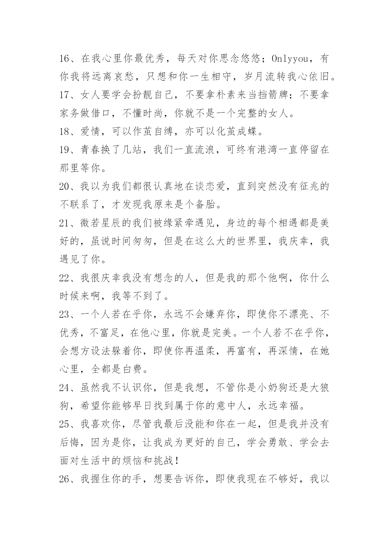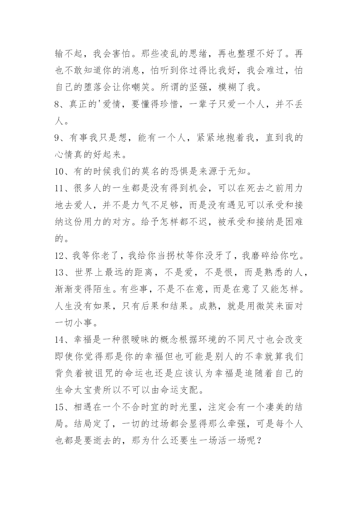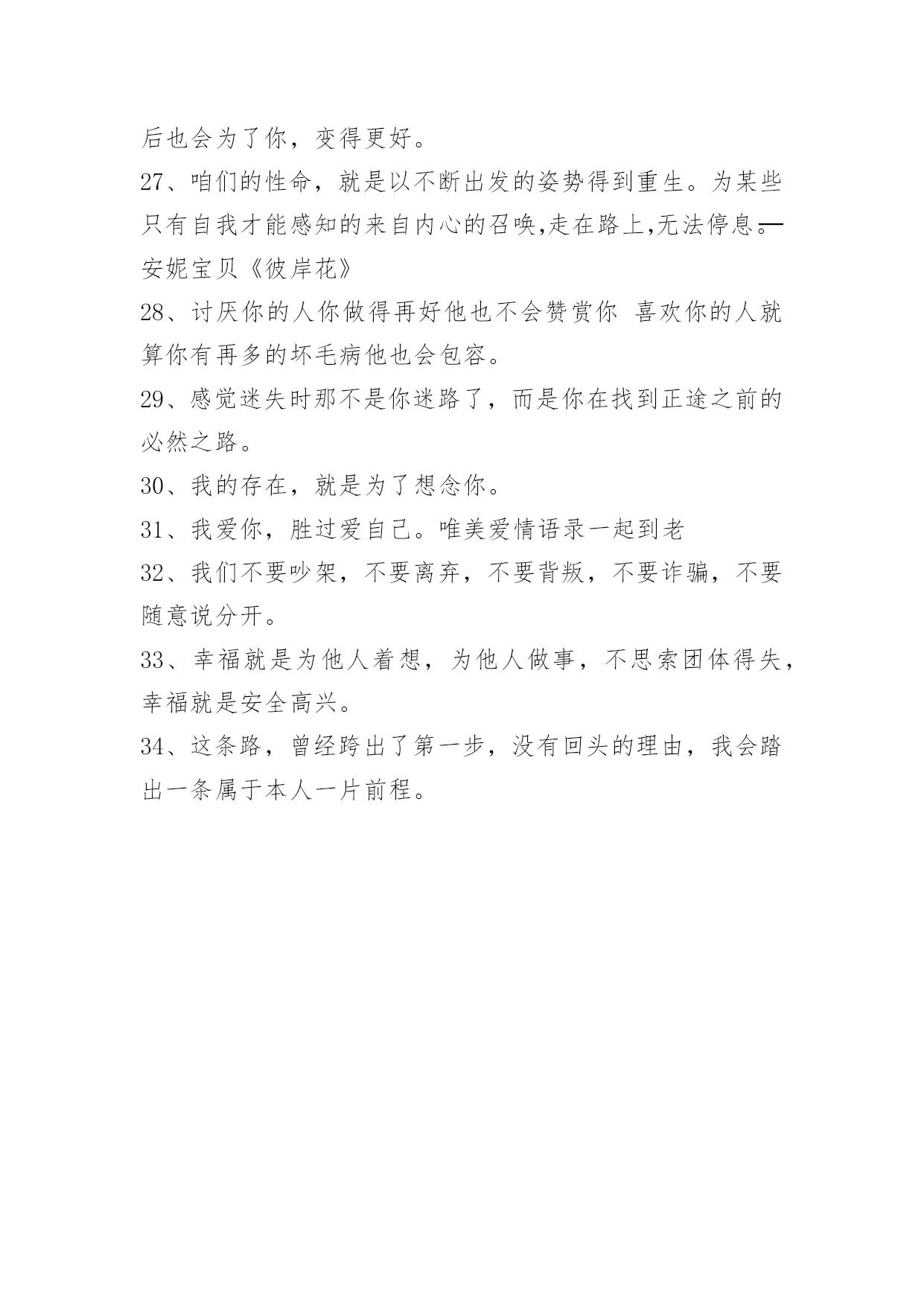 唯美爱情语录34条有关唯美爱情语录汇编34条你该拥有更轻易的幸福,谈恋爱不是追逐难度。下面是小编为大家收集的唯美爱情语录34条,欢迎大家前来欣赏。1、你的美,世之最,天仙降罪我来背;你消费,我付费,透支多少我来赔;你伤悲,我有愧,搓衣板上我来跪;你受累,我必陪,对灯发誓我无悔!4.27,誓爱妻,亲爱的,够爱你吧,4.27快乐!2、你说,我此生只想让你不流泪,天空的喜好就随他去吧。3、就把你当成一个纪念,不肯带着一种伤悲。4、待我长发及腰,少年娶我可好。待你青丝绾正,铺十里红妆可愿。却怕长发及腰,少年倾心他人。待你青丝绾正,笑看君怀她笑颜。5、等将来我老了,会舍不得比心爱的人先死去,舍不得让他一个人在世界上以看着我们过去的的相片来支撑自己的生活。所以要好好爱护自己哦!因为这样才能让自己活得比对方要更久一些,我宁愿让自己去感受没有老伴的世界,会有多冰凉。6、滚罢,带着我最后的慈悲……14世界上最勇敢的事情是微笑着听你说你们之间的爱情……15敏感的人大多不幸福。7、我假装无所谓,告诉我自己,我那么的坚强,我可以承受一切的。可是,当我被遗忘在角落的时候,我才发现,我输不起,我会害怕。那些凌乱的思绪,再也整理不好了。再也不敢知道你的消息,怕听到你过得比我好,我会难过,怕自己的堕落会让你嘲笑。所谓的坚强,模糊了我。8、真正的'爱情,要懂得珍惜,一辈子只爱一个人,并不丢人。9、有事我只是想,能有一个人,紧紧地抱着我,直到我的心情真的好起来。10、有的时候我们的莫名的恐惧是来源于无知。11、很多人的一生都是没有得到机会,可以在死去之前用力地去爱人,并不是力气不足够,而是没有遇见可以承受和接纳这份用力的对方。给予怎样都不迟,被承受和接纳是困难的。12、我等你老了,我给你当拐杖等你没牙了,我磨碎给你吃。13、世界上最远的距离,不是爱,不是恨,而是熟悉的人,渐渐变得陌生。有些事,不是不在意,而是在意了又能怎样。人生没有如果,只有后果和结果。成熟,就是用微笑来面对一切小事。14、幸福是一种很暧昧的概念根据环境的不同尺寸也会改变即使你觉得那是你的幸福但也可能是别人的不幸就算我们背负着被诅咒的命运也还是应该认为幸福是追随着自己的生命太宝贵所以不可以由命运支配。15、相遇在一个不合时宜的时光里,注定会有一个凄美的结局。结局定了,一切的过场都会显得那么牵强,可是每个人也都是要逝去的,那为什么还要生一场活一场呢?16、在我心里你最优秀,每天对你思念悠悠;Onlyyou,有你我将远离哀愁,只想和你一生相守,岁月流转我心依旧。17、女人要学会扮靓自己,不要拿朴素来当挡箭牌;不要拿家务做借口,不懂时尚,你就不是一个完整的女人。18、爱情,可以作茧自缚,亦可以化茧成蝶。19、青春换了几站,我们一直流浪,可终有港湾一直停留在那里等你。20、我以为我们都很认真地在谈恋爱,直到突然没有征兆的不联系了,才发现我原来是个备胎。21、微若星辰的我们被缘紧牵遇见,身边的每个相遇都是美好的,虽说时间匆匆,但是在这么大的世界里,我庆幸,我遇见了你。22、我很庆幸我没有想念的人,但是我的那个他啊,你什么时候来啊,我等不到了。23、一个人若在乎你,永远不会嫌弃你,即使你不漂亮、不优秀,不富足,在他心里,你就是完美。一个人若不在乎你,会想方设法躲着你,即使你再温柔,再富有,再深情,在她心里,全都是白费。24、虽然我不认识你,但是我想,不管你是小奶狗还是大狼狗,希望你能够早日找到属于你的意中人,永远幸福。25、我喜欢你,尽管我最后没能和你在一起,但是我并没有后悔,因为是你,让我成为更好的自己,学会勇敢、学会去面对生活中的烦恼和挑战!26、我握住你的手,想要告诉你,即使我现在不够好,我以后也会为了你,变得更好。27、咱们的性命,就是以不断出发的姿势得到重生。为某些只有自我才能感知的来自内心的召唤,走在路上,无法停息。─安妮宝贝《彼岸花》28、讨厌你的人你做得再好他也不会赞赏你喜欢你的人就算你有再多的坏毛病他也会包容。29、感觉迷失时那不是你迷路了,而是你在找到正途之前的必然之路。30、我的存在,就是为了想念你。31、我爱你,胜过爱自己。唯美爱情语录一起到老32、我们不要吵架,不要离弃,不要背叛,不要诈骗,不要随意说分开。33、幸福就是为他人着想,为他人做事,不思索团体得失,幸福就是安全高兴。34、这条路,曾经跨出了第一步,没有回头的理由,我会踏出一条属于本人一片前程。