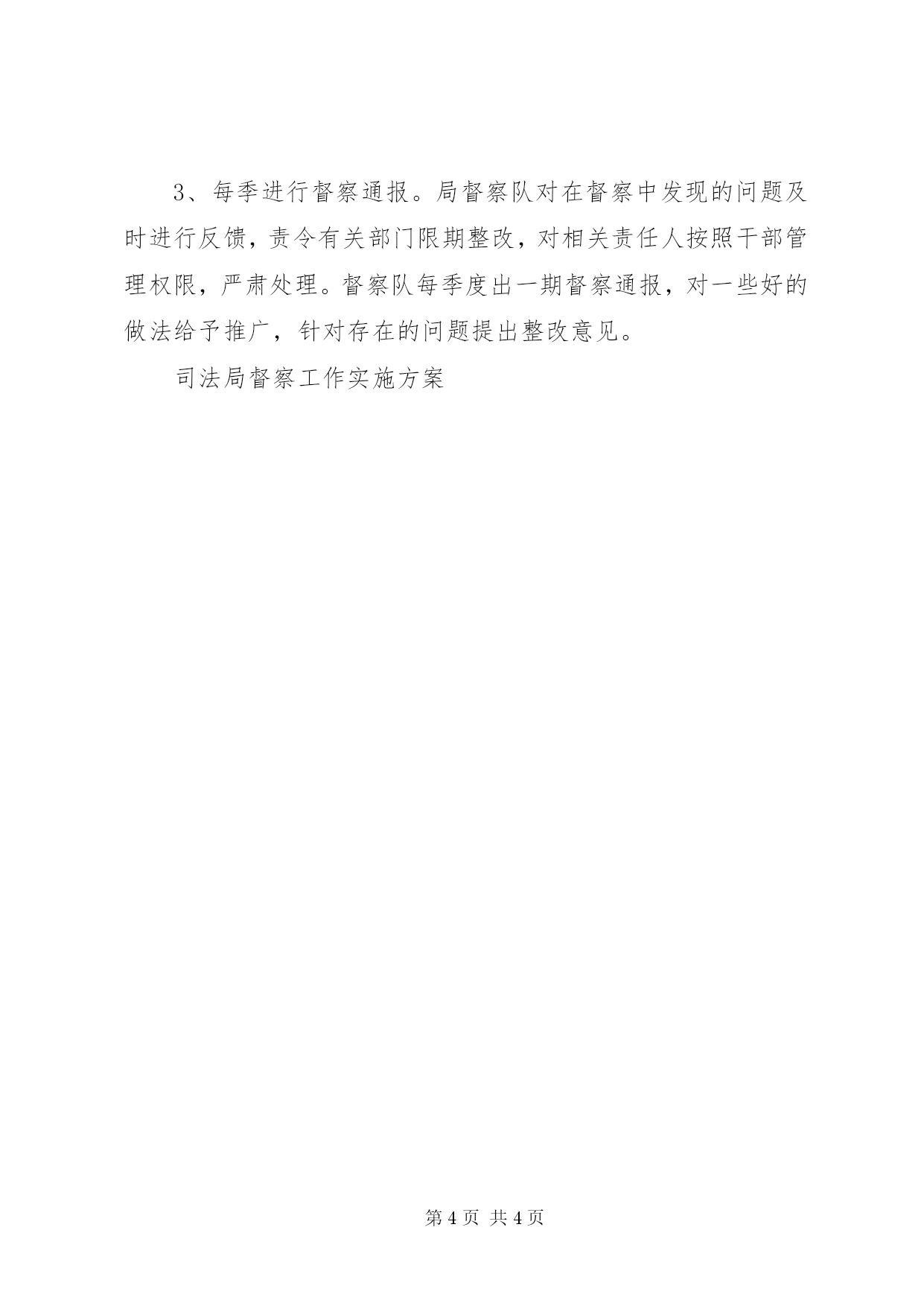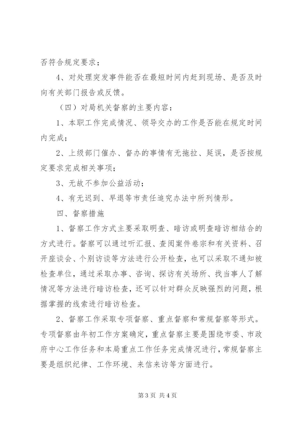 第PAGE\*Arabic\*MERGEFORMAT4页共NUMPAGES\*MERGEFORMAT4页司法局督察工作实施方案为了加强司法行政系统内部规范化管理,狠抓机关作风和效能建设,树立司法行政干警和法律服务人员良好形象,推动司法行政工作又好又快发展,确保进入全省首批优秀司法局行列,特制定督察工作实施意见。一、指导思想以党的十七大、十七届三中全会精神和邓小平理论、“三个代表”重要思想为指导,全面贯彻落实科学发展观,以提高机关执行力、凝聚力、创造力为总要求,为建设和谐美好的新通州提供优质高效的法治环境。二、目标任务坚持从严治警的方针,以规范执法行为、促进执法公正、增强服务意识和提高能力水平为总目标,按照“亲民务实塑形象、提速增效促发展”主题活动的要求开展督察活动,以推进权力运行阳光化、执行任务高效化为主要任务,努力使司法行政机关及工作人员在履行职责和创新发展上有新的突破,在服务质量和办事效率上有新的改进,在社会群众对司法行政机关的满意度上有新的提高,形成行为规范、运转协调、公正透明、廉洁高效的管理体制和运行机制,努力把通州司法局打造成全省司法行政系统办事效能最高、办事成本最低、办事环境最优的机关,争创全省首批“优秀司法局”。三、督察重点(一)对司法所督察的主要内容:1、司法所建立健全所务制度和工作制度情况;2、年初制定的有关目标任务、数据指标完成情况;3、履职情况及是否存在办事拖拉、推诿扯皮、不作为、中梗阻、乱作为等影响效能建设的情况;4、完成中心工作任务情况。(二)对律师事务所、基层法律服务所等窗口督察的主要内容:1、窗口法律服务规范管理情况,包括规章制度的建立、执行、公示和接待当事人的态度、当事人对所办理事务的满意度,有无投诉等;2、“双千百日”活动开展情况;3、开展法律援助案件回访;4、公证案件质量检查及在办案过程中是否存在公证员私自收费等不良行为或违法违规办证等现象。(三)对市镇两级矛盾调处中心督察的主要内容:1、接待窗口是否符合要求,该上墙公示的内容是否齐全;2、对来访人员是否热情接待、有无门难进、脸难看的现象;3、在调解过程中有无认真听取双方意见,制作的调解书是否符合规定要求;4、对处理突发事件能否在最短时间内赶到现场、是否及时向有关部门报告或反馈。(四)对局机关督察的主要内容:1、本职工作完成情况、领导交办的工作是否能在规定时间内完成;2、上级部门催办、督办的事情有无拖拉、延误,是否按规定要求完成相关事项;3、无故不参加公益活动;4、有无迟到、早退等市责任追究办法中所列情形。四、督察措施1、督察工作方式主要采取明查、暗访或明查暗访相结合的方式进行。督察可以通过听汇报、查阅案件卷宗和有关资料、召开座谈会、个别访谈等方法进行公开检查,也可以采取不通知被检查单位,通过采取办事、咨询、探访有关场所、找当事人了解情况等方法进行暗访检查,还可以针对群众反映强烈的问题,根据掌握的线索进行暗访检查。2、督察工作采取专项督察、重点督察和常规督察等形式。专项督察由年初工作方案确定,重点督察主要是围绕市委、市政府中心工作任务和本局重点工作任务完成情况进行,常规督察主要是组织纪律、工作环境、来信来访等方面进行。3、每季进行督察通报。局督察队对在督察中发现的问题及时进行反馈,责令有关部门限期整改,对相关责任人按照干部管理权限,严肃处理。督察队每季度出一期督察通报,对一些好的做法给予推广,针对存在的问题提出整改意见。司法局督察工作实施方案