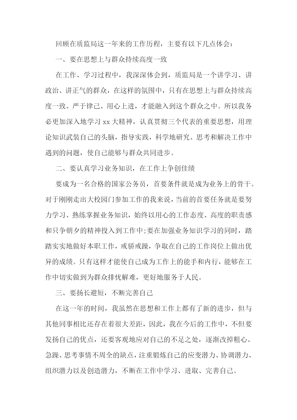 公务员的试用期转正工作总结公务员的试用期转正工作总结篇1x年x月,我透过公务员录用考试被招录到x局,成为一名光荣的国家公务员。一年来,在局领导的言传身教、关心培养下,在同事的支持帮忙、密切配合下,我不断加强思想政治学习,对工作精益求精,较为圆满地完成了自己所承担的各项工作任务,个人思想政治素质和业务工作潜力都取得了必须的进步,为今后的工作和学习打下了良好的基础,现将具体工作状况总结如下:一、在思想上始终坚持以邓小平理论和重要思想为指导,认真贯彻党的xx大和xx届四中、五中全会精神,认真加强思想政治学习,深入学习一系列重大方针、政策、措施,不断提高自己的政治理论水平,牢固树立全心全意为人民服务的宗旨和正确的世界观、人生观和价值观,强化廉洁自律的自觉性,使思想认识和自身素质都有了新的提高。同时用心向党组织靠拢,并向党组织递交了入党申请书。二、在工作上本着对工作用心、认真、负责的态度,认真遵守各项规章制度,虚心向领导和经验丰富的同志请教,努力学习各项业务知识。能够按照领导的要求参与x监督检查工作和x举报平台的工作,在工作中主义寻找方法,透过不断学习,不断积累,逐步掌握x监督检查的技巧和规律,使工作效率和工作质量有了较大提高,较好地完成了各项工作任务。三、在工作过程中,深深感到加强自身学习、提高自身素质的紧迫性,因此,每一天都坚持挤出必须的时间不断充实自己,端正态度,改善方法,广泛汲取各种营养。同时向周围的同志学习,始终持续谦虚谨慎、虚心求教的态度,主动向领导、同事们请教,学习他们任劳任怨、求真务实的工作作风和处理问题的方法,努力使自己在尽短的时间内熟悉工作,并把所学的知识运用于实际工作中,在实践中检验所学知识,查找不足,提高自己,防止和克服浅尝辄止、一知半解的倾向。一年来,我在组织、领导和同志们的教育和帮忙下取得了必须的成绩,但我深知自己还存在一些缺点和不足,政治理论基础还不够扎实,业务知识还不够全面,工作方式还不够成熟。在今后的工作中,我要努力做到戒骄戒躁,坚定政治信念,加强理论学习,积累经验教训,不断调整自己的思维方式和工作方法,在实践中磨练自己,成为人民满意的公务员。公务员的试用期转正工作总结篇2一年来,我始终热衷于本职工作,严格要求自己,摆正工作位置,时刻持续谦虚、谨慎、律己的态度,在领导的关心栽培和同事们的帮忙支持下,始终勤奋学习、用心进取,努力提高自我,始终勤奋工作,认真完成任务,履行好岗位职责,个人思想政治素质和业务工作潜力都取得了必须的进步。现将一年来的学习、工作状况简要总结如下:一、严于律己,不断提高思想政治素质我始终以提高自身素质为目标,坚持把学习放在首位,不断提高自身的思想政治素质和业务工作水平。一是平时认真学习马列主义、毛泽东思想、邓小平理论及三个代表重要思想,认真学习贯彻党的xx大和xx届六中全会精神,站稳政治立场,严守政治纪律,牢记全心全意为人民服务的宗旨;二是采取集中学习与自学相结合的方式,用心参加机关组织开展的各类政治、业务学习,坚持认真记笔记。透过这些学习不断提高了自身的政治理论水平,丰富了政治头脑,增强了政治敏锐性。二、努力学习,不断提高业务知识水平我始终把业务理论学习作为搞好本职工作的立足点和突破口,认真学习中央和省、市、县移民工作会议精神及《国务院关于完善大中型水库移民后期扶持政策实施方案》、《广东省水库移民后期扶持政策实施方案》、《广东省大中型水库移民后期扶持基金使用管理暂行办法》等重要文件,做到在学习中提高,以实际需求增强学习的自觉性,不断提高业务理论水平,增强业务处理潜力。平时工作中经常向单位业务强,经验丰富的同志学习,不懂就问,并坚持记工作笔记,不断总结工作中的成败得失,还透过各种途径来提高自己的学习热情,变被动学习为主动学习。经过一年的不懈努力,我的业务理论知识得到了必须的提高。三、求真务实,努力完成本职工作任务进入县移民办之后,我被分配到人事秘书股工作,一年来,我始终坚持严格要求自己,勤奋努力,时刻牢记全心全意为人民服务的宗旨,努力作好本职工作。人事秘书股工作是完全服务性质的工作,既要对外服务,也对内服务,工作中要做到四勤即眼勤、嘴勤、手勤、脚勤。在接待移民群众来访办事时,用一张笑脸、一杯热茶、一声问候、一种耐心用心地服务好移民群众,扎扎实实为移民群众做些看得见、摸得着的事情,解决移民群众存在的实际困难;在收文发文时,总是用最短的时间把文件送到达各股室,并及时把领导批阅文件收回归档或传阅到其股室,从来没有遗漏掉一份文件;在收集整理资料时,全面、准确地了解各方面工作的开展状况,及时总结、汇总,向领导汇报或让领导备查;在起草文稿时,能及时认真完成领导交付的任务,同时在组织会务、后勤管理、打字复印等工作上也尽职尽责,不留下任何纰漏。一年来,我在组织、领导