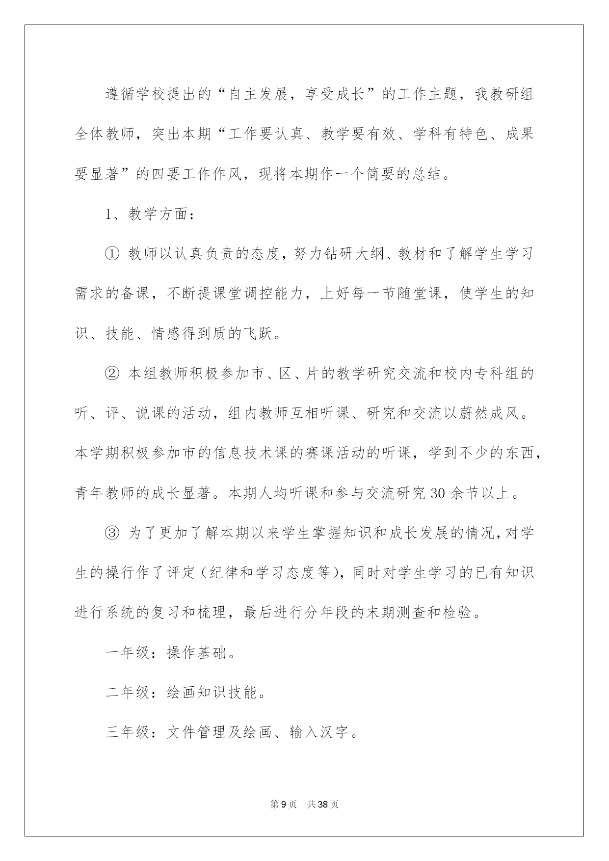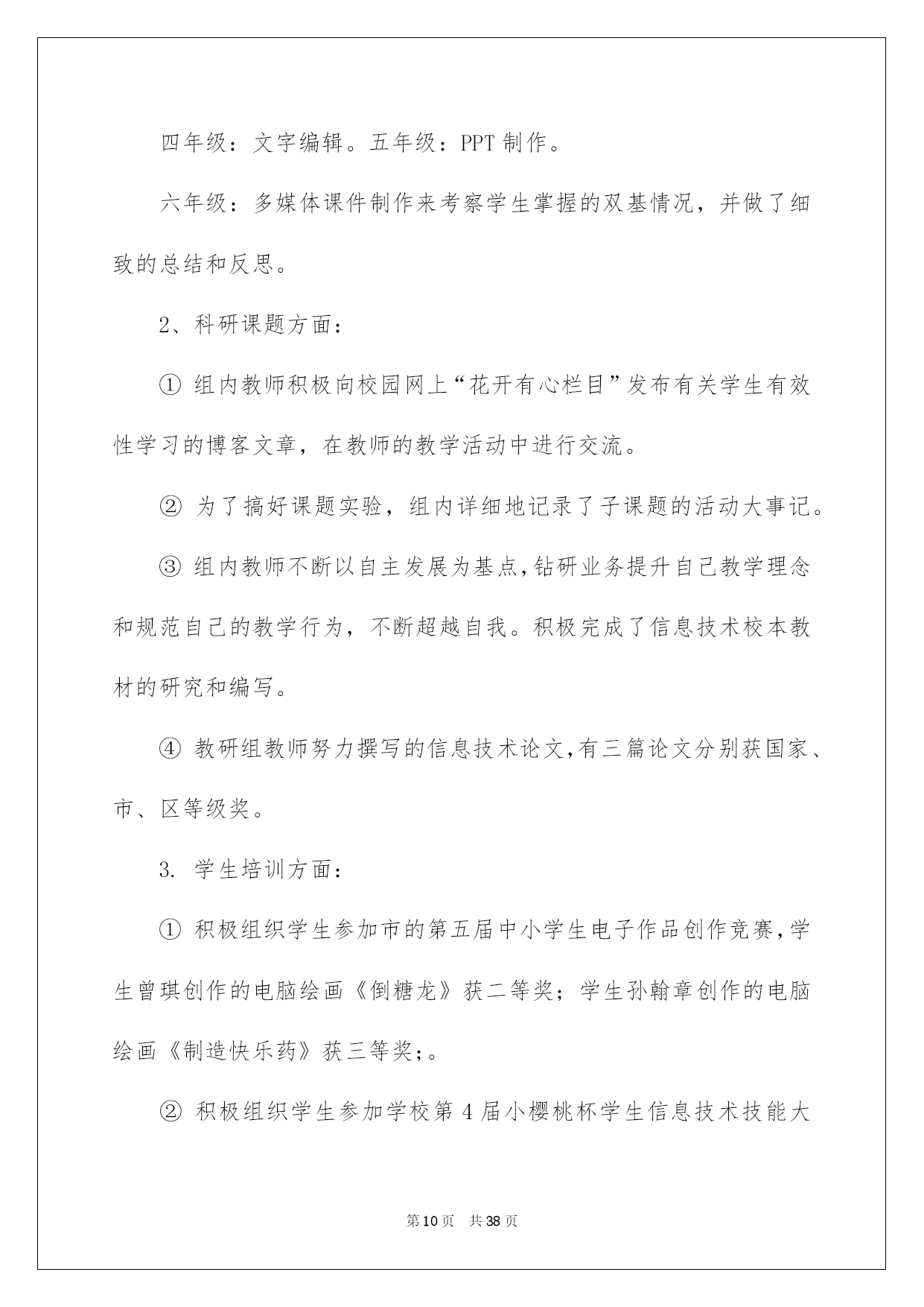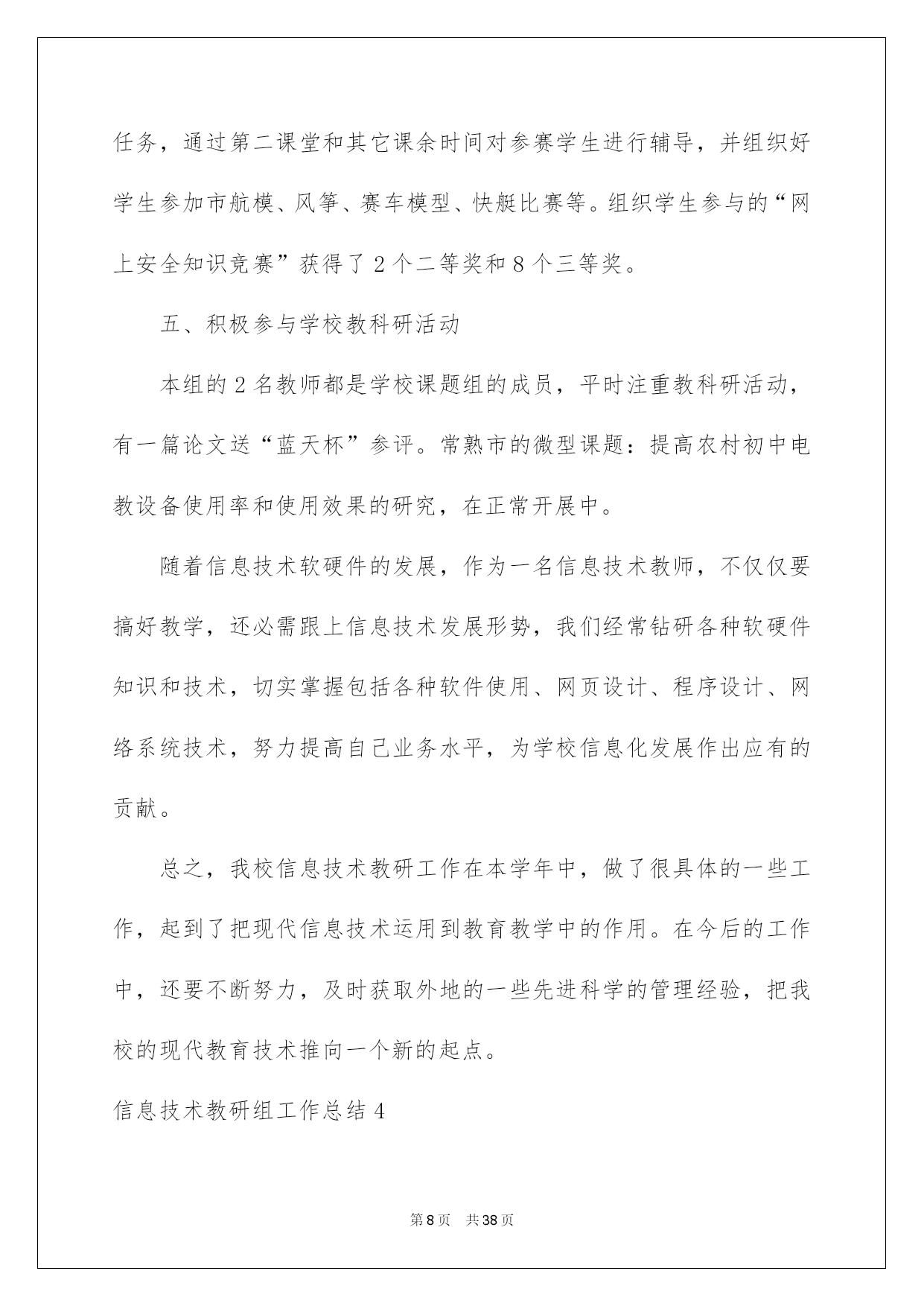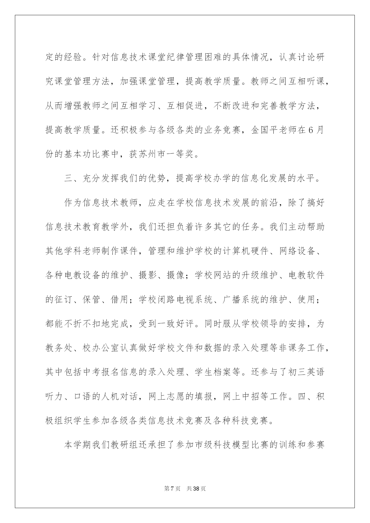 第PAGE\*Arabic\*MERGEFORMAT38页共NUMPAGES\*Arabic\*MERGEFORMAT38页第PAGE\*MERGEFORMAT38页共NUMPAGES\*MERGEFORMAT38页第PAGE\*MERGEFORMAT38页共NUMPAGES\*MERGEFORMAT38页第PAGE\*MERGEFORMAT38页共NUMPAGES\*MERGEFORMAT38页第PAGE\*MERGEFORMAT38页共NUMPAGES\*MERGEFORMAT38页第PAGE\*MERGEFORMAT38页共NUMPAGES\*MERGEFORMAT38页第PAGE\*MERGEFORMAT38页共NUMPAGES\*MERGEFORMAT38页第PAGE\*MERGEFORMAT38页共NUMPAGES\*MERGEFORMAT38页第PAGE\*MERGEFORMAT38页共NUMPAGES\*MERGEFORMAT38页第PAGE\*MERGEFORMAT38页共NUMPAGES\*MERGEFORMAT38页第PAGE\*MERGEFORMAT38页共NUMPAGES\*MERGEFORMAT38页2022信息技术教研组工作总结信息技术教研组工作总结总结是指社会团体、企业单位和个人对某一阶段的学习、工作或其完成情况加以回顾和分析,得出教训和一些规律性认识的一种书面材料,它可以提升我们发现问题的能力,让我们来为自己写一份总结吧。但是却发现不知道该写些什么,下面是我帮大家整理的信息技术教研组工作总结,欢迎大家借鉴与参考,希望对大家有所帮助。信息技术教研组工作总结1这一学期以来,信息技术教研组在学校及教务处领导的支持和帮助下,努力工作,刻苦钻研,积极学习新知识和新的教育教学理论,努力提高教研组综合素质和竞争力。紧紧围绕学校的中心工作,开展形式多样的课堂教学改革和教研活动,敬业乐教,发扬奉献精神,取得了一定的成绩。主要总结为如下几个方面:一、认真制定工作计划开学初,按照学校的统一要求,召开了教研会议,学习学校和教务处在本学期的工作计划及工作安排,明确了工作目标,总结上学期的成绩与不足,制订了教研组本学期的工作计划,并就兴趣小组活动和信息学竞赛进行了具体的分工和安排:①兴趣小组活动由冯志明老师总负责,李小兰老师负责七年级,张玉燕老师负责八年级,王巧珍老师负责九年级;②电脑制作小组和信息学竞赛小组的课外辅导工作由冯志明老师负责。课外兴趣小组活动计划由教研组统一制定,各小组按照组内计划自行制定本小组活动计划,经过教研组老师的努力,取得了良好的成绩。信息组基本上每两周举行一次教研组活动,教研活动做到了有计划、定时间、定地点、定活动主题。二、开展常规教研工作备课方面:按照学校要求实行电子化集体备课,电子备课的条理清晰、认真细致,能按要求认真完成,有的教师还写在教案本上,实施双重备课。作业方面:学生书面作业要求一周一次,本学期进行了两次定期检查,上机作业基本上能够随堂完成。听课方面:教研组教师采取互听互评的方式,不断提高自身教学水平,并在学校课改实验探究的前提下,鼓励本组教师积极学习其它教研组的先进经验。维护工作:做好学生机房和网络设备的维护工作,并协力完成班级、办公室电脑的维修,保证教学工作的正常进行。三、积极参与课改实践教研组内教研气氛浓厚,青年教师虚心向骨干教师请教教学方法、经验,骨干教师主动向青年教师学习新知识、新方法,互相学习、共同提高。教师们积极参与教育教学研究:定时组织教研组活动,讨论教学方法、研究教材内容;积极撰写教学论文、参与综合实践活动;并主动参加学校开展的一系列课改活动,取得了一定的成绩。四、做好各项协助工作由于信息教研组的特殊性,在学校多项活动中都需要信息教研组的参与协助,并能圆满完成各项任务。①协助教务处和体育组做好学生体质健康数据上报工作;②协助办公室完成教师基本信息数据的录入和检查工作;③协助总务处及其他处室完成教师绩效工资的统计计算工作。五、今后努力的方向1、今后的教育教学工作中,将加强学生的思想教育,教育学生树立科学的人生观和学习观念,提高学生的信息素质和探索精神。2、加强基础知识和基本技能的教学,提高学生的实验操作能力。注意教学方法的运用,采用形式多样的教学手段,充分调动学生的学习积极性和主动性,激发学生的求知欲。3、继续加强教育教学研究工作,注意提高自身的教育教学水平和业务素质,争取更大的成绩。信息技术教研组工作总结2本学年信息技术教研组紧紧围绕我校信息化建设目标开展工作。充分利用现有信息资源,以课堂模式改革为突破,营造良好