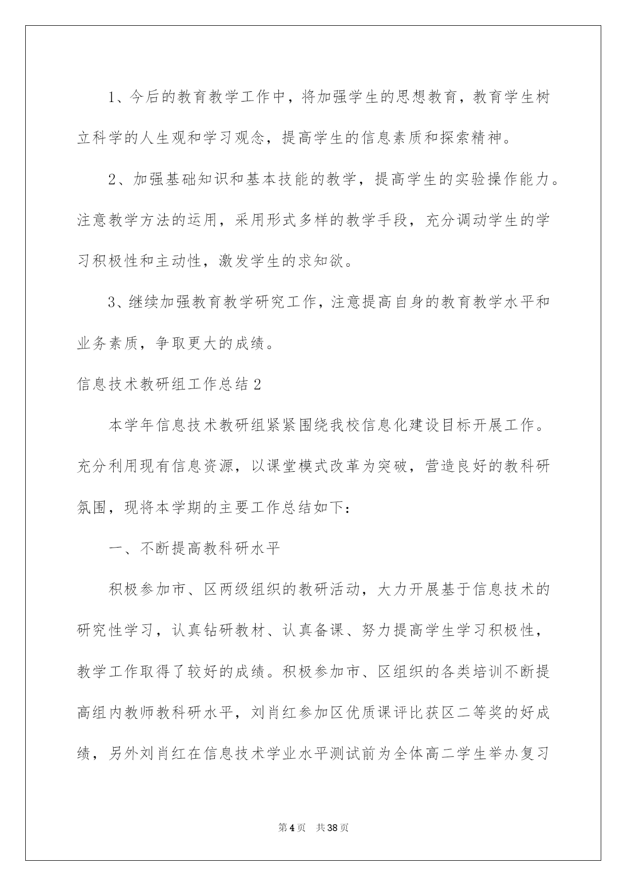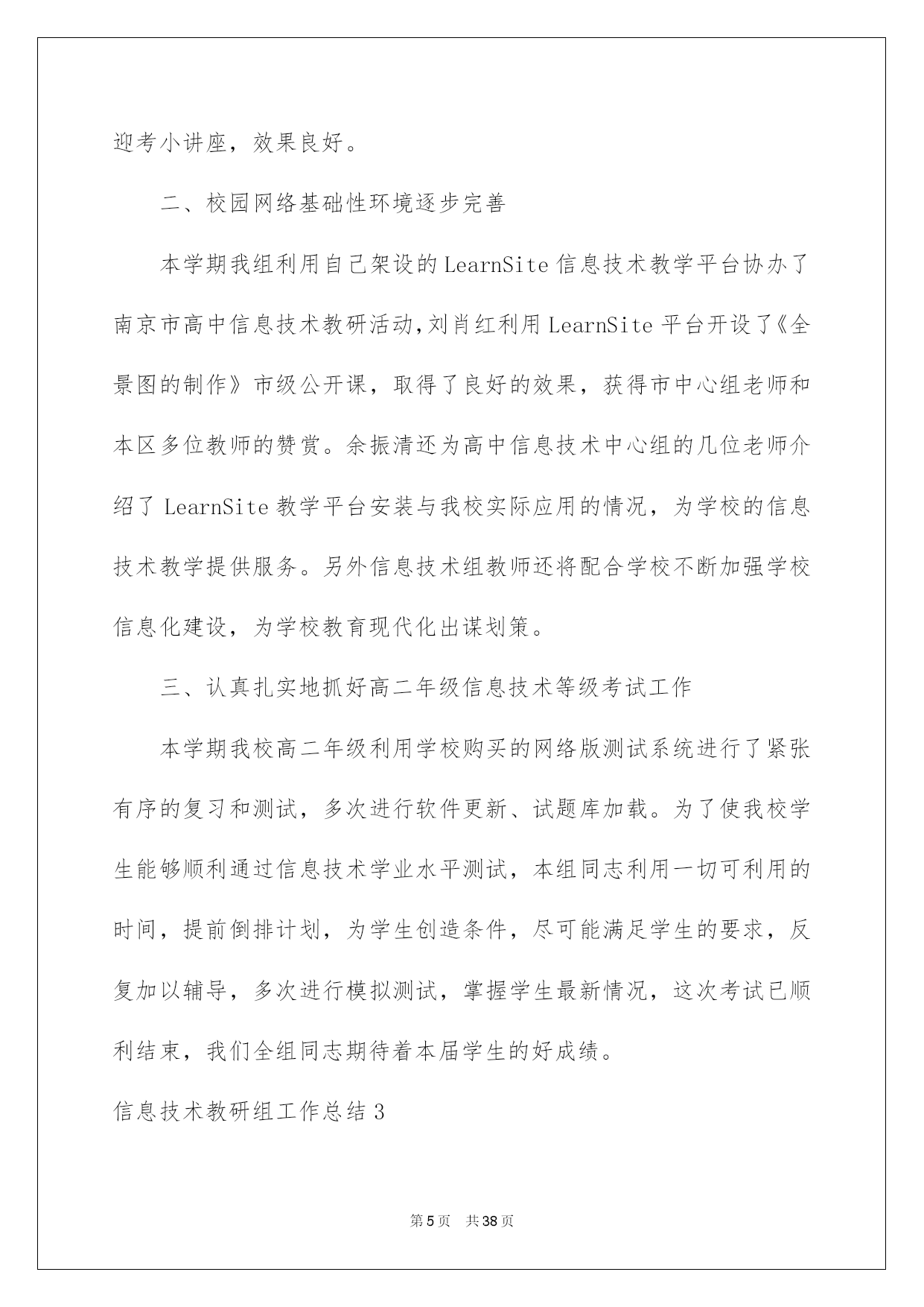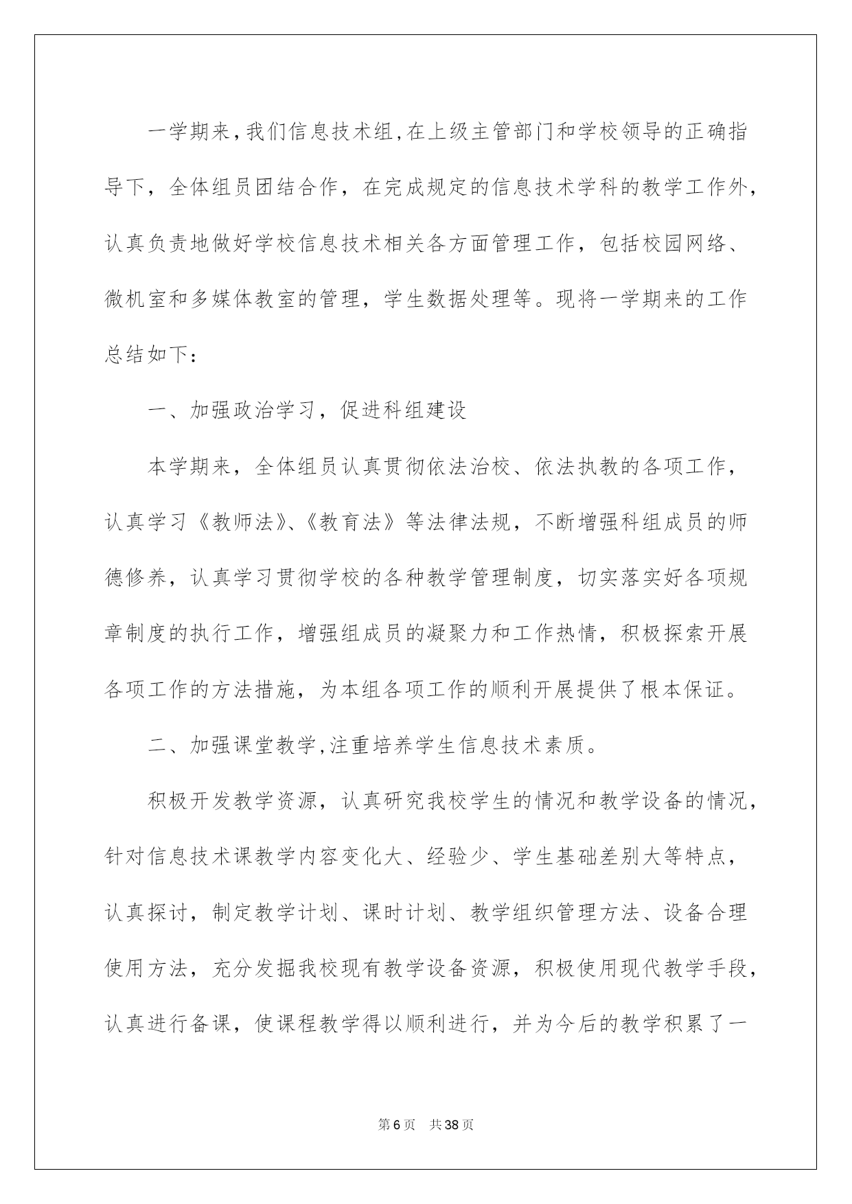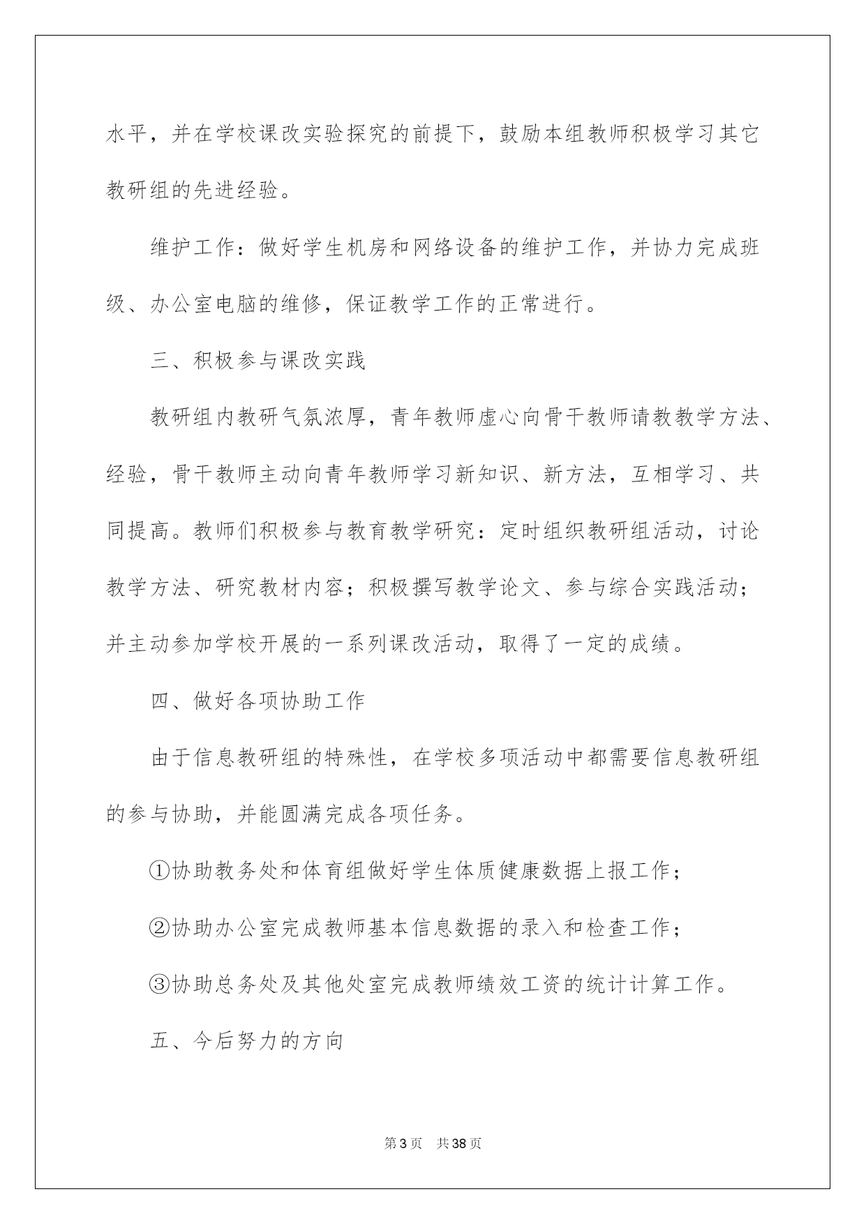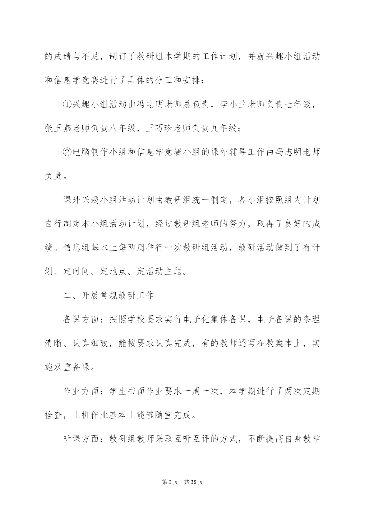 第PAGE\*Arabic\*MERGEFORMAT38页共NUMPAGES\*Arabic\*MERGEFORMAT38页第PAGE\*MERGEFORMAT38页共NUMPAGES\*MERGEFORMAT38页第PAGE\*MERGEFORMAT38页共NUMPAGES\*MERGEFORMAT38页第PAGE\*MERGEFORMAT38页共NUMPAGES\*MERGEFORMAT38页第PAGE\*MERGEFORMAT38页共NUMPAGES\*MERGEFORMAT38页第PAGE\*MERGEFORMAT38页共NUMPAGES\*MERGEFORMAT38页第PAGE\*MERGEFORMAT38页共NUMPAGES\*MERGEFORMAT38页第PAGE\*MERGEFORMAT38页共NUMPAGES\*MERGEFORMAT38页第PAGE\*MERGEFORMAT38页共NUMPAGES\*MERGEFORMAT38页第PAGE\*MERGEFORMAT38页共NUMPAGES\*MERGEFORMAT38页第PAGE\*MERGEFORMAT38页共NUMPAGES\*MERGEFORMAT38页2022信息技术教研组工作总结信息技术教研组工作总结总结是指社会团体、企业单位和个人对某一阶段的学习、工作或其完成情况加以回顾和分析,得出教训和一些规律性认识的一种书面材料,它可以提升我们发现问题的能力,让我们来为自己写一份总结吧。但是却发现不知道该写些什么,下面是我帮大家整理的信息技术教研组工作总结,欢迎大家借鉴与参考,希望对大家有所帮助。信息技术教研组工作总结1这一学期以来,信息技术教研组在学校及教务处领导的支持和帮助下,努力工作,刻苦钻研,积极学习新知识和新的教育教学理论,努力提高教研组综合素质和竞争力。紧紧围绕学校的中心工作,开展形式多样的课堂教学改革和教研活动,敬业乐教,发扬奉献精神,取得了一定的成绩。主要总结为如下几个方面:一、认真制定工作计划开学初,按照学校的统一要求,召开了教研会议,学习学校和教务处在本学期的工作计划及工作安排,明确了工作目标,总结上学期的成绩与不足,制订了教研组本学期的工作计划,并就兴趣小组活动和信息学竞赛进行了具体的分工和安排:①兴趣小组活动由冯志明老师总负责,李小兰老师负责七年级,张玉燕老师负责八年级,王巧珍老师负责九年级;②电脑制作小组和信息学竞赛小组的课外辅导工作由冯志明老师负责。课外兴趣小组活动计划由教研组统一制定,各小组按照组内计划自行制定本小组活动计划,经过教研组老师的努力,取得了良好的成绩。信息组基本上每两周举行一次教研组活动,教研活动做到了有计划、定时间、定地点、定活动主题。二、开展常规教研工作备课方面:按照学校要求实行电子化集体备课,电子备课的条理清晰、认真细致,能按要求认真完成,有的教师还写在教案本上,实施双重备课。作业方面:学生书面作业要求一周一次,本学期进行了两次定期检查,上机作业基本上能够随堂完成。听课方面:教研组教师采取互听互评的方式,不断提高自身教学水平,并在学校课改实验探究的前提下,鼓励本组教师积极学习其它教研组的先进经验。维护工作:做好学生机房和网络设备的维护工作,并协力完成班级、办公室电脑的维修,保证教学工作的正常进行。三、积极参与课改实践教研组内教研气氛浓厚,青年教师虚心向骨干教师请教教学方法、经验,骨干教师主动向青年教师学习新知识、新方法,互相学习、共同提高。教师们积极参与教育教学研究:定时组织教研组活动,讨论教学方法、研究教材内容;积极撰写教学论文、参与综合实践活动;并主动参加学校开展的一系列课改活动,取得了一定的成绩。四、做好各项协助工作由于信息教研组的特殊性,在学校多项活动中都需要信息教研组的参与协助,并能圆满完成各项任务。①协助教务处和体育组做好学生体质健康数据上报工作;②协助办公室完成教师基本信息数据的录入和检查工作;③协助总务处及其他处室完成教师绩效工资的统计计算工作。五、今后努力的方向1、今后的教育教学工作中,将加强学生的思想教育,教育学生树立科学的人生观和学习观念,提高学生的信息素质和探索精神。2、加强基础知识和基本技能的教学,提高学生的实验操作能力。注意教学方法的运用,采用形式多样的教学手段,充分调动学生的学习积极性和主动性,激发学生的求知欲。3、继续加强教育教学研究工作,注意提高自身的教育教学水平和业务素质,争取更大的成绩。信息技术教研组工作总结2本学年信息技术教研组紧紧围绕我校信息化建设目标开展工作。充分利用现有信息资源,以课堂模式改革为突破,营造良好