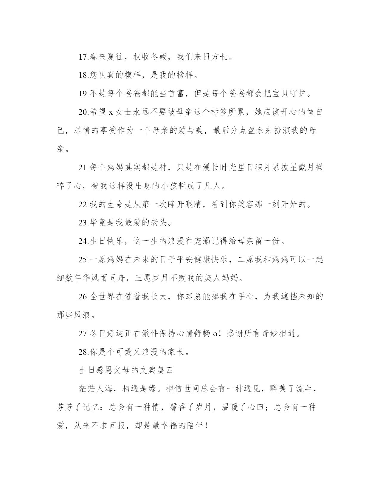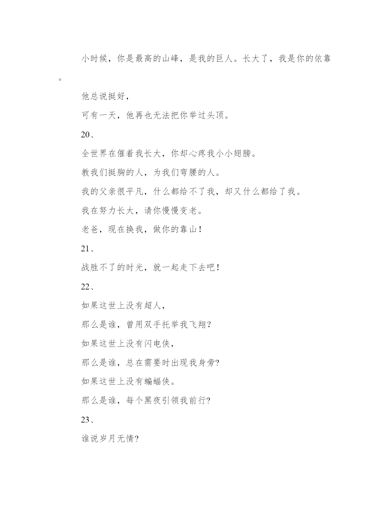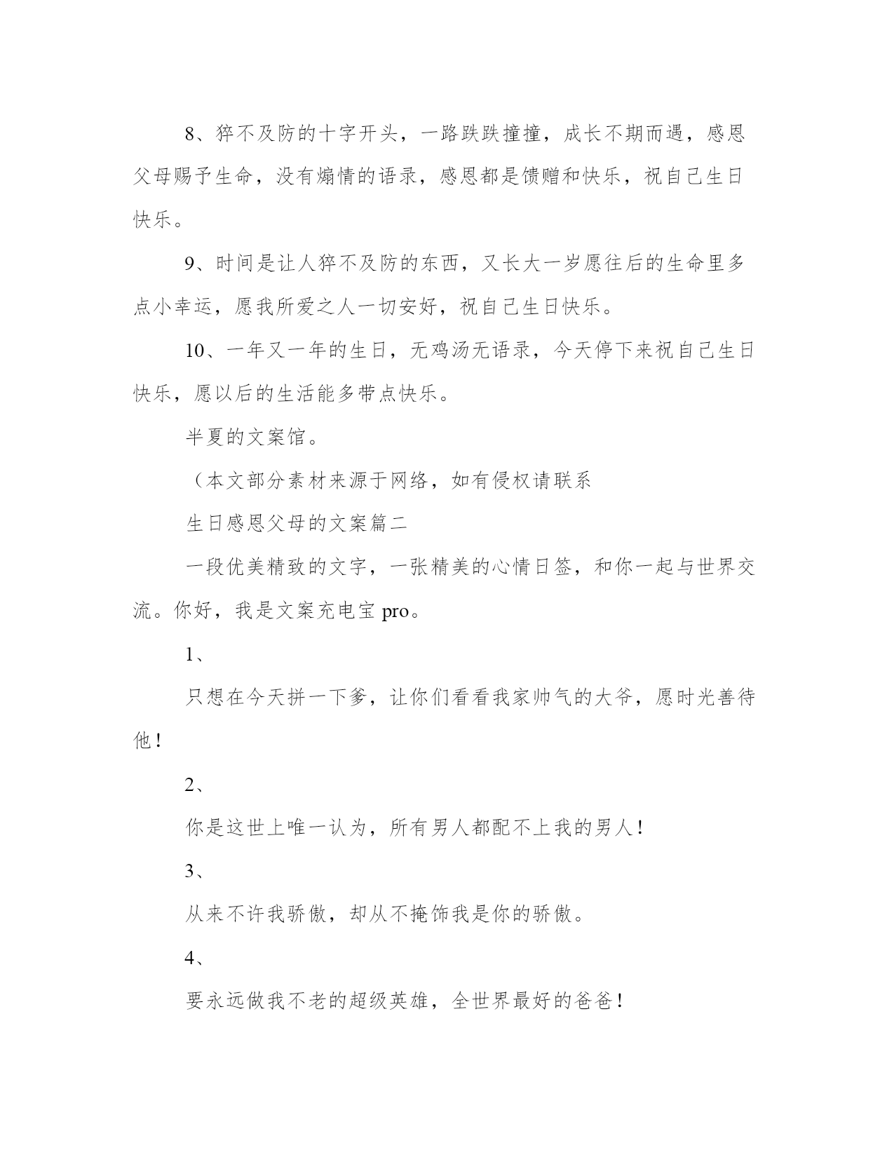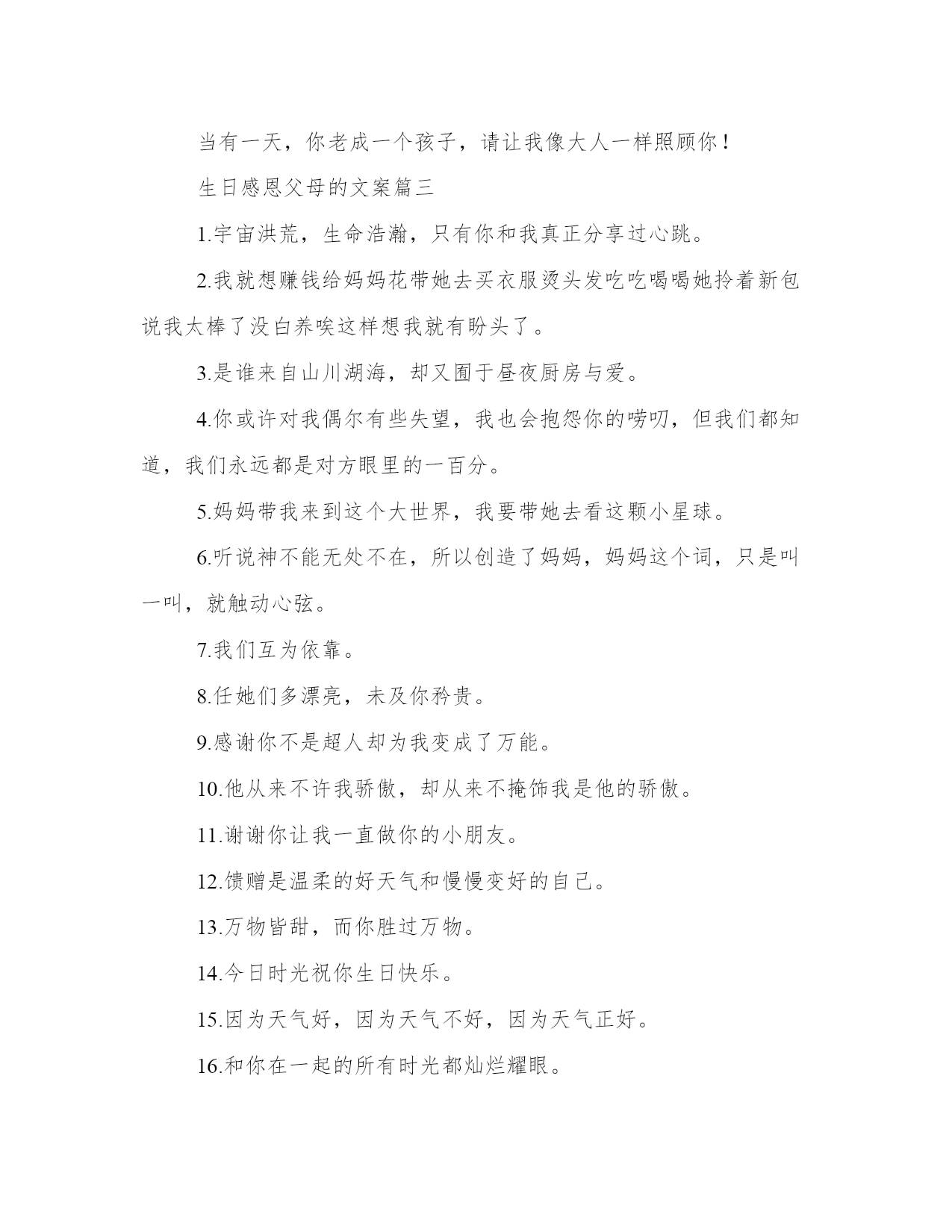 生日感恩父母的文案(模板14篇)人的记忆力会随着岁月的流逝而衰退,写作可以弥补记忆的不足,将曾经的人生经历和感悟记录下来,也便于保存一份美好的回忆。相信许多人会觉得范文很难写?接下来小编就给大家介绍一下优秀的范文该怎么写,我们一起来看一看吧。生日感恩父母的文案篇一1、生日快乐,星星是银河赠与月亮的情书,你是世界赠与我的恩赐。2、不过是又长大一岁的美女罢了。3、这是没有流星雨可以许愿的一天。半夏的文案馆。4、生日是谁,他快不快乐有什么要紧的,最重要的是,我希望你是快乐的。5、寿星许愿,多吃不胖,积极向上,热枕善良,健康快乐。6、没有零食的生日祝福,没有煽情的语录,感恩都是馈赠和快乐,祝自己生日快乐。半夏的文案馆。7、所有励志的鸡汤都不如一顿美餐,愉快祝我自己生日快乐。8、猝不及防的十字开头,一路跌跌撞撞,成长不期而遇,感恩父母赐予生命,没有煽情的语录,感恩都是馈赠和快乐,祝自己生日快乐。9、时间是让人猝不及防的东西,又长大一岁愿往后的生命里多点小幸运,愿我所爱之人一切安好,祝自己生日快乐。10、一年又一年的生日,无鸡汤无语录,今天停下来祝自己生日快乐,愿以后的生活能多带点快乐。半夏的文案馆。(本文部分素材来源于网络,如有侵权请联系生日感恩父母的文案篇二一段优美精致的文字,一张精美的心情日签,和你一起与世界交流。你好,我是文案充电宝pro。1、只想在今天拼一下爹,让你们看看我家帅气的大爷,愿时光善待他!2、你是这世上唯一认为,所有男人都配不上我的男人!3、从来不许我骄傲,却从不掩饰我是你的骄傲。4、要永远做我不老的超级英雄,全世界最好的爸爸!5、我强大,这随你。6、除了怀胎十月,你做的不比妈妈少。7、我的老爸,没有人会比你更胜任这份工作!8、你包容我的坏脾气,我也不介意你大大的啤酒肚。能接收我眼泪的地方,只有无人的街道和你的怀抱。9、爸爸存在的理由是支持保护我,去做有趣而不必有用的事情。爸爸存在的理由,是陪我看蜗牛,告诉我,人生的路,要慢慢走。爸爸存在的理由,是教我人生道理,再让我们教他,孩童之心。10、老爸们都很酷,不喜欢把爱挂在嘴边,但时间会把一切都说出来。谢谢你给我的爱,让我从未羡慕过任何人。11、人生中的第一辆车是爸爸的肩膀。12、他并不挑剔,只是把最好的都挑出来,给了你。13、有一天我会找到我的王子,但你永远是我的国王。14、是你把我举过头顶看世界。15、你不是超人却为我变成了万能。你也会累,会受伤,可你还不能独自奔跑,他只能坚强。16、从前我坐在你肩膀上看天好蓝,你背着我快快跑。以后我陪在你身边看风景,挽着你手慢慢走。你带着我看世界,我却变成了你的全世界。17、爸爸是世界上最别扭的人,他从来不会说我爱你,但是每一个行动都在暗戳戳的表达着爱你。18、在做爸爸之前你也是懵懂的骑士,因为我变成一辈子守护公主的骑士。19、他改掉好多坏毛病,因为你把他当英雄,他不敢让你失望。小时候,你是最高的山峰,是我的巨人。长大了,我是你的依靠。他总说挺好,可有一天,他再也无法把你举过头顶。20、全世界在催着我长大,你却心疼我小小翅膀。教我们挺胸的人,为我们弯腰的人。我的父亲很平凡,什么都给不了我,却又什么都给了我。我在努力长大,请你慢慢变老。老爸,现在换我,做你的靠山!21、战胜不了的时光,就一起走下去吧!22、如果这世上没有超人,那么是谁,曾用双手托举我飞翔?如果这世上没有闪电侠,那么是谁,总在需要时出现我身旁?如果这世上没有蝙蝠侠。那么是谁,每个黑夜引领我前行?23、谁说岁月无情?在我有生以来的漫长岁月里,全都是,你的温情。24、小时候嫌老爸的话多余,长大后格外珍惜每一句。25、在他老去之前,真真正正地成为他的骄傲吧。26、和爸爸吵架的时候,摸摸自己肚子的肉,那是爸爸在外面赚钱养的。27、用我毕生殷勤换你有梦可枕眠。28、太阳公公别晒我了来把我爸爸的头发晒黑吧。29、你是优秀但不善表达的父亲,而我只继承了你的不善表达。30、以前你的背影一点也不像山,后来发福了,就像了。31、再次申明,每次妈妈抱怨你的时候,我从没附和。32、开始看你喜欢的戏剧、评书、喝你爱喝的酒,感觉又多懂你一点。33、即使你偷偷染了发,可你还是老了。34、说了那么多冲撞你的话,你怎么-句都没还回来。35、你遮过风、挡过雨,也对我发过脾气,以后我为你遮风挡雨,尽量不对你发脾气。36、你是这世上唯一-认为,所有男人都配不上我的男人。37、你以前也是个叛逆的二小子,怎么一做父亲,就变得这么靠谱了。38、你的世界和我的世界没有交集,只要我在你身边
