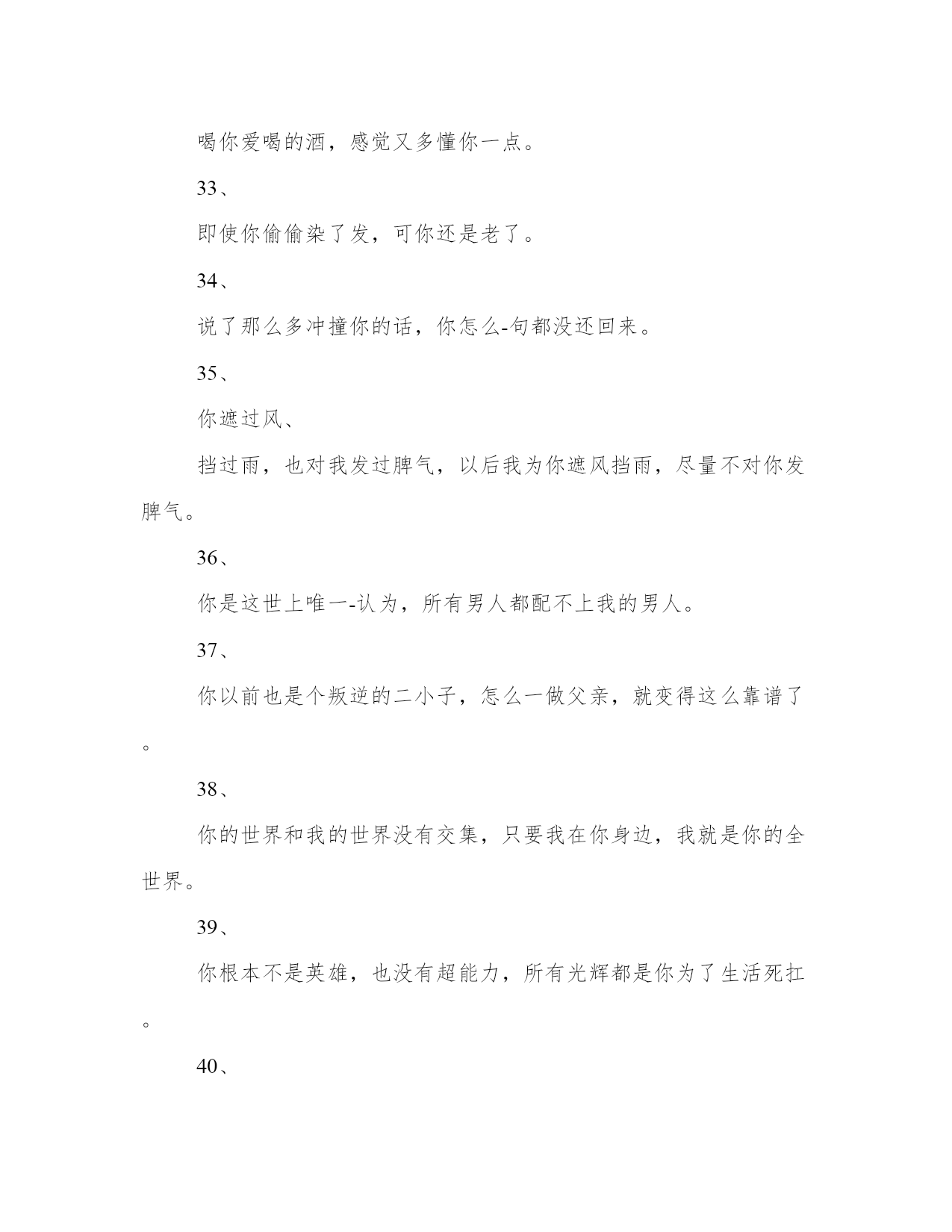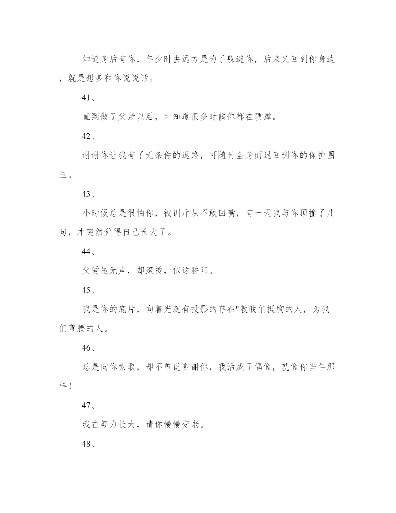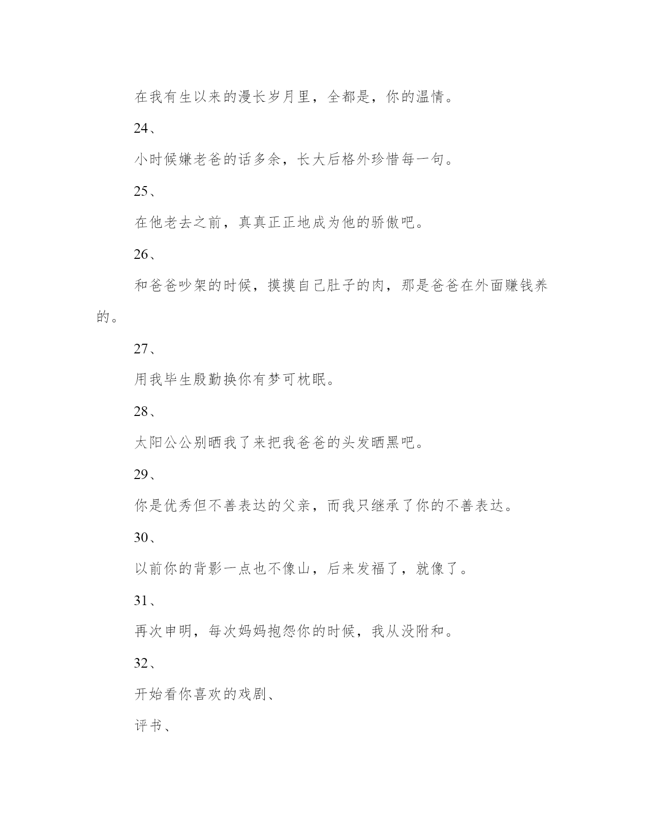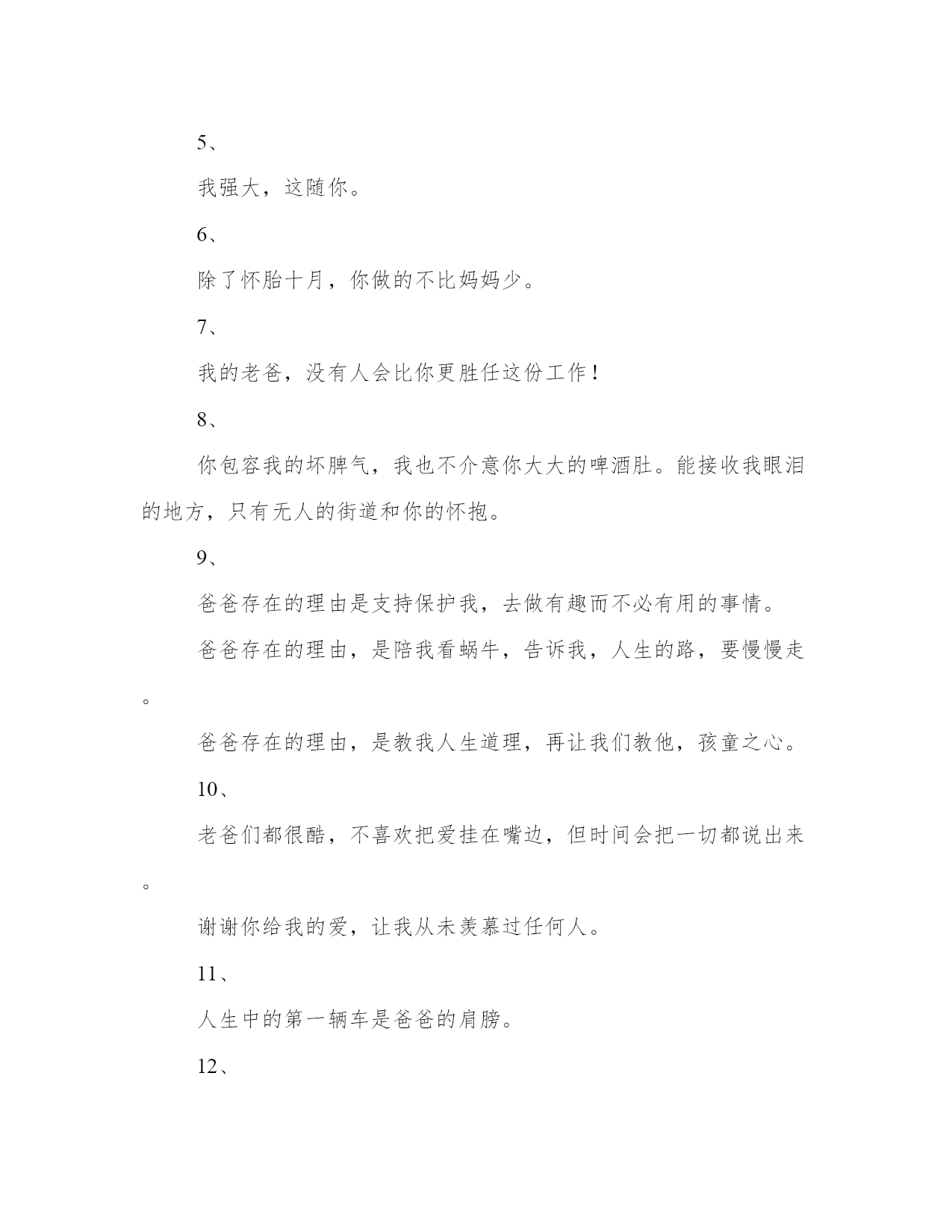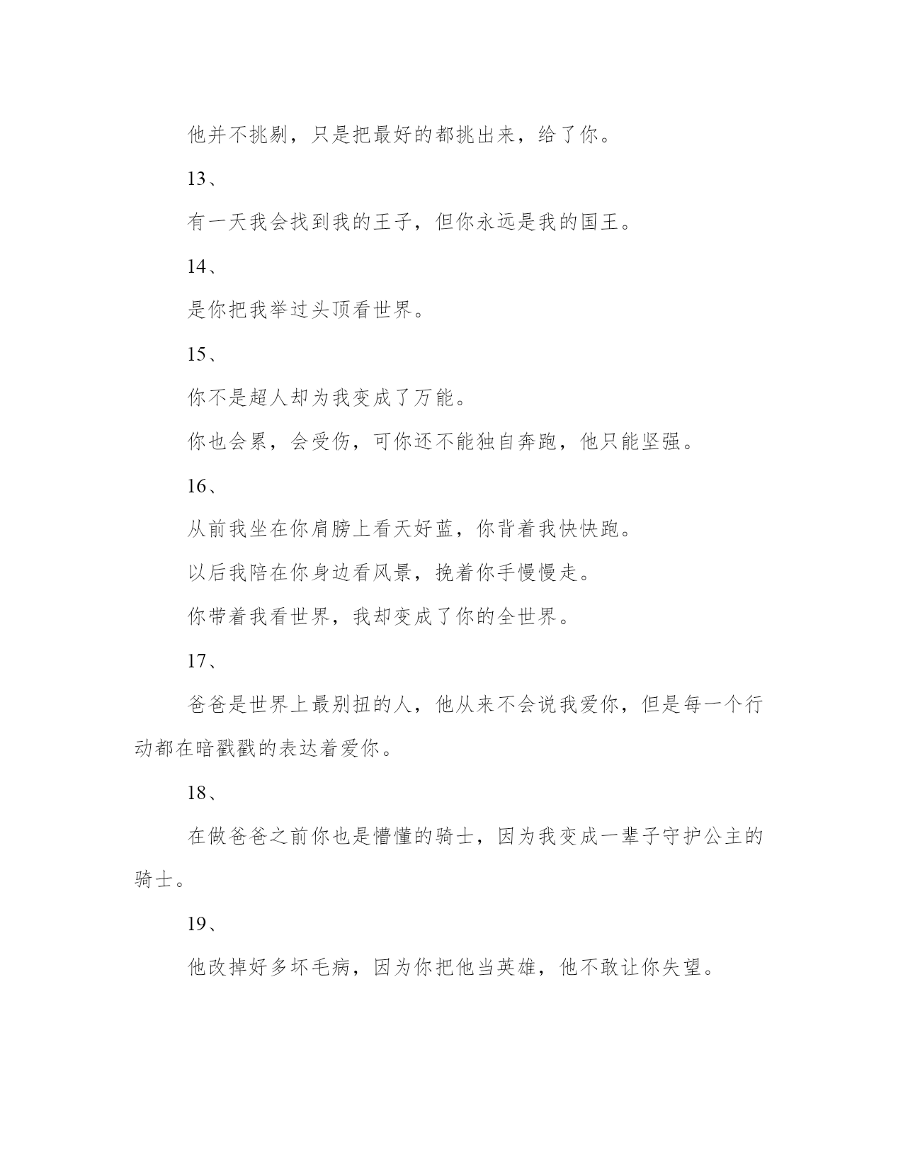 生日感恩父母的文案(模板14篇)人的记忆力会随着岁月的流逝而衰退,写作可以弥补记忆的不足,将曾经的人生经历和感悟记录下来,也便于保存一份美好的回忆。相信许多人会觉得范文很难写?接下来小编就给大家介绍一下优秀的范文该怎么写,我们一起来看一看吧。生日感恩父母的文案篇一1、生日快乐,星星是银河赠与月亮的情书,你是世界赠与我的恩赐。2、不过是又长大一岁的美女罢了。3、这是没有流星雨可以许愿的一天。半夏的文案馆。4、生日是谁,他快不快乐有什么要紧的,最重要的是,我希望你是快乐的。5、寿星许愿,多吃不胖,积极向上,热枕善良,健康快乐。6、没有零食的生日祝福,没有煽情的语录,感恩都是馈赠和快乐,祝自己生日快乐。半夏的文案馆。7、所有励志的鸡汤都不如一顿美餐,愉快祝我自己生日快乐。8、猝不及防的十字开头,一路跌跌撞撞,成长不期而遇,感恩父母赐予生命,没有煽情的语录,感恩都是馈赠和快乐,祝自己生日快乐。9、时间是让人猝不及防的东西,又长大一岁愿往后的生命里多点小幸运,愿我所爱之人一切安好,祝自己生日快乐。10、一年又一年的生日,无鸡汤无语录,今天停下来祝自己生日快乐,愿以后的生活能多带点快乐。半夏的文案馆。(本文部分素材来源于网络,如有侵权请联系生日感恩父母的文案篇二一段优美精致的文字,一张精美的心情日签,和你一起与世界交流。你好,我是文案充电宝pro。1、只想在今天拼一下爹,让你们看看我家帅气的大爷,愿时光善待他!2、你是这世上唯一认为,所有男人都配不上我的男人!3、从来不许我骄傲,却从不掩饰我是你的骄傲。4、要永远做我不老的超级英雄,全世界最好的爸爸!5、我强大,这随你。6、除了怀胎十月,你做的不比妈妈少。7、我的老爸,没有人会比你更胜任这份工作!8、你包容我的坏脾气,我也不介意你大大的啤酒肚。能接收我眼泪的地方,只有无人的街道和你的怀抱。9、爸爸存在的理由是支持保护我,去做有趣而不必有用的事情。爸爸存在的理由,是陪我看蜗牛,告诉我,人生的路,要慢慢走。爸爸存在的理由,是教我人生道理,再让我们教他,孩童之心。10、老爸们都很酷,不喜欢把爱挂在嘴边,但时间会把一切都说出来。谢谢你给我的爱,让我从未羡慕过任何人。11、人生中的第一辆车是爸爸的肩膀。12、他并不挑剔,只是把最好的都挑出来,给了你。13、有一天我会找到我的王子,但你永远是我的国王。14、是你把我举过头顶看世界。15、你不是超人却为我变成了万能。你也会累,会受伤,可你还不能独自奔跑,他只能坚强。16、从前我坐在你肩膀上看天好蓝,你背着我快快跑。以后我陪在你身边看风景,挽着你手慢慢走。你带着我看世界,我却变成了你的全世界。17、爸爸是世界上最别扭的人,他从来不会说我爱你,但是每一个行动都在暗戳戳的表达着爱你。18、在做爸爸之前你也是懵懂的骑士,因为我变成一辈子守护公主的骑士。19、他改掉好多坏毛病,因为你把他当英雄,他不敢让你失望。小时候,你是最高的山峰,是我的巨人。长大了,我是你的依靠。他总说挺好,可有一天,他再也无法把你举过头顶。20、全世界在催着我长大,你却心疼我小小翅膀。教我们挺胸的人,为我们弯腰的人。我的父亲很平凡,什么都给不了我,却又什么都给了我。我在努力长大,请你慢慢变老。老爸,现在换我,做你的靠山!21、战胜不了的时光,就一起走下去吧!22、如果这世上没有超人,那么是谁,曾用双手托举我飞翔?如果这世上没有闪电侠,那么是谁,总在需要时出现我身旁?如果这世上没有蝙蝠侠。那么是谁,每个黑夜引领我前行?23、谁说岁月无情?在我有生以来的漫长岁月里,全都是,你的温情。24、小时候嫌老爸的话多余,长大后格外珍惜每一句。25、在他老去之前,真真正正地成为他的骄傲吧。26、和爸爸吵架的时候,摸摸自己肚子的肉,那是爸爸在外面赚钱养的。27、用我毕生殷勤换你有梦可枕眠。28、太阳公公别晒我了来把我爸爸的头发晒黑吧。29、你是优秀但不善表达的父亲,而我只继承了你的不善表达。30、以前你的背影一点也不像山,后来发福了,就像了。31、再次申明,每次妈妈抱怨你的时候,我从没附和。32、开始看你喜欢的戏剧、评书、喝你爱喝的酒,感觉又多懂你一点。33、即使你偷偷染了发,可你还是老了。34、说了那么多冲撞你的话,你怎么-句都没还回来。35、你遮过风、挡过雨,也对我发过脾气,以后我为你遮风挡雨,尽量不对你发脾气。36、你是这世上唯一-认为,所有男人都配不上我的男人。37、你以前也是个叛逆的二小子,怎么一做父亲,就变得这么靠谱了。38、你的世界和我的世界没有交集,只要我在你身边