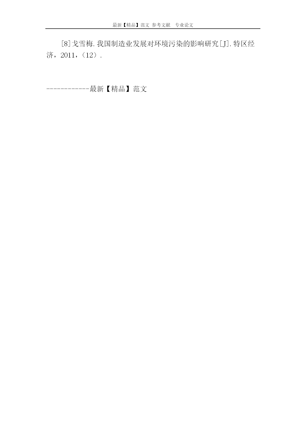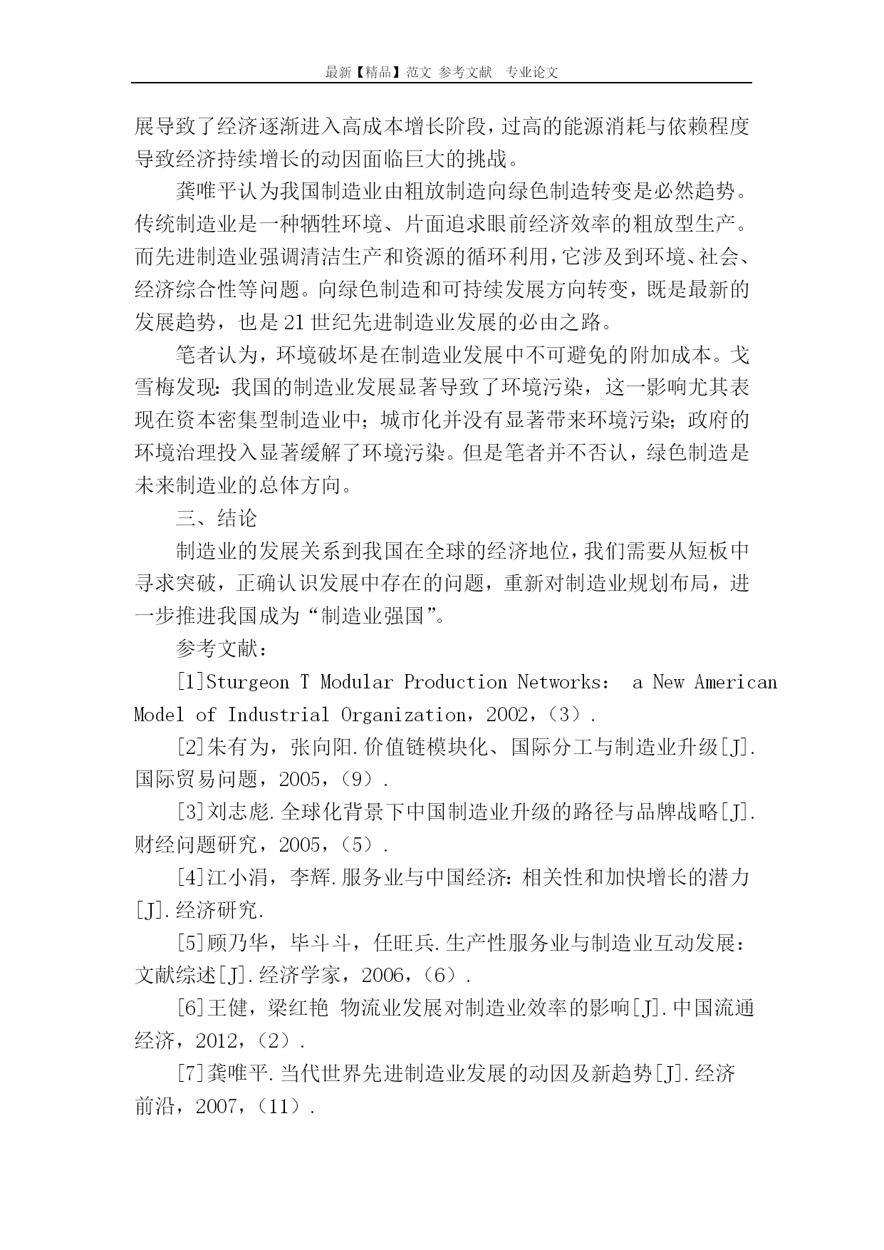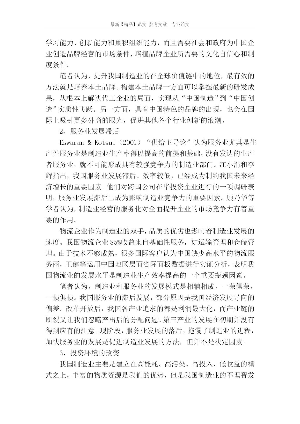 最新【精品】范文参考文献专业论文关于我国制造业发展中的短板问题的文献综述关于我国制造业发展中的短板问题的文献综述[摘要]首先系统地梳理了目前国内外对制造业发展的若干决定因素的理论研究,在综述的过程中,给出了适当的述评,并提出了未来可能的研究方向。[关键词]创新服务业价值链物流自上世纪80年代改革开放以来,中国凭借低廉的劳动力和广阔的潜在消费市场,成为了“制造业的大国”,“MadeInChina”这个标示闻名全球。一、背景分析我国制造业一直处于以加工业为主要模式的状态,金融危机后,许多企业都纷纷倒闭,归根到底是由于技术水平差,产品质量低劣,缺乏竞争力造成没有后续的订单,资金链断裂,迫使企业宣布破产。尤其近两年,制造业回流让我们不得不面对如何发展制造业的问题。二、我国制造业短板问题分析1、在全球价值链中的地位落后中国制造业在全球价值链分工中处于低端环节,没有掌握核心价值模块,在核心技术和部件上受制于国际品牌制造商和全球供应商。20世纪80年代末,“价值链模块化”的出现不仅加速了国际制造业分工格局的调整,还带动了发展中国家制造业的快速发展。Sturgeon认为:“价值链模块化”已经开始成为某些产业的新型组织结构特征。所谓价值链模块化,即某一行业一体化的价值链结构逐渐裂变成若干独立的价值节点,通过各价值节点的横向集中、整合以及功能的增强,形成了多个相对独立运营的价值模块制造者以及若干模块规则设计与集成者的产业动态分化、整合过程。朱有为、张向阳认为我国制造业应鼓励和推动本土大型制造企业在核心价值模块上加大研发力度,提高吸引外资的质量,扩大企业规模,积极参与国际制造业相关技术标准的制定,为我国制造业的发展争取更多的利益。刘志彪认为制造业的发展,不仅需要企业不断提高学习能力、创新能力和累积组织能力,而且需要社会和政府为中国企业创造品牌经营的市场条件,培植品牌企业所需要的文化自信心和制度条件。笔者认为,提升我国制造业的在全球价值链中的地位,最有效的方法就是培养本土品牌。构建本土品牌一方面可以掌握最新的研发成果,从根本上解决代工企业的局面,实现从“中国制造”到“中国创造”实质性飞跃。另一方面,具有中国特色的品牌的出现,也会在国际上吸引更多外商的眼光,促进其他各个行业创新的浪潮。2、服务业发展滞后Eswaran&Kotwal(2001)“供给主导论”认为服务业尤其是生产性服务业是制造业生产率得以提高的前提和基础,没有发达的生产者服务业,就不可能形成具有较强竞争力的制造业部门。江小涓和李辉指出,我国服务业发展滞后、效率较低,已经成为制约我国未来经济增长的重要因素。他们对跨国公司在华投资企业进行的一项调研表明,服务业发展滞后已成为影响制造业竞争力的重要因素。顾乃华等学者认为,制造业经营的服务化对全面提升企业的市场竞争力有着重要的作用。物流企业作为制造业的双手,品质的优劣也影响着制造业发展的速度。我国物流企业85%收益来自基础性服务,如运输管理和仓储管理。由于技术不够成熟,很多国际客户认为中国缺少高水平的物流服务商,王健等运用中国地区层面省际面板数据进行实证分析,表明我国物流业的发展水平是制造业生产效率提高的一个重要瓶颈因素。笔者认为,制造业和服务业的发展模式是相辅相成,一荣俱荣,一损俱损。我国服务业的滞后发展,部分原因是我国经济发展导向的偏差。改革开放后,我国各产业追求的都是利润最大化,而产业链的断裂又让我们忽略产出后的分配问题。第三产业的发展在初期并没有得到应有的注意。现阶段,服务业发展的落后,拖慢了制造业的进程,加快服务业的发展是促进制造业发展的方法,但并不是决定因素。3、投资环境的改变我国制造业主要是建立在高能耗、高污染、高投入、低收益的模式之上,丰富的物质资源是我们的优势,但是我国制造业的不理智发展导致了经济逐渐进入高成本增长阶段,过高的能源消耗与依赖程度导致经济持续增长的动因面临巨大的挑战。龚唯平认为我国制造业由粗放制造向绿色制造转变是必然趋势。传统制造业是一种牺牲环境、片面追求眼前经济效率的粗放型生产。而先进制造业强调清洁生产和资源的循环利用,它涉及到环境、社会、经济综合性等问题。向绿色制造和可持续发展方向转变,既是最新的发展趋势,也是2l世纪先进制造业发展的必由之路。笔者认为,环境破坏是在制造业发展中不可避免的附加成本。戈雪梅发现:我国的制造业发展显著导致了环境污染,这一影响尤其表现在资本密集型制造业中;城市化并没有显著带来环境污染;政府的环境治理投入显著缓解了环境污染。但是笔者并不否认,绿色制造是未来制造业的总体方向。三、结论制造业的发展关系到我国在全球的经济地位,我们需要从短板中寻求突破,正确认识发展中存在的问题,重新对制造业规划布局,进一步推进我国成为“制造业强国”。参考文献:[