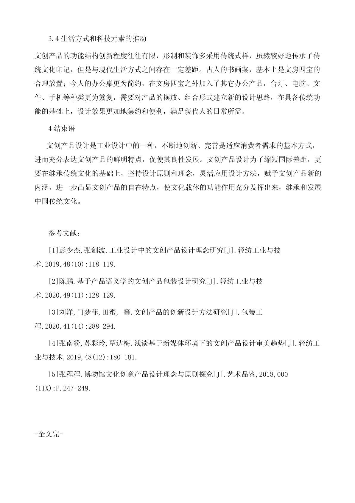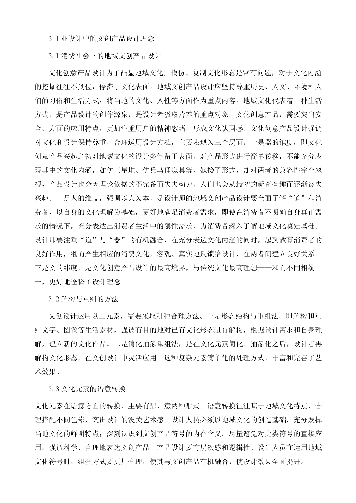工业设计中的文创产品设计理念研究摘要:现代化建设推动了工业设计的进步,而文创产品的有机融合,使其设计理念创新、优化,赋予传统文化新的内涵。文创产品近年来的发展良好,使传统文化得以传承,是文化创意产品在设计方面的新发展,也是传统文化元素应用的一种新形式。本文主要分析了工业设计中的文创产品现状、设计原则和设计理念,希望能够为后期工作提供借鉴。关键词:工业设计;文创产品;现状;设计原则;设计理念文创产品是工业设计的新领域,通过融合多种文化元素引发消费者共鸣,加深了消费者对文创产品内涵的理解,使传统文化得以传承,也丰富了文创产品的价值意义。文创产品一定程度上促进了地域文化的发展,是精神文明建设和设计理念创新的具体表现,推进了我国文化的新发展。1工业设计中的文创产品现状社会经济的推动下,我国逐渐实现了生产大国向生产强国的转变,为生产制造业优化结构、达到中国创造目标创造了有利条件。经济全球化下,文创产品的生产制造发展迅速,成为人们的一种需求,但是其中的制约因素往往会影响日常运行,暴露出来的问题和不足严重阻碍了文创产品设计的创新发展。文创产品在生产制造过程中融合了各种文化元素,给制造方案创造了一条新的设计思路,赋予文创产品新的特点。文创产品的设计疲软,是制约其发展活力的重要因素,只有不断地创新、完善设计思路,才能给文创产品带来发展活力,进一步优化工业设计。2工业设计中文创产品设计原则文创产品设计要坚持创新原则,不断地优化和改良设计方案。其中,地域性文创产品设计要以艺术创新为基础,注重文创产品在文化艺术、情感认同、实用性等方面的强化,使产品设计的艺术效果更富新意。实用性,强调文创产品具有更高的应用效果,与消费者的客观需求相适应,是产品设计需要秉持的基本原则。文创产品设计要对消费者类型全面了解,准确分析出文创产品所要体现的具体内容,年龄、文化水平上的差异性都能够有一定的适应性;产品设计要注重与传统文化的有机融合,通过文创产品了解到地域文化中的不同特点,丰富文创产品的文化内涵,增大整体价值。艺术性,强调文创产品对消费者的吸引力,设计师利用地域文化和符号元素来增大文创产品的价值意义,赢得更多人的欢迎和关注,适应消费者审美需求方面的差异性。3工业设计中的文创产品设计理念3.1消费社会下的地域文创产品设计文化创意产品设计为了凸显地域文化,模仿、复制文化形态是常有问题,对于文化内涵的挖掘往往不到位,停滞于文化表面。地域文创产品设计应坚持尊重历史、人文、环境和人们的习俗和生活方式,将当地的文化、人性等方面作为重点内容。地域文化代表着一种生活方式,是产品设计的创作源泉,是设计者汲取营养的重点对象。文化创意产品,需要突出安全、方面的应用特点,更加注重用户的精神慰藉,形成文化认同感。文化创意产品设计强调对文化和设计保持尊重,合理运用设计方法,主要表现为三个层面。一是器的维度,即文化创意产品兴起之初对地域文化的设计多停留于表面,对产品形式进行简单转移,不能充分表现其中的文化内涵,如仿三星堆、仿兵马俑家具等,嫁接了形式,却对两者的兼容性完全忽视,产品设计也会因理论依据的不完备而失去动力。人们也会从最初的新奇有趣而逐渐丧失兴趣。二是人的维度,强调以人为本,是设计师的地域文创产品设计要全面了解“道”和消费者,以自身的文化理解为基础,更好地满足消费者需求,即使在消费者不明确自身真正需求的情况下,充分表达出消费者生活中的隐性需求,为消费者深入了解地域文化奠定基础。设计师要注重“道”与“器”的有机融合,在充分表达文化内涵的同时,起到教育消费者的良好作用,继而产生相应的消费文化,客观、真实地反馈给设计,在两者间建立良好关系。三是文的纬度,是文化创意产品设计的最高境界,与传统文化最高理想——和而不同相统一,更好地诠释了设计理念。3.2解构与重组的方法文创设计运用以上元素,需要采取耕种合理方法。一是形态结构与重组法,即解构和重组文字、图像等生活素材,强调有目的地对已有文化形态进行解构,根据设计需求和自身理解,建立新的文化作品。二是简化抽象重组法,是在文化元素简化、抽象化之后,设计者再解构文化形态,在文创设计中灵活应用。这种复杂元素简单化的处理方式,丰富和完善了艺术效果。3.3文化元素的语意转换文化元素在语意方面的转换,主要有形、意两种形式。语意转换往往基于地域文化特点,合理搭配不同色彩,突出设计的没关艺术感。设计人员必须以地域文化的创造基础,充分发挥当地文化的鲜明特点;深刻认识到文创产品符号的内在含义,尽量避免对此类符号的直接应用;强调科学、合理地表达