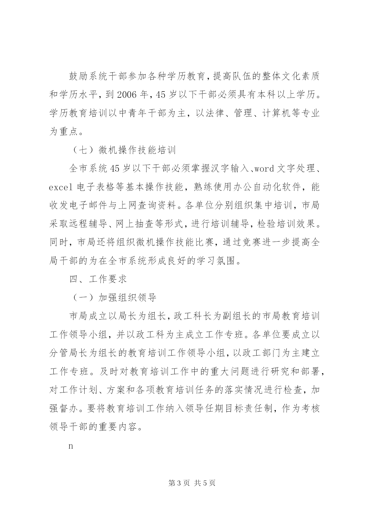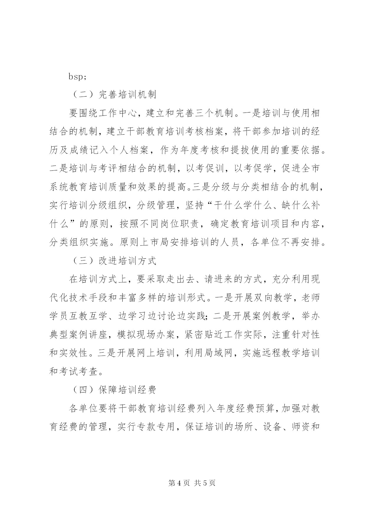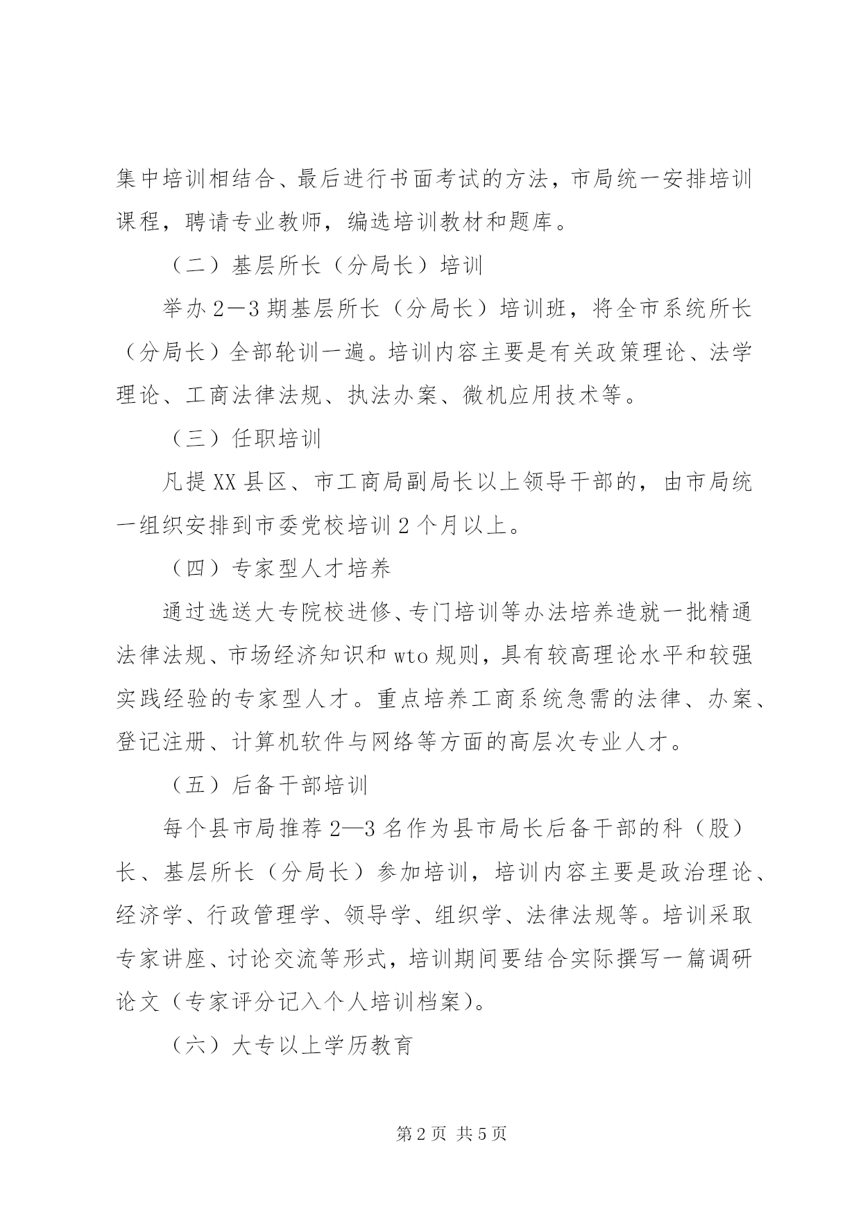第PAGE\*Arabic\*MERGEFORMAT5页共NUMPAGES\*MERGEFORMAT5页市工商局教育培训方案为了进一步加强全市系统干部教育培训工作,全面提高干部队伍整体素质,为新时期工商行政管理改革和发展提供人才支持,根据《省工商行政管理系统干部教育培训五年规划》的要求,范文先生网结合实际制定本方案。一、指导思想全市系统干部教育培训工作以“三个代表”重要思想为指导,坚持理论联系实际,按需施教,学以致用,注重质量和实效的原则,全面提高干部队伍整体素质。二、总体目标着力培养和提高全市系统干部履行岗位职责、依法行政和维护市场秩序的能力,努力造就一支适应新时期工商行政管理改革和发展需要的高素质专业化的干部队伍。三、培训内容和工作要点(一)法律法规培训培训对象以一线执法人员为主,重点是注册登记审批、日常巡查监管和经检办案人员。培训内容为企业登记管理、市场监督管理、公平交易管理、广告监督管理、商标注册管理、个体私营经济管理以及执法行为规范等方面的法律法规,重点是《公司法》、《商标法》、《广告法》、《反不正当竞争法》、《消费者权益保护法》、《合同法》等6部基本法律。培训形式采取个人自学和集中培训相结合、最后进行书面考试的方法,市局统一安排培训课程,聘请专业教师,编选培训教材和题库。(二)基层所长(分局长)培训举办2-3期基层所长(分局长)培训班,将全市系统所长(分局长)全部轮训一遍。培训内容主要是有关政策理论、法学理论、工商法律法规、执法办案、微机应用技术等。(三)任职培训凡提XX县区、市工商局副局长以上领导干部的,由市局统一组织安排到市委党校培训2个月以上。(四)专家型人才培养通过选送大专院校进修、专门培训等办法培养造就一批精通法律法规、市场经济知识和wto规则,具有较高理论水平和较强实践经验的专家型人才。重点培养工商系统急需的法律、办案、登记注册、计算机软件与网络等方面的高层次专业人才。(五)后备干部培训每个县市局推荐2—3名作为县市局长后备干部的科(股)长、基层所长(分局长)参加培训,培训内容主要是政治理论、经济学、行政管理学、领导学、组织学、法律法规等。培训采取专家讲座、讨论交流等形式,培训期间要结合实际撰写一篇调研论文(专家评分记入个人培训档案)。(六)大专以上学历教育鼓励系统干部参加各种学历教育,提高队伍的整体文化素质和学历水平,到2006年,45岁以下干部必须具有本科以上学历。学历教育培训以中青年干部为主,以法律、管理、计算机等专业为重点。(七)微机操作技能培训全市系统45岁以下干部必须掌握汉字输入、word文字处理、excel电子表格等基本操作技能,熟练使用办公自动化软件,能收发电子邮件与上网查询资料。各单位分别组织集中培训,市局采取远程辅导、网上抽查等形式,进行培训辅导,检验培训效果。同时,市局还将组织微机操作技能比赛,通过竞赛进一步提高全局干部的为在全市系统形成良好的学习氛围。四、工作要求(一)加强组织领导市局成立以局长为组长,政工科长为副组长的市局教育培训工作领导小组,并以政工科为主成立工作专班。各单位要成立以分管局长为组长的教育培训工作领导小组,以政工部门为主建立工作专班。及时对教育培训工作中的重大问题进行研究和部署,对工作计划、方案和各项教育培训任务的落实情况进行检查,加强督办。要将教育培训工作纳入领导任期目标责任制,作为考核领导干部的重要内容。nbsp;(二)完善培训机制要围绕工作中心,建立和完善三个机制。一是培训与使用相结合的机制,建立干部教育培训考核档案,将干部参加培训的经历及成绩记入个人档案,作为年度考核和提拔使用的重要依据。二是培训与考评相结合的机制,以考促训,以考促学,促进全市系统教育培训质量和效果的提高。三是分级与分类相结合的机制,实行培训分级组织,分级管理,坚持“干什么学什么、缺什么补什么”的原则,按照不同岗位职责,确定教育培训项目和内容,分类组织实施。原则上市局安排培训的人员,各单位不再安排。(三)改进培训方式在培训方式上,要采取走出去、请进来的方式,充分利用现代化技术手段和丰富多样的培训形式。一是开展双向教学,老师学员互教互学、边学习边讨论边实践;二是开展案例教学,举办典型案例讲座,模拟现场办案,紧密贴近工作实际,注重针对性和实效性。三是开展网上培训,利用局域网,实施远程教学培训和考试考查。(四)保障培训经费各单位要将干部教育培训经费列入年度经费预算,加强对教育经费的管理,实行专款专用,保证培训的场所、设备、师资和时间。同时要厉行节约,降低成本,提高效率。