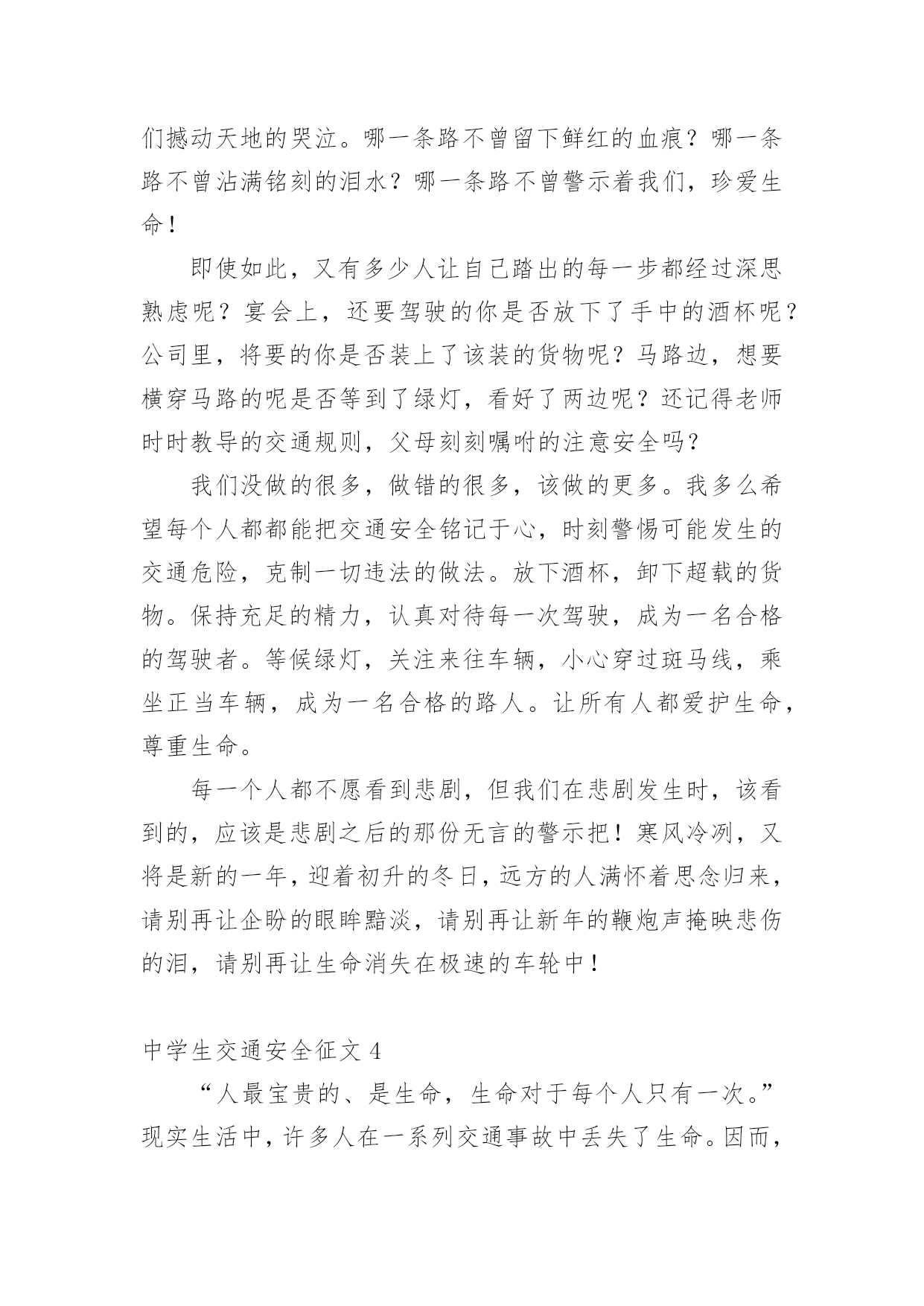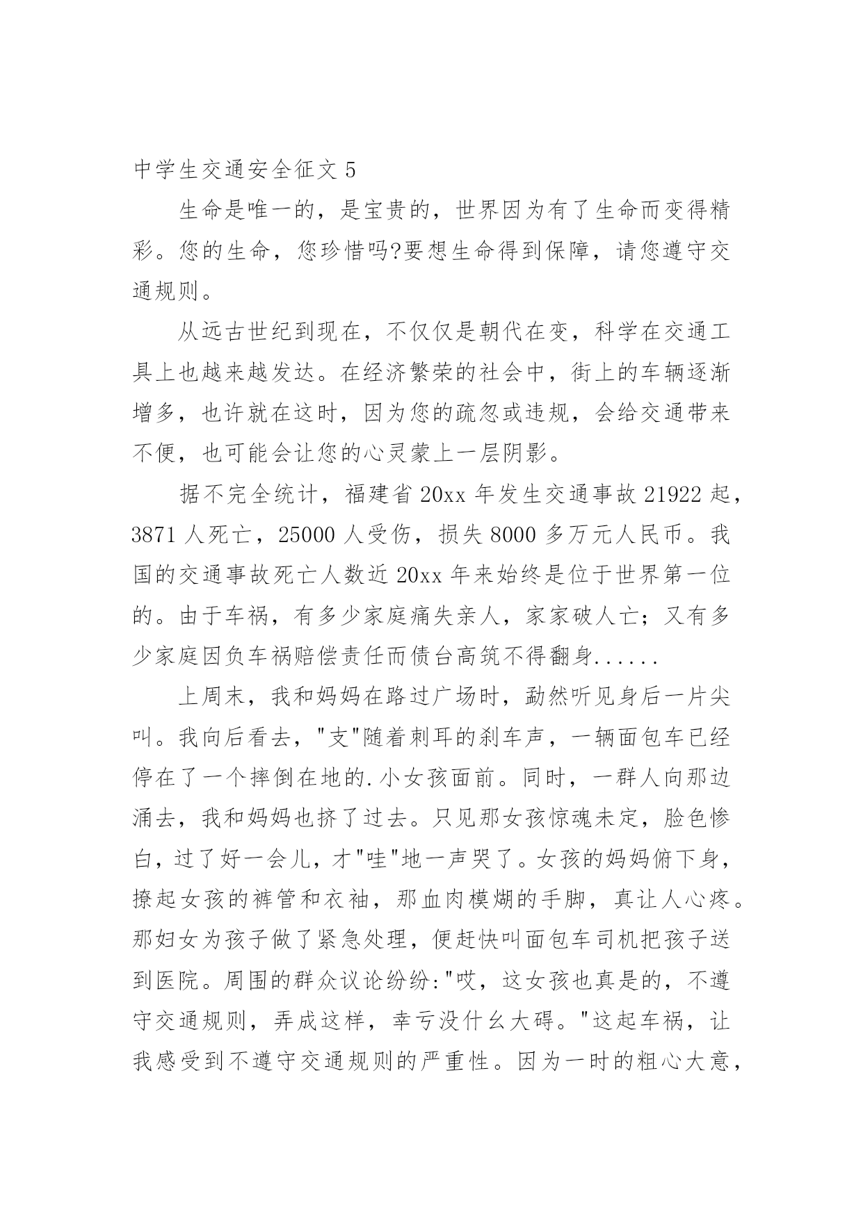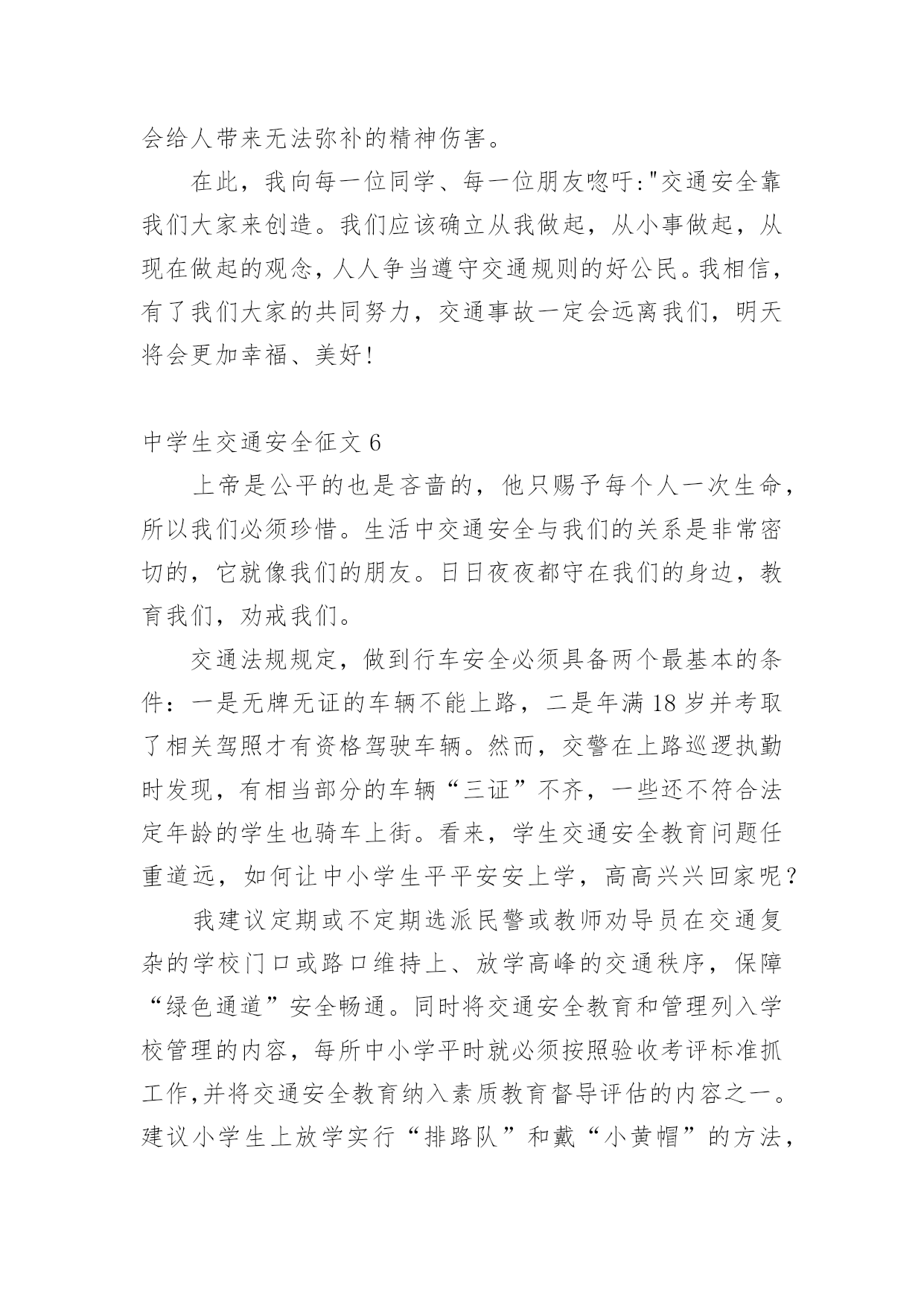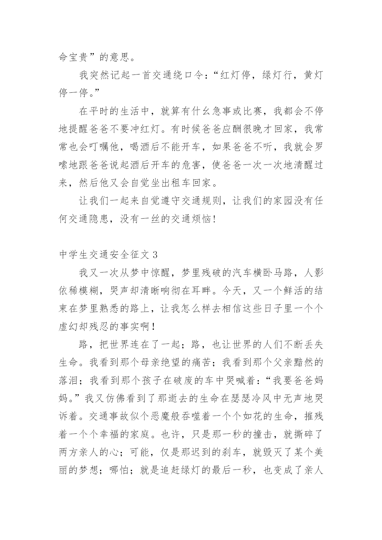 中学生交通安全征文中学生交通安全征文6篇无论是在学校还是在社会中,许多人都写过征文吧,好的征文一般具有句段文采飞扬的特点。写起征文来就毫无头绪?以下是小编为大家收集的中学生交通安全征文,希望对大家有所帮助。中学生交通安全征文1交通安全无人不知,无人不晓。但就是这样家喻户晓的法则,许多人还不以为是,甚而一次又一次触犯法律。震惊全国的6。30张明宝案,牵动了多少人的心!五死四伤的惨案,谁来负责?谁来承担?“张明宝!”!不!是我们大家!如果不是我们大家拼命饮酒,酿成一次又一次酒后驾驶惨祸;如果不是我们大家拼命说“多喝点不要紧!”……会发生这起交通严重醉酒驾驶事故吗?所以,我们每个人都要为这九条生命加张明宝这条生命负责!据统计,全球大约每年有127万人死于交通事故,难道这还不够吗?我们一定要携手共创交通安全!交通安全很简单,不喝酒,不闯红灯,不接听手机,不说话,注意力集中……这些都是很普通的小事,只需动动手就可做到,更能避免殃及人命无数的交通事故!不喝酒:开车前不喝酒,拒绝酒后驾驶,让“酒”远离人心。不闯红灯:经常有许多人闯红灯,也经常会发生交通事故这种交通矛盾总会在人们的侥幸中得以生存,不要因为闯红灯车子没撞到自己而一而再,再而叁。全家督促:全家监督好每一位家庭成员,如果要开车决不能喝酒,哪怕骑自行车也一样,到亲戚家也只能谢绝……交通安全,小事为多,只怕不做。来吧,交通安全从我做起——你也行!中学生交通安全征文2交通安全常常被人们忽略,其实交通安全就在我们的身边。尤其是针对那些不遵守交通规则的人。那是一个阴晴天,我和妈妈在大街上走着。路上几个骑自行车的初中生进入了我和妈妈的视线。我看见他们叁五成群地围在一起,看起来很开心似的。他们一边骑自行车,一边顾着聊天。他们骑到一个十字路口,不遵守交通规则,还当红绿灯是个杂物,不管你红灯还是绿灯也照样冲,这种冲红灯的行为为他们增添了几分安全隐患。我和妈妈没走多远,我一回头,果然不出我所料,在那个路口,一辆小汽车行驶过来,向初中生冲过来。撞垮了一辆自行车。我听见几个初中生尖叫起来,其中一个初中生受了伤。这一个事例怎能不让他们受到了教训呢?还有一次,我正坐着爸爸的小轿车上学。我看见一位叔叔为了自己孩子的上学,就冲红灯,超车,横冲直撞。虽然这位叔叔没有遇上什幺交通事故,但我也深深的领悟到“生命宝贵”的意思。我突然记起一首交通绕口令:“红灯停,绿灯行,黄灯停一停。”在平时的生活中,就算有什幺急事或比赛,我都会不停地提醒爸爸不要冲红灯。有时候爸爸应酬很晚才回家,我常常也会叮嘱他,喝酒后不能开车,如果爸爸不听,我就会罗嗦地跟爸爸说起酒后开车的危害,使爸爸一次一次地清醒过来,然后他又会自觉坐出租车回家。让我们一起来自觉遵守交通规则,让我们的家园没有任何交通隐患,没有一丝的交通烦恼!中学生交通安全征文3我又一次从梦中惊醒,梦里残破的汽车横卧马路,人影依稀模糊,哭声却清晰响彻在耳畔。今天,又一个鲜活的结束在梦里熟悉的路上,让我怎么样去相信这些日子里一个个虚幻却残忍的事实啊!路,把世界连在了一起;路,也让世界的人们不断丢失生命。我看到那个母亲绝望的痛苦;我看到那个父亲黯然的落泪;我看到那个孩子在破废的车中哭喊着:“我要爸爸妈妈。”我又仿佛看到了那逝去的生命在瑟瑟冷风中无声地哭诉着。交通事故似个恶魔般吞噬着一个个如花的生命,摧残着一个个幸福的家庭。也许,只是那一秒的撞击,就撕碎了两方亲人的心;可能,仅是那迟到的刹车,就毁灭了某个美丽的梦想;哪怕;就是追赶绿灯的最后一秒,也变成了亲人们撼动天地的哭泣。哪一条路不曾留下鲜红的血痕?哪一条路不曾沾满铭刻的泪水?哪一条路不曾警示着我们,珍爱生命!即使如此,又有多少人让自己踏出的每一步都经过深思熟虑呢?宴会上,还要驾驶的你是否放下了手中的酒杯呢?公司里,将要的你是否装上了该装的货物呢?马路边,想要横穿马路的呢是否等到了绿灯,看好了两边呢?还记得老师时时教导的交通规则,父母刻刻嘱咐的注意安全吗?我们没做的很多,做错的很多,该做的更多。我多么希望每个人都都能把交通安全铭记于心,时刻警惕可能发生的交通危险,克制一切违法的做法。放下酒杯,卸下超载的货物。保持充足的精力,认真对待每一次驾驶,成为一名合格的驾驶者。等候绿灯,关注来往车辆,小心穿过斑马线,乘坐正当车辆,成为一名合格的路人。让所有人都爱护生命,尊重生命。每一个人都不愿看到悲剧,但我们在悲剧发生时,该看到的,应该是悲剧之后的那份无言的警示把!寒风冷冽,又将是新的一年,迎着初升的冬日,远方的人满怀着思念归来,请别再让企盼的眼眸黯淡,请别再让新年的鞭炮声掩映悲伤的泪,请别再让生命消失在极速的车轮中!中学生交通安全征文4“人最宝贵的、是生命,生命对于每个人只有一次。”现实生活中,许多人在一系列交通事故中丢失了生命。因而,遵守交通法