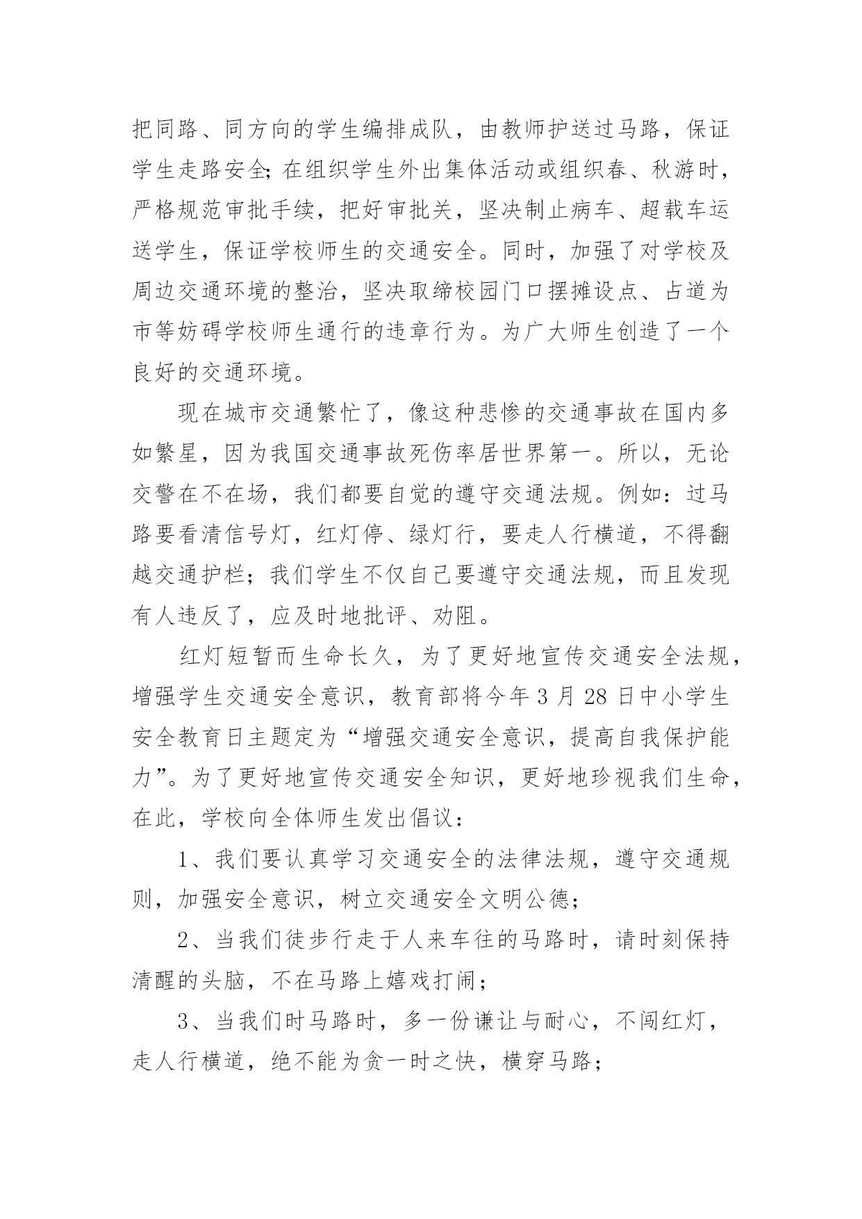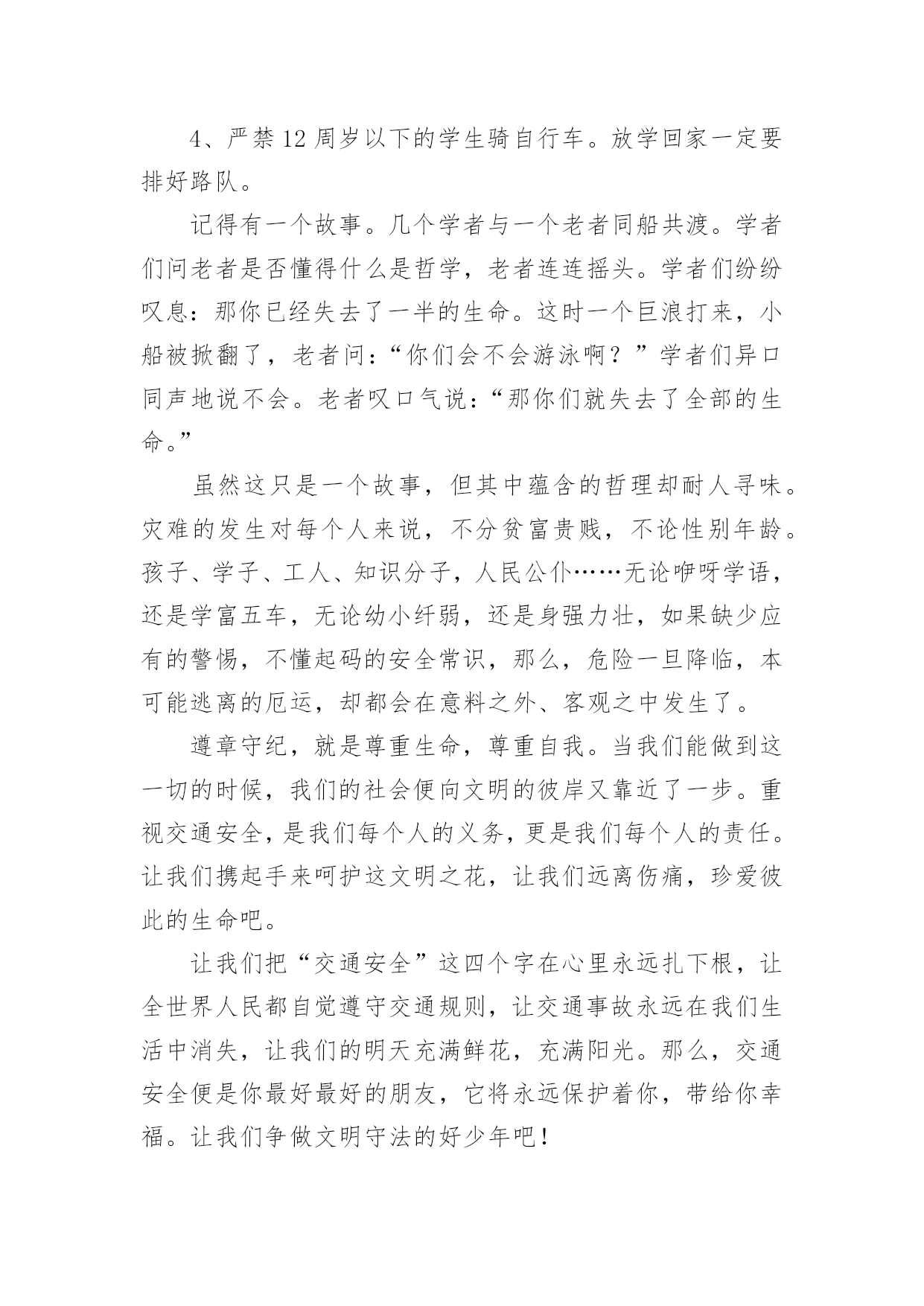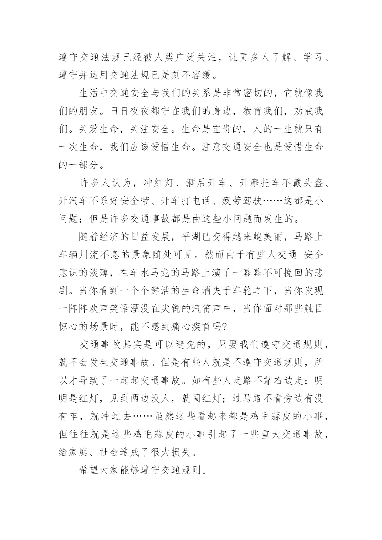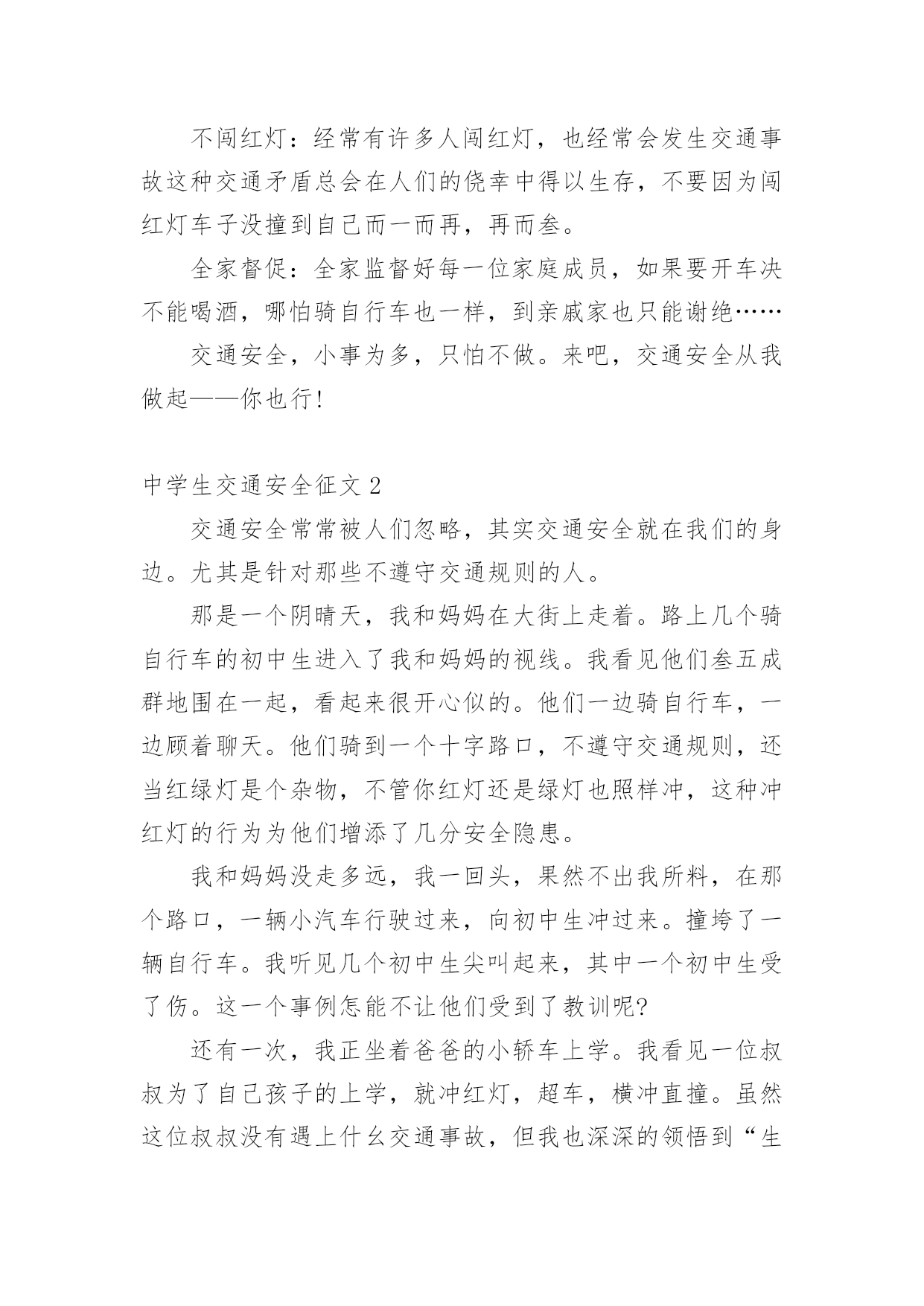 中学生交通安全征文中学生交通安全征文6篇无论是在学校还是在社会中,许多人都写过征文吧,好的征文一般具有句段文采飞扬的特点。写起征文来就毫无头绪?以下是小编为大家收集的中学生交通安全征文,希望对大家有所帮助。中学生交通安全征文1交通安全无人不知,无人不晓。但就是这样家喻户晓的法则,许多人还不以为是,甚而一次又一次触犯法律。震惊全国的6。30张明宝案,牵动了多少人的心!五死四伤的惨案,谁来负责?谁来承担?“张明宝!”!不!是我们大家!如果不是我们大家拼命饮酒,酿成一次又一次酒后驾驶惨祸;如果不是我们大家拼命说“多喝点不要紧!”……会发生这起交通严重醉酒驾驶事故吗?所以,我们每个人都要为这九条生命加张明宝这条生命负责!据统计,全球大约每年有127万人死于交通事故,难道这还不够吗?我们一定要携手共创交通安全!交通安全很简单,不喝酒,不闯红灯,不接听手机,不说话,注意力集中……这些都是很普通的小事,只需动动手就可做到,更能避免殃及人命无数的交通事故!不喝酒:开车前不喝酒,拒绝酒后驾驶,让“酒”远离人心。不闯红灯:经常有许多人闯红灯,也经常会发生交通事故这种交通矛盾总会在人们的侥幸中得以生存,不要因为闯红灯车子没撞到自己而一而再,再而叁。全家督促:全家监督好每一位家庭成员,如果要开车决不能喝酒,哪怕骑自行车也一样,到亲戚家也只能谢绝……交通安全,小事为多,只怕不做。来吧,交通安全从我做起——你也行!中学生交通安全征文2交通安全常常被人们忽略,其实交通安全就在我们的身边。尤其是针对那些不遵守交通规则的人。那是一个阴晴天,我和妈妈在大街上走着。路上几个骑自行车的初中生进入了我和妈妈的视线。我看见他们叁五成群地围在一起,看起来很开心似的。他们一边骑自行车,一边顾着聊天。他们骑到一个十字路口,不遵守交通规则,还当红绿灯是个杂物,不管你红灯还是绿灯也照样冲,这种冲红灯的行为为他们增添了几分安全隐患。我和妈妈没走多远,我一回头,果然不出我所料,在那个路口,一辆小汽车行驶过来,向初中生冲过来。撞垮了一辆自行车。我听见几个初中生尖叫起来,其中一个初中生受了伤。这一个事例怎能不让他们受到了教训呢?还有一次,我正坐着爸爸的小轿车上学。我看见一位叔叔为了自己孩子的上学,就冲红灯,超车,横冲直撞。虽然这位叔叔没有遇上什幺交通事故,但我也深深的领悟到“生命宝贵”的意思。我突然记起一首交通绕口令:“红灯停,绿灯行,黄灯停一停。”在平时的生活中,就算有什幺急事或比赛,我都会不停地提醒爸爸不要冲红灯。有时候爸爸应酬很晚才回家,我常常也会叮嘱他,喝酒后不能开车,如果爸爸不听,我就会罗嗦地跟爸爸说起酒后开车的危害,使爸爸一次一次地清醒过来,然后他又会自觉坐出租车回家。让我们一起来自觉遵守交通规则,让我们的家园没有任何交通隐患,没有一丝的交通烦恼!中学生交通安全征文3我又一次从梦中惊醒,梦里残破的汽车横卧马路,人影依稀模糊,哭声却清晰响彻在耳畔。今天,又一个鲜活的结束在梦里熟悉的路上,让我怎么样去相信这些日子里一个个虚幻却残忍的事实啊!路,把世界连在了一起;路,也让世界的人们不断丢失生命。我看到那个母亲绝望的痛苦;我看到那个父亲黯然的落泪;我看到那个孩子在破废的车中哭喊着:“我要爸爸妈妈。”我又仿佛看到了那逝去的生命在瑟瑟冷风中无声地哭诉着。交通事故似个恶魔般吞噬着一个个如花的生命,摧残着一个个幸福的家庭。也许,只是那一秒的撞击,就撕碎了两方亲人的心;可能,仅是那迟到的刹车,就毁灭了某个美丽的梦想;哪怕;就是追赶绿灯的最后一秒,也变成了亲人们撼动天地的哭泣。哪一条路不曾留下鲜红的血痕?哪一条路不曾沾满铭刻的泪水?哪一条路不曾警示着我们,珍爱生命!即使如此,又有多少人让自己踏出的每一步都经过深思熟虑呢?宴会上,还要驾驶的你是否放下了手中的酒杯呢?公司里,将要的你是否装上了该装的货物呢?马路边,想要横穿马路的呢是否等到了绿灯,看好了两边呢?还记得老师时时教导的交通规则,父母刻刻嘱咐的注意安全吗?我们没做的很多,做错的很多,该做的更多。我多么希望每个人都都能把交通安全铭记于心,时刻警惕可能发生的交通危险,克制一切违法的做法。放下酒杯,卸下超载的货物。保持充足的精力,认真对待每一次驾驶,成为一名合格的驾驶者。等候绿灯,关注来往车辆,小心穿过斑马线,乘坐正当车辆,成为一名合格的路人。让所有人都爱护生命,尊重生命。每一个人都不愿看到悲剧,但我们在悲剧发生时,该看到的,应该是悲剧之后的那份无言的警示把!寒风冷冽,又将是新的一年,迎着初升的冬日,远方的人满怀着思念归来,请别再让企盼的眼眸黯淡,请别再让新年的鞭炮声掩映悲伤的泪,请别再让生命消失在极速的车轮中!中学生交通安全征文4“人最宝贵的、是生命,生命对于每个人只有一次。”现实生活中,许多人在一系列交通事故中丢失了生命。因而,遵守交通法
