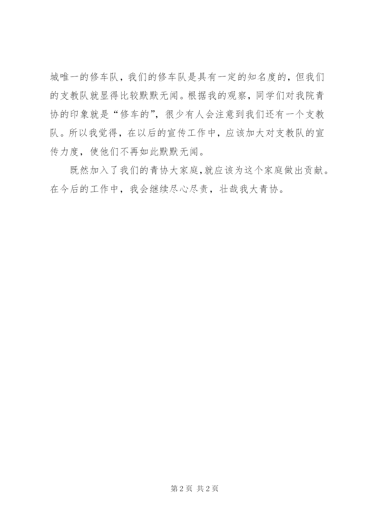 第PAGE\*Arabic\*MERGEFORMAT2页共NUMPAGES\*MERGEFORMAT2页青年协会志愿者公共形象宣传书经过一学期在青协的工作,我学到了很多,也收获了很多。在加入志愿者之前,我一直以为志愿者的工作很简单,就我院青协来说,只不过就是定期修一下自行车,定期到小学支教,仅此而已。但在加入之后我才知道,举办一次活动,并没有想象中的简单。在活动之前,需要提前做好策划,然后需要制作海报,qq、微博、微信等各个领域进行活动的前期宣传。活动之间,需要收集活动照片,发微博直播。活动之后,又要将活动整理成新闻稿发布。完整的举办一次活动,需要如此复杂的步骤,真是不简单啊。尽管步骤繁杂,但正是在这一步步之中,我学到了许多东西。活动宣传要吸引人眼球,照片要有代表性,新闻稿要简洁具体等,这些东西,不去经历过,是不会知道的。作为宣传组的组长,在一学期的工作之后,我也认识到了自己在宣传这方面的不足。公共微博平时很少发布消息,除了活动期间微博使用率比较高外,其他时间基本很少有动态。这样导致微博的听众较少,在活动时宣传效果较差。公共qq也存在和微博一样的问题,长时间无动态,导致宣传效果减弱。对于这些不足,我将在下学期进行改进,不负我大青协微博的“大v”之名。除了以上所讲的问题,我还觉得今后的宣传应该有所侧重,加大对我院支教队的宣传。作为“XX省百佳服务项目”和大学城唯一的修车队,我们的修车队是具有一定的知名度的,但我们的支教队就显得比较默默无闻。根据我的观察,同学们对我院青协的印象就是“修车的”,很少有人会注意到我们还有一个支教队。所以我觉得,在以后的宣传工作中,应该加大对支教队的宣传力度,使他们不再如此默默无闻。既然加入了我们的青协大家庭,就应该为这个家庭做出贡献。在今后的工作中,我会继续尽心尽责,壮哉我大青协。