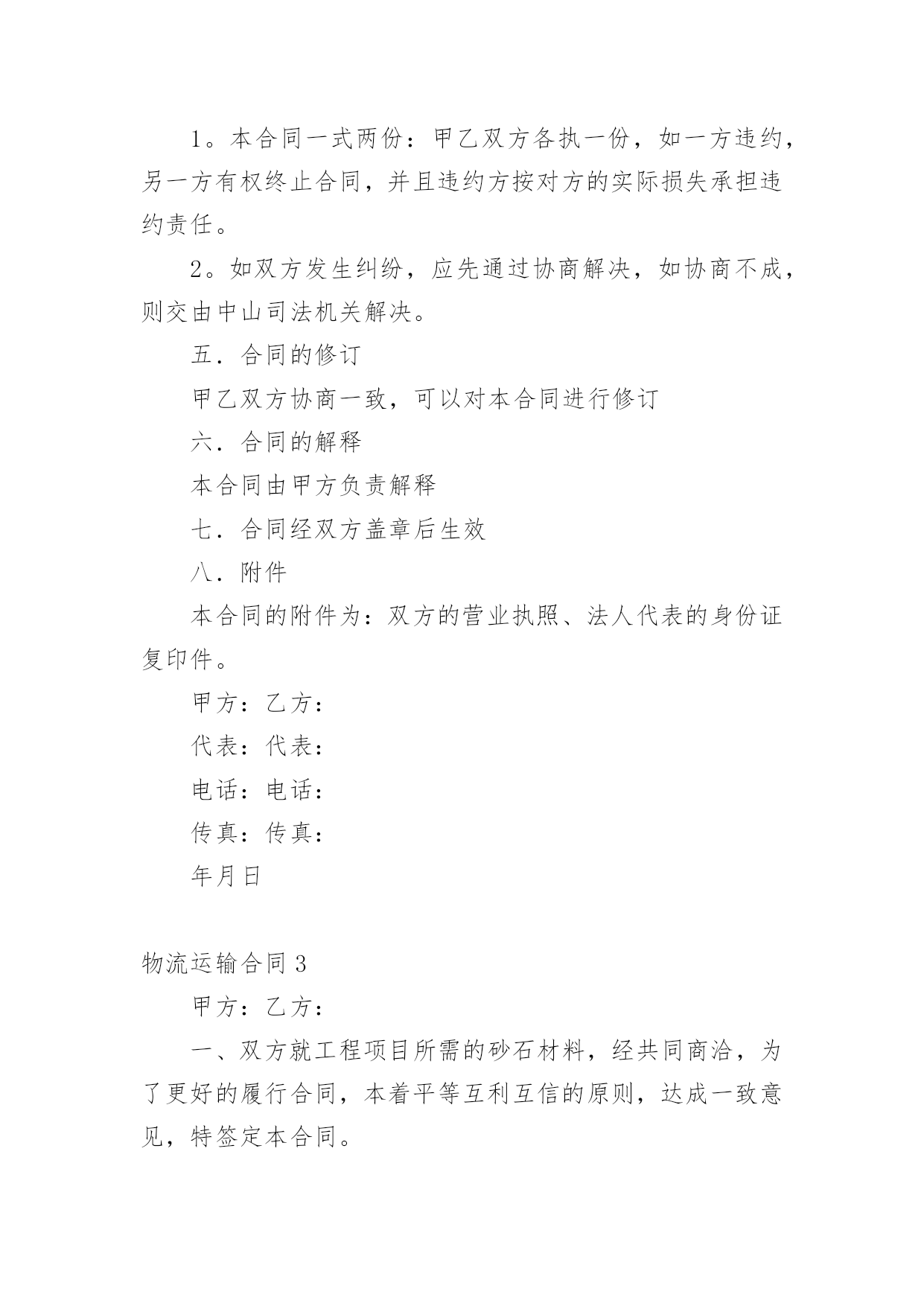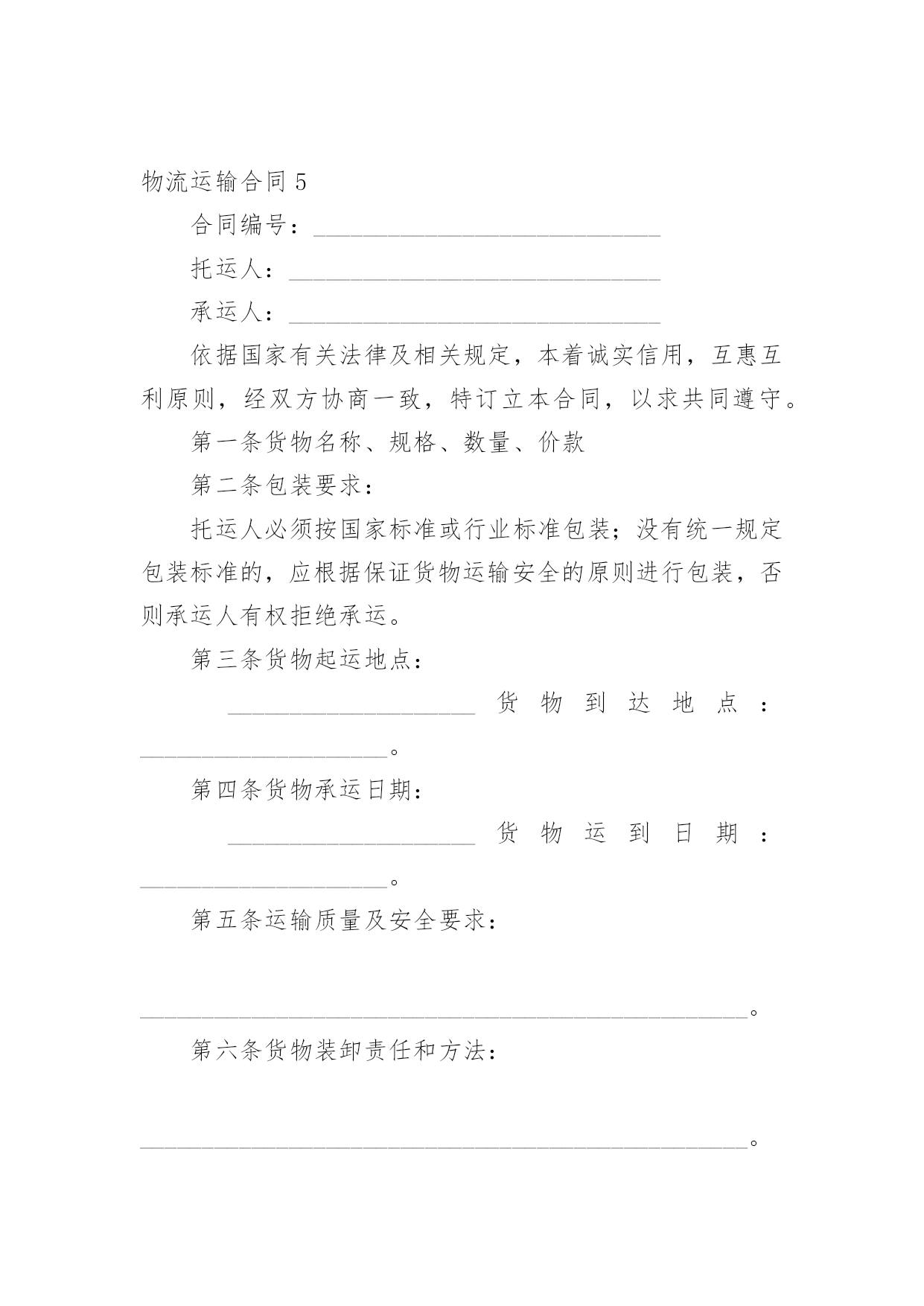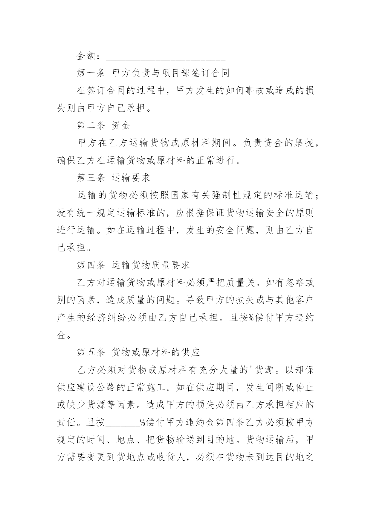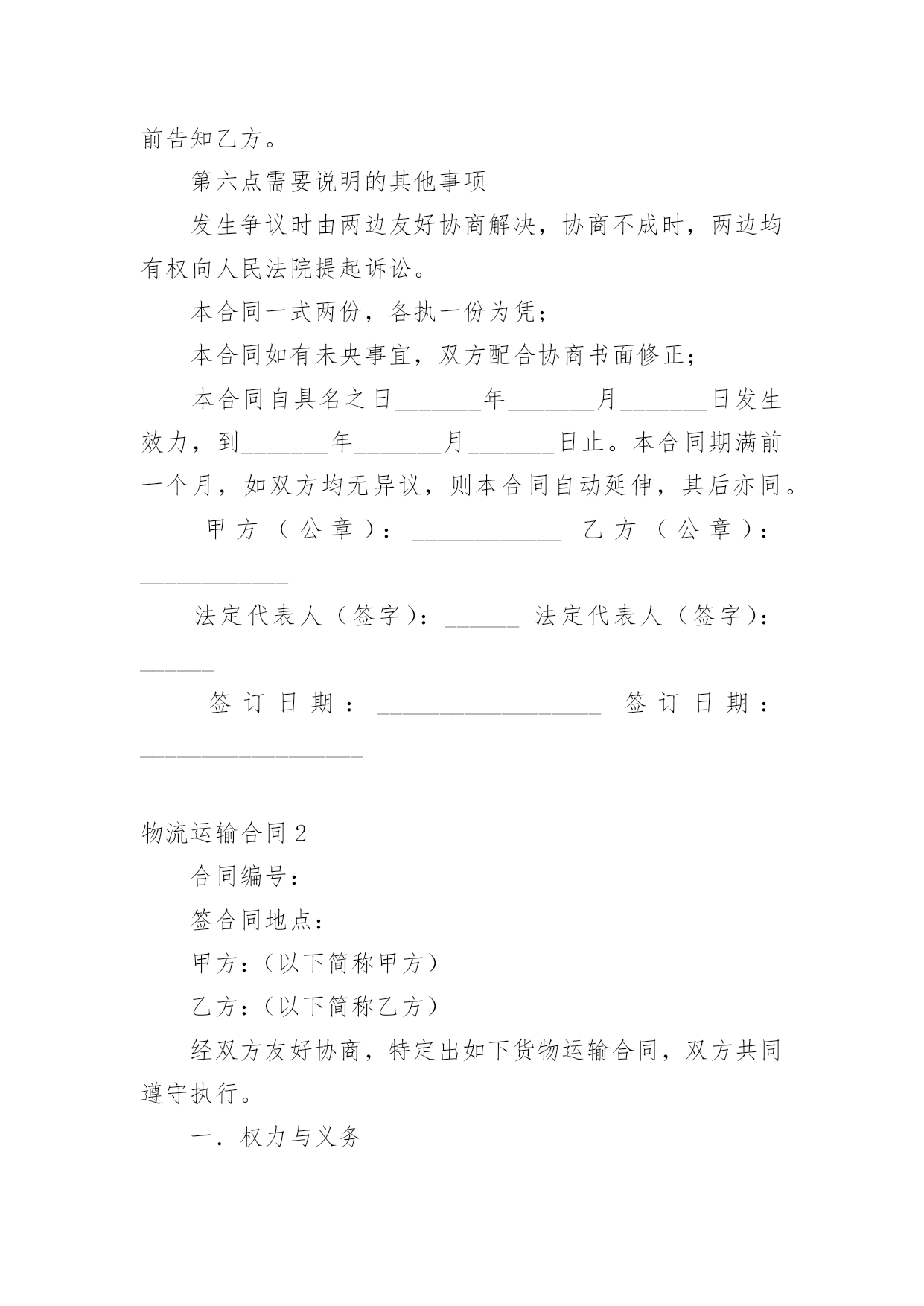 物流运输合同物流运输合同(精华15篇)随着法律观念的日渐普及,合同的用途越来越广泛,签订合同能促使双方规范地承诺和履行合作。你知道合同的主要内容是什么吗?以下是小编为大家整理的物流运输合同,希望能够帮助到大家。物流运输合同1甲方:__________________乙方:__________________地址:__________________地址:__________________联系方式:____________联系方式:____________根据有关法律规定,经过双方充分协商,特订立本合同,以便双方共同遵守。运输货物的名称:规格:________________________数量:________________________运输费价款货物编号:____________品名:________________________规格:________________________单位:________________________单价:________________________数量:________________________金额:________________________第一条甲方负责与项目部签订合同在签订合同的过程中,甲方发生的如何事故或造成的损失则由甲方自己承担。第二条资金甲方在乙方运输货物或原材料期间。负责资金的集拢,确保乙方在运输货物或原材料的正常进行。第三条运输要求运输的货物必须按照国家有关强制性规定的标准运输;没有统一规定运输标准的,应根据保证货物运输安全的原则进行运输。如在运输过程中,发生的安全问题,则由乙方自己承担。第四条运输货物质量要求乙方对运输货物或原材料必须严把质量关。如有忽略或别的因素,造成质量的问题。导致甲方的损失或与其他客户产生的经济纠纷必须由乙方自己承担。且按%偿付甲方违约金。第五条货物或原材料的供应乙方必须对货物或原材料有充分大量的'货源。以却保供应建设公路的正常施工。如在供应期间,发生间断或停止或缺少货源等因素。造成甲方的损失必须由乙方承担相应的责任。且按_______%偿付甲方违约金第四条乙方必须按甲方规定的时间、地点、把货物输送到目的地。货物运输后,甲方需要变更到货地点或收货人,必须在货物未到达目的地之前告知乙方。第六点需要说明的其他事项发生争议时由两边友好协商解决,协商不成时,两边均有权向人民法院提起诉讼。本合同一式两份,各执一份为凭;本合同如有未央事宜,双方配合协商书面修正;本合同自具名之日_______年_______月_______日发生效力,到_______年_______月_______日止。本合同期满前一个月,如双方均无异议,则本合同自动延伸,其后亦同。甲方(公章):____________乙方(公章):____________法定代表人(签字):______法定代表人(签字):______签订日期:__________________签订日期:__________________物流运输合同2合同编号:签合同地点:甲方:(以下简称甲方)乙方:(以下简称乙方)经双方友好协商,特定出如下货物运输合同,双方共同遵守执行。一.权力与义务1。甲方将本公司的XXXX等货物委托乙方发运,乙方应按甲方的要求将货物发送到目的地。2。货物运输保险由乙方代为办理,如发生保险事故,乙方将负责甲方的损失,甲方可以协助乙方处理相关事宜。3。运输过程中乙方应保证甲方货运完好无损,准时送达双方约定地点,如承运误期乙方应按100元/天赔偿甲方的损失,在运输过程中发生任何意外而造成的损失,由乙方全权负责。包括由于在运输途中任何行政罚款都由乙方全部负责,甲方不承担任何责任。4。货到验收时发现短缺、丢失、损坏、淋湿等情况,乙方应及时通知甲方,并由收货方会同乙方司机当场确认损失,且乙方应按货物实价金额赔偿甲方损失。5。乙方在甲方仓库装完货后,货物清点核对无误,离开甲方装货地点而发生丢失、破损等情况时,由乙方按货物实价负责赔偿。6。甲方用车时,尽量提前向乙方提供用车计划,乙方应在甲方指定时间将吨位合适的车辆派往甲方指定的地点,因乙方原因造成甲方不能按时装货、交货、乙方应赔偿甲方因此而造成的一切损失。7。乙方应对甲方货物运输实行“一条龙”服务,从安排调车、组织装车、数量清点等工作的`全过程,乙方均应派专人进行跟踪服务。二.运输单价及运费结算乙方必须在运输货物的数量达到件后到甲方指定的地点提取货物,且在目的地市内免费送货,如收货人所在地点在市外,送货费由双方协商解决。中山-----;单价:到货时间:中山-----;单价:到货时间:中山-----;单价:到货时间:中山-----;单价:到货时间:中山-----;单价:到货时间:中山-----;单价:到货时间:中山-----;单价:到货时