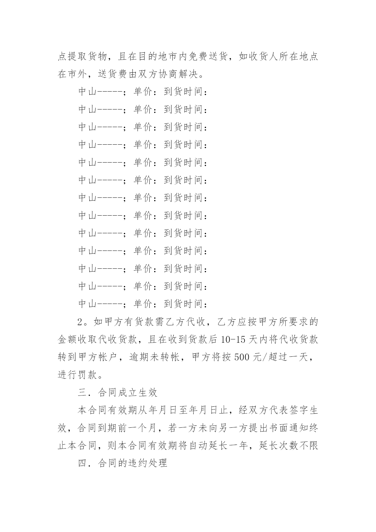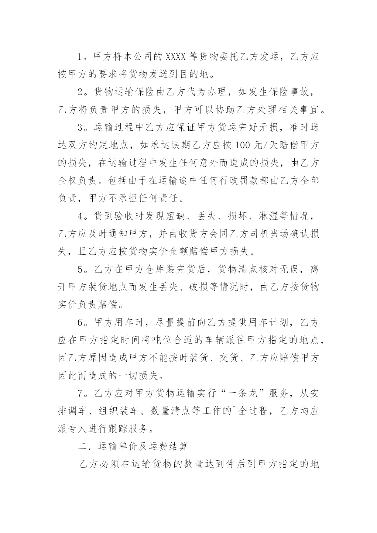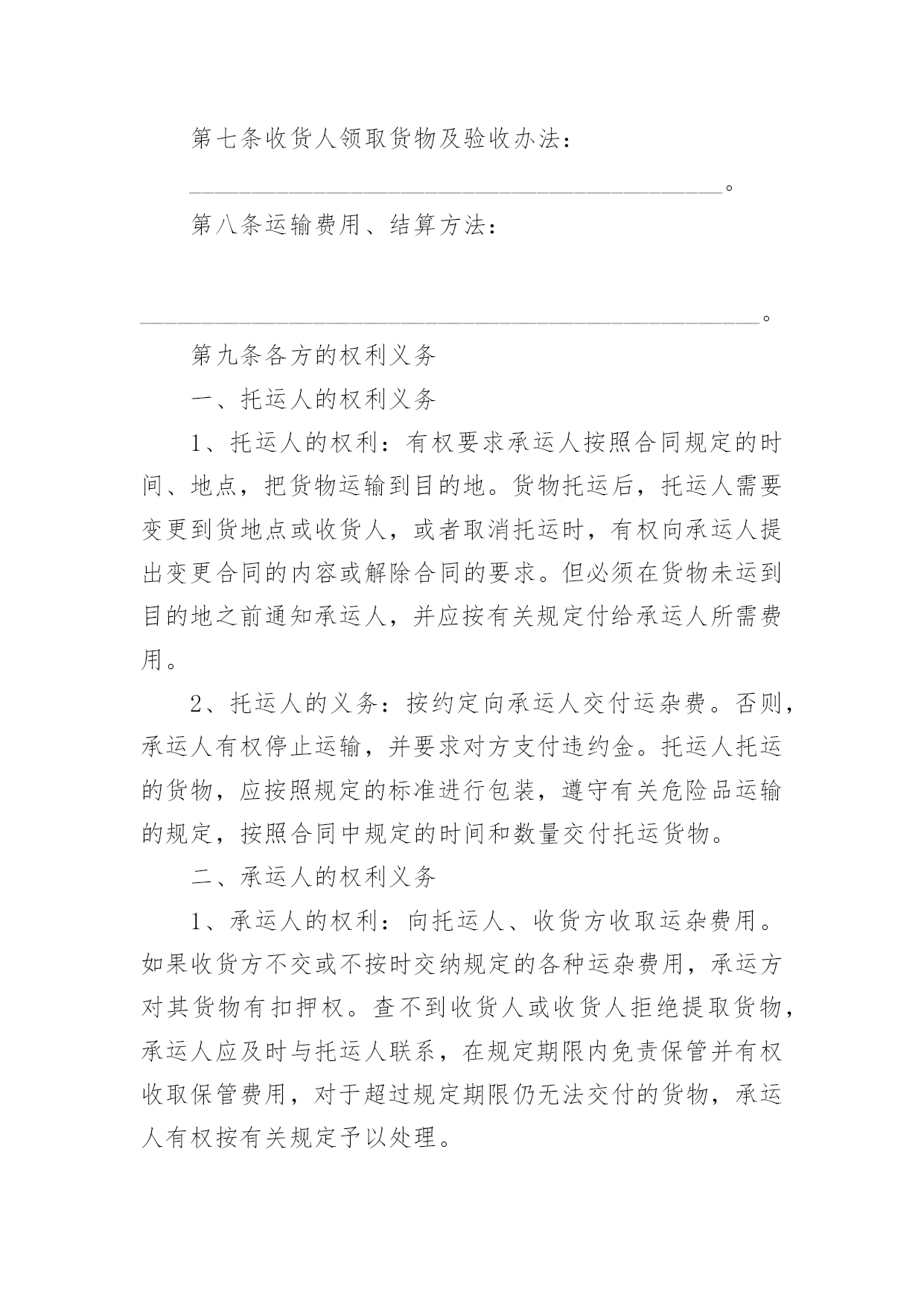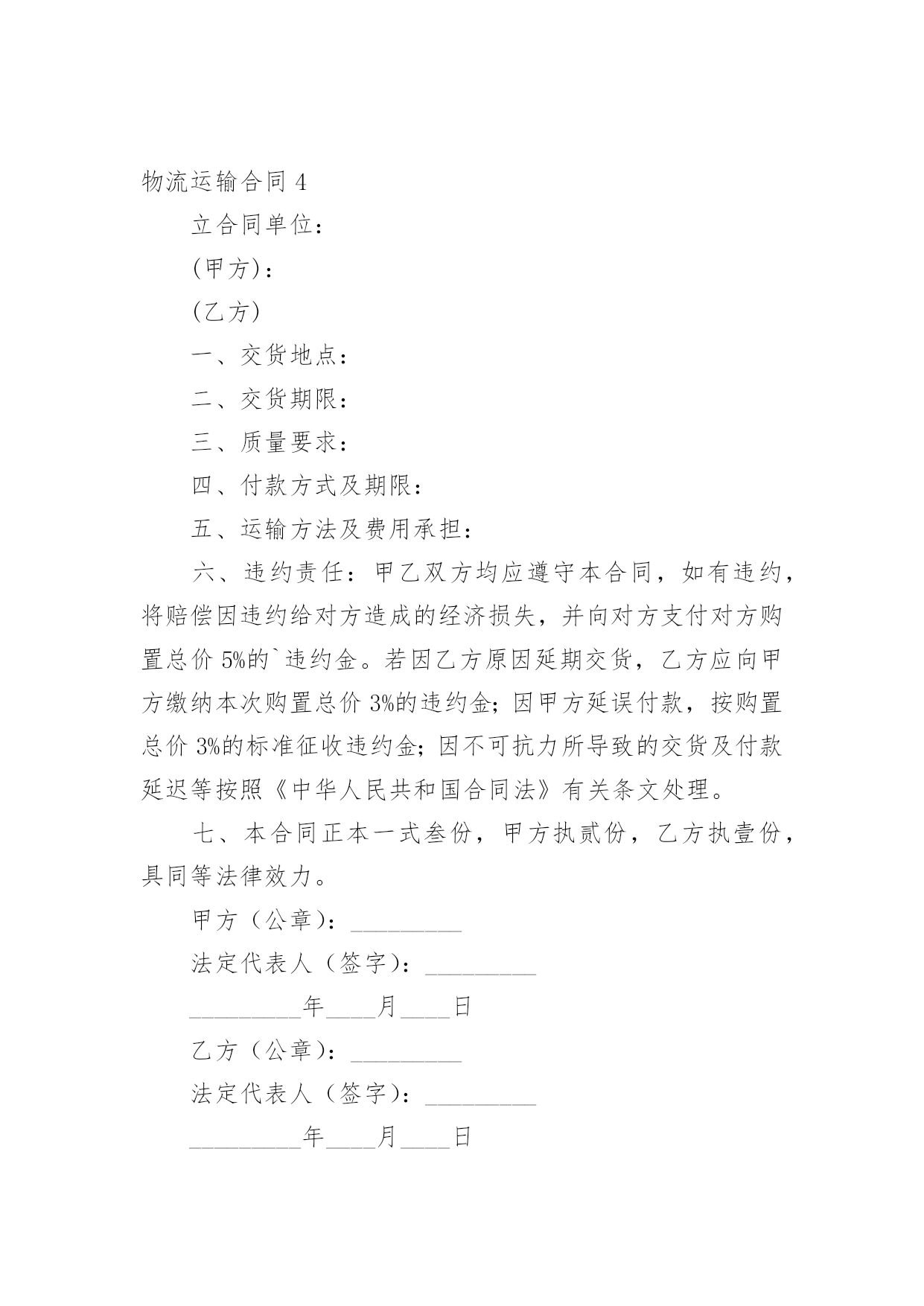 物流运输合同物流运输合同(精华15篇)随着法律观念的日渐普及,合同的用途越来越广泛,签订合同能促使双方规范地承诺和履行合作。你知道合同的主要内容是什么吗?以下是小编为大家整理的物流运输合同,希望能够帮助到大家。物流运输合同1甲方:__________________乙方:__________________地址:__________________地址:__________________联系方式:____________联系方式:____________根据有关法律规定,经过双方充分协商,特订立本合同,以便双方共同遵守。运输货物的名称:规格:________________________数量:________________________运输费价款货物编号:____________品名:________________________规格:________________________单位:________________________单价:________________________数量:________________________金额:________________________第一条甲方负责与项目部签订合同在签订合同的过程中,甲方发生的如何事故或造成的损失则由甲方自己承担。第二条资金甲方在乙方运输货物或原材料期间。负责资金的集拢,确保乙方在运输货物或原材料的正常进行。第三条运输要求运输的货物必须按照国家有关强制性规定的标准运输;没有统一规定运输标准的,应根据保证货物运输安全的原则进行运输。如在运输过程中,发生的安全问题,则由乙方自己承担。第四条运输货物质量要求乙方对运输货物或原材料必须严把质量关。如有忽略或别的因素,造成质量的问题。导致甲方的损失或与其他客户产生的经济纠纷必须由乙方自己承担。且按%偿付甲方违约金。第五条货物或原材料的供应乙方必须对货物或原材料有充分大量的'货源。以却保供应建设公路的正常施工。如在供应期间,发生间断或停止或缺少货源等因素。造成甲方的损失必须由乙方承担相应的责任。且按_______%偿付甲方违约金第四条乙方必须按甲方规定的时间、地点、把货物输送到目的地。货物运输后,甲方需要变更到货地点或收货人,必须在货物未到达目的地之前告知乙方。第六点需要说明的其他事项发生争议时由两边友好协商解决,协商不成时,两边均有权向人民法院提起诉讼。本合同一式两份,各执一份为凭;本合同如有未央事宜,双方配合协商书面修正;本合同自具名之日_______年_______月_______日发生效力,到_______年_______月_______日止。本合同期满前一个月,如双方均无异议,则本合同自动延伸,其后亦同。甲方(公章):____________乙方(公章):____________法定代表人(签字):______法定代表人(签字):______签订日期:__________________签订日期:__________________物流运输合同2合同编号:签合同地点:甲方:(以下简称甲方)乙方:(以下简称乙方)经双方友好协商,特定出如下货物运输合同,双方共同遵守执行。一.权力与义务1。甲方将本公司的XXXX等货物委托乙方发运,乙方应按甲方的要求将货物发送到目的地。2。货物运输保险由乙方代为办理,如发生保险事故,乙方将负责甲方的损失,甲方可以协助乙方处理相关事宜。3。运输过程中乙方应保证甲方货运完好无损,准时送达双方约定地点,如承运误期乙方应按100元/天赔偿甲方的损失,在运输过程中发生任何意外而造成的损失,由乙方全权负责。包括由于在运输途中任何行政罚款都由乙方全部负责,甲方不承担任何责任。4。货到验收时发现短缺、丢失、损坏、淋湿等情况,乙方应及时通知甲方,并由收货方会同乙方司机当场确认损失,且乙方应按货物实价金额赔偿甲方损失。5。乙方在甲方仓库装完货后,货物清点核对无误,离开甲方装货地点而发生丢失、破损等情况时,由乙方按货物实价负责赔偿。6。甲方用车时,尽量提前向乙方提供用车计划,乙方应在甲方指定时间将吨位合适的车辆派往甲方指定的地点,因乙方原因造成甲方不能按时装货、交货、乙方应赔偿甲方因此而造成的一切损失。7。乙方应对甲方货物运输实行“一条龙”服务,从安排调车、组织装车、数量清点等工作的`全过程,乙方均应派专人进行跟踪服务。二.运输单价及运费结算乙方必须在运输货物的数量达到件后到甲方指定的地点提取货物,且在目的地市内免费送货,如收货人所在地点在市外,送货费由双方协商解决。中山-----;单价:到货时间:中山-----;单价:到货时间:中山-----;单价:到货时间:中山-----;单价:到货时间:中山-----;单价:到货时间:中山-----;单价:到货时间:中山-----;单价:到货时