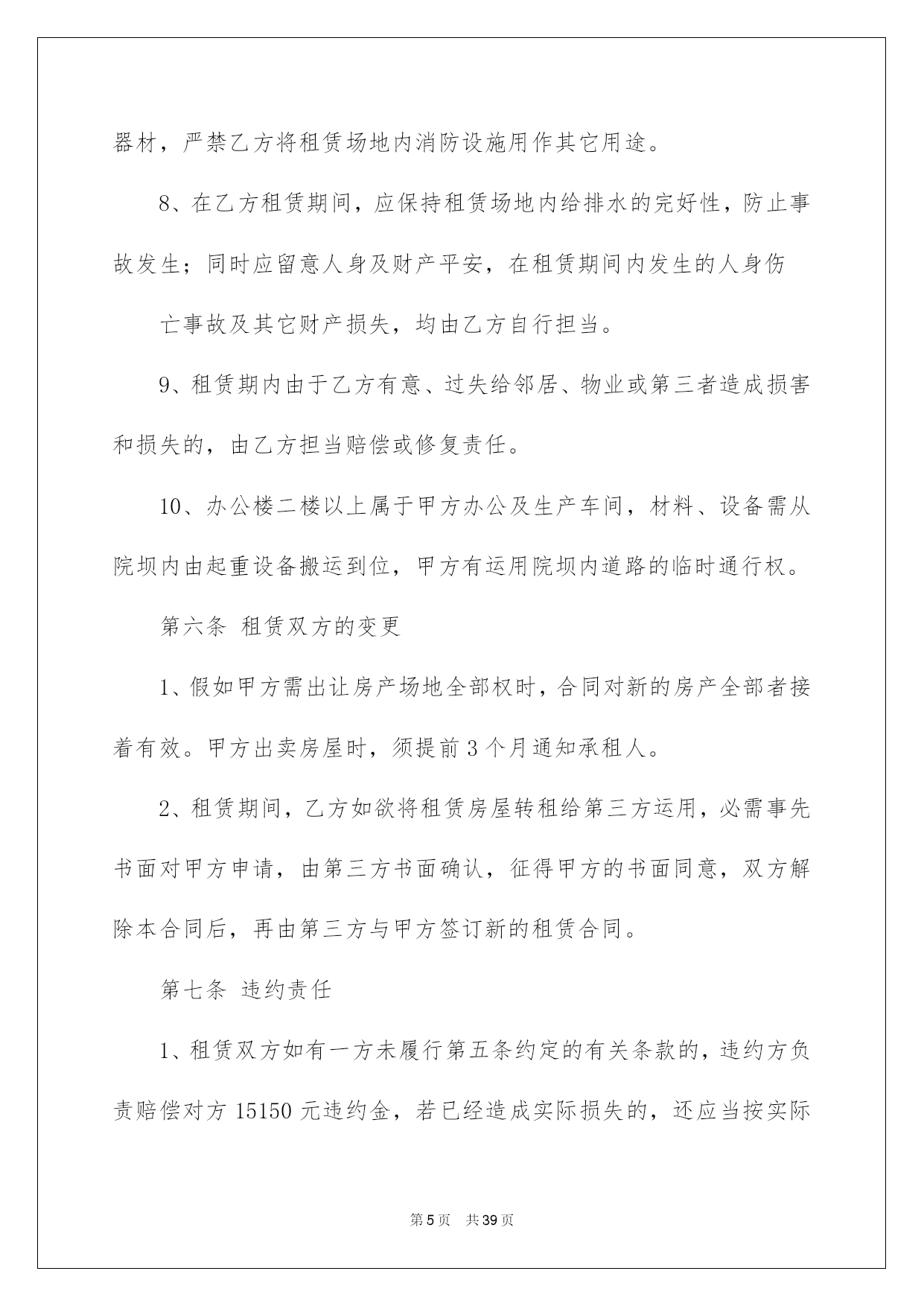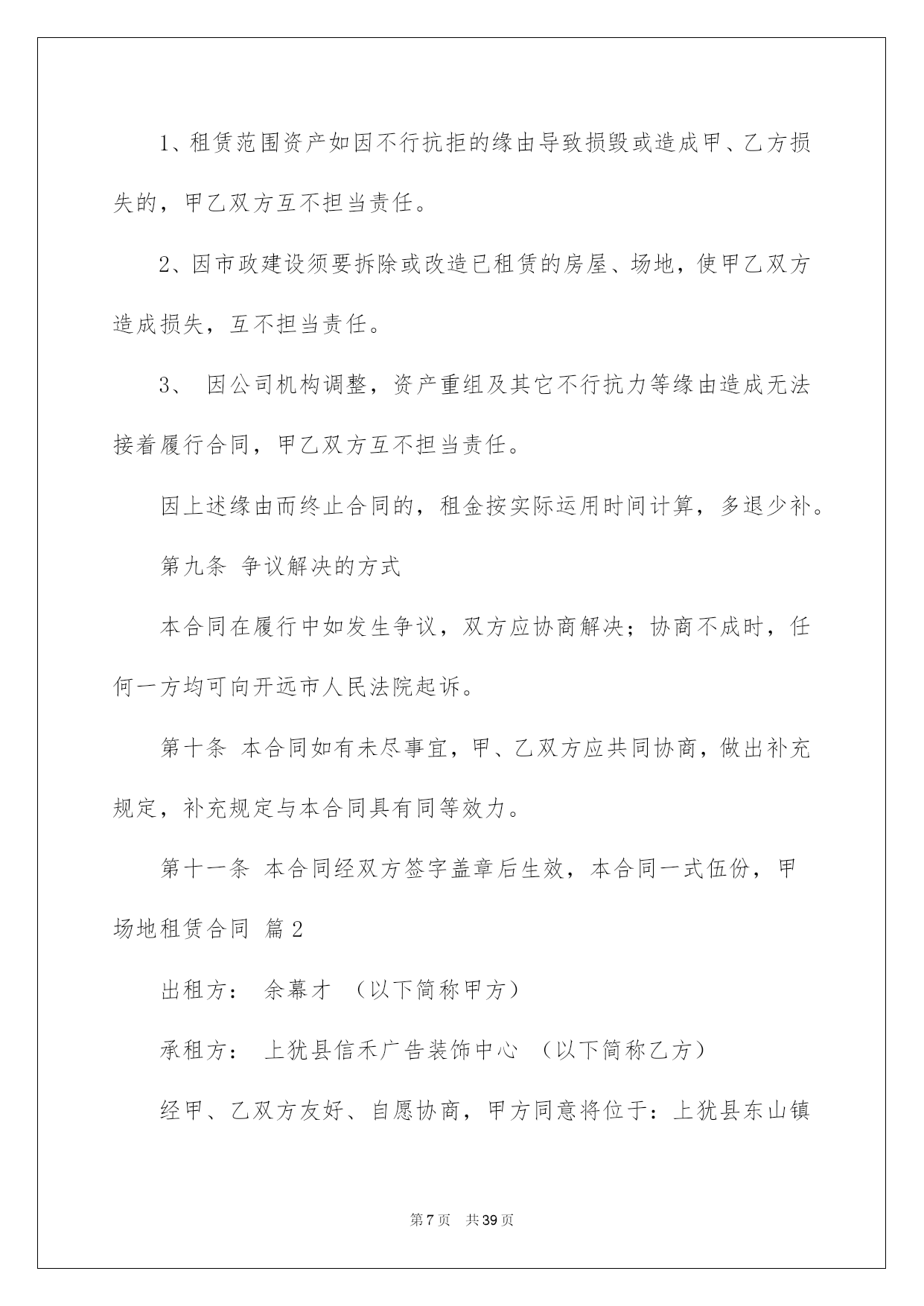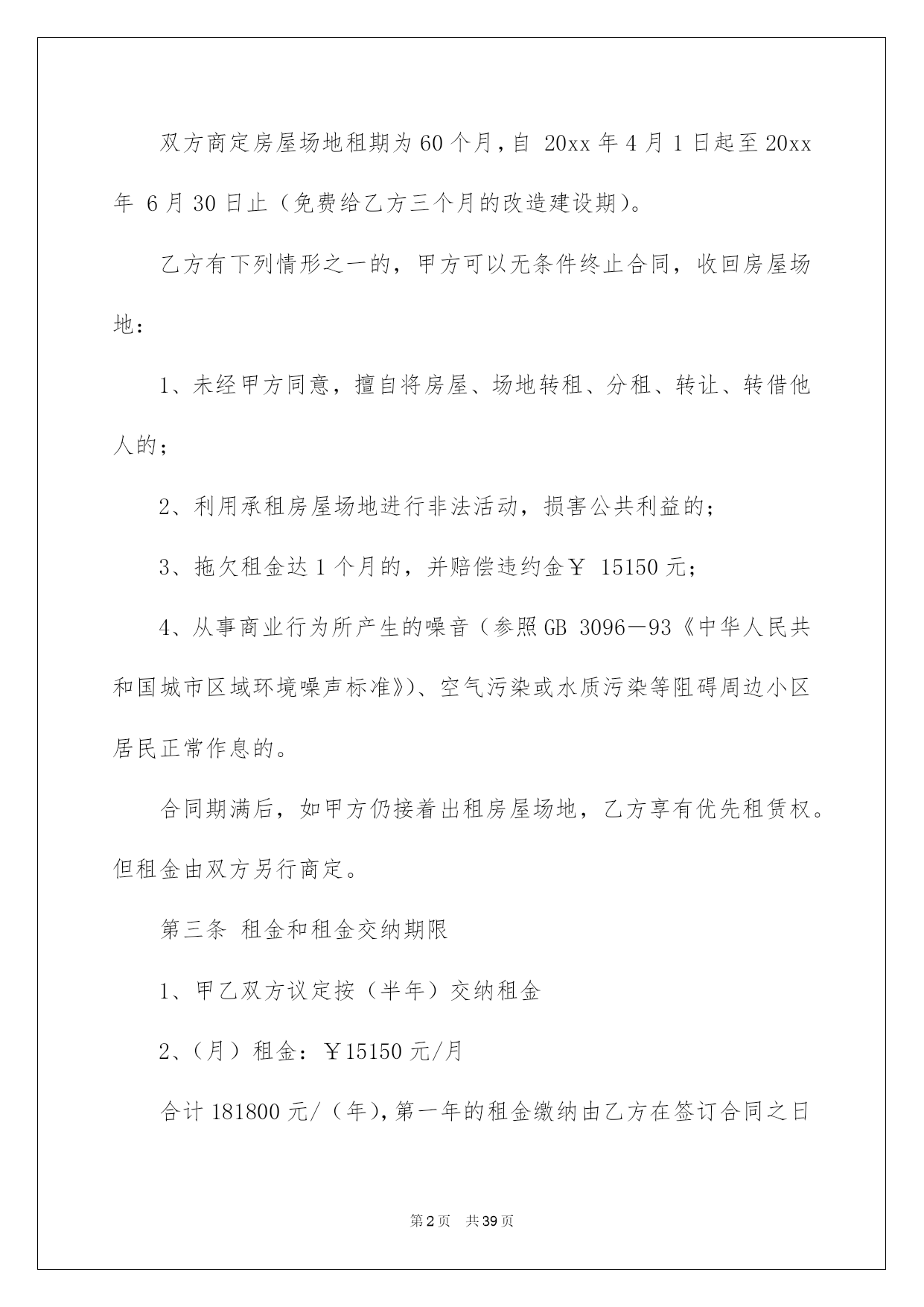 第PAGE\*Arabic\*MERGEFORMAT39页共NUMPAGES\*Arabic\*MERGEFORMAT39页第PAGE\*MERGEFORMAT39页共NUMPAGES\*MERGEFORMAT39页第PAGE\*MERGEFORMAT39页共NUMPAGES\*MERGEFORMAT39页第PAGE\*MERGEFORMAT39页共NUMPAGES\*MERGEFORMAT39页第PAGE\*MERGEFORMAT39页共NUMPAGES\*MERGEFORMAT39页第PAGE\*MERGEFORMAT39页共NUMPAGES\*MERGEFORMAT39页第PAGE\*MERGEFORMAT39页共NUMPAGES\*MERGEFORMAT39页第PAGE\*MERGEFORMAT39页共NUMPAGES\*MERGEFORMAT39页第PAGE\*MERGEFORMAT39页共NUMPAGES\*MERGEFORMAT39页第PAGE\*MERGEFORMAT39页共NUMPAGES\*MERGEFORMAT39页第PAGE\*MERGEFORMAT39页共NUMPAGES\*MERGEFORMAT39页2022场地租赁合同有关场地租赁合同模板合集六篇随着人们法律意识的加强,合同对我们的约束力越来越不行忽视,合同协调着人与人,人与事之间的关系。你知道合同的主要内容是什么吗?以下是我收集整理的场地租赁合同6篇,供大家参考借鉴,希望可以帮助到有须要的挚友。场地租赁合同篇1甲方:开远一行电力有限责任公司(以下简称甲方)乙方:开远市联众汽车运输有限责任公司(以下简称乙方)依据《中华人民共和国合同法》及有关规定,为明确甲方与乙方的权利义务关系,双方在自愿、同等、等价有偿的原则下经过充分协商,特定立本合同。第一条甲方将自有的坐落在开远市西南路原一行建筑公司办公楼一层480平方米、北面新建宿舍楼350平方米及新建钢棚144平方米,及其余附属院内场地,出租给乙方运用。其次条租赁期限双方商定房屋场地租期为60个月,自20xx年4月1日起至20xx年6月30日止(免费给乙方三个月的改造建设期)。乙方有下列情形之一的,甲方可以无条件终止合同,收回房屋场地:1、未经甲方同意,擅自将房屋、场地转租、分租、转让、转借他人的;2、利用承租房屋场地进行非法活动,损害公共利益的;3、拖欠租金达1个月的,并赔偿违约金¥15150元;4、从事商业行为所产生的噪音(参照GB3096-93《中华人民共和国城市区域环境噪声标准》)、空气污染或水质污染等阻碍周边小区居民正常作息的。合同期满后,如甲方仍接着出租房屋场地,乙方享有优先租赁权。但租金由双方另行商定。第三条租金和租金交纳期限1、甲乙双方议定按(半年)交纳租金2、(月)租金:¥15150元/月合计181800元/(年),第一年的租金缴纳由乙方在签订合同之日起一次性全额交付甲方,下一个半年租金90900元应在租金到期前一个月的15日支付给甲方,甲方收取租金时必需出具由政府有关部门监制的收款凭证,无合法收款凭证的乙方可以拒付。4、乙方需交纳¥:15150.00元房屋租赁押金。在签订合同时一次性全额交付甲方。合同期满或终止后无违约行为时一次性全额返还。第四条各项费用的缴纳1、水电费:由乙方自行缴纳;(水表底数为度,电表底数为度,此度数以后的费用由乙方担当,直至合同期满)。2、修理费:租赁期间,由于乙方缘由导致租赁房屋的质量或房屋的内部设施损毁,包括门窗、水电等,修理费由乙方负责。3、运用该房屋场地进行商业活动产生的全部其它各项费用均由乙方缴纳(其中包括但不限于乙方自己申请安装电话、宽带、有线电视等设备的费用)。4、由于租用房屋场地所发生的相关社会费用及义务由乙方负责。第五条租赁期间的房屋场地的运用、修缮和改造1、甲方有义务向乙方交付无质量问题的房屋,双方在对房屋质量验收无问题后再将房屋交给乙方运用。2、钢棚根据起吊3吨货载设计建设,乙方应在设计货载内平安运用该设施,起吊设备由乙方自行安装,证照由乙方办理,运用平安均由乙方负责。3、乙方装修、改造方案需向甲方提出书面申请,经甲方相关部门同意后方可实施。严禁乙方干脆运用东面及南面砖木结构的危房,装修、改造费用及平安均由乙方负责。4、甲方将房屋场地交给乙方后,乙方其经营状况与甲方无关;租期结束或中途双方协商解除合同,乙方不得破坏已装修部分及房屋架构,乙方装修或改造房屋的费用甲方不赐予任何经济补偿,搭建的临时建筑留给甲方运用,产权归属甲方。5、乙方对租赁的房屋及场地负有妥当运用及维护之责任,对各种可能
