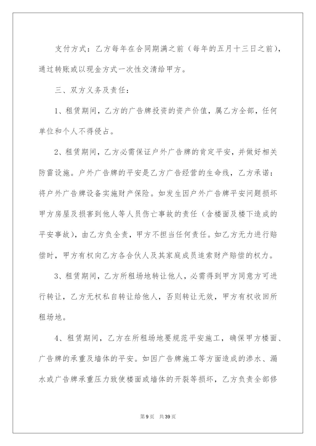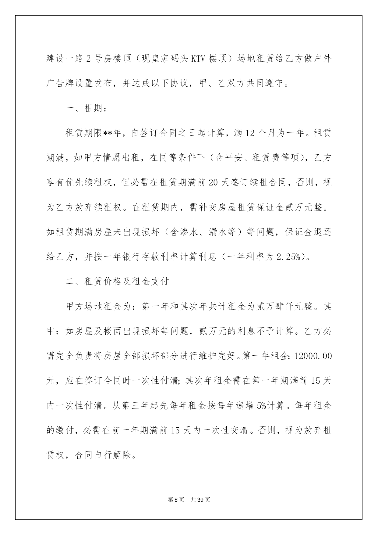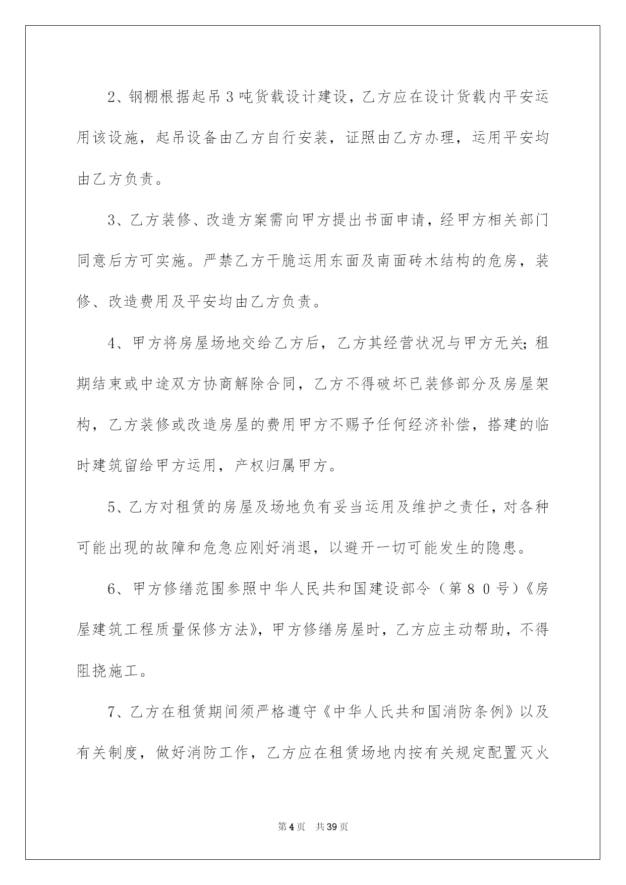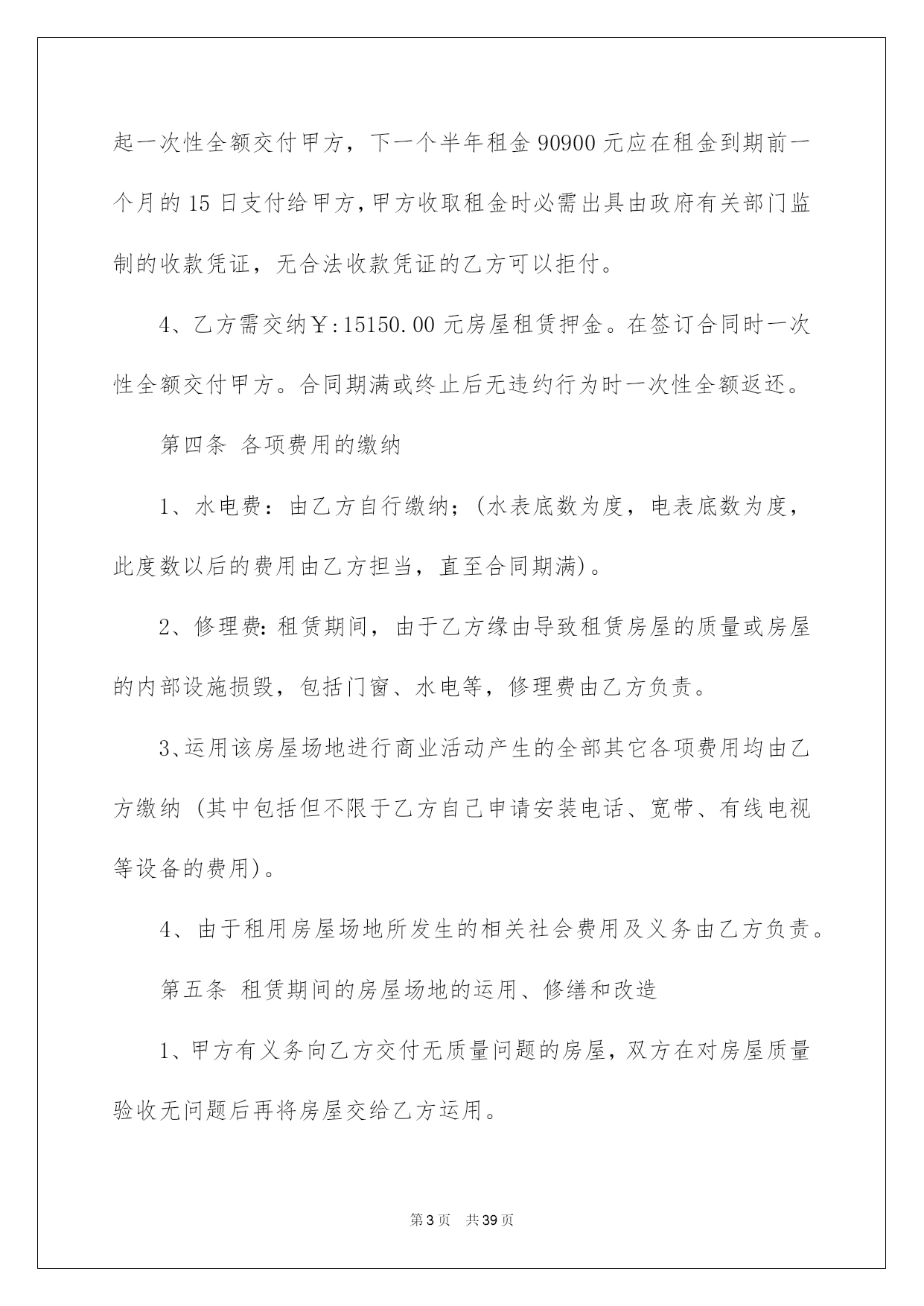 第PAGE\*Arabic\*MERGEFORMAT39页共NUMPAGES\*Arabic\*MERGEFORMAT39页第PAGE\*MERGEFORMAT39页共NUMPAGES\*MERGEFORMAT39页第PAGE\*MERGEFORMAT39页共NUMPAGES\*MERGEFORMAT39页第PAGE\*MERGEFORMAT39页共NUMPAGES\*MERGEFORMAT39页第PAGE\*MERGEFORMAT39页共NUMPAGES\*MERGEFORMAT39页第PAGE\*MERGEFORMAT39页共NUMPAGES\*MERGEFORMAT39页第PAGE\*MERGEFORMAT39页共NUMPAGES\*MERGEFORMAT39页第PAGE\*MERGEFORMAT39页共NUMPAGES\*MERGEFORMAT39页第PAGE\*MERGEFORMAT39页共NUMPAGES\*MERGEFORMAT39页第PAGE\*MERGEFORMAT39页共NUMPAGES\*MERGEFORMAT39页第PAGE\*MERGEFORMAT39页共NUMPAGES\*MERGEFORMAT39页2022场地租赁合同有关场地租赁合同模板合集六篇随着人们法律意识的加强,合同对我们的约束力越来越不行忽视,合同协调着人与人,人与事之间的关系。你知道合同的主要内容是什么吗?以下是我收集整理的场地租赁合同6篇,供大家参考借鉴,希望可以帮助到有须要的挚友。场地租赁合同篇1甲方:开远一行电力有限责任公司(以下简称甲方)乙方:开远市联众汽车运输有限责任公司(以下简称乙方)依据《中华人民共和国合同法》及有关规定,为明确甲方与乙方的权利义务关系,双方在自愿、同等、等价有偿的原则下经过充分协商,特定立本合同。第一条甲方将自有的坐落在开远市西南路原一行建筑公司办公楼一层480平方米、北面新建宿舍楼350平方米及新建钢棚144平方米,及其余附属院内场地,出租给乙方运用。其次条租赁期限双方商定房屋场地租期为60个月,自20xx年4月1日起至20xx年6月30日止(免费给乙方三个月的改造建设期)。乙方有下列情形之一的,甲方可以无条件终止合同,收回房屋场地:1、未经甲方同意,擅自将房屋、场地转租、分租、转让、转借他人的;2、利用承租房屋场地进行非法活动,损害公共利益的;3、拖欠租金达1个月的,并赔偿违约金¥15150元;4、从事商业行为所产生的噪音(参照GB3096-93《中华人民共和国城市区域环境噪声标准》)、空气污染或水质污染等阻碍周边小区居民正常作息的。合同期满后,如甲方仍接着出租房屋场地,乙方享有优先租赁权。但租金由双方另行商定。第三条租金和租金交纳期限1、甲乙双方议定按(半年)交纳租金2、(月)租金:¥15150元/月合计181800元/(年),第一年的租金缴纳由乙方在签订合同之日起一次性全额交付甲方,下一个半年租金90900元应在租金到期前一个月的15日支付给甲方,甲方收取租金时必需出具由政府有关部门监制的收款凭证,无合法收款凭证的乙方可以拒付。4、乙方需交纳¥:15150.00元房屋租赁押金。在签订合同时一次性全额交付甲方。合同期满或终止后无违约行为时一次性全额返还。第四条各项费用的缴纳1、水电费:由乙方自行缴纳;(水表底数为度,电表底数为度,此度数以后的费用由乙方担当,直至合同期满)。2、修理费:租赁期间,由于乙方缘由导致租赁房屋的质量或房屋的内部设施损毁,包括门窗、水电等,修理费由乙方负责。3、运用该房屋场地进行商业活动产生的全部其它各项费用均由乙方缴纳(其中包括但不限于乙方自己申请安装电话、宽带、有线电视等设备的费用)。4、由于租用房屋场地所发生的相关社会费用及义务由乙方负责。第五条租赁期间的房屋场地的运用、修缮和改造1、甲方有义务向乙方交付无质量问题的房屋,双方在对房屋质量验收无问题后再将房屋交给乙方运用。2、钢棚根据起吊3吨货载设计建设,乙方应在设计货载内平安运用该设施,起吊设备由乙方自行安装,证照由乙方办理,运用平安均由乙方负责。3、乙方装修、改造方案需向甲方提出书面申请,经甲方相关部门同意后方可实施。严禁乙方干脆运用东面及南面砖木结构的危房,装修、改造费用及平安均由乙方负责。4、甲方将房屋场地交给乙方后,乙方其经营状况与甲方无关;租期结束或中途双方协商解除合同,乙方不得破坏已装修部分及房屋架构,乙方装修或改造房屋的费用甲方不赐予任何经济补偿,搭建的临时建筑留给甲方运用,产权归属甲方。5、乙方对租赁的房屋及场地负有妥当运用及维护之责任,对各种可能