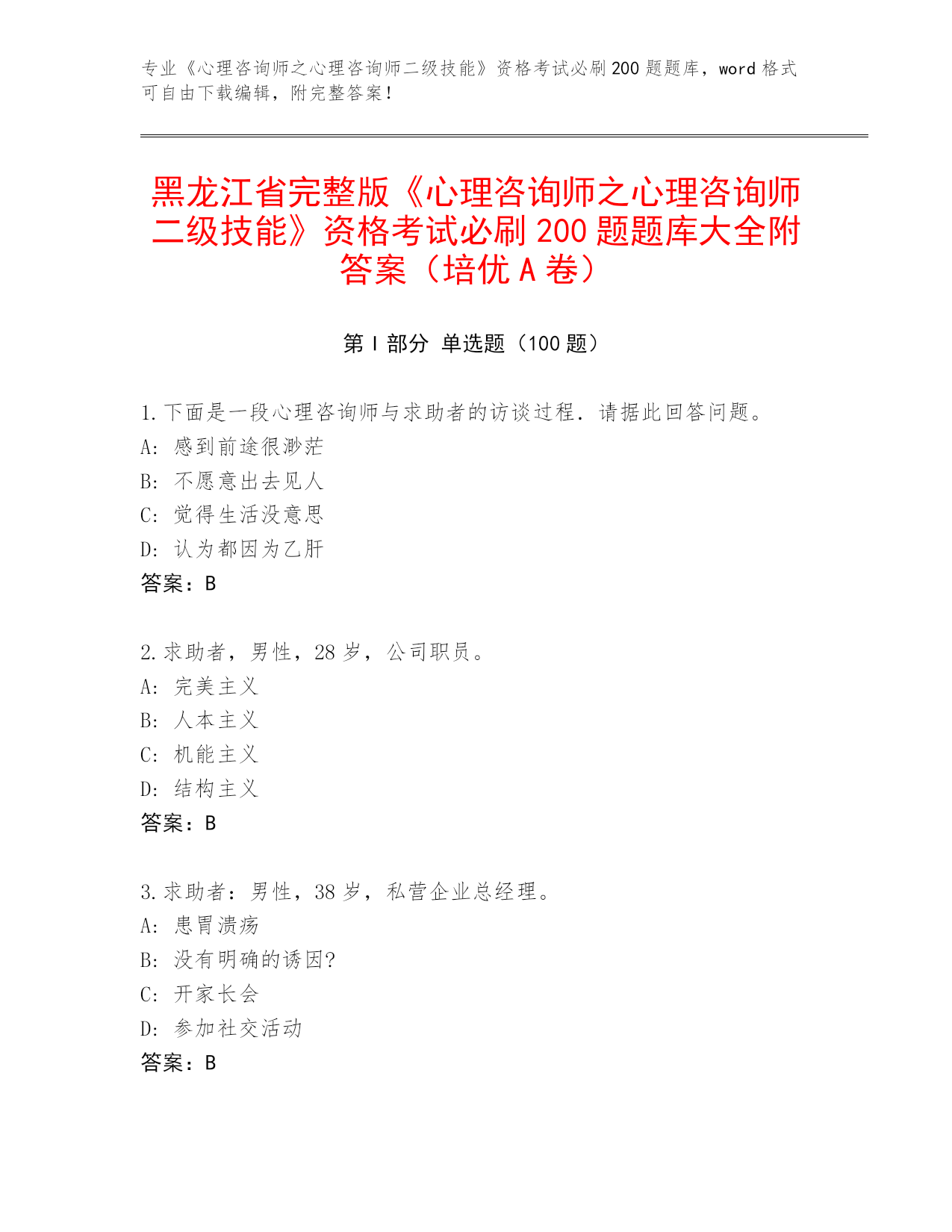 黑龙江省完整版《心理咨询师之心理咨询师二级技能》资格考试必刷200题题库大全附答案(培优A卷)