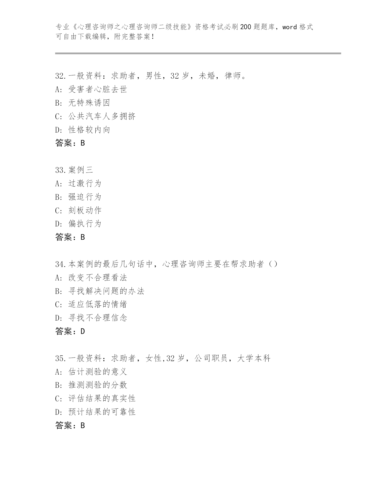 陕西省完整版《心理咨询师之心理咨询师二级技能》考试必刷200题题库大全含答案(培优)