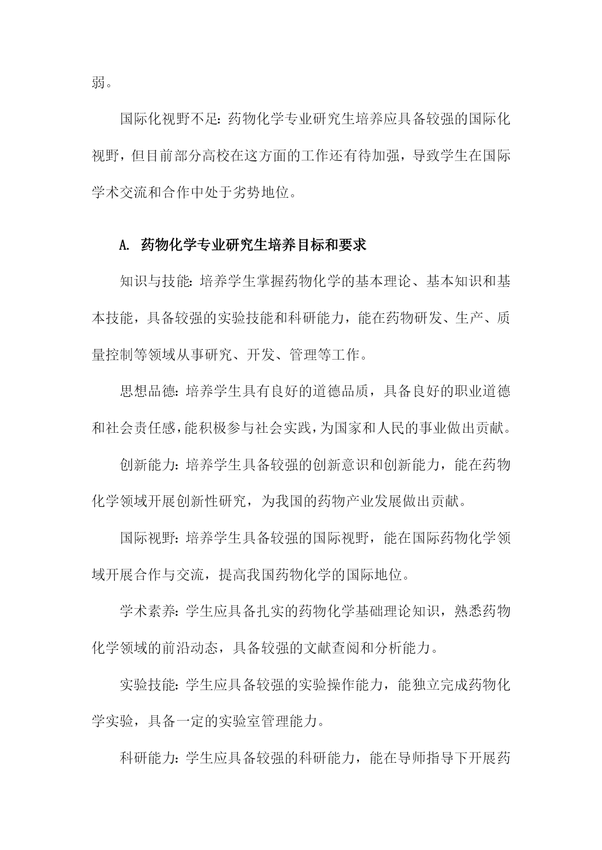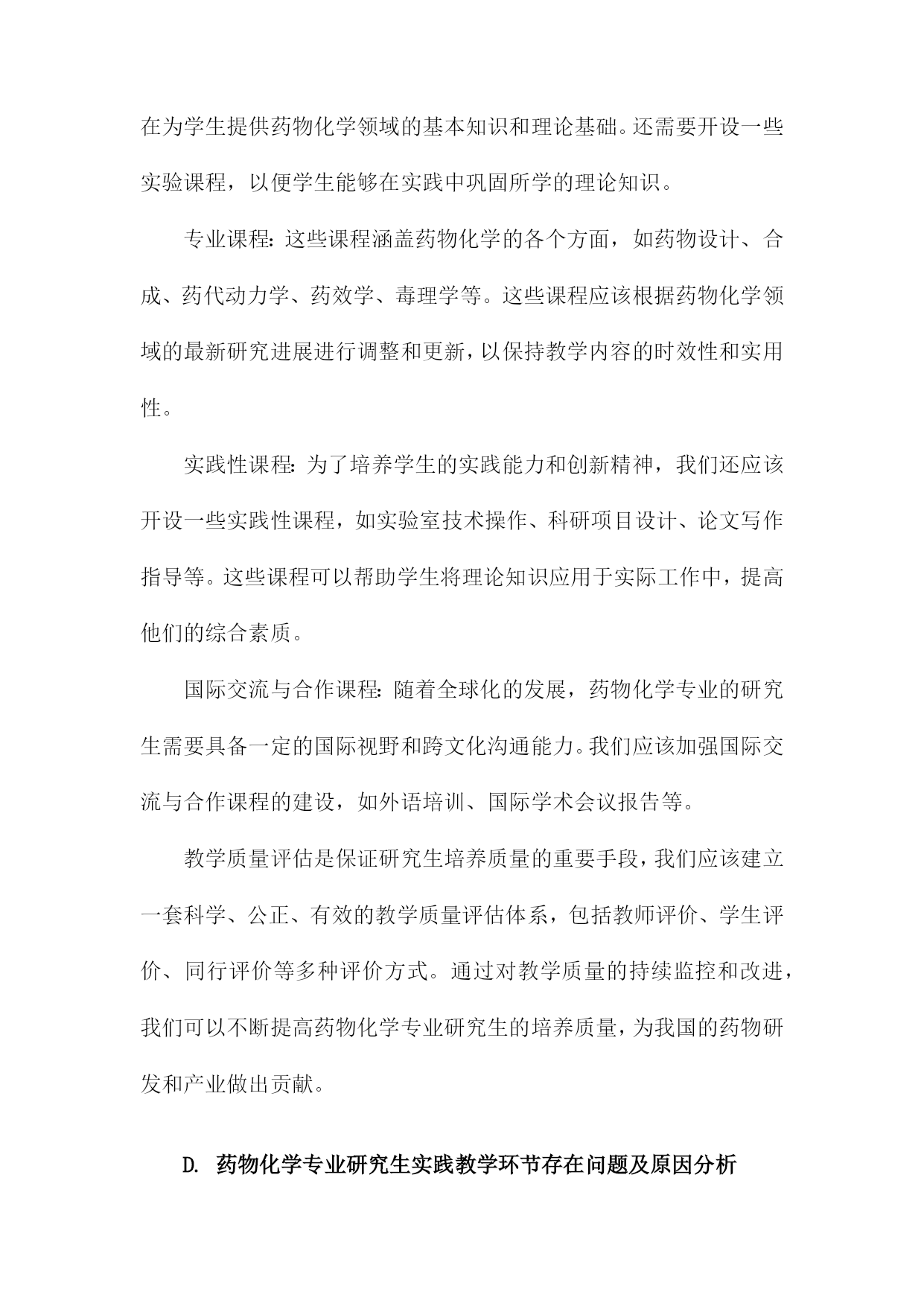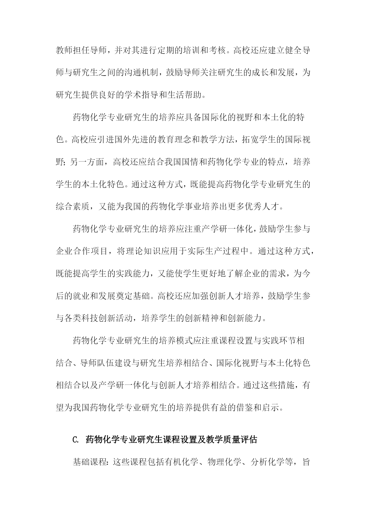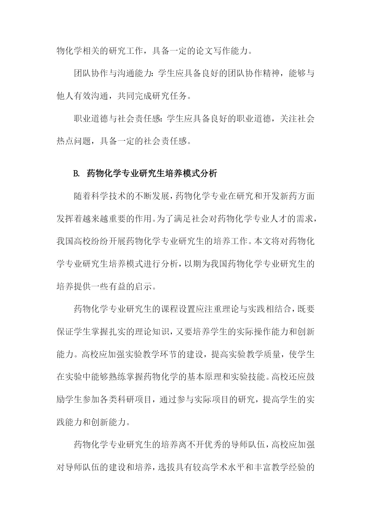 药物化学专业研究生培养的实践与思考一、药物化学专业研究生培养现状及问题分析随着科学技术的不断发展,药物化学作为一门重要的交叉学科,在医药、生物技术等领域具有广泛的应用前景。当前我国药物化学专业研究生培养面临着一定的问题和挑战。课程设置不合理:药物化学专业研究生的课程设置应以培养学生的专业技能和综合素质为主,但目前部分高校的课程设置过于注重理论知识的传授,缺乏实践性的教学环节,导致学生在毕业后进入工作岗位时,实际操作能力较弱。师资力量不足:药物化学专业研究生培养需要有一支高素质的教师队伍,但目前部分高校的药物化学专业教师数量较少,且部分教师的学术水平和教学经验有待提高。实验条件落后:药物化学专业的研究生需要进行大量的实验操作,但部分高校的实验室设施和实验条件相对落后,无法满足学生的实验需求,影响了学生的实践能力和创新能力的培养。产学研结合不够紧密:药物化学专业研究生培养应注重与产业界的合作与交流,但目前部分高校在这方面的工作开展不够积极,导致学生在毕业后进入企业工作时,对实际生产过程的理解和适应能力较弱。国际化视野不足:药物化学专业研究生培养应具备较强的国际化视野,但目前部分高校在这方面的工作还有待加强,导致学生在国际学术交流和合作中处于劣势地位。A.药物化学专业研究生培养目标和要求知识与技能:培养学生掌握药物化学的基本理论、基本知识和基本技能,具备较强的实验技能和科研能力,能在药物研发、生产、质量控制等领域从事研究、开发、管理等工作。思想品德:培养学生具有良好的道德品质,具备良好的职业道德和社会责任感,能积极参与社会实践,为国家和人民的事业做出贡献。创新能力:培养学生具备较强的创新意识和创新能力,能在药物化学领域开展创新性研究,为我国的药物产业发展做出贡献。国际视野:培养学生具备较强的国际视野,能在国际药物化学领域开展合作与交流,提高我国药物化学的国际地位。学术素养:学生应具备扎实的药物化学基础理论知识,熟悉药物化学领域的前沿动态,具备较强的文献查阅和分析能力。实验技能:学生应具备较强的实验操作能力,能独立完成药物化学实验,具备一定的实验室管理能力。科研能力:学生应具备较强的科研能力,能在导师指导下开展药物化学相关的研究工作,具备一定的论文写作能力。团队协作与沟通能力:学生应具备良好的团队协作精神,能够与他人有效沟通,共同完成研究任务。职业道德与社会责任感:学生应具备良好的职业道德,关注社会热点问题,具备一定的社会责任感。B.药物化学专业研究生培养模式分析随着科学技术的不断发展,药物化学专业在研究和开发新药方面发挥着越来越重要的作用。为了满足社会对药物化学专业人才的需求,我国高校纷纷开展药物化学专业研究生的培养工作。本文将对药物化学专业研究生培养模式进行分析,以期为我国药物化学专业研究生的培养提供一些有益的启示。药物化学专业研究生的课程设置应注重理论与实践相结合,既要保证学生掌握扎实的理论知识,又要培养学生的实际操作能力和创新能力。高校应加强实验教学环节的建设,提高实验教学质量,使学生在实验中能够熟练掌握药物化学的基本原理和实验技能。高校还应鼓励学生参加各类科研项目,通过参与实际项目的研究,提高学生的实践能力和创新能力。药物化学专业研究生的培养离不开优秀的导师队伍,高校应加强对导师队伍的建设和培养,选拔具有较高学术水平和丰富教学经验的教师担任导师,并对其进行定期的培训和考核。高校还应建立健全导师与研究生之间的沟通机制,鼓励导师关注研究生的成长和发展,为研究生提供良好的学术指导和生活帮助。药物化学专业研究生的培养应具备国际化的视野和本土化的特色。高校应引进国外先进的教育理念和教学方法,拓宽学生的国际视野;另一方面,高校还应结合我国国情和药物化学专业的特点,培养学生的本土化特色。通过这种方式,既能提高药物化学专业研究生的综合素质,又能为我国的药物化学事业培养出更多优秀人才。药物化学专业研究生的培养应注重产学研一体化,鼓励学生参与企业合作项目,将理论知识应用于实际生产过程中。通过这种方式,既能提高学生的实践能力,又能使学生更好地了解企业的需求,为今后的就业和发展奠定基础。高校还应加强创新人才培养,鼓励学生参与各类科技创新活动,培养学生的创新精神和创新能力。药物化学专业研究生的培养模式应注重课程设置与实践环节相结合、导师队伍建设与研究生培养相结合、国际化视野与本土化特色相结合以及产学研一体化与创新人才培养相结合。通过这些措施,有望为我国药物化学专业研究生的培养提供有益的借鉴和启示。C.药物化学专业研究生课程设置及教学质量评估基础课程:这些课程包括有机化学、物理化学、分析化学等,旨在为学生提供药物化学领域的基本知识和理论基础。还需要开设一些实验课程,以便学生能够在实践中巩固所学的理论知