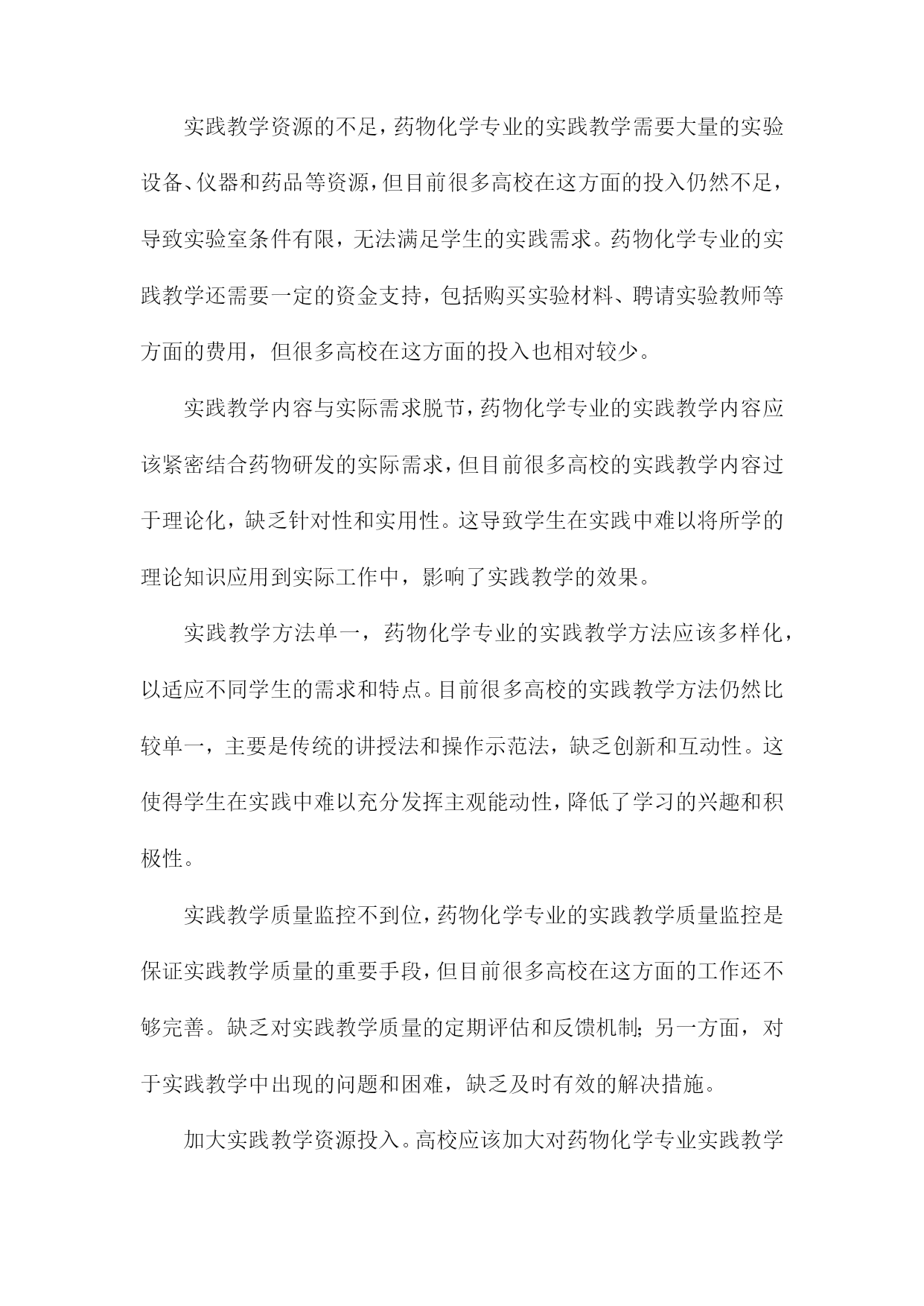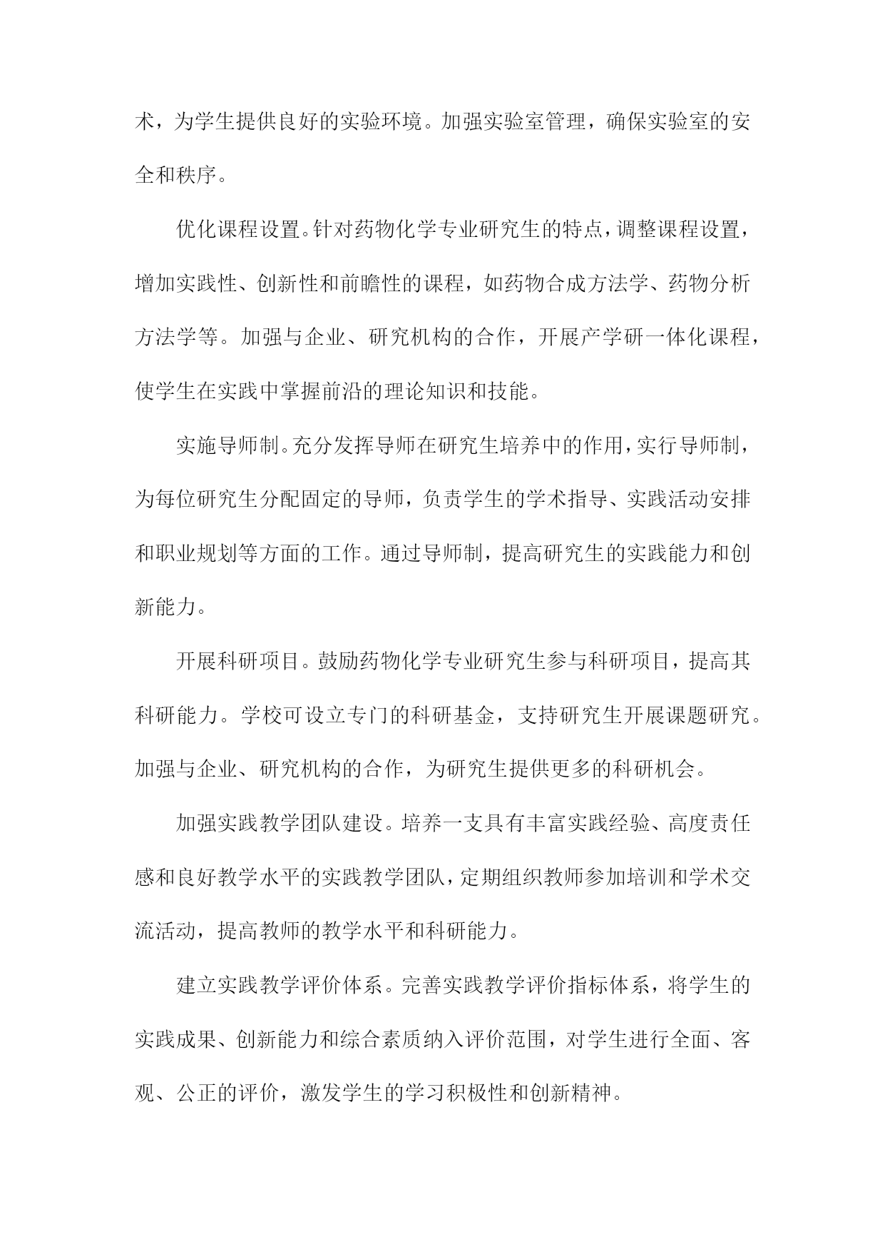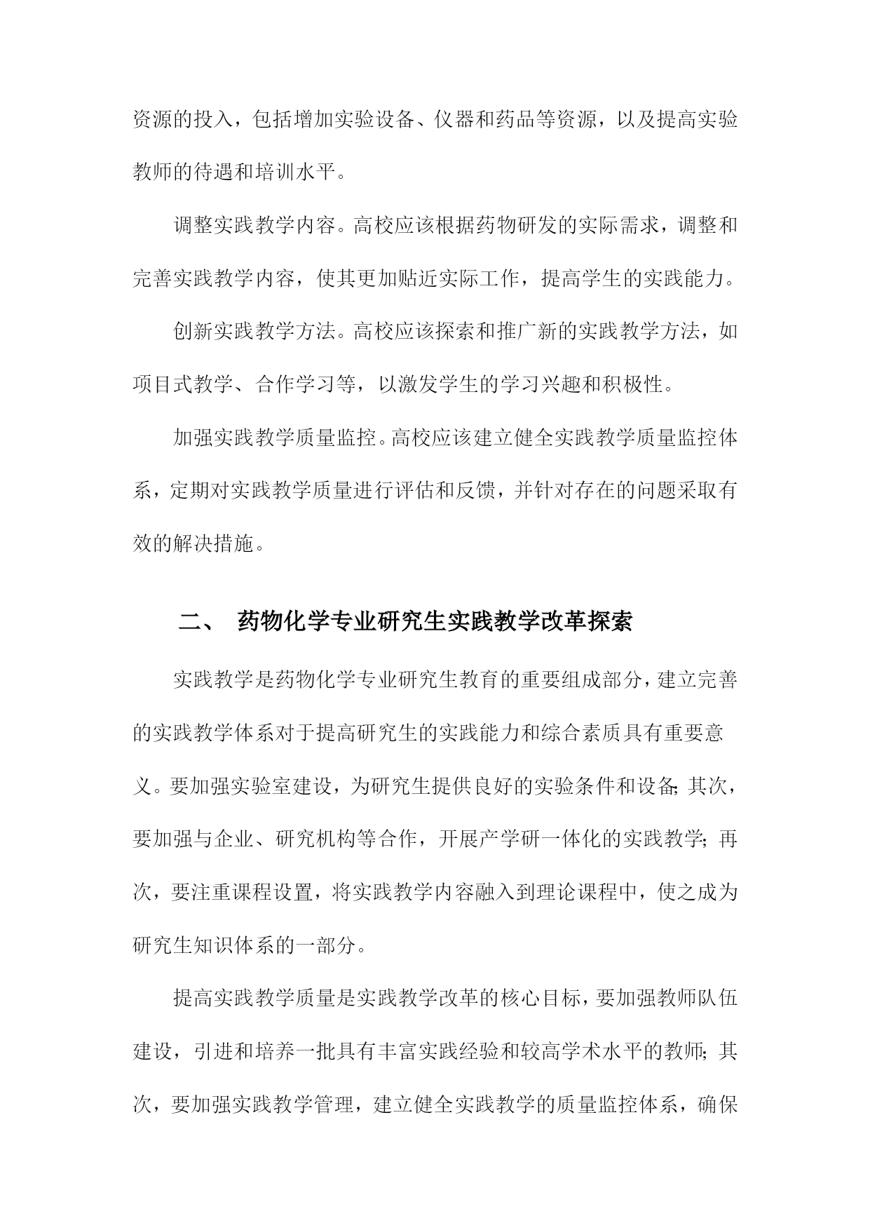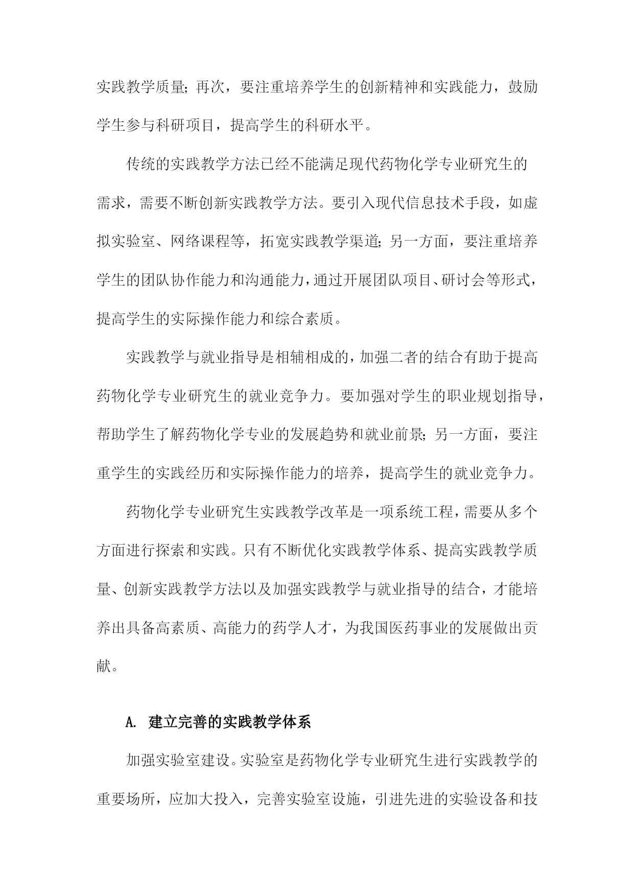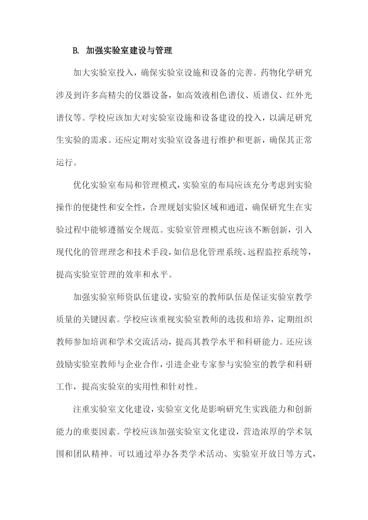 药物化学专业研究生培养的实践与思考一、药物化学专业研究生培养现状及问题分析随着科学技术的不断发展,药物化学作为一门重要的交叉学科,在医药、生物技术等领域具有广泛的应用前景。当前我国药物化学专业研究生培养面临着一定的问题和挑战。课程设置不合理:药物化学专业研究生的课程设置应以培养学生的专业技能和综合素质为主,但目前部分高校的课程设置过于注重理论知识的传授,缺乏实践性的教学环节,导致学生在毕业后进入工作岗位时,实际操作能力较弱。师资力量不足:药物化学专业研究生培养需要有一支高素质的教师队伍,但目前部分高校的药物化学专业教师数量较少,且部分教师的学术水平和教学经验有待提高。实验条件落后:药物化学专业的研究生需要进行大量的实验操作,但部分高校的实验室设施和实验条件相对落后,无法满足学生的实验需求,影响了学生的实践能力和创新能力的培养。产学研结合不够紧密:药物化学专业研究生培养应注重与产业界的合作与交流,但目前部分高校在这方面的工作开展不够积极,导致学生在毕业后进入企业工作时,对实际生产过程的理解和适应能力较弱。国际化视野不足:药物化学专业研究生培养应具备较强的国际化视野,但目前部分高校在这方面的工作还有待加强,导致学生在国际学术交流和合作中处于劣势地位。A.药物化学专业研究生培养目标和要求知识与技能:培养学生掌握药物化学的基本理论、基本知识和基本技能,具备较强的实验技能和科研能力,能在药物研发、生产、质量控制等领域从事研究、开发、管理等工作。思想品德:培养学生具有良好的道德品质,具备良好的职业道德和社会责任感,能积极参与社会实践,为国家和人民的事业做出贡献。创新能力:培养学生具备较强的创新意识和创新能力,能在药物化学领域开展创新性研究,为我国的药物产业发展做出贡献。国际视野:培养学生具备较强的国际视野,能在国际药物化学领域开展合作与交流,提高我国药物化学的国际地位。学术素养:学生应具备扎实的药物化学基础理论知识,熟悉药物化学领域的前沿动态,具备较强的文献查阅和分析能力。实验技能:学生应具备较强的实验操作能力,能独立完成药物化学实验,具备一定的实验室管理能力。科研能力:学生应具备较强的科研能力,能在导师指导下开展药物化学相关的研究工作,具备一定的论文写作能力。团队协作与沟通能力:学生应具备良好的团队协作精神,能够与他人有效沟通,共同完成研究任务。职业道德与社会责任感:学生应具备良好的职业道德,关注社会热点问题,具备一定的社会责任感。B.药物化学专业研究生培养模式分析随着科学技术的不断发展,药物化学专业在研究和开发新药方面发挥着越来越重要的作用。为了满足社会对药物化学专业人才的需求,我国高校纷纷开展药物化学专业研究生的培养工作。本文将对药物化学专业研究生培养模式进行分析,以期为我国药物化学专业研究生的培养提供一些有益的启示。药物化学专业研究生的课程设置应注重理论与实践相结合,既要保证学生掌握扎实的理论知识,又要培养学生的实际操作能力和创新能力。高校应加强实验教学环节的建设,提高实验教学质量,使学生在实验中能够熟练掌握药物化学的基本原理和实验技能。高校还应鼓励学生参加各类科研项目,通过参与实际项目的研究,提高学生的实践能力和创新能力。药物化学专业研究生的培养离不开优秀的导师队伍,高校应加强对导师队伍的建设和培养,选拔具有较高学术水平和丰富教学经验的教师担任导师,并对其进行定期的培训和考核。高校还应建立健全导师与研究生之间的沟通机制,鼓励导师关注研究生的成长和发展,为研究生提供良好的学术指导和生活帮助。药物化学专业研究生的培养应具备国际化的视野和本土化的特色。高校应引进国外先进的教育理念和教学方法,拓宽学生的国际视野;另一方面,高校还应结合我国国情和药物化学专业的特点,培养学生的本土化特色。通过这种方式,既能提高药物化学专业研究生的综合素质,又能为我国的药物化学事业培养出更多优秀人才。药物化学专业研究生的培养应注重产学研一体化,鼓励学生参与企业合作项目,将理论知识应用于实际生产过程中。通过这种方式,既能提高学生的实践能力,又能使学生更好地了解企业的需求,为今后的就业和发展奠定基础。高校还应加强创新人才培养,鼓励学生参与各类科技创新活动,培养学生的创新精神和创新能力。药物化学专业研究生的培养模式应注重课程设置与实践环节相结合、导师队伍建设与研究生培养相结合、国际化视野与本土化特色相结合以及产学研一体化与创新人才培养相结合。通过这些措施,有望为我国药物化学专业研究生的培养提供有益的借鉴和启示。C.药物化学专业研究生课程设置及教学质量评估基础课程:这些课程包括有机化学、物理化学、分析化学等,旨在为学生提供药物化学领域的基本知识和理论基础。还需要开设一些实验课程,以便学生能够在实践中巩固所学的理论知