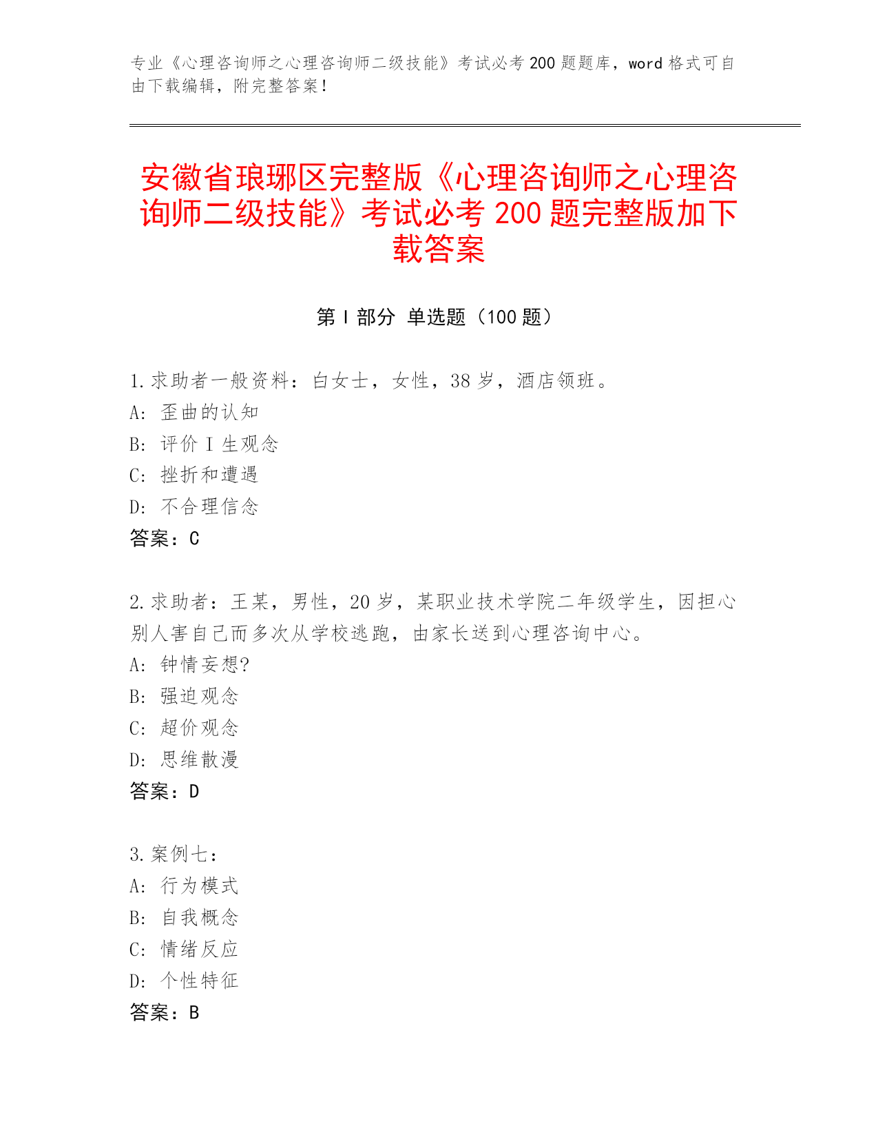安徽省琅琊区2024年《心理咨询师之心理咨询师二级技能》考试必考200题完整版(易错题)