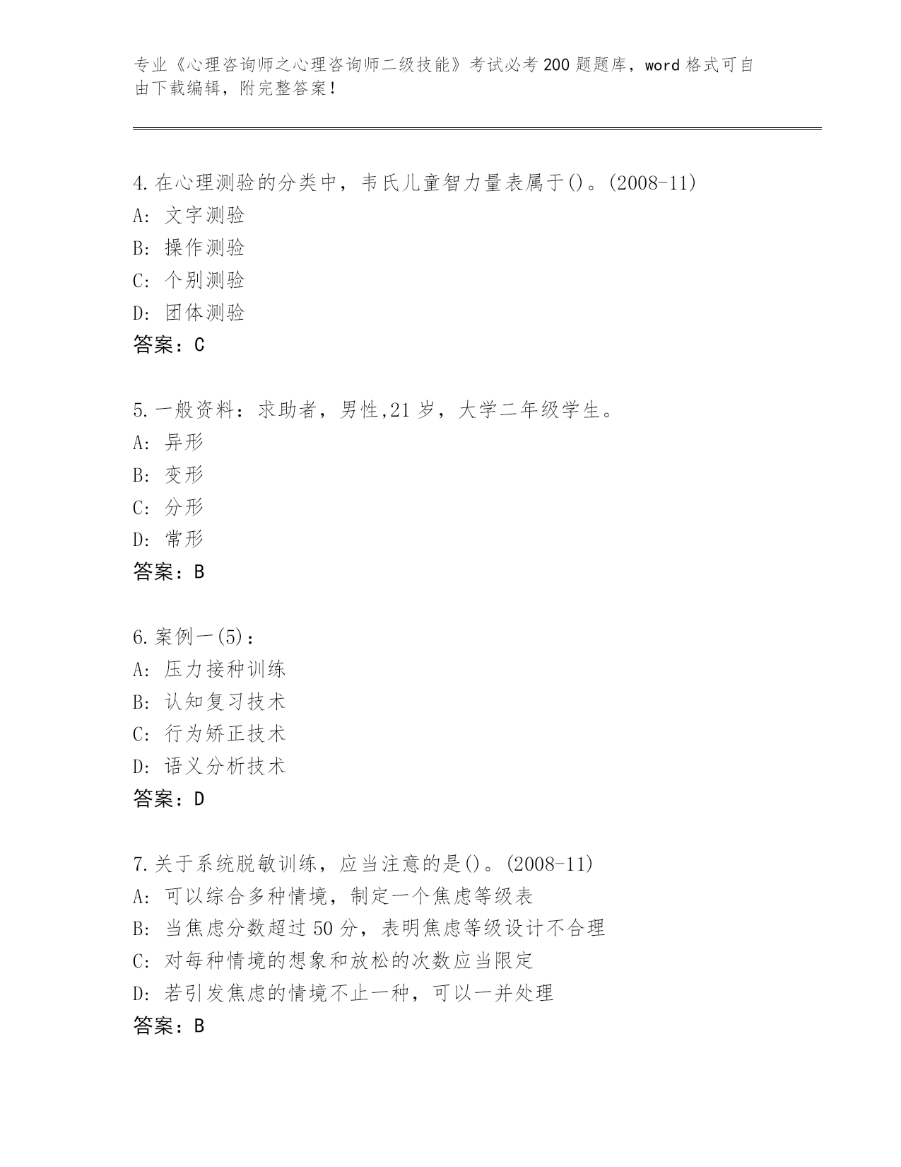 2024年青海省《心理咨询师之心理咨询师二级技能》考试必考200题完整版及答案下载