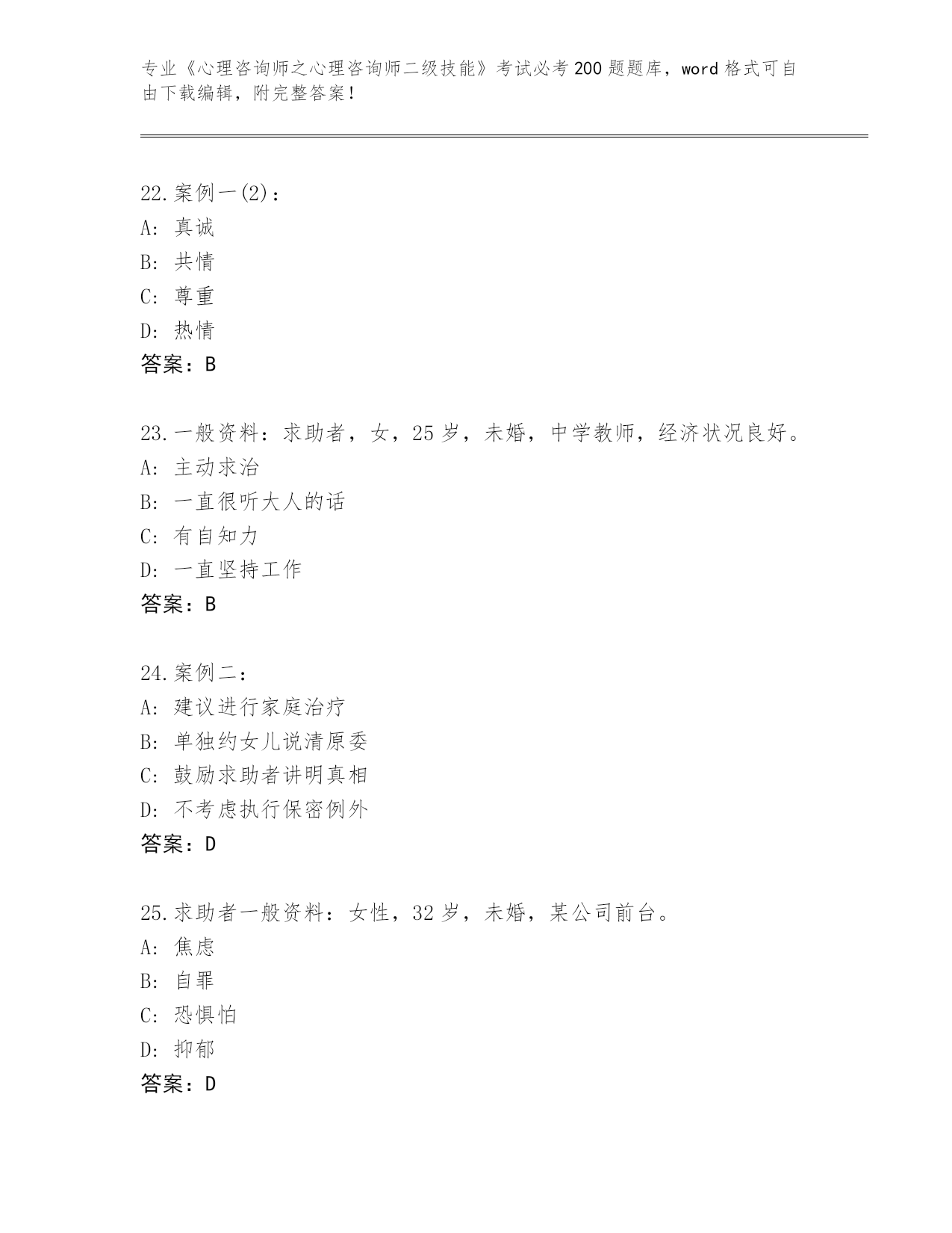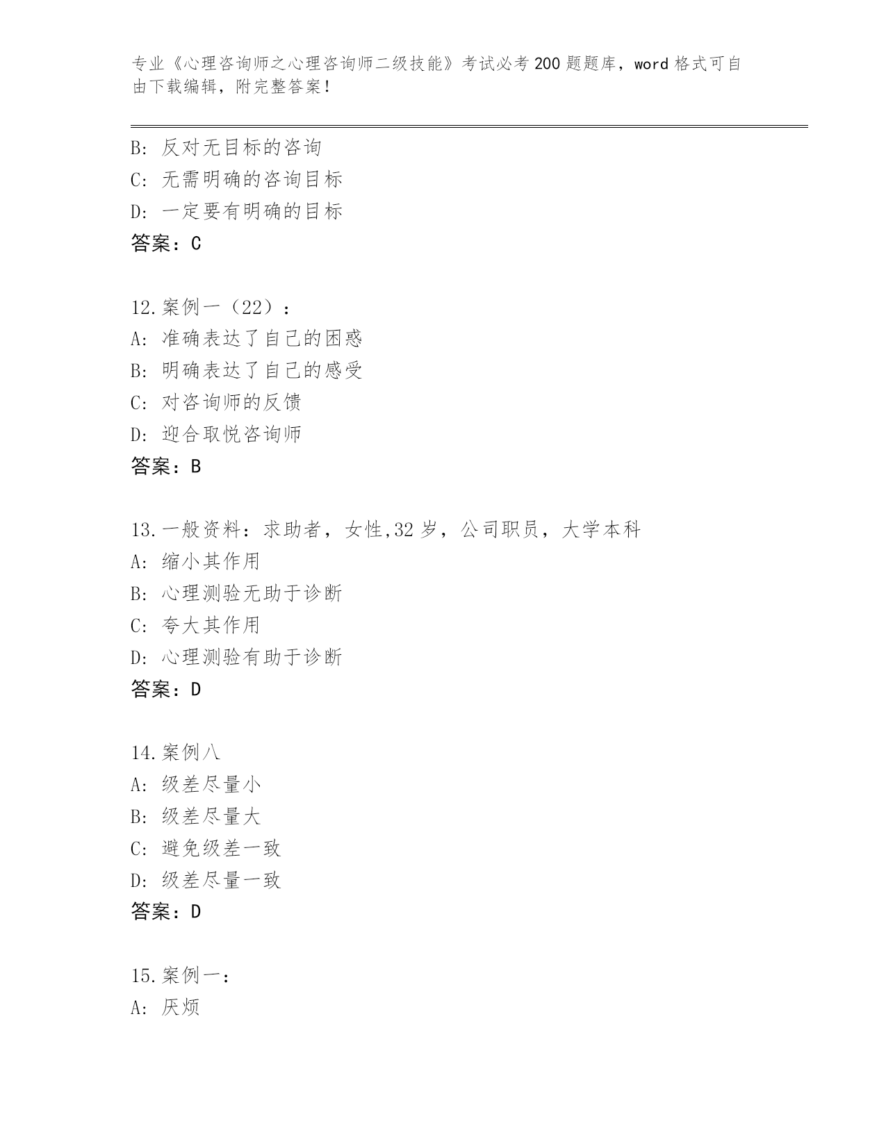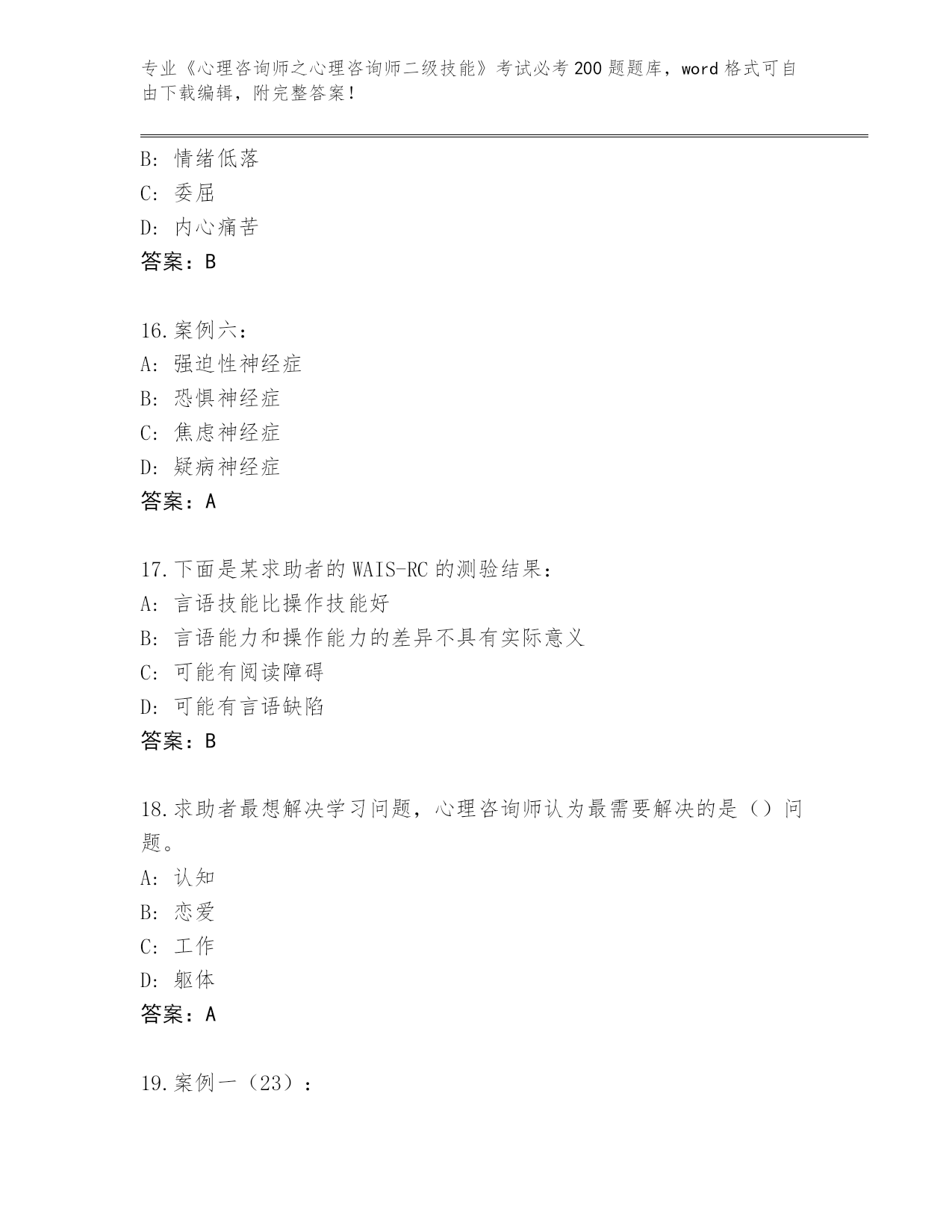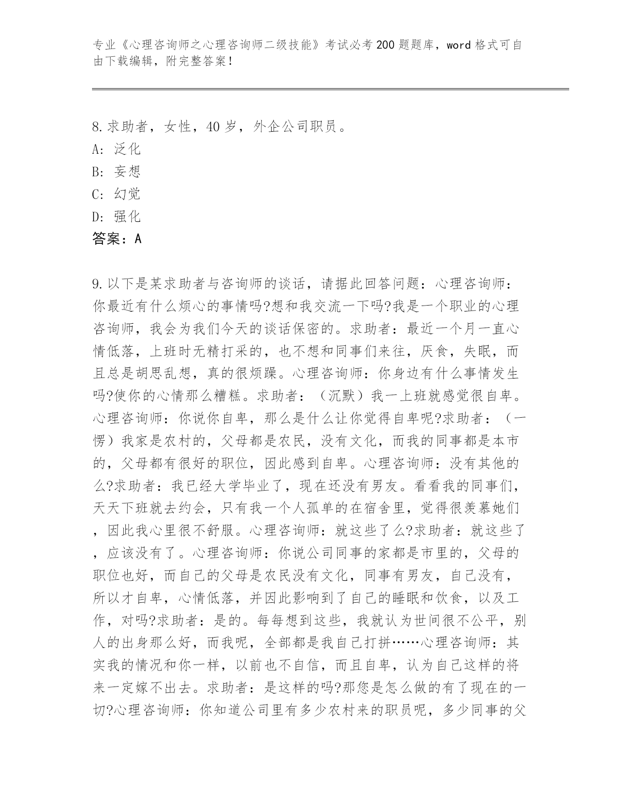 完整版安徽省《心理咨询师之心理咨询师二级技能》考试必考200题完整版及答案(名师系列)