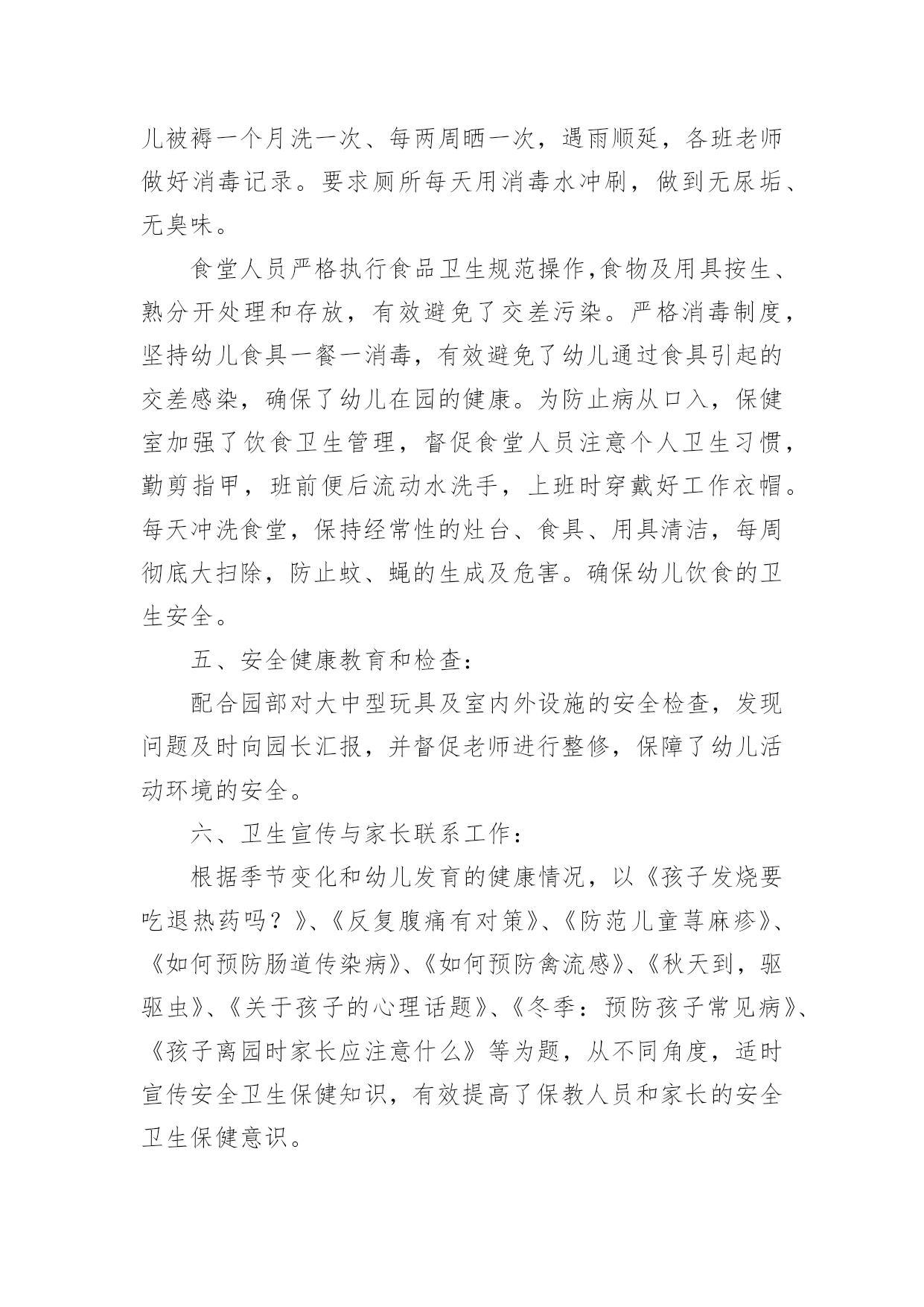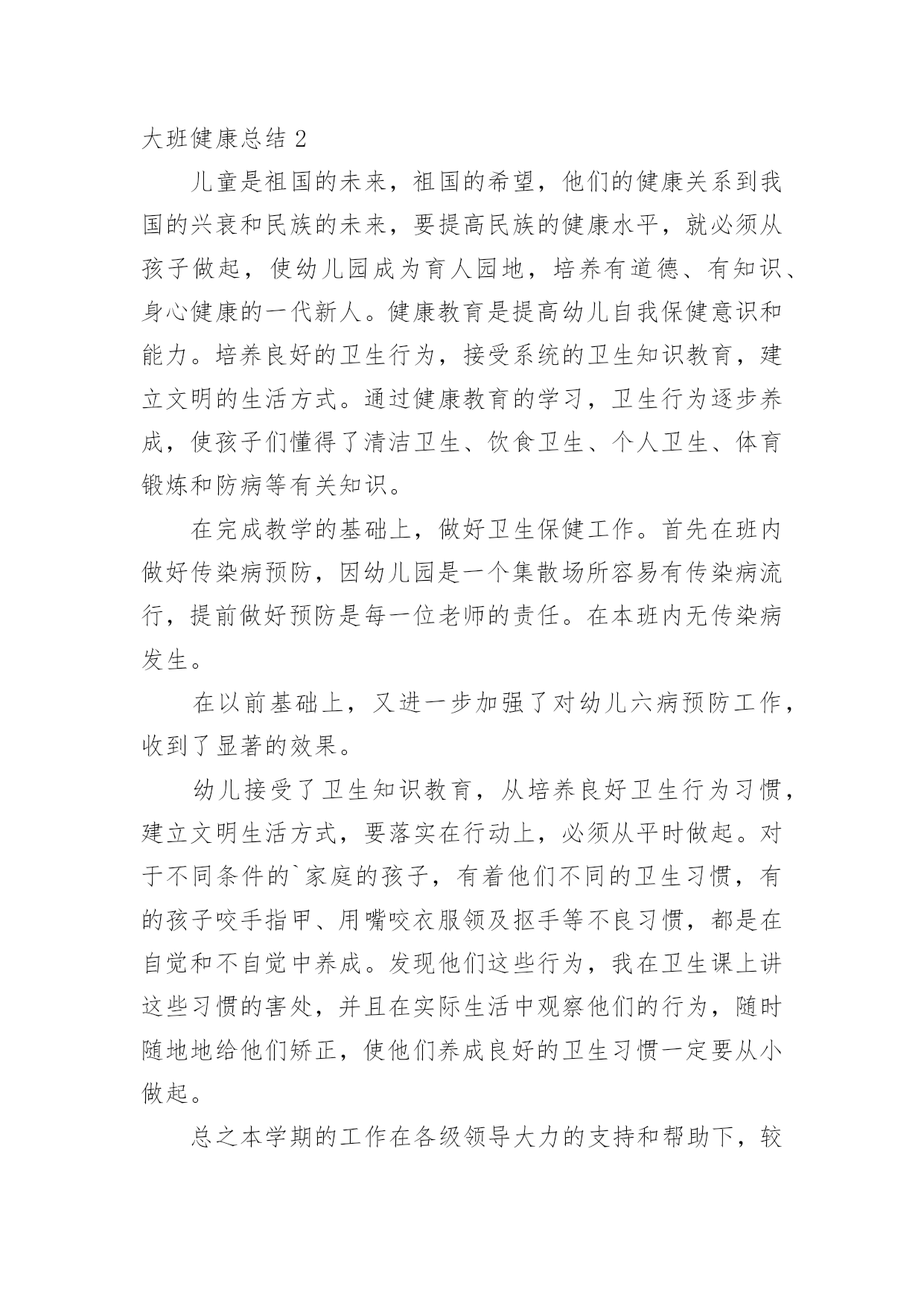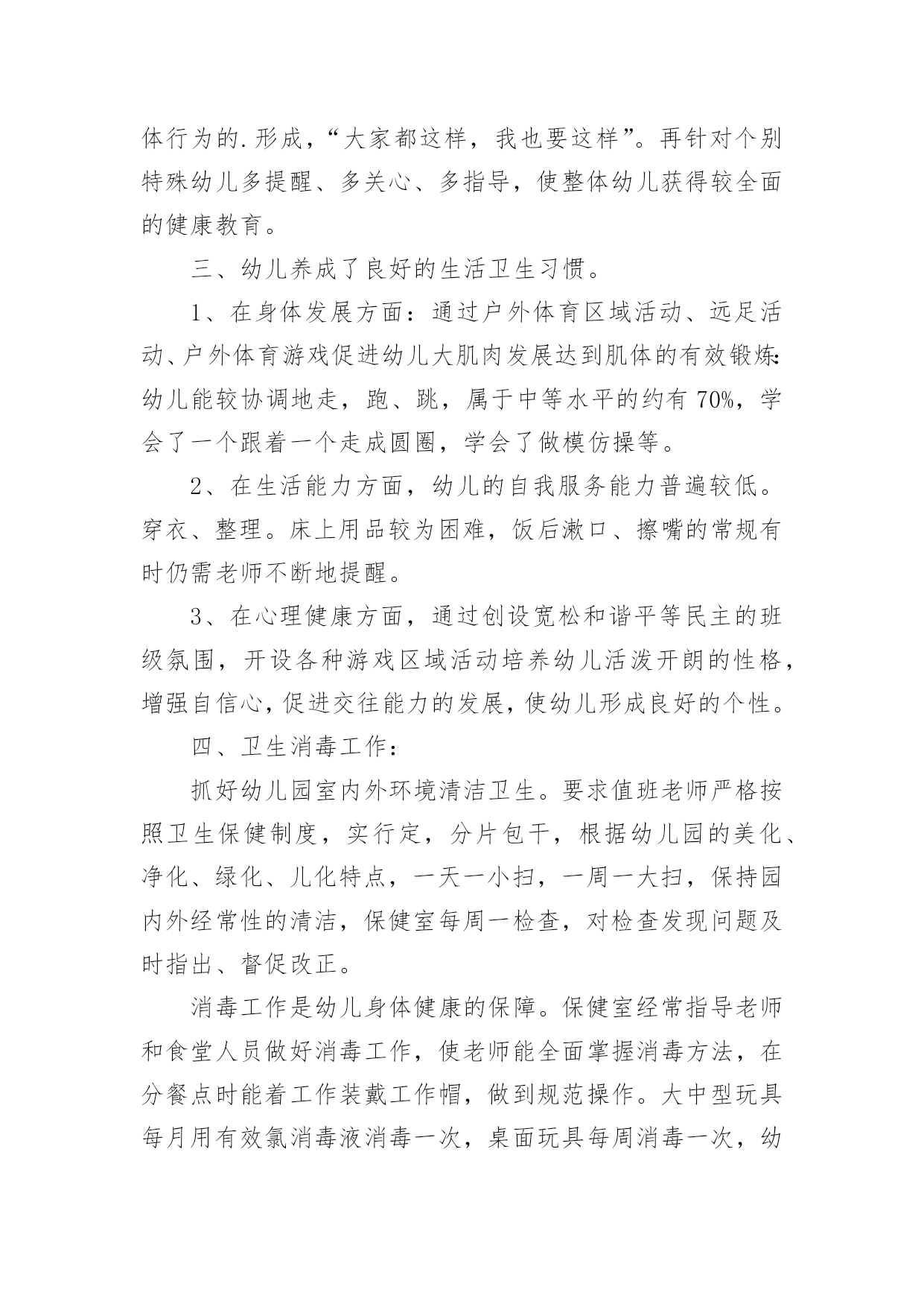 大班健康总结总结是对某一阶段的工作、学习或思想中的经验或情况进行分析研究的书面材料,通过它可以正确认识以往学习和工作中的优缺点,让我们抽出时间写写总结吧。你所见过的总结应该是什么样的?以下是小编为大家整理的大班健康总结,欢迎大家借鉴与参考,希望对大家有所帮助。大班健康总结120xx年5月23日,由教育科学学院、学生处、心理咨询中心联合承办第九届“5.25大学生心理健康周”系列活动正式开始,此活动以“阳光、友善、和谐、健康”为主题,倡导学生关注心理健康,形成关爱心灵的校园氛围。本次活动内容丰富,广大学生踊跃参与,收到了很好的效果。一、悬挂横幅,发放心理健康宣传单在文科楼与学生汉餐门口分别悬挂了以“我爱我,和谐心灵,健康成才”、“一切的成就,一切的财富,都始于健康的心理”的横幅。本次共印制彩色宣传单5000份,传单的内容包括:“心理咨询对大学生的帮助”、“宁夏师范学院学校心理健康教育资源简介”、“大学生如何提高人际关系能力”。由大学生心理协会的学生以一个宿舍6份的方式发到每个学生的手中,目的是让更多的学生了解学校的心理健康教育资源,掌握心理健康知识,懂得当遇到心理困惑时到心理咨询中心进行调节。二、心理健康讲座(一)“大学生情绪管理与压力调适”讲座20xx年5月27日晚在文科楼320教室举办了“大学生情绪管理与压力调适”讲座。20xx级小学教育专业的全体学习聆听了本次讲座。心理咨询中心教师李芳霞以“人非草木,孰能无情”之句展开了本次讲座。通过对情绪认识的讲解向同学们讲述了不良情绪的影响,并教会同学们如何识别情绪,调控情绪,做情绪的主人。李老师的讲座风趣幽默,现场笑声连连,掌声不断。通过此次讲座的成功举办,学生不仅对情绪有了新的认识,也学会如何调控自身情绪,做情绪的主人,本此讲座加强了院系学术交流的氛围,也促进了学生心理健康教育的发展。(二)“爱的成长”心理健康讲座20xx年6月5日下午2:30,心理咨询中心教师刘桂文老师,在逸夫楼312为化工学院20xx级学生开展关于“爱的成长”的讲座。讲座共分四部分的内容,第一,如何理解爱情;第二,如何在爱中成长;第三,大学生的恋爱观;第四,爱的能力的培养。讲座开始,刘老师先播放一段歌曲“最浪漫的事”,在美妙的音乐的映衬下,引出了“爱的成长”的话题,在整个讲座的过程中,刘老师用朴实,生动的'语言为大家讲解关于对爱情的理解,大学生如何鉴别真正的爱情,如何让爱情保鲜,如何正确看待分手及怎样增强心理承受能力等,帮助大家解决了一些在日常生活中遇到的矛盾与困惑。这次讲座使大家对爱情有了全面的了解,明白了想要对别人付出爱,自己就应该储存爱,爱身边的人,从爱自己开始!本次讲座受到了学生一致的好评。三、开展以“提高人际关系能力训练营”为主题的团体辅导20xx年6月6日下午4:30,心理咨询中心教师刘桂文老师,在逸夫楼模拟法庭举行了以“提高人际关系能力训练营”为主题的心理健康教育活动。政法学院的同学参与了本次活动。刘桂文通过做游戏的方法测验了同学们的心理健康状况以及同学们之间的团结情况,通过刮大风、滚雪球、棒打薄情郎等游戏的开展,有效地促进了学生的团队精神,同时也锻炼了同学们的行为敏捷程度。刘老师细心指导,同学们主动参与、积极配合,活动在一片轻松愉快的氛围中进行着。游戏结束后,刘桂文对本次活动做了简要的总结,向同学们指出了加强人际交往能力的重要性。总之,在教育科学学院、学生处的大力支持下,本届心理健康活动取得了圆满成功。通过本次活动,让更多的学生了解了学校心理咨询中心的工作职能,掌握了基本的心理健康知识,同时对于提升我校学生心理健康水平,营造健康的校园文化氛围起到了积极的促进作用。大班健康总结2儿童是祖国的未来,祖国的希望,他们的健康关系到我国的兴衰和民族的未来,要提高民族的健康水平,就必须从孩子做起,使幼儿园成为育人园地,培养有道德、有知识、身心健康的一代新人。健康教育是提高幼儿自我保健意识和能力。培养良好的卫生行为,接受系统的卫生知识教育,建立文明的生活方式。通过健康教育的学习,卫生行为逐步养成,使孩子们懂得了清洁卫生、饮食卫生、个人卫生、体育锻炼和防病等有关知识。在完成教学的基础上,做好卫生保健工作。首先在班内做好传染病预防,因幼儿园是一个集散场所容易有传染病流行,提前做好预防是每一位老师的责任。在本班内无传染病发生。在以前基础上,又进一步加强了对幼儿六病预防工作,收到了显著的效果。幼儿接受了卫生知识教育,从培养良好卫生行为习惯,建立文明生活方式,要落实在行动上,必须从平时做起。对于不同条件的`家庭的孩子,有着他们不同的卫生习惯,有的孩子咬手指甲、用嘴咬衣服领及抠手等不良习惯,都是在自觉和不自觉中养成。发现他们这些行为,我在卫生课上讲这些习惯的害处,并且在实际生活中观察他们的行为,随时随地地给他们矫正,使