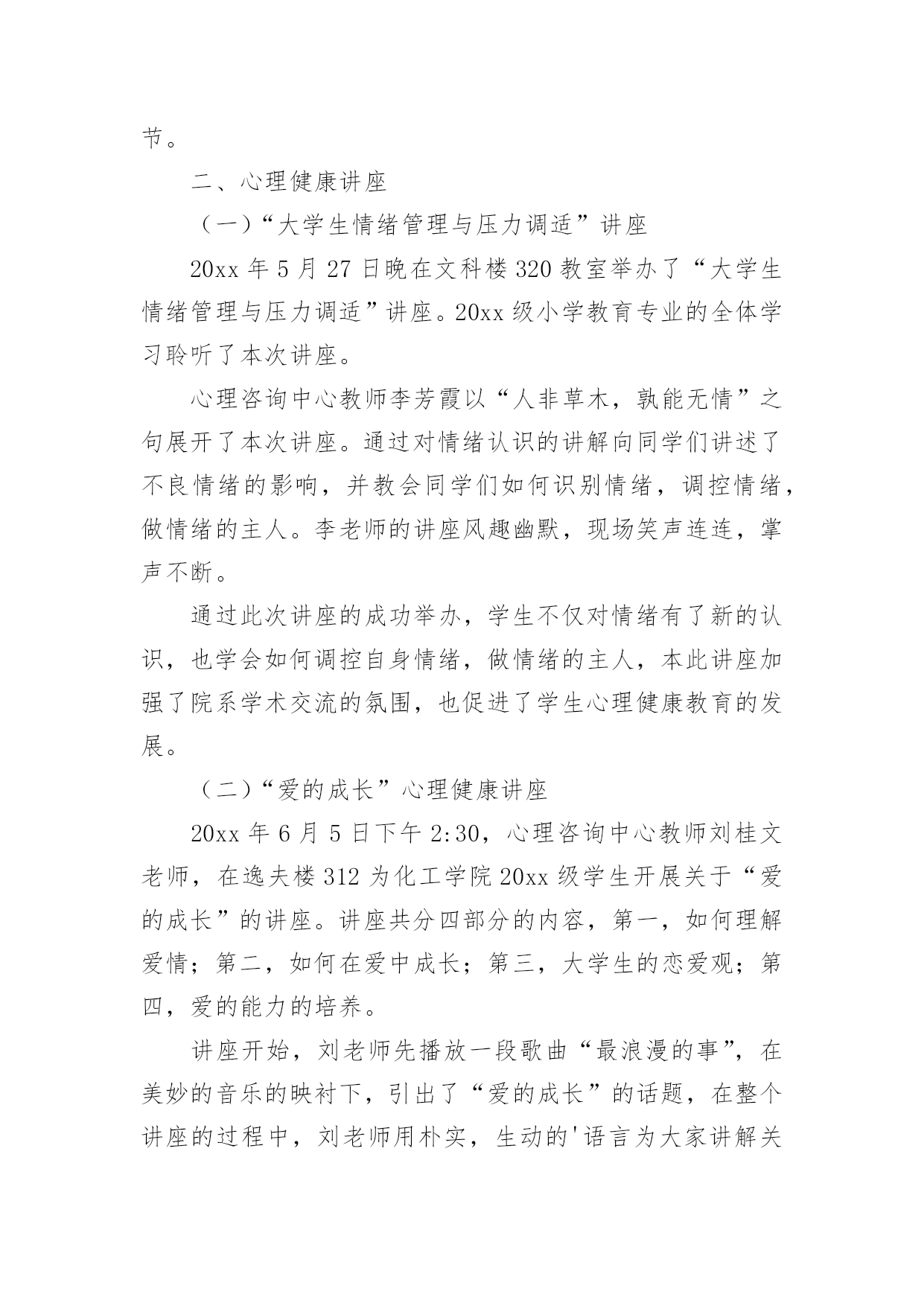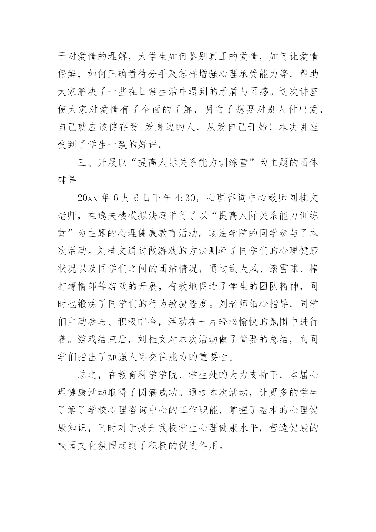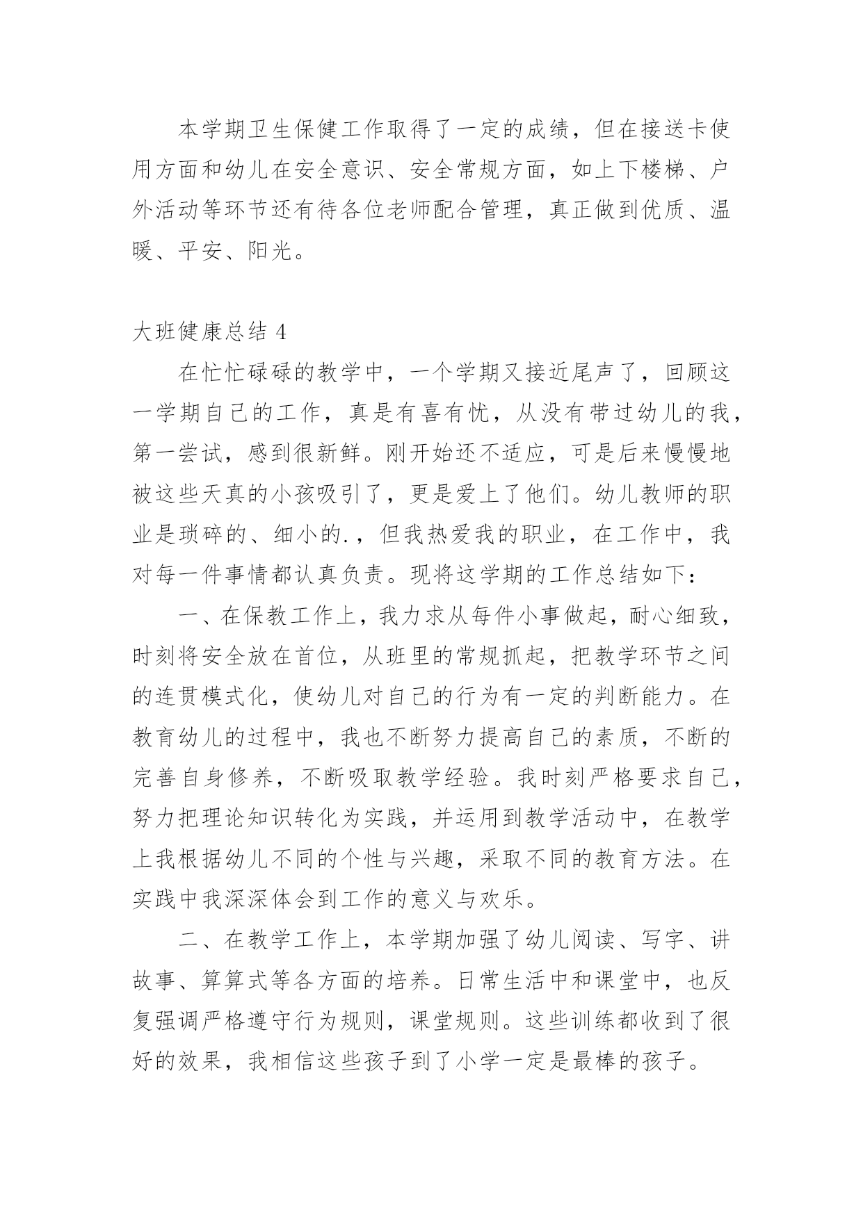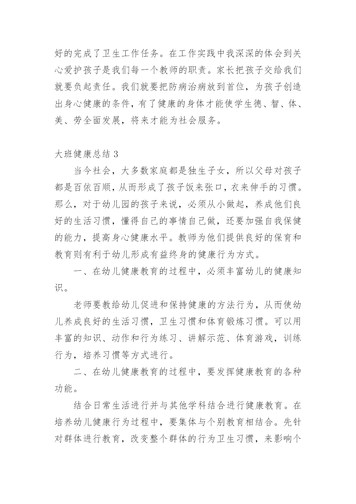 大班健康总结总结是对某一阶段的工作、学习或思想中的经验或情况进行分析研究的书面材料,通过它可以正确认识以往学习和工作中的优缺点,让我们抽出时间写写总结吧。你所见过的总结应该是什么样的?以下是小编为大家整理的大班健康总结,欢迎大家借鉴与参考,希望对大家有所帮助。大班健康总结120xx年5月23日,由教育科学学院、学生处、心理咨询中心联合承办第九届“5.25大学生心理健康周”系列活动正式开始,此活动以“阳光、友善、和谐、健康”为主题,倡导学生关注心理健康,形成关爱心灵的校园氛围。本次活动内容丰富,广大学生踊跃参与,收到了很好的效果。一、悬挂横幅,发放心理健康宣传单在文科楼与学生汉餐门口分别悬挂了以“我爱我,和谐心灵,健康成才”、“一切的成就,一切的财富,都始于健康的心理”的横幅。本次共印制彩色宣传单5000份,传单的内容包括:“心理咨询对大学生的帮助”、“宁夏师范学院学校心理健康教育资源简介”、“大学生如何提高人际关系能力”。由大学生心理协会的学生以一个宿舍6份的方式发到每个学生的手中,目的是让更多的学生了解学校的心理健康教育资源,掌握心理健康知识,懂得当遇到心理困惑时到心理咨询中心进行调节。二、心理健康讲座(一)“大学生情绪管理与压力调适”讲座20xx年5月27日晚在文科楼320教室举办了“大学生情绪管理与压力调适”讲座。20xx级小学教育专业的全体学习聆听了本次讲座。心理咨询中心教师李芳霞以“人非草木,孰能无情”之句展开了本次讲座。通过对情绪认识的讲解向同学们讲述了不良情绪的影响,并教会同学们如何识别情绪,调控情绪,做情绪的主人。李老师的讲座风趣幽默,现场笑声连连,掌声不断。通过此次讲座的成功举办,学生不仅对情绪有了新的认识,也学会如何调控自身情绪,做情绪的主人,本此讲座加强了院系学术交流的氛围,也促进了学生心理健康教育的发展。(二)“爱的成长”心理健康讲座20xx年6月5日下午2:30,心理咨询中心教师刘桂文老师,在逸夫楼312为化工学院20xx级学生开展关于“爱的成长”的讲座。讲座共分四部分的内容,第一,如何理解爱情;第二,如何在爱中成长;第三,大学生的恋爱观;第四,爱的能力的培养。讲座开始,刘老师先播放一段歌曲“最浪漫的事”,在美妙的音乐的映衬下,引出了“爱的成长”的话题,在整个讲座的过程中,刘老师用朴实,生动的'语言为大家讲解关于对爱情的理解,大学生如何鉴别真正的爱情,如何让爱情保鲜,如何正确看待分手及怎样增强心理承受能力等,帮助大家解决了一些在日常生活中遇到的矛盾与困惑。这次讲座使大家对爱情有了全面的了解,明白了想要对别人付出爱,自己就应该储存爱,爱身边的人,从爱自己开始!本次讲座受到了学生一致的好评。三、开展以“提高人际关系能力训练营”为主题的团体辅导20xx年6月6日下午4:30,心理咨询中心教师刘桂文老师,在逸夫楼模拟法庭举行了以“提高人际关系能力训练营”为主题的心理健康教育活动。政法学院的同学参与了本次活动。刘桂文通过做游戏的方法测验了同学们的心理健康状况以及同学们之间的团结情况,通过刮大风、滚雪球、棒打薄情郎等游戏的开展,有效地促进了学生的团队精神,同时也锻炼了同学们的行为敏捷程度。刘老师细心指导,同学们主动参与、积极配合,活动在一片轻松愉快的氛围中进行着。游戏结束后,刘桂文对本次活动做了简要的总结,向同学们指出了加强人际交往能力的重要性。总之,在教育科学学院、学生处的大力支持下,本届心理健康活动取得了圆满成功。通过本次活动,让更多的学生了解了学校心理咨询中心的工作职能,掌握了基本的心理健康知识,同时对于提升我校学生心理健康水平,营造健康的校园文化氛围起到了积极的促进作用。大班健康总结2儿童是祖国的未来,祖国的希望,他们的健康关系到我国的兴衰和民族的未来,要提高民族的健康水平,就必须从孩子做起,使幼儿园成为育人园地,培养有道德、有知识、身心健康的一代新人。健康教育是提高幼儿自我保健意识和能力。培养良好的卫生行为,接受系统的卫生知识教育,建立文明的生活方式。通过健康教育的学习,卫生行为逐步养成,使孩子们懂得了清洁卫生、饮食卫生、个人卫生、体育锻炼和防病等有关知识。在完成教学的基础上,做好卫生保健工作。首先在班内做好传染病预防,因幼儿园是一个集散场所容易有传染病流行,提前做好预防是每一位老师的责任。在本班内无传染病发生。在以前基础上,又进一步加强了对幼儿六病预防工作,收到了显著的效果。幼儿接受了卫生知识教育,从培养良好卫生行为习惯,建立文明生活方式,要落实在行动上,必须从平时做起。对于不同条件的`家庭的孩子,有着他们不同的卫生习惯,有的孩子咬手指甲、用嘴咬衣服领及抠手等不良习惯,都是在自觉和不自觉中养成。发现他们这些行为,我在卫生课上讲这些习惯的害处,并且在实际生活中观察他们的行为,随时随地地给他们矫正,使