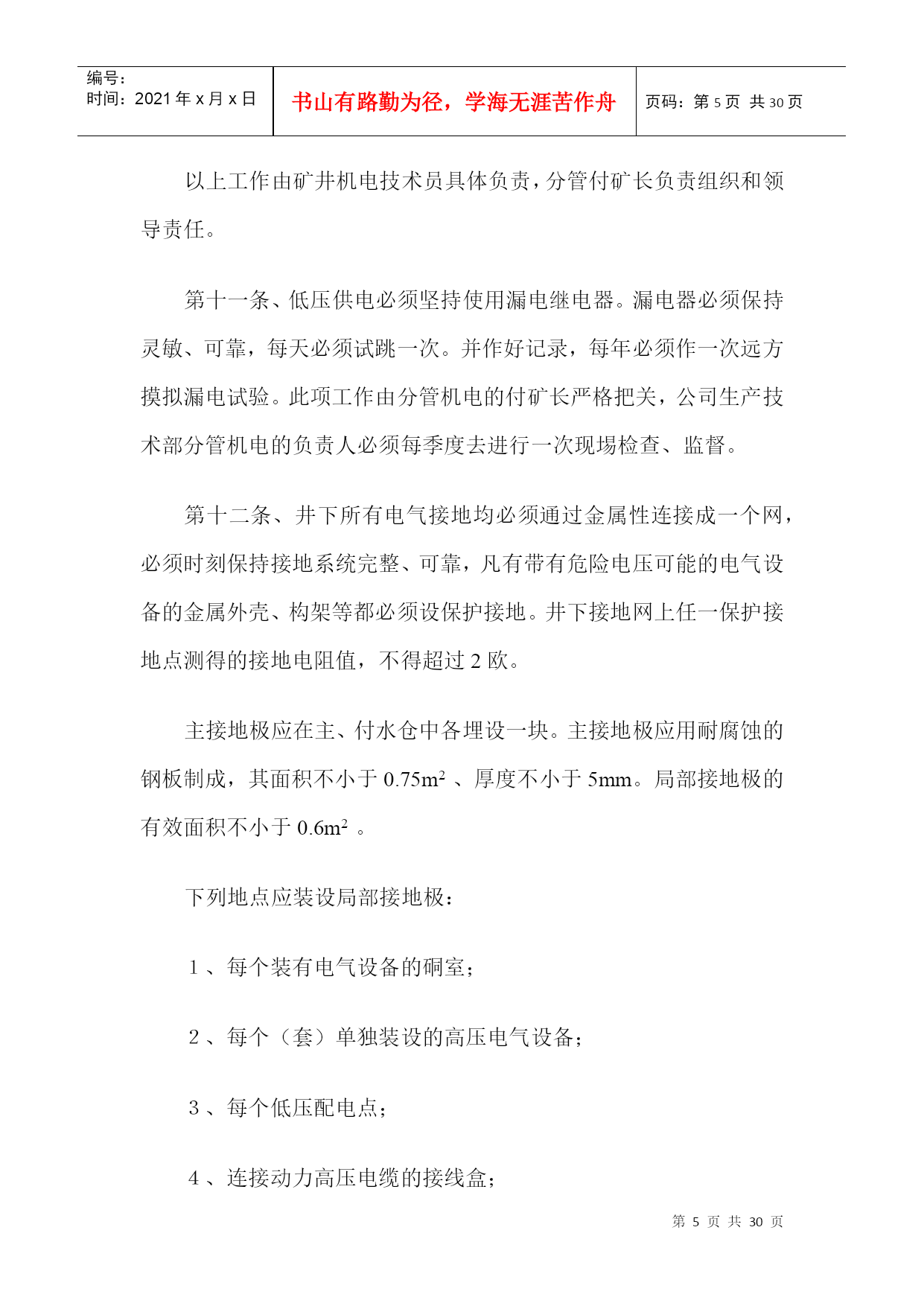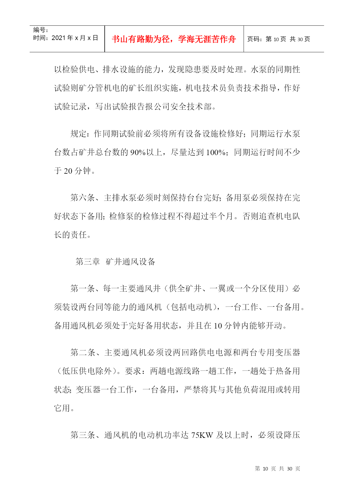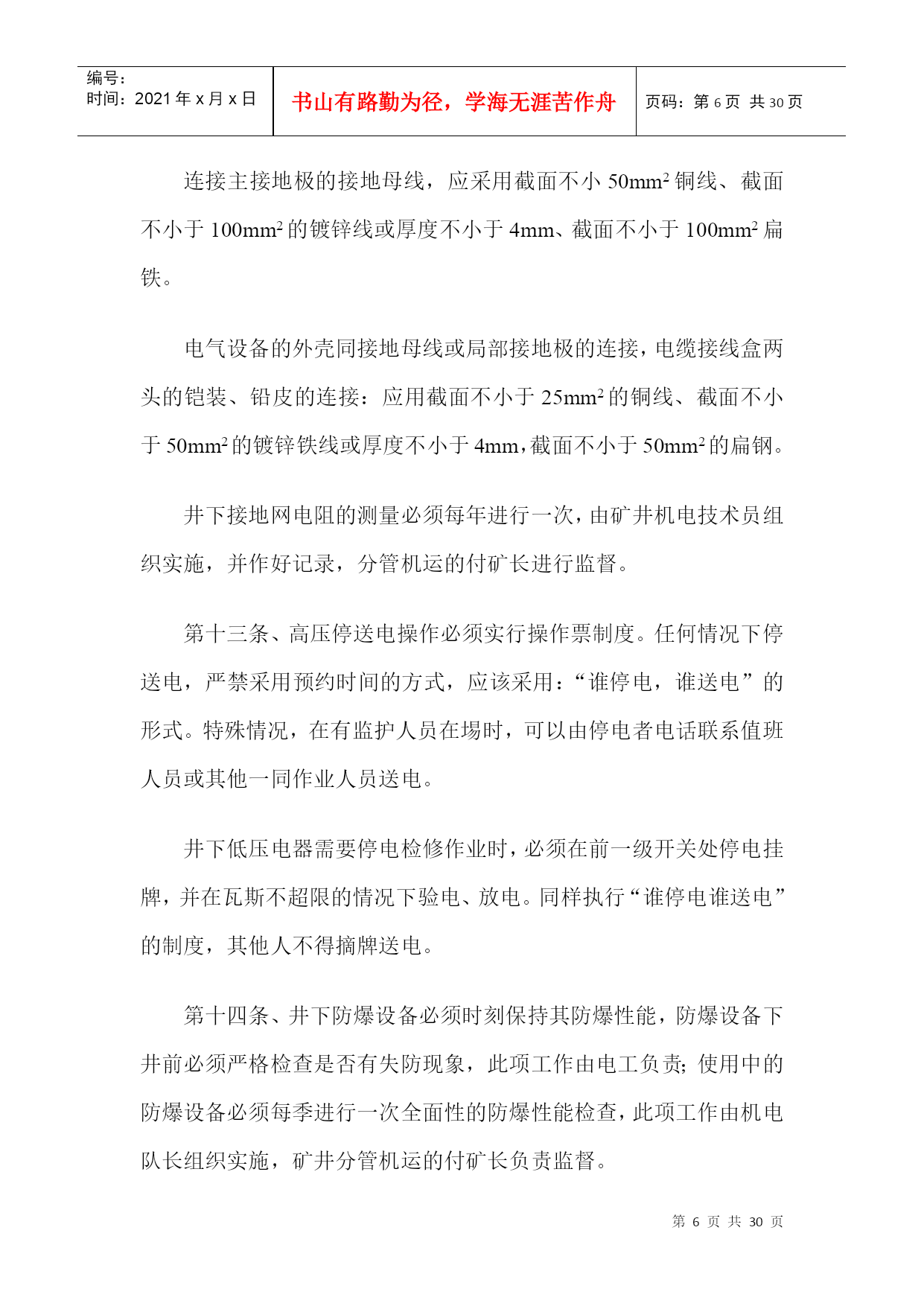 编号:时间:2021年x月x日书山有路勤为径,学海无涯苦作舟页码:第PAGE30页共NUMPAGES30页第PAGE\*MERGEFORMAT30页共NUMPAGES\*MERGEFORMAT30页机电运输管理技术规范目录第一章井下供电第二章矿井排水第三章矿井通风第四章矿井运输管理第一节倾斜井第二节立井第三节罐笼第四节斜井人车第五节架空人车第六节平巷及电机车第七节钢丝绳第八节小绞车第九节一坡三挡第十节运输轨道第一章井下供电第一条:地面向井下供电必须设有两趟以上(包括两趟)主供电缆,每趟电缆都有必须能够当负起,全井的最大负荷(注:最大负荷时电缆中的电流密度铝芯不超过2A/mm2铜芯不超过3A/mm2)。第二条:井下设有主排水泵的水平,其中央变电所必须设有两趟独立的主供电源,其中一趟必须从地面配电房直供,确实没有条件直供而需要从其他水平转供时,则两趟电源必须来自转供点的不同母线。第三条、采用环路供电时,其每趟主供电缆必须满足第一条的要求,其联络电缆必须能负载与其相联负荷较大一端的最大负荷。第四条、主供电缆和水平联络电缆必须经常保持完好无损,具体要求如下:1、中部接头规定为:立井供电电缆其井筒中部不允许有接头,其他处的中部电缆不允许超过两个;斜井供电电缆其全程的中部接头不得超过两个。2、主电缆的中部接头和端部接头,必须采用树脂胶或比其性能更好的代用品浇灌,不允许采用沥青胶替代。中部接头芯线的连接必须采用套管压接。3、主供和联络电缆必须时刻处于带电(热备用)状态。4、主供和联络电缆必须每年作一次预防性试验,其试验项目主要包括:绝缘电阻测定、直流耐压试验并测量泄漏电流、检查电缆线路的相位。试验值必须达到原煤炭部1998年制定的《电缆的试验项目、周期和标准》要求。凡达不到要求的电缆必须无条件退出运行。该项工作由矿井机运付矿长负责组织实施,矿机电技术员负责技术和记录上报等到工作。第六条、井下中央变电所内作母线或联接线的电缆必须彩与主供电缆同型号的电缆,电缆的过流面积必须经过验算,能满足流过该母线或联接接线的最大电流值的发热条件。第七条、井下低压动力优先采用660伏电源,现个别井下(或局部)的主要设备仍采用380伏电源者,应立即改为660伏电源。井下低压供电距离超过1000米时,应设立采区变电所(开拓时的临时供电除外)。第八条、各种控制开头的容量必须满足下列条件:1、地面供井下的主油开关的额定电流值应不小于其最在负荷电流(不考虑大负荷起动的电流)的3倍。2、井下各水平的总开关或联络开关的额定电流值均应不小于通过其最大负荷电流(不考虑大负荷的起动电流)的2倍。3、各起动开关的额定电流值不得小于所控负载额定电流的3倍。第九条、各控制开关的保护装置必须满足下列条件:1、各种高低压总开关、联络开关、线路分开关、动力变压器控制开关必须设有可靠的过流保护装置。2、各种起动开关除有过流保护外,还必须设有失压保护,低压起动开关还应设过负荷保护。3、无论是线路还是负载均必须设主保护和后备保护,严禁简化和甩开保护装置。第十条、新装各种控制开关必须在使用前对其进行整定值计算并对保护装置进行试验和整定。使用过程中的各种控制开关必须每季度进行一次整定值校验,每半年必须对矿井的整个供电系统的过电流保护进行一次系统地计算和整定,并画出供电系统图,图上标出各整定值。以上工作由矿井机电技术员具体负责,分管付矿长负责组织和领导责任。第十一条、低压供电必须坚持使用漏电继电器。漏电器必须保持灵敏、可靠,每天必须试跳一次。并作好记录,每年必须作一次远方摸拟漏电试验。此项工作由分管机电的付矿长严格把关,公司生产技术部分管机电的负责人必须每季度去进行一次现埸检查、监督。第十二条、井下所有电气接地均必须通过金属性连接成一个网,必须时刻保持接地系统完整、可靠,凡有带有危险电压可能的电气设备的金属外壳、构架等都必须设保护接地。井下接地网上任一保护接地点测得的接地电阻值,不得超过2欧。主接地极应在主、付水仓中各埋设一块。主接地极应用耐腐蚀的钢板制成,其面积不小于0.75m2、厚度不小于5mm。局部接地极的有效面积不小于0.6m2。下列地点应装设局部接地极:1、每个装有电气设备的硐室;2、每个(套)单独装设的高压电气设备;3、每个低压配电点;4、连接动力高压电缆的接线盒;连接主接地极的接地母线,应采用截面不小50mm2铜线、截面不小于100mm2的镀锌线或厚度不小于4mm、截面不小于100mm2扁铁。电气设备的外壳同接地母线或局部接地极的连接,电缆接线盒两头的铠装、铅皮的连接:应用截面不小于25mm2的铜线、截面不小于50mm2的镀锌铁线或厚度不小于4mm,截面不小于