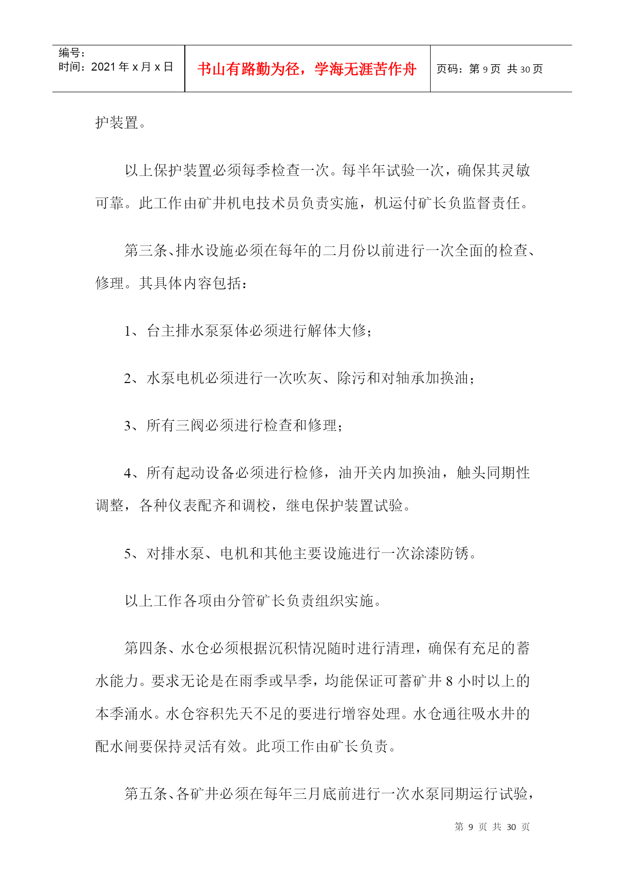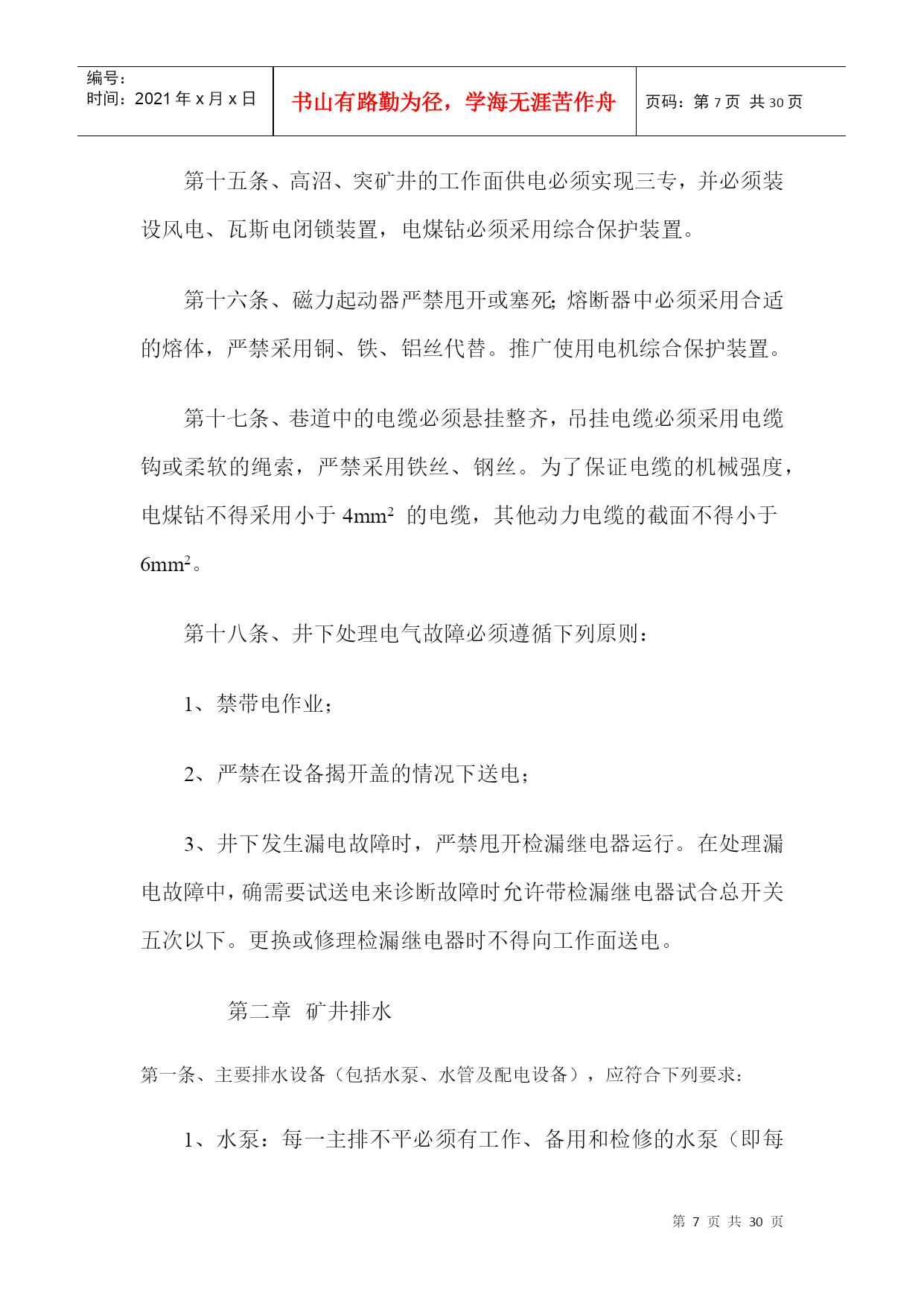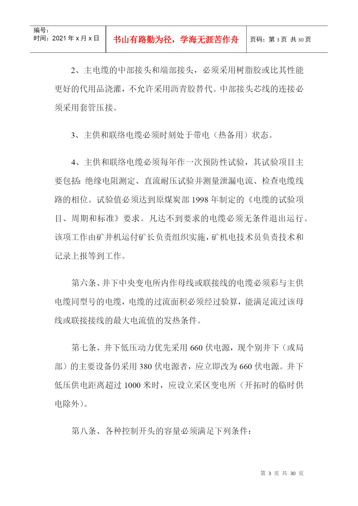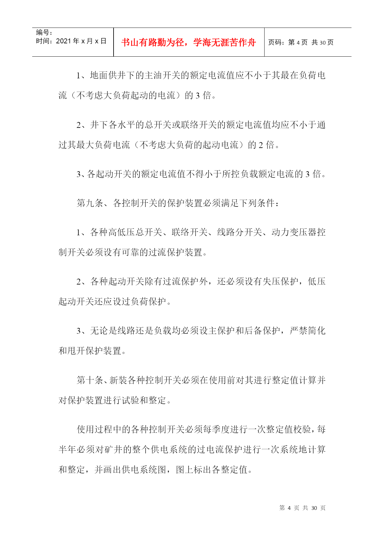 编号:时间:2021年x月x日书山有路勤为径,学海无涯苦作舟页码:第PAGE30页共NUMPAGES30页第PAGE\*MERGEFORMAT30页共NUMPAGES\*MERGEFORMAT30页机电运输管理技术规范目录第一章井下供电第二章矿井排水第三章矿井通风第四章矿井运输管理第一节倾斜井第二节立井第三节罐笼第四节斜井人车第五节架空人车第六节平巷及电机车第七节钢丝绳第八节小绞车第九节一坡三挡第十节运输轨道第一章井下供电第一条:地面向井下供电必须设有两趟以上(包括两趟)主供电缆,每趟电缆都有必须能够当负起,全井的最大负荷(注:最大负荷时电缆中的电流密度铝芯不超过2A/mm2铜芯不超过3A/mm2)。第二条:井下设有主排水泵的水平,其中央变电所必须设有两趟独立的主供电源,其中一趟必须从地面配电房直供,确实没有条件直供而需要从其他水平转供时,则两趟电源必须来自转供点的不同母线。第三条、采用环路供电时,其每趟主供电缆必须满足第一条的要求,其联络电缆必须能负载与其相联负荷较大一端的最大负荷。第四条、主供电缆和水平联络电缆必须经常保持完好无损,具体要求如下:1、中部接头规定为:立井供电电缆其井筒中部不允许有接头,其他处的中部电缆不允许超过两个;斜井供电电缆其全程的中部接头不得超过两个。2、主电缆的中部接头和端部接头,必须采用树脂胶或比其性能更好的代用品浇灌,不允许采用沥青胶替代。中部接头芯线的连接必须采用套管压接。3、主供和联络电缆必须时刻处于带电(热备用)状态。4、主供和联络电缆必须每年作一次预防性试验,其试验项目主要包括:绝缘电阻测定、直流耐压试验并测量泄漏电流、检查电缆线路的相位。试验值必须达到原煤炭部1998年制定的《电缆的试验项目、周期和标准》要求。凡达不到要求的电缆必须无条件退出运行。该项工作由矿井机运付矿长负责组织实施,矿机电技术员负责技术和记录上报等到工作。第六条、井下中央变电所内作母线或联接线的电缆必须彩与主供电缆同型号的电缆,电缆的过流面积必须经过验算,能满足流过该母线或联接接线的最大电流值的发热条件。第七条、井下低压动力优先采用660伏电源,现个别井下(或局部)的主要设备仍采用380伏电源者,应立即改为660伏电源。井下低压供电距离超过1000米时,应设立采区变电所(开拓时的临时供电除外)。第八条、各种控制开头的容量必须满足下列条件:1、地面供井下的主油开关的额定电流值应不小于其最在负荷电流(不考虑大负荷起动的电流)的3倍。2、井下各水平的总开关或联络开关的额定电流值均应不小于通过其最大负荷电流(不考虑大负荷的起动电流)的2倍。3、各起动开关的额定电流值不得小于所控负载额定电流的3倍。第九条、各控制开关的保护装置必须满足下列条件:1、各种高低压总开关、联络开关、线路分开关、动力变压器控制开关必须设有可靠的过流保护装置。2、各种起动开关除有过流保护外,还必须设有失压保护,低压起动开关还应设过负荷保护。3、无论是线路还是负载均必须设主保护和后备保护,严禁简化和甩开保护装置。第十条、新装各种控制开关必须在使用前对其进行整定值计算并对保护装置进行试验和整定。使用过程中的各种控制开关必须每季度进行一次整定值校验,每半年必须对矿井的整个供电系统的过电流保护进行一次系统地计算和整定,并画出供电系统图,图上标出各整定值。以上工作由矿井机电技术员具体负责,分管付矿长负责组织和领导责任。第十一条、低压供电必须坚持使用漏电继电器。漏电器必须保持灵敏、可靠,每天必须试跳一次。并作好记录,每年必须作一次远方摸拟漏电试验。此项工作由分管机电的付矿长严格把关,公司生产技术部分管机电的负责人必须每季度去进行一次现埸检查、监督。第十二条、井下所有电气接地均必须通过金属性连接成一个网,必须时刻保持接地系统完整、可靠,凡有带有危险电压可能的电气设备的金属外壳、构架等都必须设保护接地。井下接地网上任一保护接地点测得的接地电阻值,不得超过2欧。主接地极应在主、付水仓中各埋设一块。主接地极应用耐腐蚀的钢板制成,其面积不小于0.75m2、厚度不小于5mm。局部接地极的有效面积不小于0.6m2。下列地点应装设局部接地极:1、每个装有电气设备的硐室;2、每个(套)单独装设的高压电气设备;3、每个低压配电点;4、连接动力高压电缆的接线盒;连接主接地极的接地母线,应采用截面不小50mm2铜线、截面不小于100mm2的镀锌线或厚度不小于4mm、截面不小于100mm2扁铁。电气设备的外壳同接地母线或局部接地极的连接,电缆接线盒两头的铠装、铅皮的连接:应用截面不小于25mm2的铜线、截面不小于50mm2的镀锌铁线或厚度不小于4mm,截面不小于