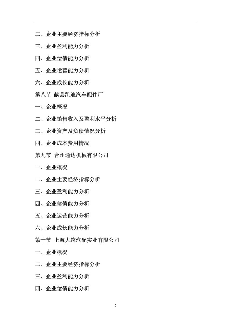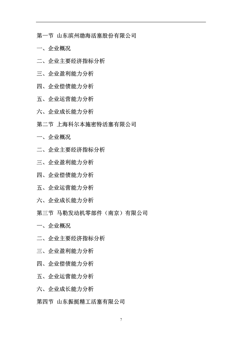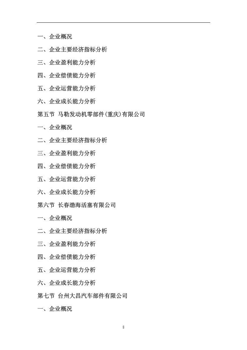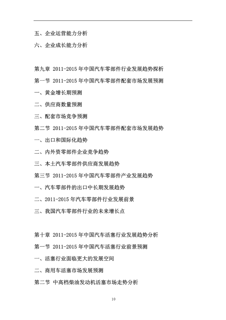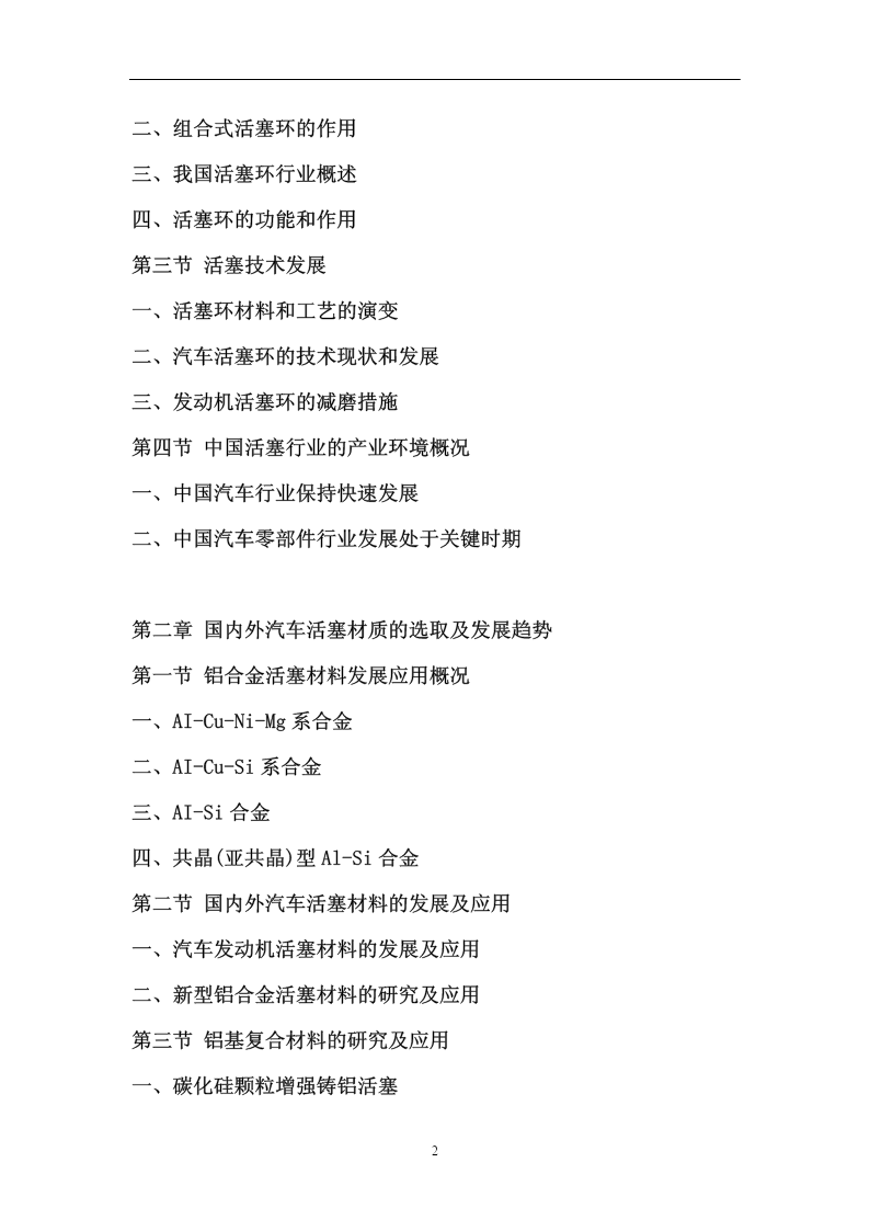 2011-2015年中国汽车活塞产业竞争格局及未来发展趋势报告报告简介活塞是汽车发动机的“心脏”,承受交变的机械负荷和热负荷,是发动机中工作条件最恶劣的关键零部件之一。活塞的功用是承受气体压力,并通过活塞销传给连杆驱使曲轴旋转,活塞顶部还是燃烧室的组成部分。智研咨询发布的《2011-2015年中国汽车活塞产业竞争格局及未来发展趋势报告》共十四章。首先介绍了汽车活塞相关概述、中国汽车活塞市场运行环境等,接着分析了中国汽车活塞市场发展的现状,然后介绍了中国汽车活塞重点区域市场运行形势。随后,报告对中国汽车活塞重点企业经营状况分析,最后分析了中国汽车活塞行业发展趋势与投资预测。您若想对汽车活塞产业有个系统的了解或者想投资汽车活塞行业,本报告是您不可或缺的重要工具。本研究报告数据主要采用国家统计数据,海关总署,问卷调查数据,商务部采集数据等数据库。其中宏观经济数据主要来自国家统计局,部分行业统计数据主要来自国家统计局及市场调研数据,企业数据主要来自于国统计局规模企业统计数据库及证券交易所等,价格数据主要来自于各类市场监测数据库。报告目录、图表部份第一章汽车活塞产业相关概述第一节活塞概述一、活塞特点二、活塞分类三、活塞结构四、工作条件五、活塞对相关部件性能影响第二节活塞环概述一、活塞环的作用1二、组合式活塞环的作用三、我国活塞环行业概述四、活塞环的功能和作用第三节活塞技术发展一、活塞环材料和工艺的演变二、汽车活塞环的技术现状和发展三、发动机活塞环的减磨措施第四节中国活塞行业的产业环境概况一、中国汽车行业保持快速发展二、中国汽车零部件行业发展处于关键时期第二章国内外汽车活塞材质的选取及发展趋势第一节铝合金活塞材料发展应用概况一、AI-Cu-Ni-Mg系合金二、AI-Cu-Si系合金三、AI-Si合金四、共晶(亚共晶)型Al-Si合金第二节国内外汽车活塞材料的发展及应用一、汽车发动机活塞材料的发展及应用二、新型铝合金活塞材料的研究及应用第三节铝基复合材料的研究及应用一、碳化硅颗粒增强铸铝活塞2二、氧化铝、硅酸铝和硼酸铝短纤增强铝合金活塞第四节2010-211年国内外其它活塞材料的研究应用一、钢顶铝裙材料二、陶瓷材料三、树脂基复合材料四、碳及碳纤维增强碳基复合材料第五节汽车活塞材质发展趋势分析第三章国内外汽车行业整体运行新形势透析第一节国际汽车工业运行综述一、世界汽车行业的供应链结构分析二、金融危机下全球汽车格局分析三、2010年全球汽车市场产销情况四、全球汽车制造业新趋向第二节中国汽车工业运行总况一、改革开放30年民族汽车工业的发展成就二、2005-2010年中国汽车工业经济运行情况分析三、近三年中国汽车产销数据计分析四、中国汽车保有量分析第四章中国汽车零部件行业运行新格局分析第一节中国汽车零部件业运行综述3一、中国汽车零部件产业发展目标模式二、中国汽车零部件行业危中求机三、中国汽车零部件与汽车配套关系发展分析四、中国汽配城的经营和管理五、汽车零部件业发展电子商务的分析第二节中国汽车零配件市场运行分析一、中国汽车零部件市场发展迅猛二、中国汽车零部件市场态势及篇产品市场需求三、我国汽车零部件再制造市场特点及运作模式四、中国商用汽车配件市场发展第三节中国汽车零部件市场流通模式探析一、中国汽车零部件行业发展现状及市场流通模式分析二、中国汽车零部件市场流通模式的发展方向第五章汽车活塞行业运行状况分析第一节汽车活塞行业运行动态分析一、仪征活塞环PSA、福特、康明斯、日产、日野二、韩国东洋活塞在山东威海的独资企业开始试生产三、平衡售后市场业务,马勒业务稳步增长四、安庆帝伯格茨活塞环出口订单增多五、金皇活塞模具和铸造技术获新提升第二节国内活塞环行业发展形势分析4一、活塞环行业集中度高二、活塞环技术有待发展三、活塞环发展道路明确第三节中国汽车活塞行业现状综述一、中国活塞销行业生产状况分析二、与国外活塞环行业的差距三、活塞行业国际合作第四节我国汽车活塞市场销售情况分析一、中国汽车发动机活塞特点分析二、汽车活塞国内市场销售情况分析三、中国汽车活塞四大进出口国分布四、中国汽车活塞进出口市场的比较第五节活塞行业发展存在的难题一、规模不大产能受阻二、技术不新产品受限三、标准不全产业受累第六章中国汽车活塞行业竞争新格局透析