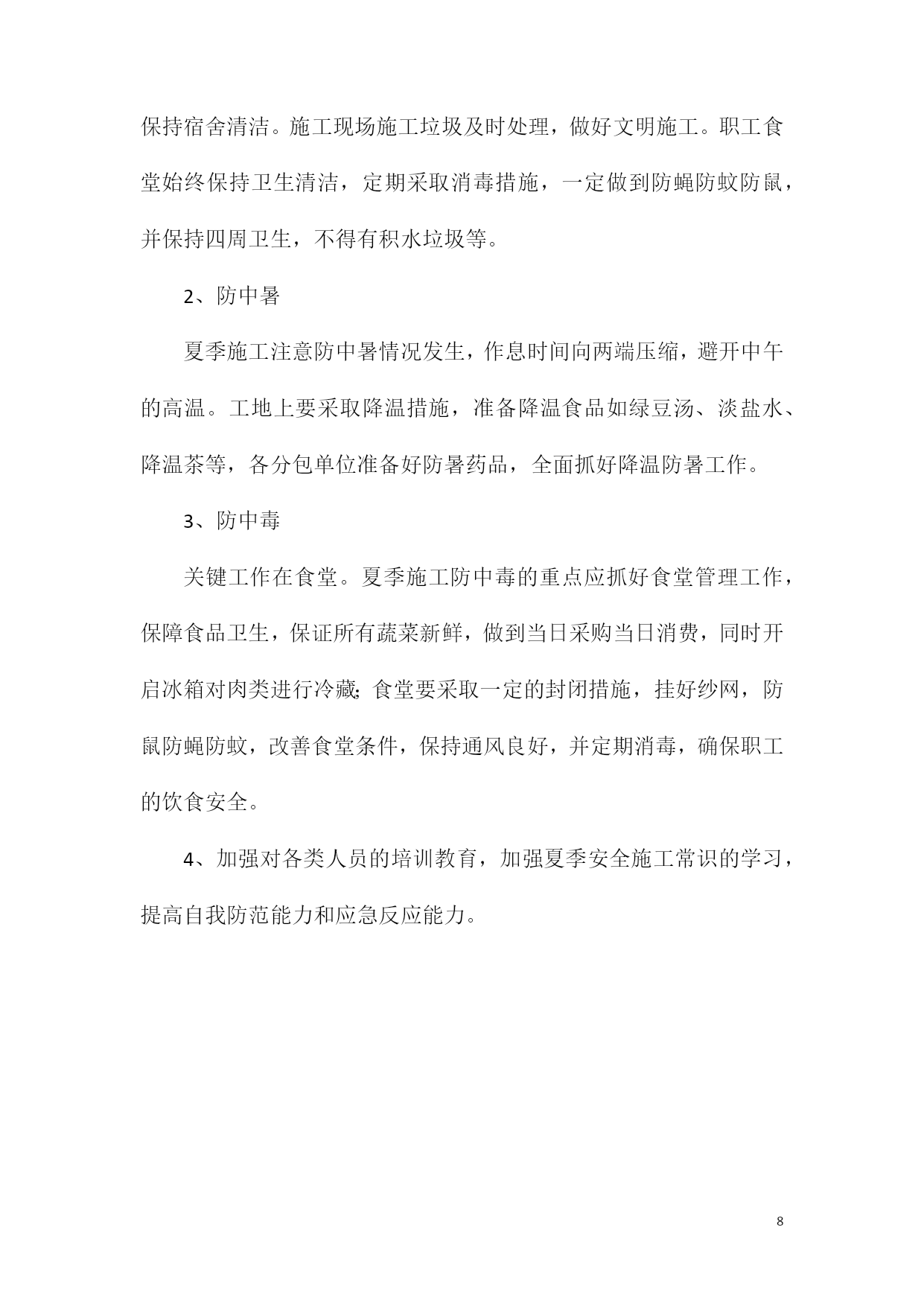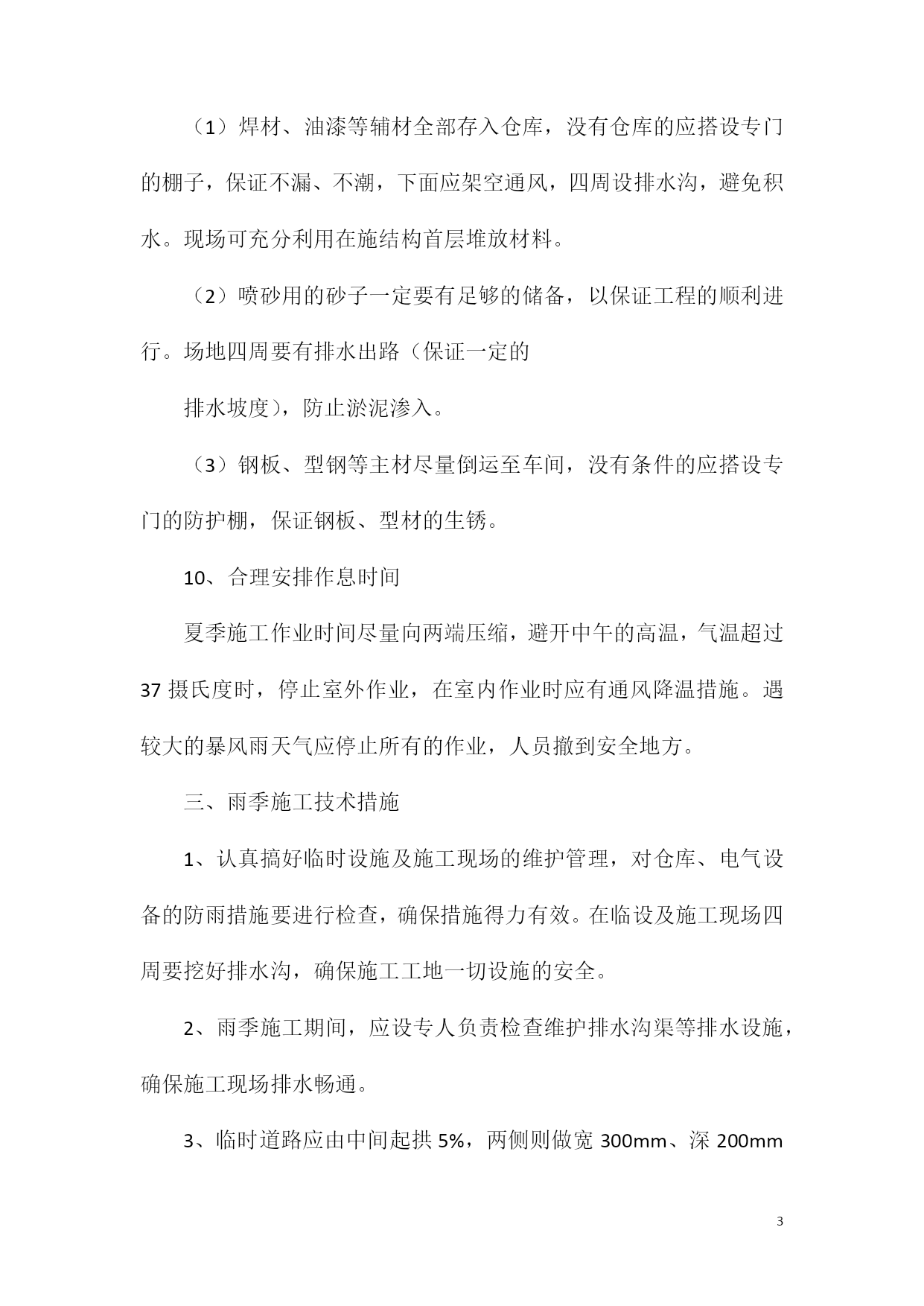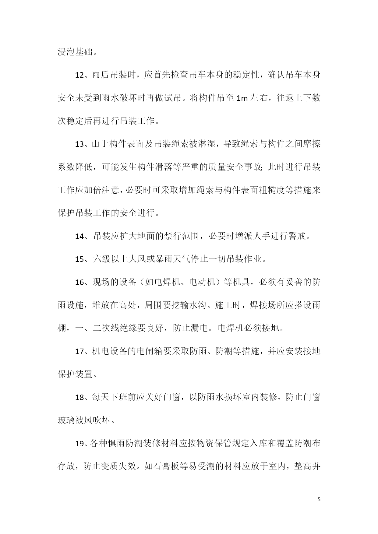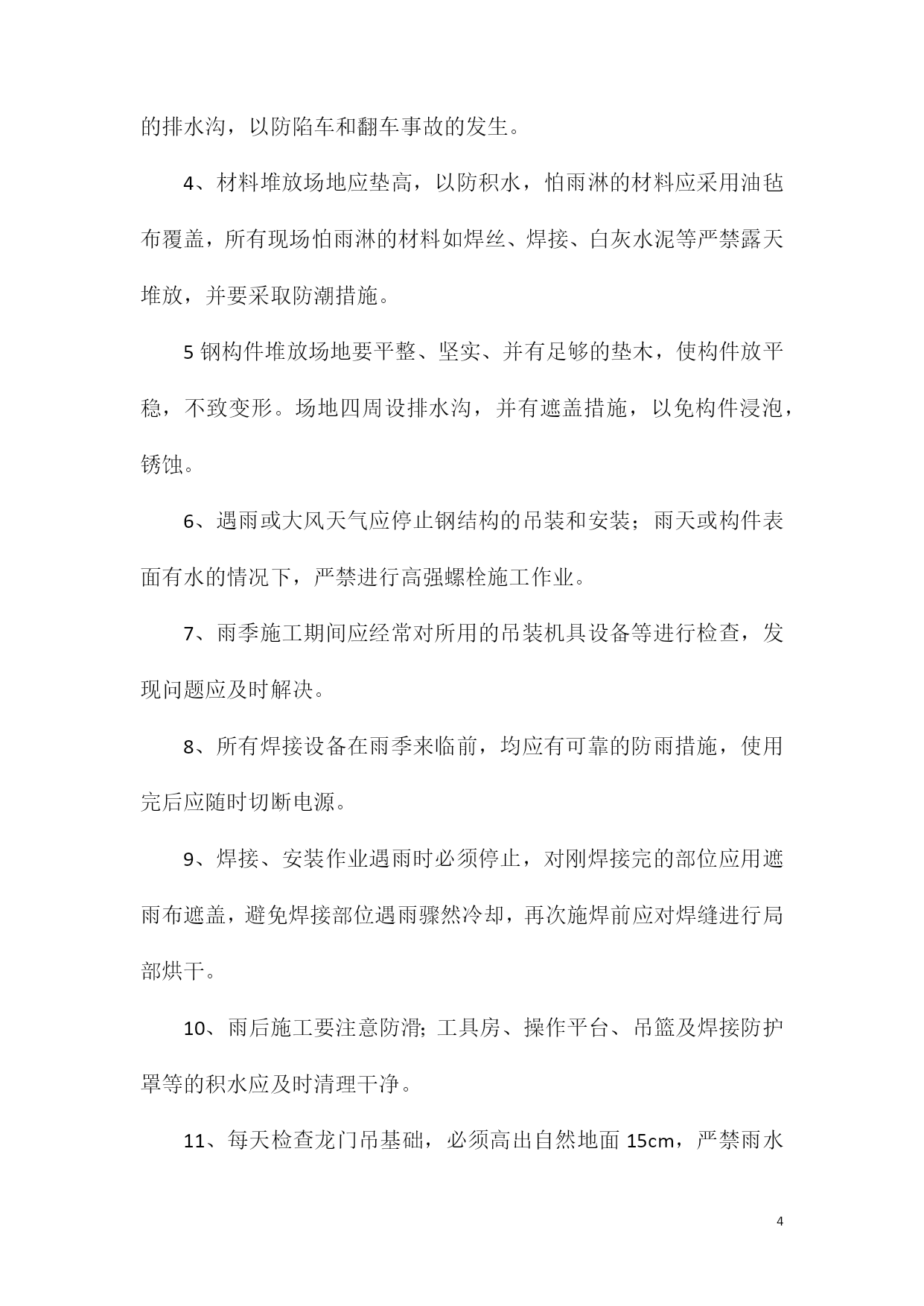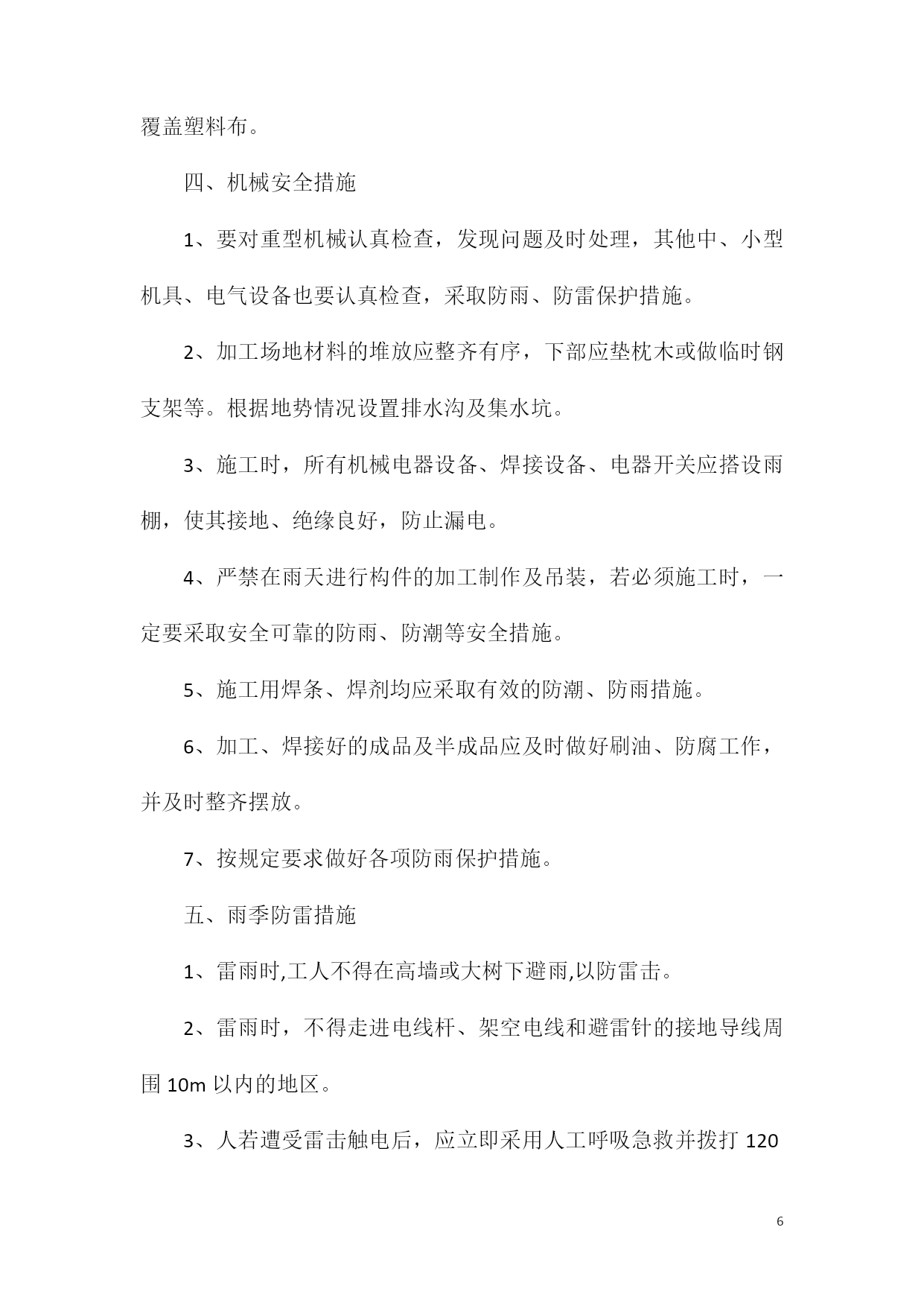 PAGEPAGE8钢结构加工厂制造厂专用雨季安全措施为保证制造厂生产的顺利进行,结合本年度实际情况,特制定2011年雨季施工措施。为保证能在雨季正常施工,雨季施工期间做好“排水、挡水、防水”工作,雨季施工制定具体的雨季施工方案,做到组织保证,措施得当。一、雨季施工管理目标雨季施工期间,加强气象预报的信息收集工作,掌握天气变化情况,预防为主,备好防雨物资和器材,确保工程雨季期间施工正常进行不受影响。二、雨季施工准备工作1、成立防汛抗洪领导小组,厂长任组长,副厂长任副组长,由工段、技术、材料等部门负责人组成。组织员工成立抗洪抢险小分队,班长任小分队长。2、制定切实有效的抗洪防汛措施,保证雨季制造厂施工质量。进入汛期前,要全面勘测施工现场的地形、地势,调查天然排水系统及原有排水管、明渠等的泄水能力、研究制定汛期排水方案。3、物资准备:雨衣、雨鞋、铁锹、塑料布、潜水泵、水管、污水泵、油毡纸、手电筒、车辆等。材料部门、生产部门做好防汛材料设备的准备工作,不能挪做它用。应根据实际情况备足塑料油毡等防雨材料,排水需要的水泵及其它器材等。4、夜间应设责任值班人员,保证昼夜有人值班并做好值班记录,同时要设置天气预报员,负责收听和发布天气情况,随时掌握天气变化,合理安排预防工作,防止暴雨突然袭击造成损失。5、根据施工现场管理规定,对制造厂生产场地、工棚、仓库、食堂、临时住房等暂设工程进行全面调整检查和整修,保证基础、道路不塌陷,房间干燥、通风、防蚊蝇设施齐全并不漏雨,厂区不积水。5制造厂应对施工人员进行雨季施工培训工作,组织相关人员进行全面检查施工现场的准备工作,其中应包括临时设施、临时用电、机械设备防护等项工作。6、雨季施工前应对现场配电箱、闸箱、电缆临时支架等仔细检查,需加固的要及时加固,缺盖、罩、门的要及时补齐,确保用电安全。7、大风天气,要做好大型高耸物件的防风加固措施。8、仔细检查道路的起拱情况,两旁设排水沟,保证不滑、不陷、不积水。清理现场的障碍物,保持现场道路畅通。道路两旁一定范围内不要堆放物品,需要堆放时堆放高度不宜超过1.5m,保证视野开阔,道路畅通。9、原材料的储存和堆放(1)焊材、油漆等辅材全部存入仓库,没有仓库的应搭设专门的棚子,保证不漏、不潮,下面应架空通风,四周设排水沟,避免积水。现场可充分利用在施结构首层堆放材料。(2)喷砂用的砂子一定要有足够的储备,以保证工程的顺利进行。场地四周要有排水出路(保证一定的排水坡度),防止淤泥渗入。(3)钢板、型钢等主材尽量倒运至车间,没有条件的应搭设专门的防护棚,保证钢板、型材的生锈。10、合理安排作息时间夏季施工作业时间尽量向两端压缩,避开中午的高温,气温超过37摄氏度时,停止室外作业,在室内作业时应有通风降温措施。遇较大的暴风雨天气应停止所有的作业,人员撤到安全地方。三、雨季施工技术措施1、认真搞好临时设施及施工现场的维护管理,对仓库、电气设备的防雨措施要进行检查,确保措施得力有效。在临设及施工现场四周要挖好排水沟,确保施工工地一切设施的安全。2、雨季施工期间,应设专人负责检查维护排水沟渠等排水设施,确保施工现场排水畅通。3、临时道路应由中间起拱5%,两侧则做宽300mm、深200mm的排水沟,以防陷车和翻车事故的发生。4、材料堆放场地应垫高,以防积水,怕雨淋的材料应采用油毡布覆盖,所有现场怕雨淋的材料如焊丝、焊接、白灰水泥等严禁露天堆放,并要采取防潮措施。5钢构件堆放场地要平整、坚实、并有足够的垫木,使构件放平稳,不致变形。场地四周设排水沟,并有遮盖措施,以免构件浸泡,锈蚀。6、遇雨或大风天气应停止钢结构的吊装和安装;雨天或构件表面有水的情况下,严禁进行高强螺栓施工作业。7、雨季施工期间应经常对所用的吊装机具设备等进行检查,发现问题应及时解决。8、所有焊接设备在雨季来临前,均应有可靠的防雨措施,使用完后应随时切断电源。9、焊接、安装作业遇雨时必须停止,对刚焊接完的部位应用遮雨布遮盖,避免焊接部位遇雨骤然冷却,再次施焊前应对焊缝进行局部烘干。10、雨后施工要注意防滑;工具房、操作平台、吊篮及焊接防护罩等的积水应及时清理干净。11、每天检查龙门吊基础,必须高出自然地面15cm,严禁雨水浸泡基础。12、雨后吊装时,应首先检查吊车本身的稳定性,确认吊车本身安全未受到雨水破坏时再做试吊。将构件吊至1m左右,往返上下数次稳定后再进行吊装工作。13、由于构件表面及吊装绳索被淋湿,导致绳索与构件之间摩擦系数降低,可能发生构件滑落等严重的质量安全事故;此时进行吊装工作应加倍注意,必要时可采取增加绳索与构件表面粗糙度等措施来保护吊装工作的安全进行。14、吊装应扩大地面的禁行范围,必要时增派人手进行警戒