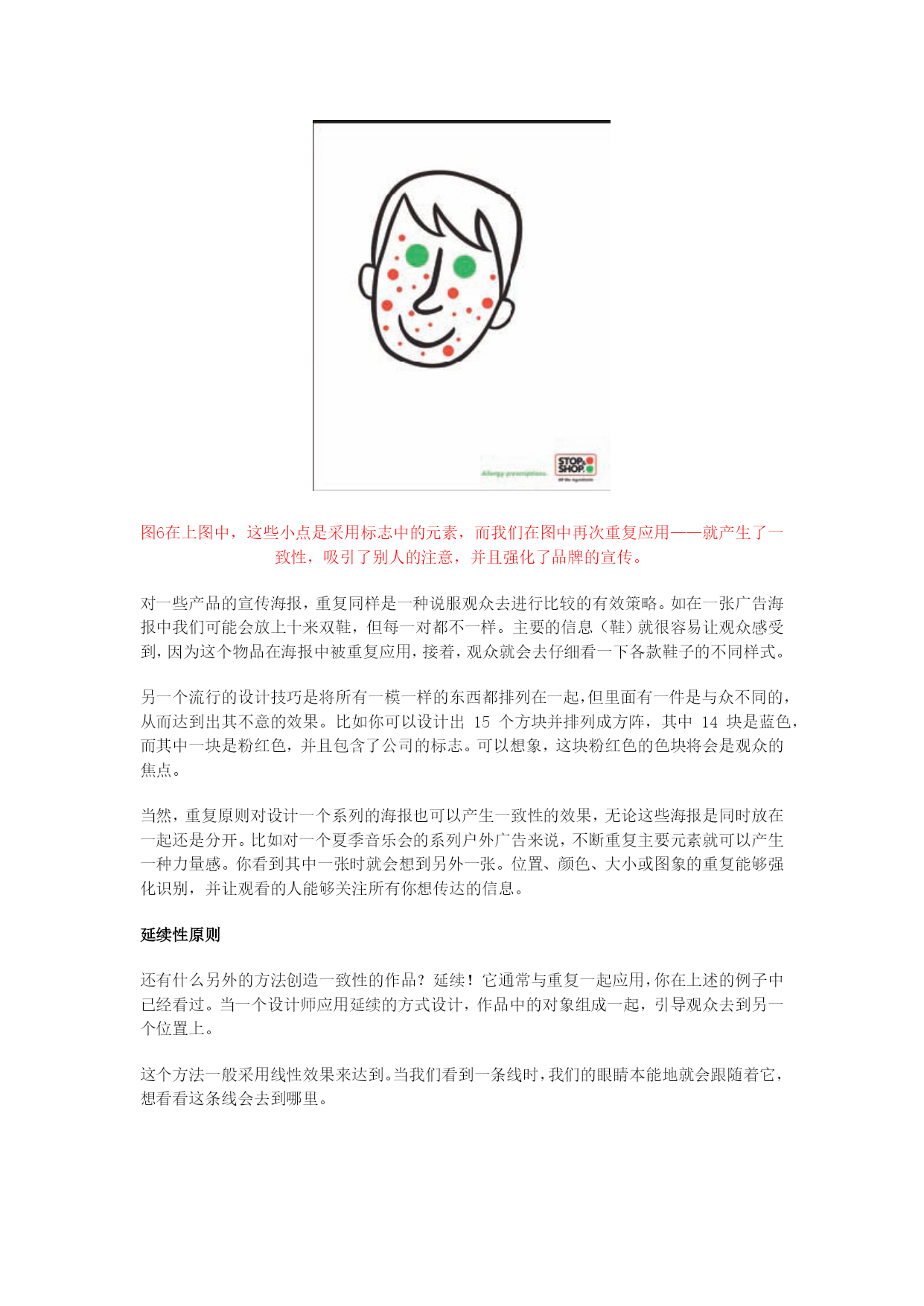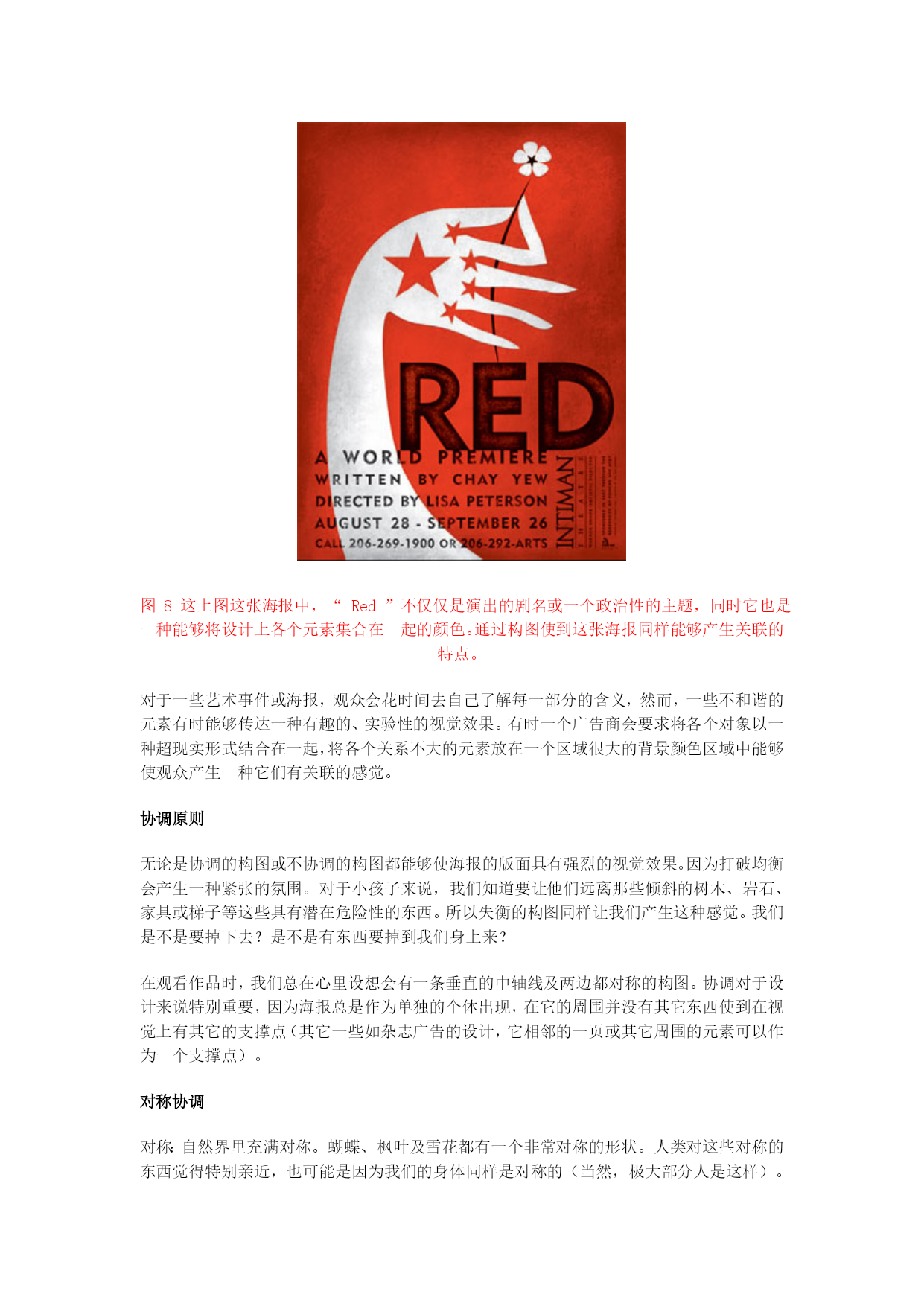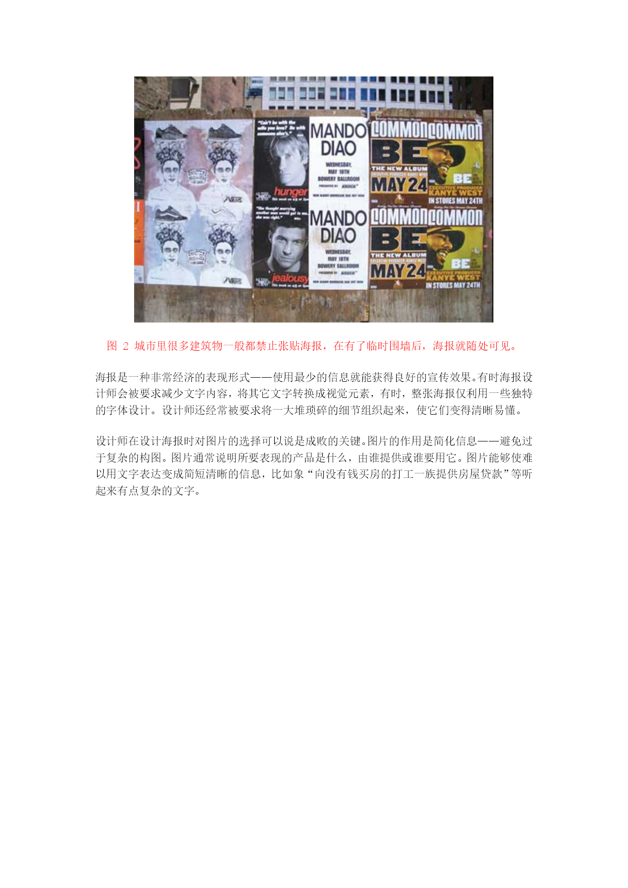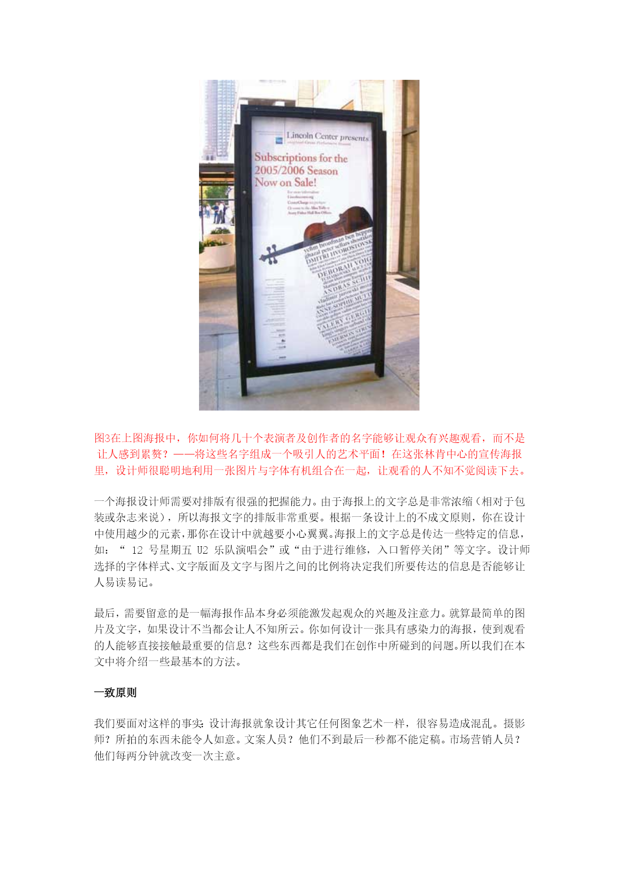 如何设计海报(一)本文由LOGOSKY.NET网站设计师陈汉聪编译,转载请注明出处文章编号:050592005年11月8日【译者的话】对于设计师来说,海报设计可以说是最激动人心的事情,因为海报的表现形式多种多样,题材广阔,限制较少,强调创意及视觉语言,点线面、图片及文字可以灵活结合地应用,而且也注重平面构成及颜色构成。可以说,海报设计是平面设计的集大成者。但有时正是其表现形式过于广阔,反而使到我们在入手时有点无所适从。我们将分两期来探讨如何才能设计出一张吸引人的海报,在设计时有什么原则及技巧。原文作者:派帕·妮尔森。对于每一个平面设计师来说,海报设计都是一个挑战。作为在二维平面空间中的海报,它的用途数不胜数,其表现题材从广告、推广到公共服务公告等无所不包。设计师的挑战是要使设计出来的海报能够吸引人,而且能传播特定信息从而最终激发观看的人。当你在城市的街道闲逛时,在地铁站等车时,在参观博物馆时,你都可以发现海报无处不在。而那些最好的海报设计总是让我们驻足停留,海报所传达的信息清晰明了,离开后脑海里还在想着它们。在本文中,我们将探讨一些创作的基本原则,这些原则能对你在设计一幅令人印象深刻的海报时有所帮助。你将会学习如何创作出一幅具有统一、协调及有节奏感的作品,使到它在大街上能够吸引路人的目光。图1上图海报由莫罗尼设计,在这张海报中,作者使用了协调、重复及其它吸引人的创作技巧达到与观看的人有效交流的目的,并让人难以忘怀。海报设计基础很久以前,当人类有某些东西要向别人宣布时就已经有了海报,当时并没有迹象显示海报能够比其它宣传媒体有更大的优势。但为什么现在人们总是将电视广告及广告牌作为我们公共的标志?其中一个答案是,一幅设计精美的平面作品仍然有某种力量在吸引着我们。图2城市里很多建筑物一般都禁止张贴海报,在有了临时围墙后,海报就随处可见。海报是一种非常经济的表现形式——使用最少的信息就能获得良好的宣传效果。有时海报设计师会被要求减少文字内容,将其它文字转换成视觉元素,有时,整张海报仅利用一些独特的字体设计。设计师还经常被要求将一大堆琐碎的细节组织起来,使它们变得清晰易懂。设计师在设计海报时对图片的选择可以说是成败的关键。图片的作用是简化信息——避免过于复杂的构图。图片通常说明所要表现的产品是什么,由谁提供或谁要用它。图片能够使难以用文字表达变成简短清晰的信息,比如象“向没有钱买房的打工一族提供房屋贷款”等听起来有点复杂的文字。图3在上图海报中,你如何将几十个表演者及创作者的名字能够让观众有兴趣观看,而不是让人感到累赘?——将这些名字组成一个吸引人的艺术平面!在这张林肯中心的宣传海报里,设计师很聪明地利用一张图片与字体有机组合在一起,让观看的人不知不觉阅读下去。一个海报设计师需要对排版有很强的把握能力。由于海报上的文字总是非常浓缩(相对于包装或杂志来说),所以海报文字的排版非常重要。根据一条设计上的不成文原则,你在设计中使用越少的元素,那你在设计中就越要小心翼翼。海报上的文字总是传达一些特定的信息,如:“12号星期五U2乐队演唱会”或“由于进行维修,入口暂停关闭”等文字。设计师选择的字体样式、文字版面及文字与图片之间的比例将决定我们所要传达的信息是否能够让人易读易记。最后,需要留意的是一幅海报作品本身必须能激发起观众的兴趣及注意力。就算最简单的图片及文字,如果设计不当都会让人不知所云。你如何设计一张具有感染力的海报,使到观看的人能够直接接触最重要的信息?这些东西都是我们在创作中所碰到的问题。所以我们在本文中将介绍一些最基本的方法。一致原则我们要面对这样的事实:设计海报就象设计其它任何图象艺术一样,很容易造成混乱。摄影师?所拍的东西未能令人如意。文案人员?他们不到最后一秒都不能定稿。市场营销人员?他们每两分钟就改变一次主意。在设计过程中,设计师必须对整个流程有一个清晰的顺序并逐一落实。海报设计必须从一开始就要保持一致,包括大标题、资料的选用、相片及标志。如果没有统一,海报将会变得混乱不堪难以卒读。所有的设计元素必须以适当的方式组合成一个有机的整体。我们如何能设计出一幅“一致性”的作品?让我们举出几个原则:关联原则要让作品具有一致性,第一个原则是采用关联原则,也可以称作分组。关联性是基于这样一个自然原则:物以类聚。如果我们在一个页面里看到各个组成部分被井井有条地放在一起时,我们就会试着去理解他们。我们总认为他们就是一组的——并不理会实际上这些不同部分是否真的相似或关联。这有点象“牵连犯罪”的原理。海报设计师可以有多种途径实现这个关联原则。首先,对人物、物品及文字分组能够提高信息的传达效果。可以想象很多广告牌的广告,都是由一张消费者的照片、产品图片及广告词组成的。对人物类型(小孩?老人?操劳