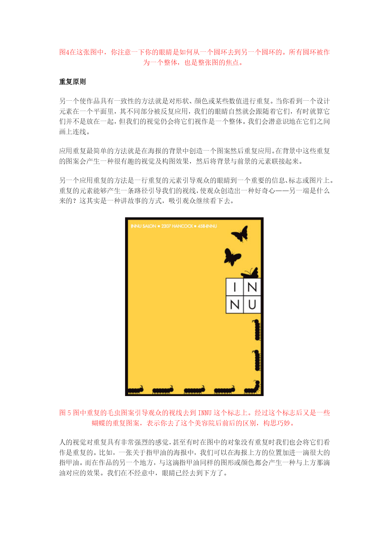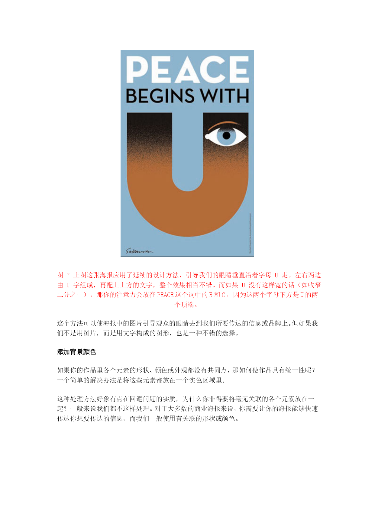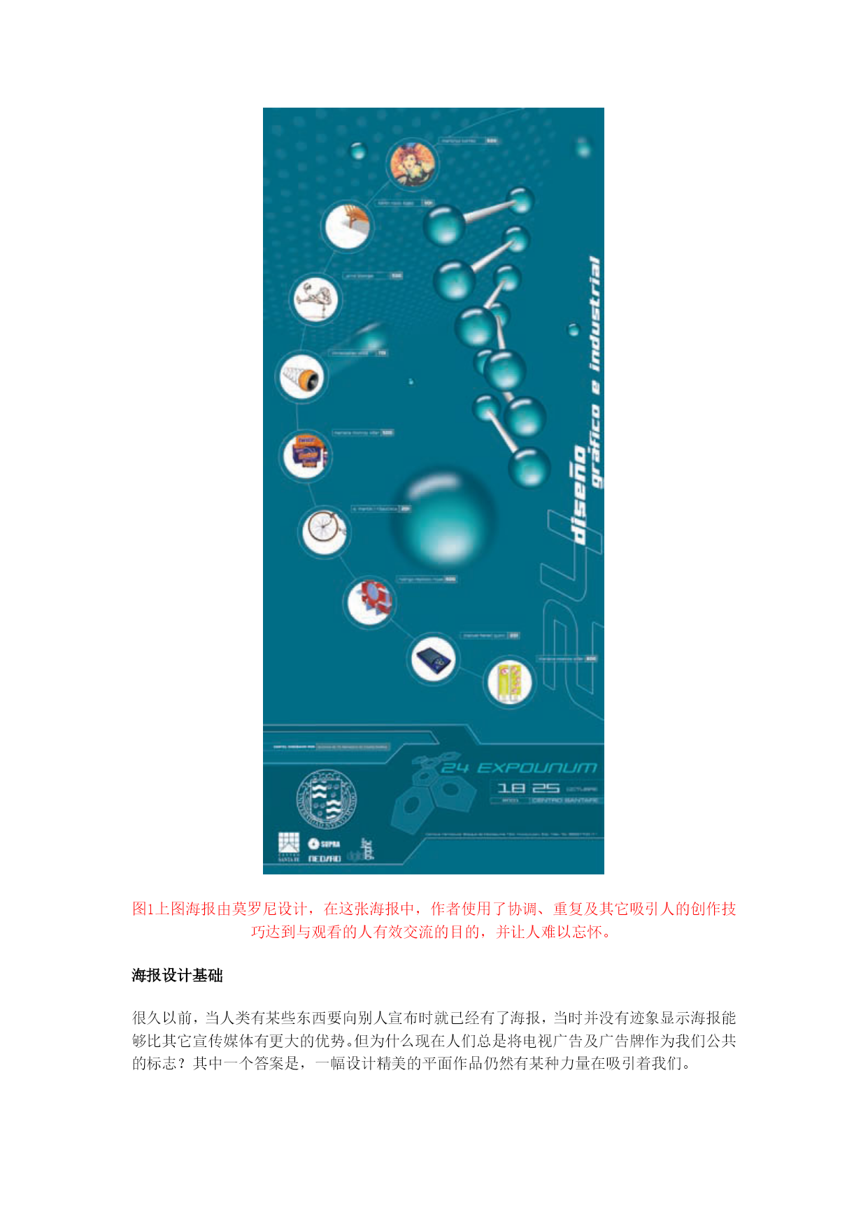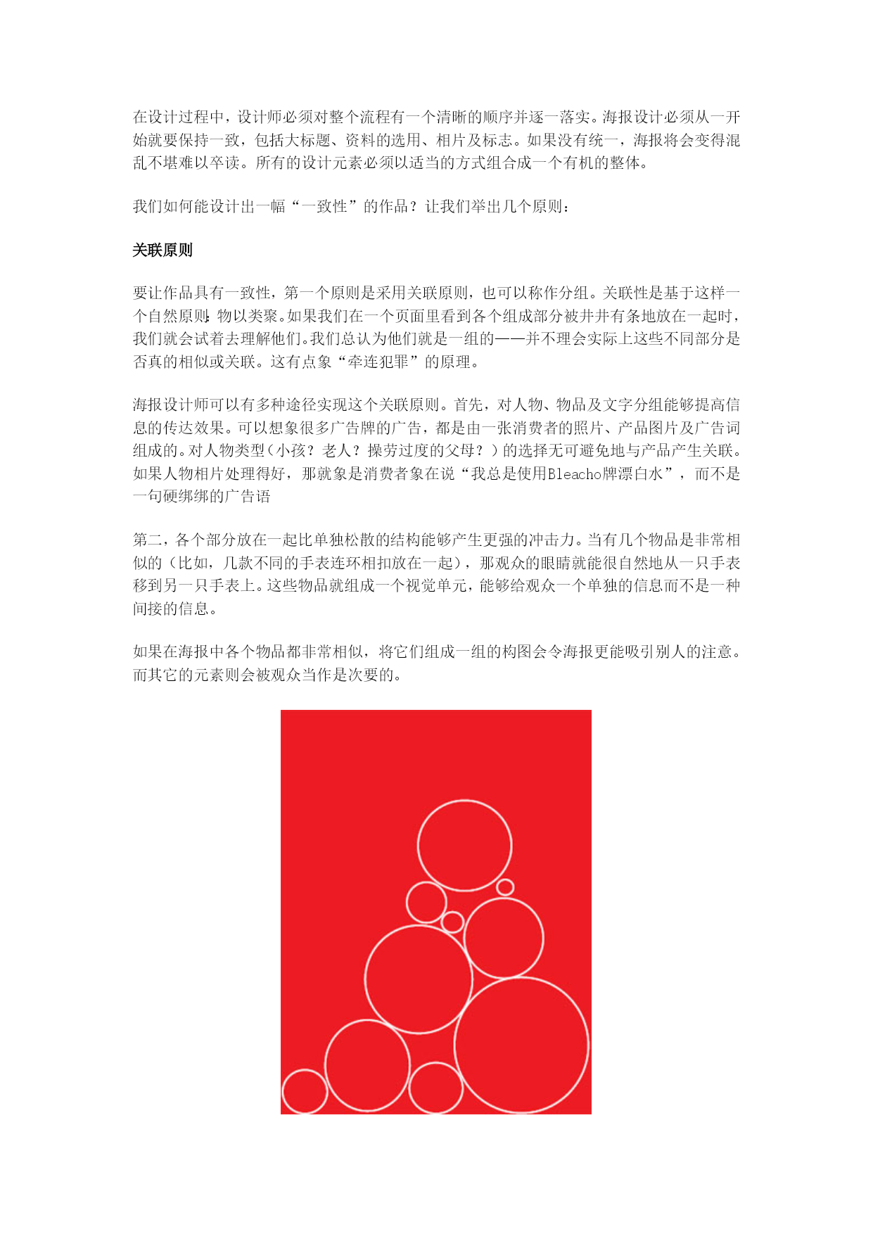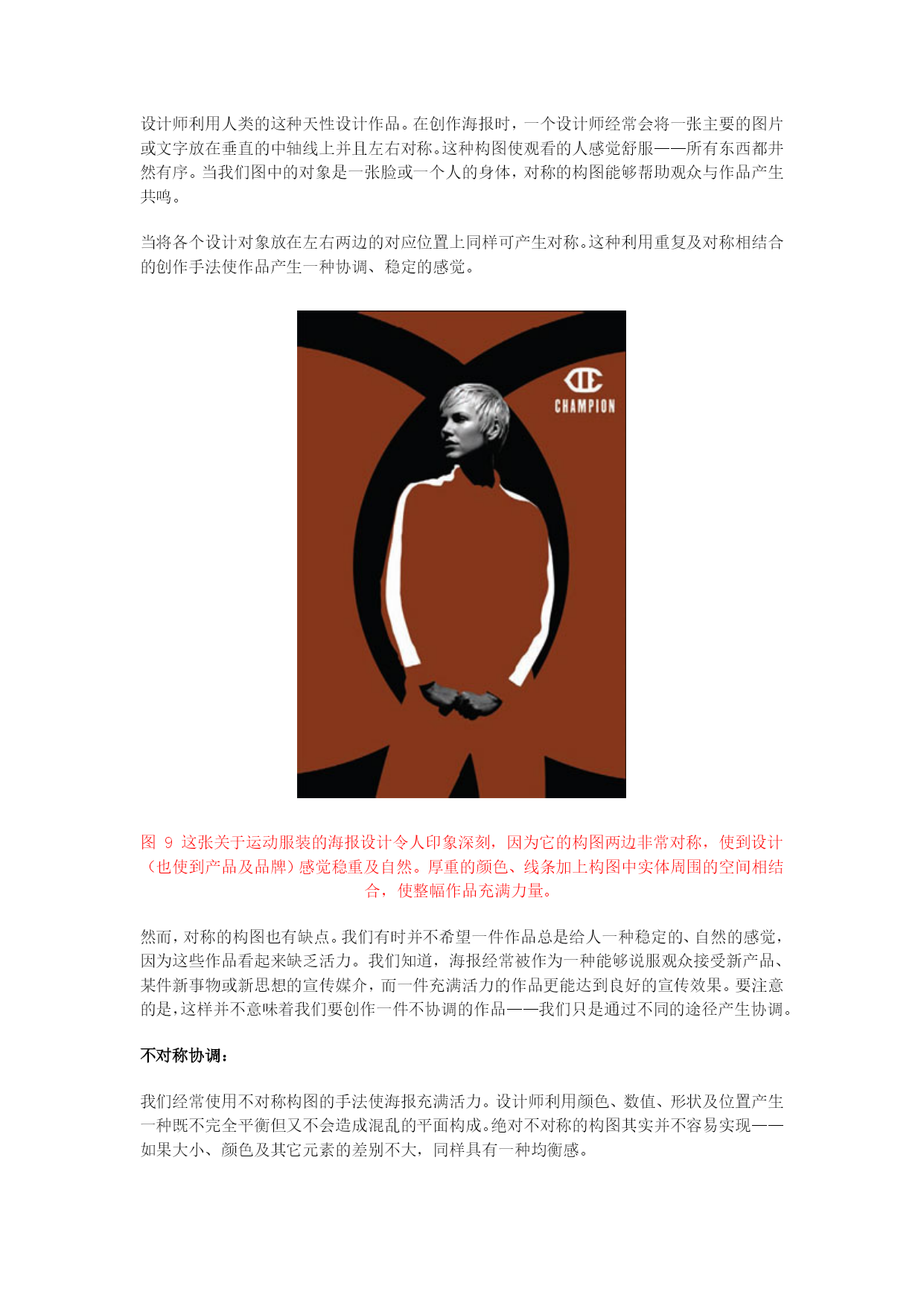 如何设计海报(一)本文由LOGOSKY.NET网站设计师陈汉聪编译,转载请注明出处文章编号:050592005年11月8日【译者的话】对于设计师来说,海报设计可以说是最激动人心的事情,因为海报的表现形式多种多样,题材广阔,限制较少,强调创意及视觉语言,点线面、图片及文字可以灵活结合地应用,而且也注重平面构成及颜色构成。可以说,海报设计是平面设计的集大成者。但有时正是其表现形式过于广阔,反而使到我们在入手时有点无所适从。我们将分两期来探讨如何才能设计出一张吸引人的海报,在设计时有什么原则及技巧。原文作者:派帕·妮尔森。对于每一个平面设计师来说,海报设计都是一个挑战。作为在二维平面空间中的海报,它的用途数不胜数,其表现题材从广告、推广到公共服务公告等无所不包。设计师的挑战是要使设计出来的海报能够吸引人,而且能传播特定信息从而最终激发观看的人。当你在城市的街道闲逛时,在地铁站等车时,在参观博物馆时,你都可以发现海报无处不在。而那些最好的海报设计总是让我们驻足停留,海报所传达的信息清晰明了,离开后脑海里还在想着它们。在本文中,我们将探讨一些创作的基本原则,这些原则能对你在设计一幅令人印象深刻的海报时有所帮助。你将会学习如何创作出一幅具有统一、协调及有节奏感的作品,使到它在大街上能够吸引路人的目光。图1上图海报由莫罗尼设计,在这张海报中,作者使用了协调、重复及其它吸引人的创作技巧达到与观看的人有效交流的目的,并让人难以忘怀。海报设计基础很久以前,当人类有某些东西要向别人宣布时就已经有了海报,当时并没有迹象显示海报能够比其它宣传媒体有更大的优势。但为什么现在人们总是将电视广告及广告牌作为我们公共的标志?其中一个答案是,一幅设计精美的平面作品仍然有某种力量在吸引着我们。图2城市里很多建筑物一般都禁止张贴海报,在有了临时围墙后,海报就随处可见。海报是一种非常经济的表现形式——使用最少的信息就能获得良好的宣传效果。有时海报设计师会被要求减少文字内容,将其它文字转换成视觉元素,有时,整张海报仅利用一些独特的字体设计。设计师还经常被要求将一大堆琐碎的细节组织起来,使它们变得清晰易懂。设计师在设计海报时对图片的选择可以说是成败的关键。图片的作用是简化信息——避免过于复杂的构图。图片通常说明所要表现的产品是什么,由谁提供或谁要用它。图片能够使难以用文字表达变成简短清晰的信息,比如象“向没有钱买房的打工一族提供房屋贷款”等听起来有点复杂的文字。图3在上图海报中,你如何将几十个表演者及创作者的名字能够让观众有兴趣观看,而不是让人感到累赘?——将这些名字组成一个吸引人的艺术平面!在这张林肯中心的宣传海报里,设计师很聪明地利用一张图片与字体有机组合在一起,让观看的人不知不觉阅读下去。一个海报设计师需要对排版有很强的把握能力。由于海报上的文字总是非常浓缩(相对于包装或杂志来说),所以海报文字的排版非常重要。根据一条设计上的不成文原则,你在设计中使用越少的元素,那你在设计中就越要小心翼翼。海报上的文字总是传达一些特定的信息,如:“12号星期五U2乐队演唱会”或“由于进行维修,入口暂停关闭”等文字。设计师选择的字体样式、文字版面及文字与图片之间的比例将决定我们所要传达的信息是否能够让人易读易记。最后,需要留意的是一幅海报作品本身必须能激发起观众的兴趣及注意力。就算最简单的图片及文字,如果设计不当都会让人不知所云。你如何设计一张具有感染力的海报,使到观看的人能够直接接触最重要的信息?这些东西都是我们在创作中所碰到的问题。所以我们在本文中将介绍一些最基本的方法。一致原则我们要面对这样的事实:设计海报就象设计其它任何图象艺术一样,很容易造成混乱。摄影师?所拍的东西未能令人如意。文案人员?他们不到最后一秒都不能定稿。市场营销人员?他们每两分钟就改变一次主意。在设计过程中,设计师必须对整个流程有一个清晰的顺序并逐一落实。海报设计必须从一开始就要保持一致,包括大标题、资料的选用、相片及标志。如果没有统一,海报将会变得混乱不堪难以卒读。所有的设计元素必须以适当的方式组合成一个有机的整体。我们如何能设计出一幅“一致性”的作品?让我们举出几个原则:关联原则要让作品具有一致性,第一个原则是采用关联原则,也可以称作分组。关联性是基于这样一个自然原则:物以类聚。如果我们在一个页面里看到各个组成部分被井井有条地放在一起时,我们就会试着去理解他们。我们总认为他们就是一组的——并不理会实际上这些不同部分是否真的相似或关联。这有点象“牵连犯罪”的原理。海报设计师可以有多种途径实现这个关联原则。首先,对人物、物品及文字分组能够提高信息的传达效果。可以想象很多广告牌的广告,都是由一张消费者的照片、产品图片及广告词组成的。对人物类型(小孩?老人?操劳
