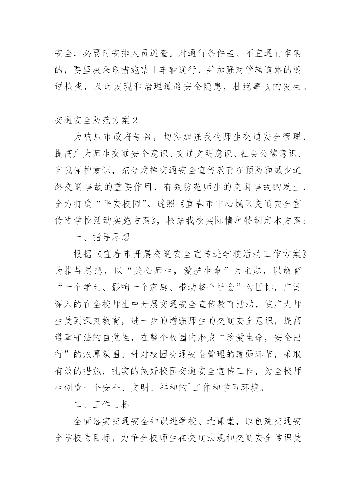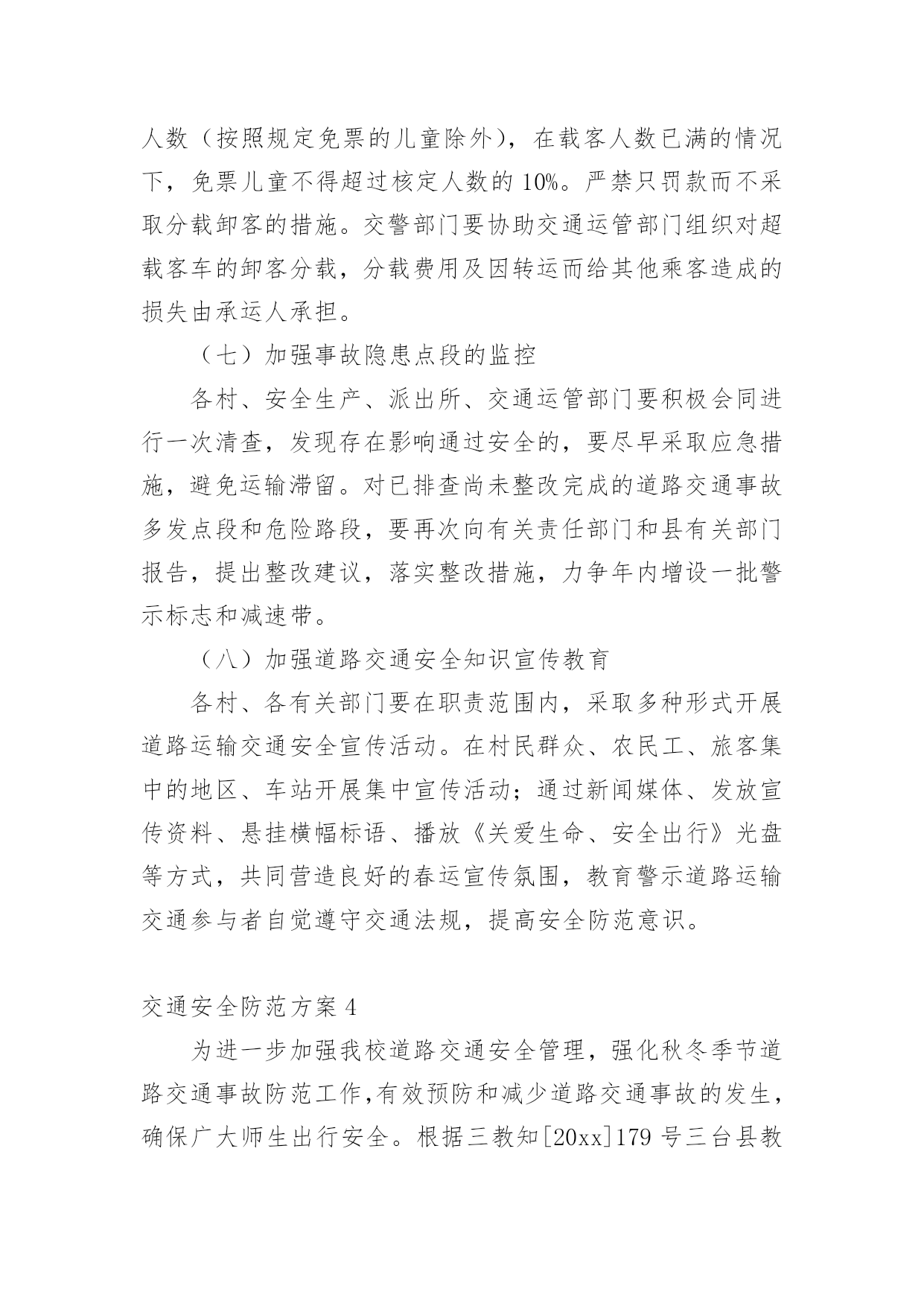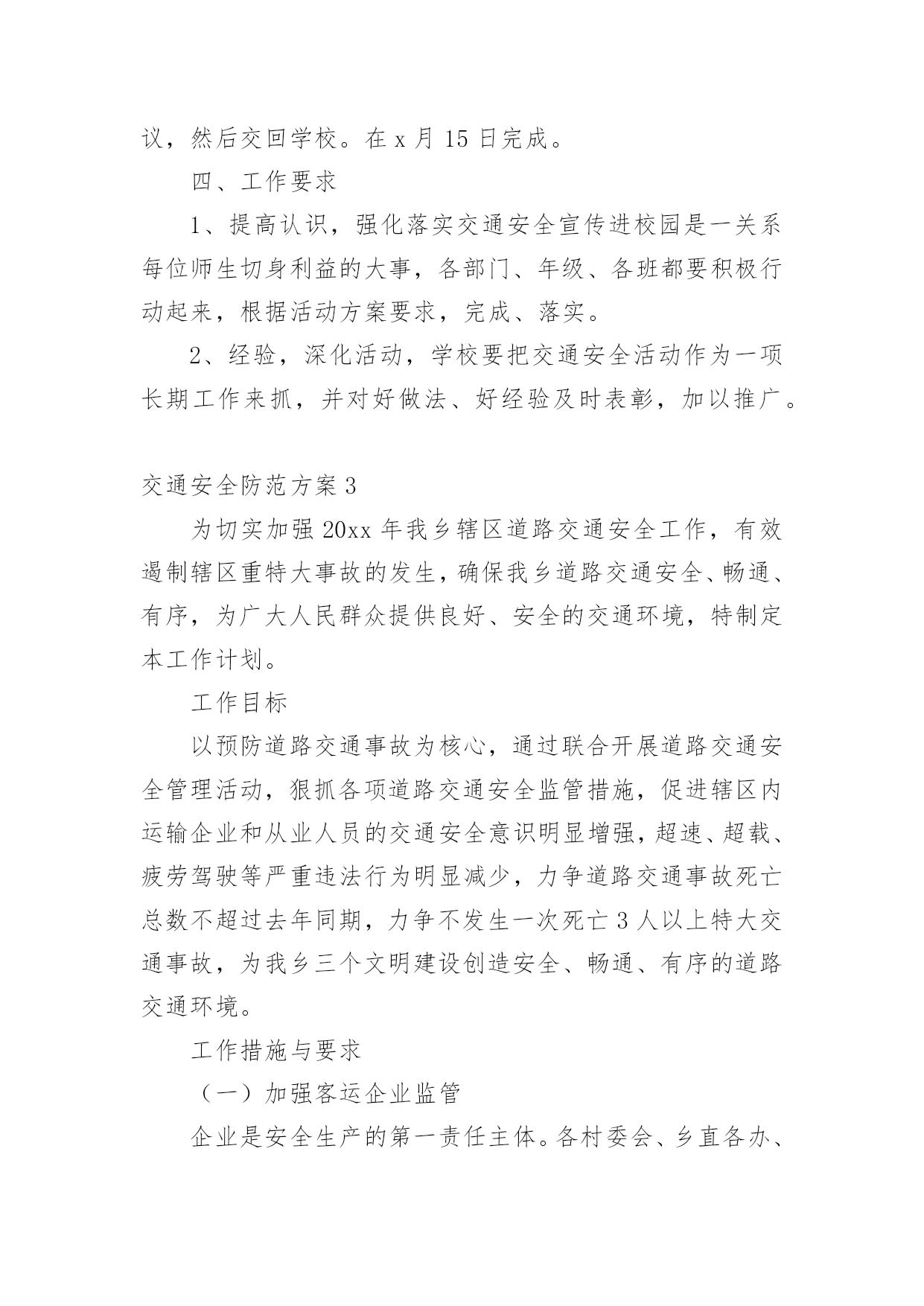 交通安全防范方案交通安全防范方案(通用5篇)为了确保事情或工作有效开展,常常需要提前准备一份具体、详细、针对性强的方案,一份好的方案一定会注重受众的参与性及互动性。方案要怎么制定呢?下面是小编为大家整理的交通安全防范方案(通用5篇),欢迎阅读与收藏。交通安全防范方案1为加强道路交通安全管理,有效预防和减少道路交通事故,根据国务院《国务院关于加强道路交通安全工作的意见》精神,按照省公安厅开展“大排查、大教育、大整治”货车违法行为专项行动方案工作部署,20xx年4月1日至9月30日,集中整治强行超车、强行会车、逆向行驶、闯红灯、超速行驶、疲劳驾驶、抢占道路霸道行驶、驾驶无牌证、驾驶报废及非法改装拼装车辆等十大野蛮危险驾驶行为,规范货车通行秩序,防范减少货车交通事故。根据省、市、市有关要求,结合实际,制订如下工作方案:一、组织领导经镇党委、政府研究决定,成立以镇长任组长,副镇长任常务副组长,综治办专职副主任、司法所长、交警四中队队长任副组长,信访办主任、各村支部书记、派出所长、教研中心主任程新有、工商所长、巡防队长任成员的镇道路交通安全工作领导小组,领导小组下设办公室,兼任办公室主任。各村也要成立相应的组织,加强对此项工作的领导。二、工作重点镇道路交通安全工作领导小组办公室配合交通运输管理部门重点做好货运车辆交通违法行为的综合执法行动。1、整治重型货车不按规定车道行驶、疲劳驾驶、酒后、醉酒驾驶、未审、违法停车、超速行驶、逆向行驶、强超强会、无牌无证、套牌驾驶、报废、非法改装。对超限超载的货车、要引导至治超站点依法处理。2、整治重型货车、挂车非法改装,尾灯不亮、违规安装后射灯、车身反光标识设置、侧后部防护装置不规范严重影响安全的违法行为。3、整治道路工程运输车、渣土车无牌套牌遮挡污损号牌、闯红灯、闯禁行、超速行驶、违法掉头等严重交通违法行为。4、整治危险化学品运输车未按规定设置警示标志、灯具、超速行驶、低速占道行驶、不按照运输通行证注明内容运输、未随身携带运输通行证明、不按规定的通行时间路线速度行驶、不配备押运人员、无证运输等交通违法行为。5、整治货运车辆驾驶人准驾车型不符、驾驶证未审、记分达12分的。三、工作措施1、利用镇电视台播发公告、张贴宣传标语、悬挂条幅、办板报等多种形式,全面宣传综合执法行动,加强道路交通安全法规宣传,提高全民道路交通安全意识。2、各村要明确1名道路交通安全协管员,负责经常性的宣传资料张贴、发放和记录有关的活动情况,集中利用5天时间(4月16日至4月20日)对本村货车信息进行详细登记,加强对货车司机的安全教育和提醒。3、取缔马路市场,杜绝利用公路堆物作业、摆摊设点、打谷晒场占道等违法现象,从根本上消除不安全隐患。4、在学校周边重要路口设置安全警示牌,安装减震减速装置,加强师生道路交通安全教育,杜绝学生因违反道路交通安全法规而发生伤亡事件。5、派出所、工商所、综治办要配合道路交通主管部门,加大对报废拼(组)装车、非客运车载客、无牌无证摩托车、拖拉机、三轮车载客、农用车非法载客和修车点拼(组)装车等现象的治理力度。四、工作要求1、加强组织协调,明确工作责任。镇道路交通安全工作领导小组办公室要切实加强对道路交通安全工作的领导,定期召开协调会议,掌握工作情况,解决存在的问题,促进工作落实。各村和相关单位要明确工作职责,加强协作配合,形成工作合力,在全社会形成齐抓共管的良好工作局面。2、加强道路安全隐患排查治理。各村要加强对镇村道路安全隐患的排查和治理,加强道路巡逻检查,发现危及行车、行人安全的道路安全隐患应加强监控,及时进行整治。凡存在安全隐患难以及时整治的,要采取措施,加强监管,在安全距离范围内完善安全警示标志,提醒车辆、行人注意安全,必要时安排人员巡查。对通行条件差、不宜通行车辆的,要坚决采取措施禁止车辆通行,并加强对管辖道路的巡逻检查,及时发现和治理道路安全隐患,杜绝事故的发生。交通安全防范方案2为响应市政府号召,切实加强我校师生交通安全管理,提高广大师生交通安全意识、交通文明意识、社会公德意识、自我保护意识,充分发挥交通安全宣传教育在预防和减少道路交通事故的重要作用,有效防范师生的交通事故的发生,全力打造“平安校园”。遵照《宜春市中心城区交通安全宣传进学校活动实施方案》,根据我校实际情况特制定本方案:一、指导思想根据《宜春市开展交通安全宣传进学校活动工作方案》为指导思想,以“关心师生,爱护生命”为主题,以教育“一个学生、影响一个家庭、带动整个社会”为目标,广泛深入的在全校师生中开展交通安全宣传教育活动,使广大师生受到深刻教育,进一步的增强师生的交通安全意识,提高遵章守法的自觉性,在整个校园内形成“珍爱生命,安全出行”的浓厚氛围。针对校园交通安全管理的薄弱环节,采取有效的措施,扎实的做好校园交通安全宣传工作